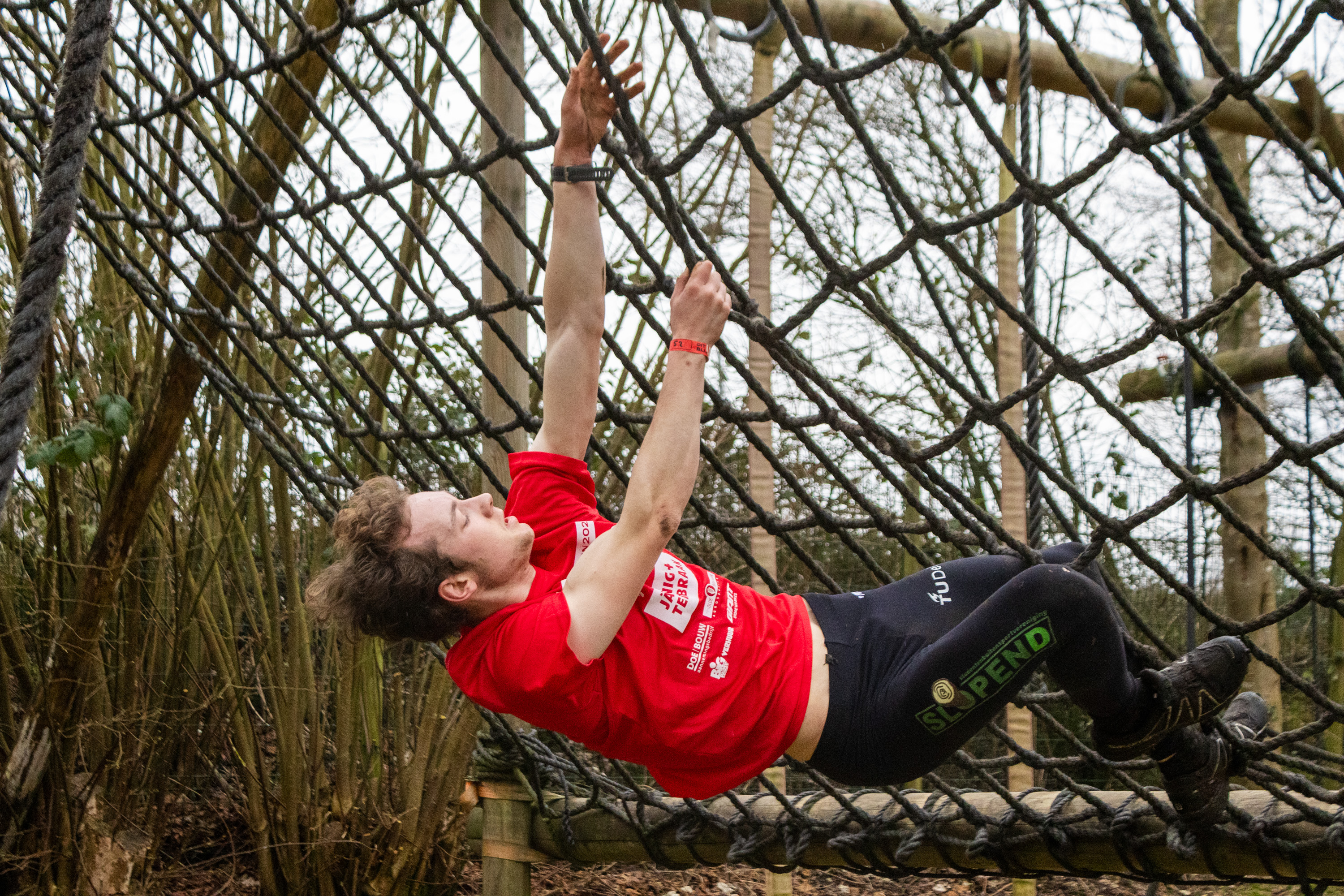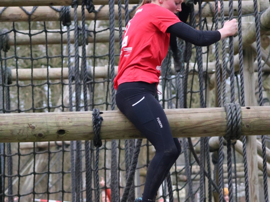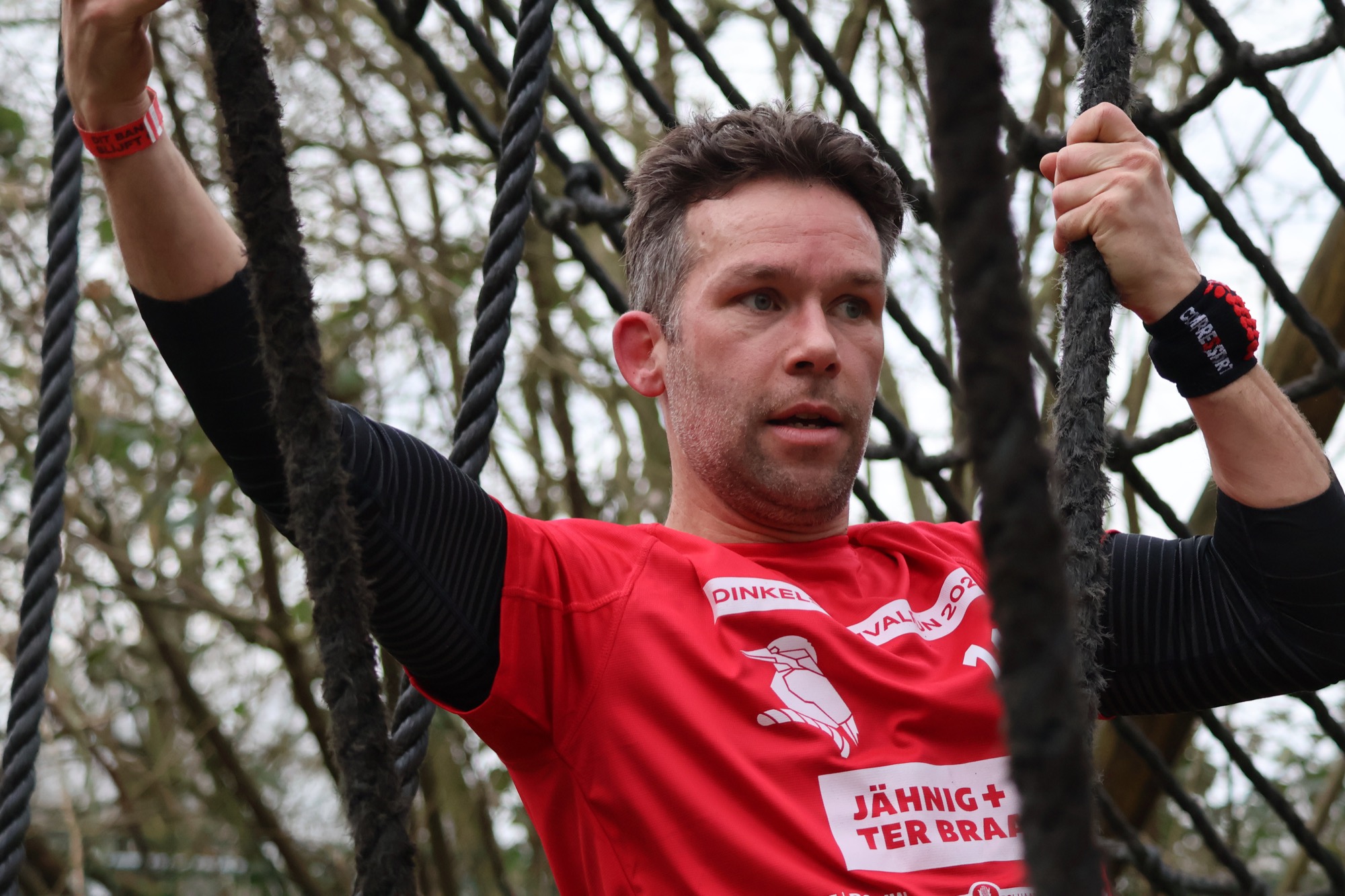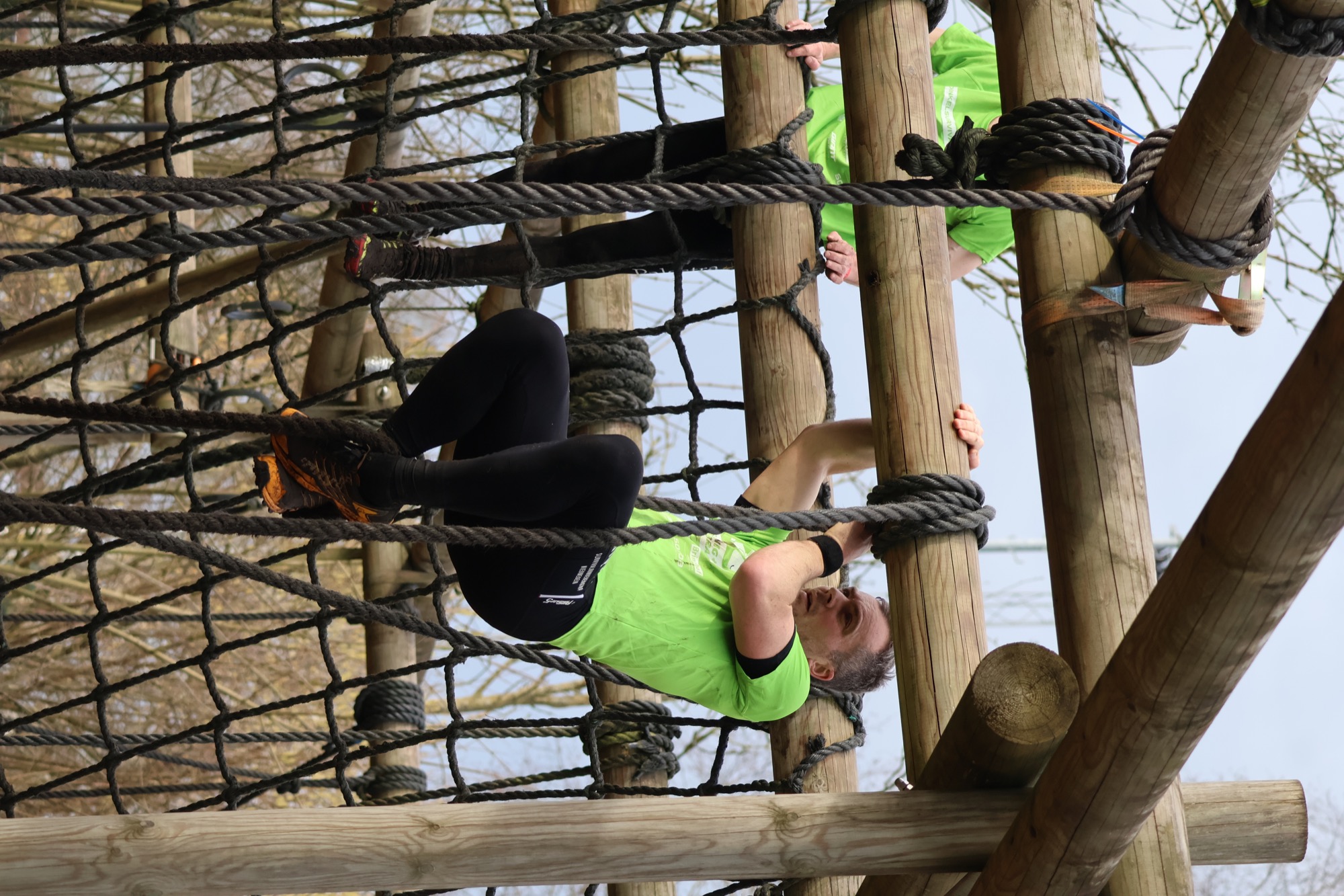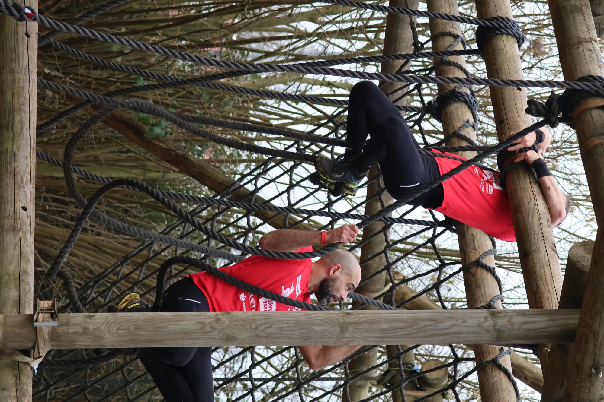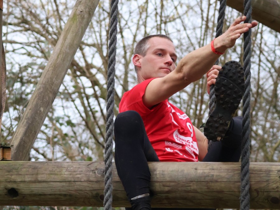 Deelnemers klimmen via het inklimtouw over de balk. Via het slappe touw klimmen ze naar het schuine net. Vervolgens klimmen ze over het schuine net door.