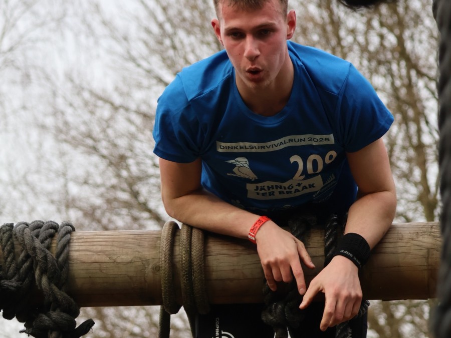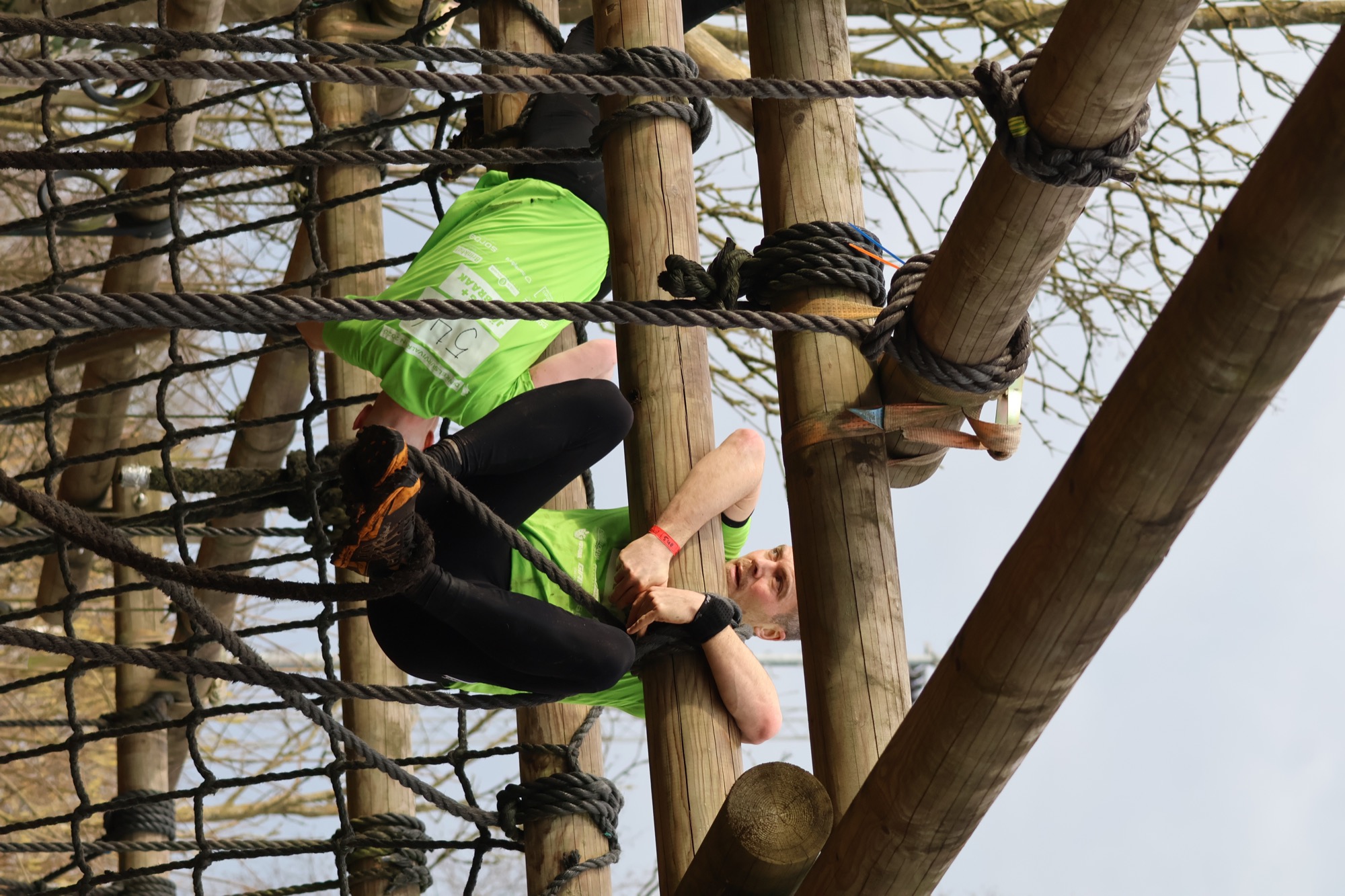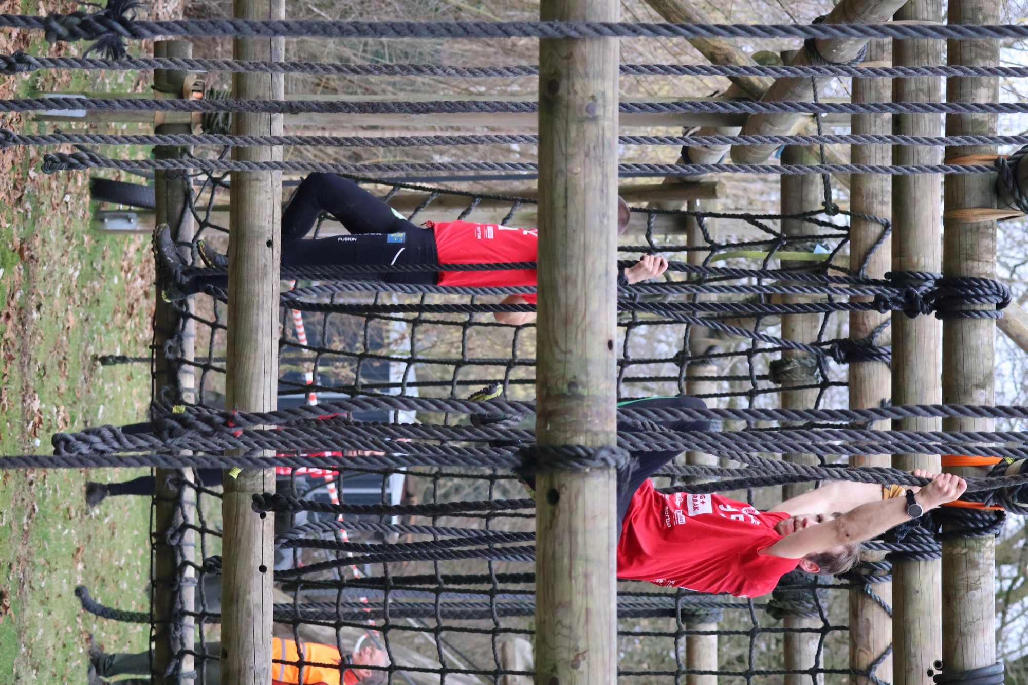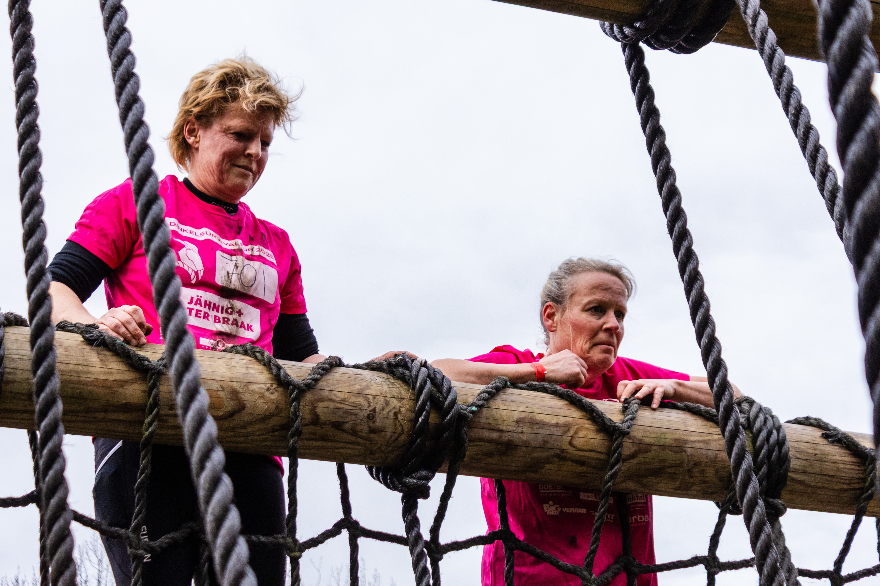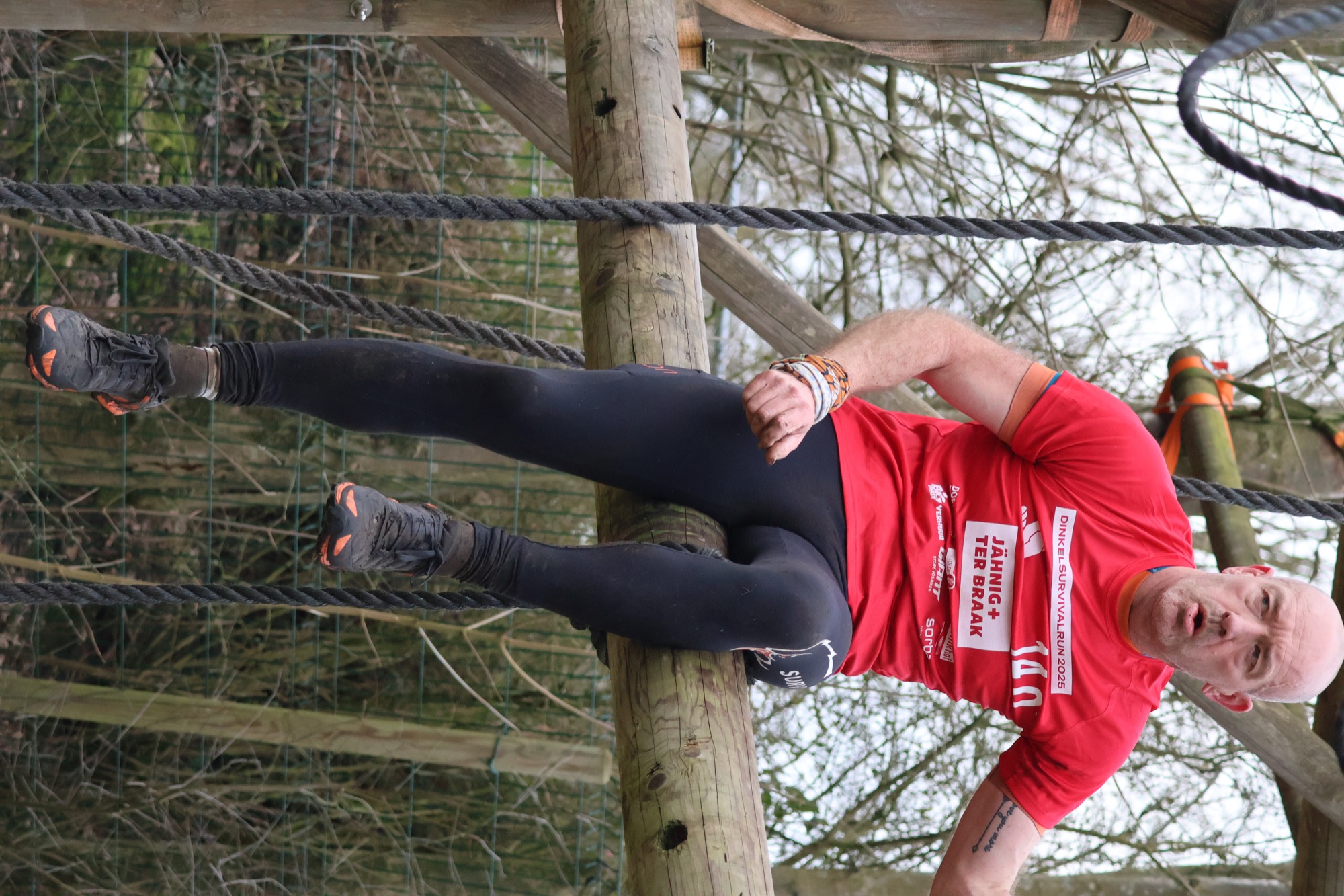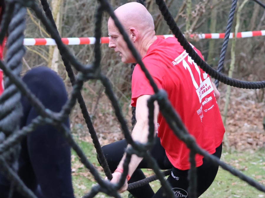 Deelnemers klimmen via het inklimtouw over de balk. Via het slappe touw klimmen ze naar het schuine net. Vervolgens klimmen ze over het schuine net door.