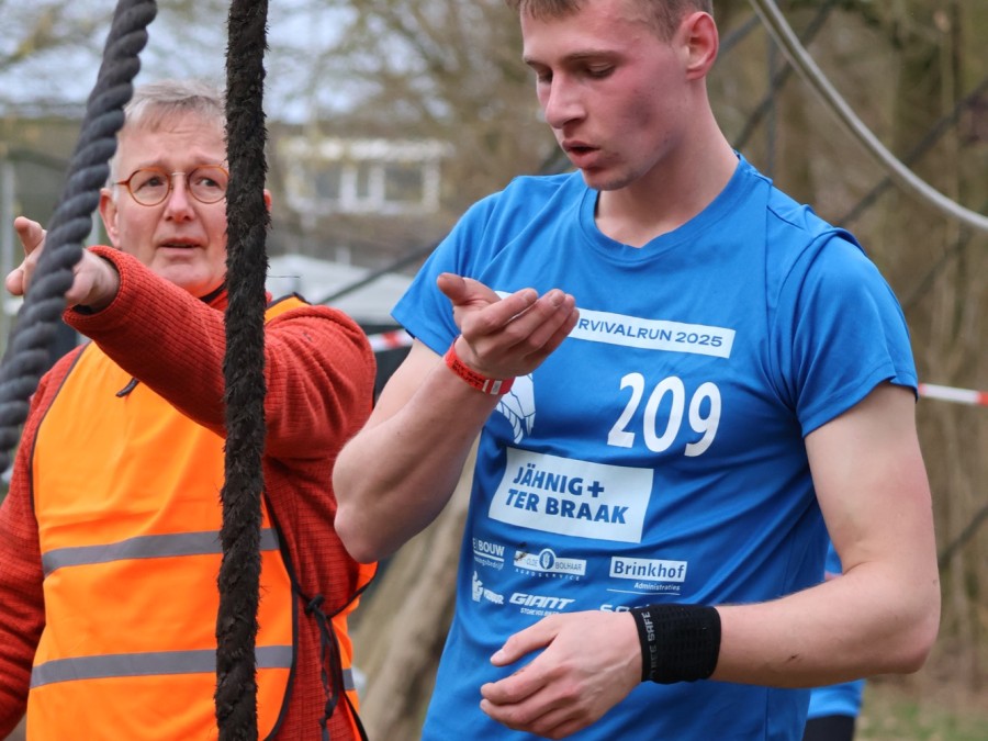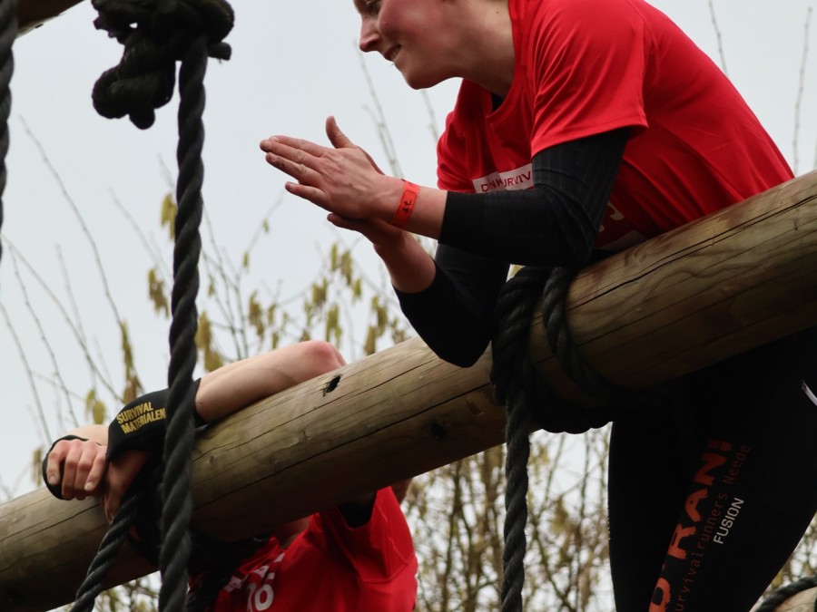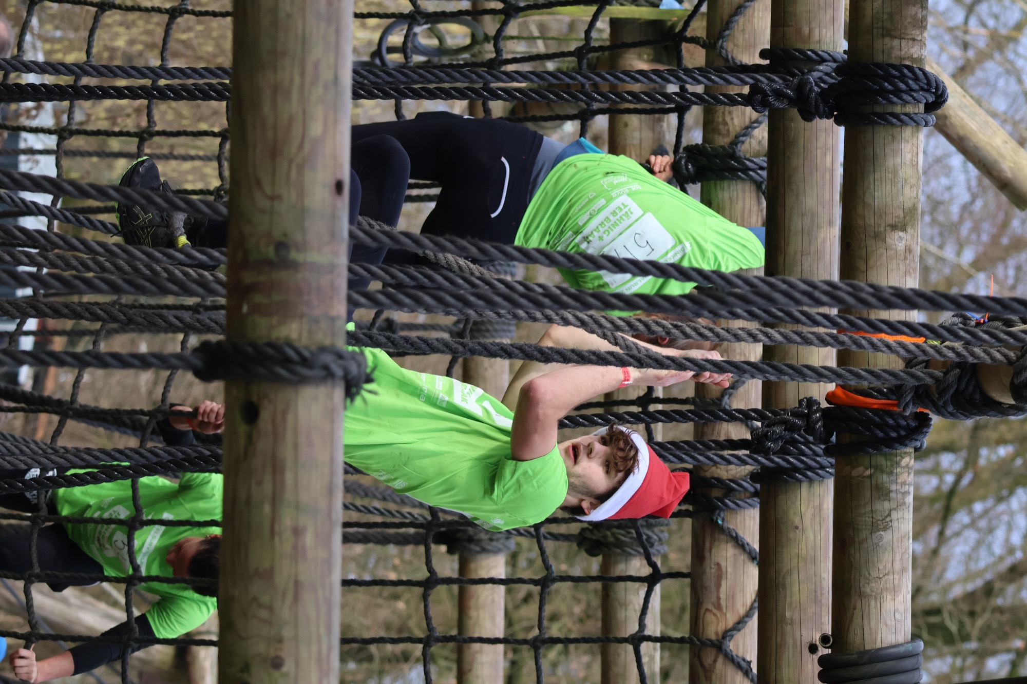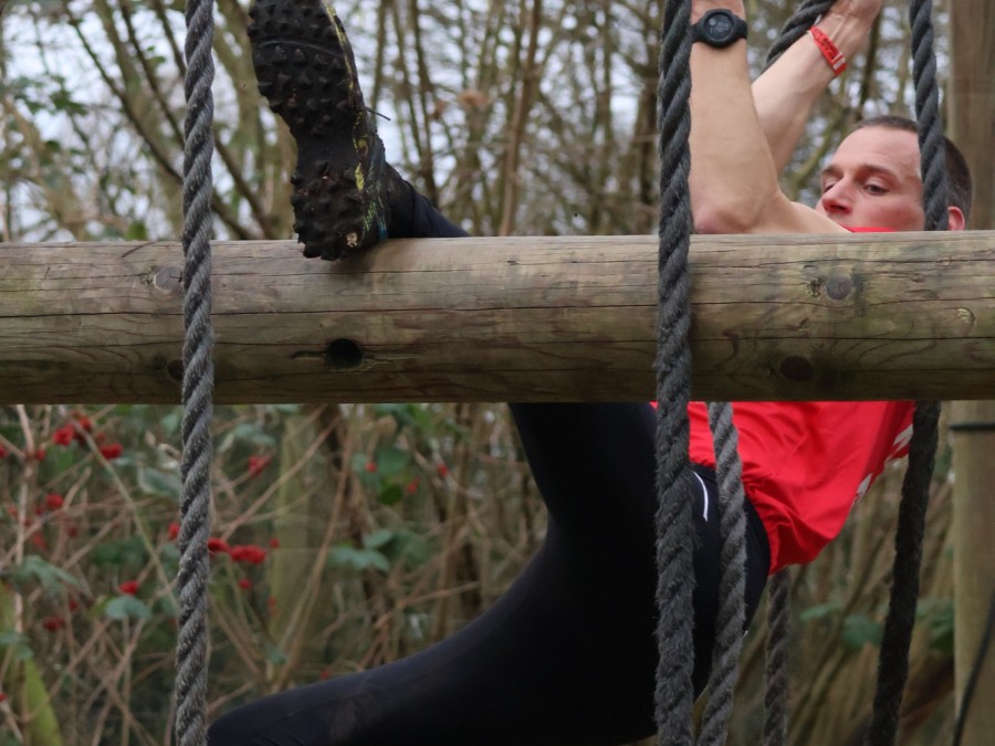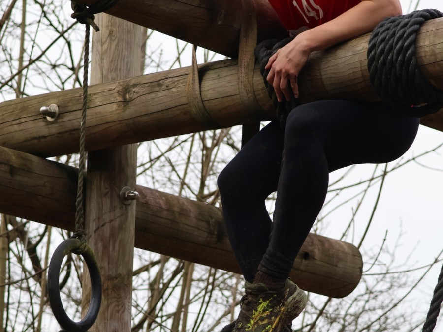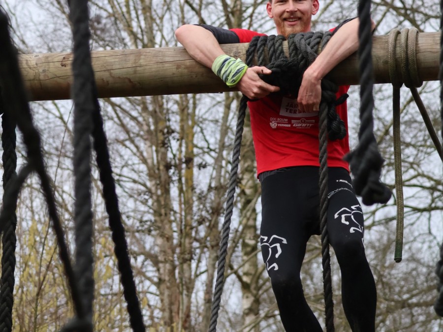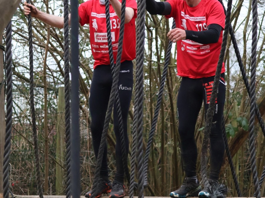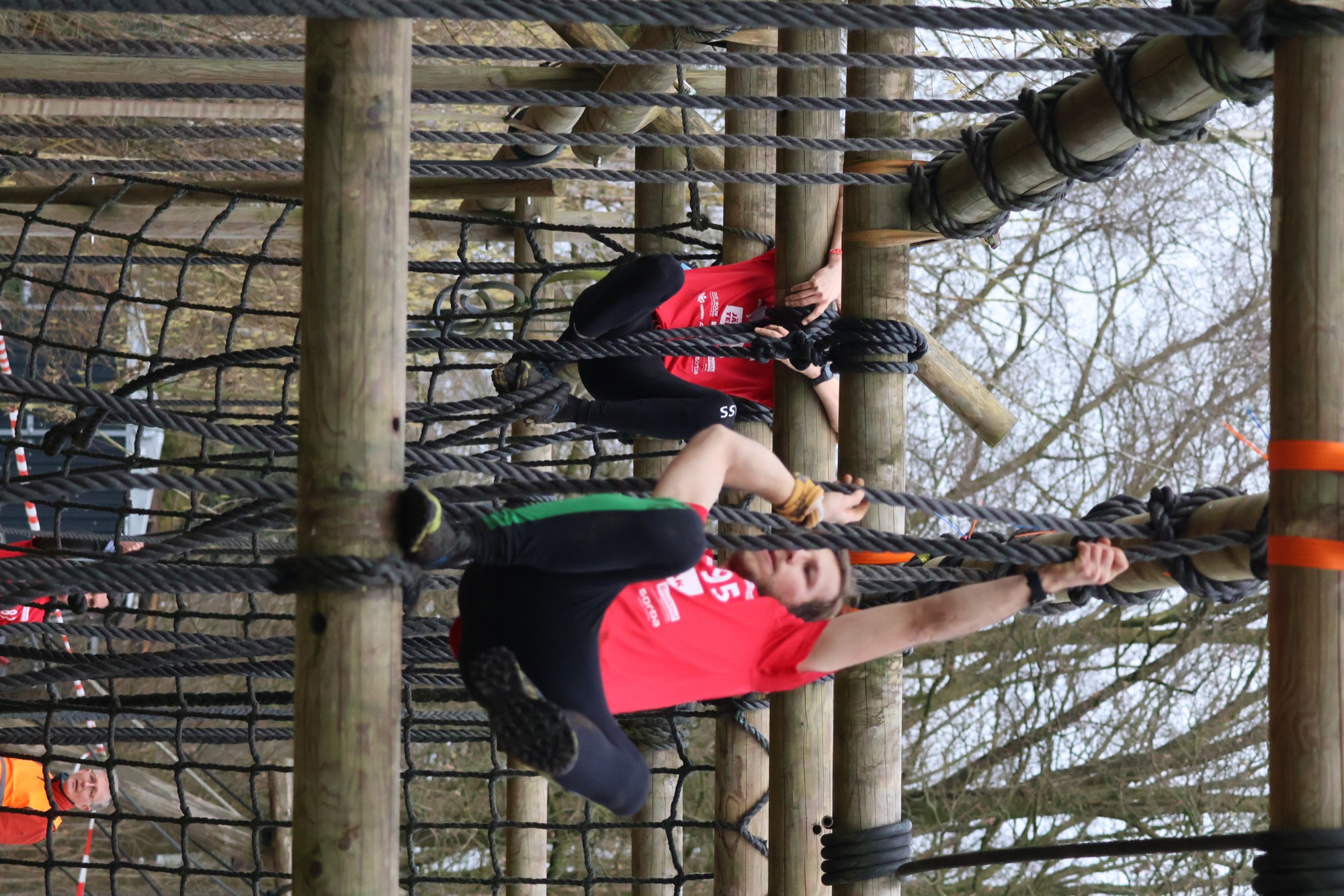 Deelnemers klimmen via het inklimtouw over de balk. Via het slappe touw klimmen ze naar het schuine net. Vervolgens klimmen ze over het schuine net door.