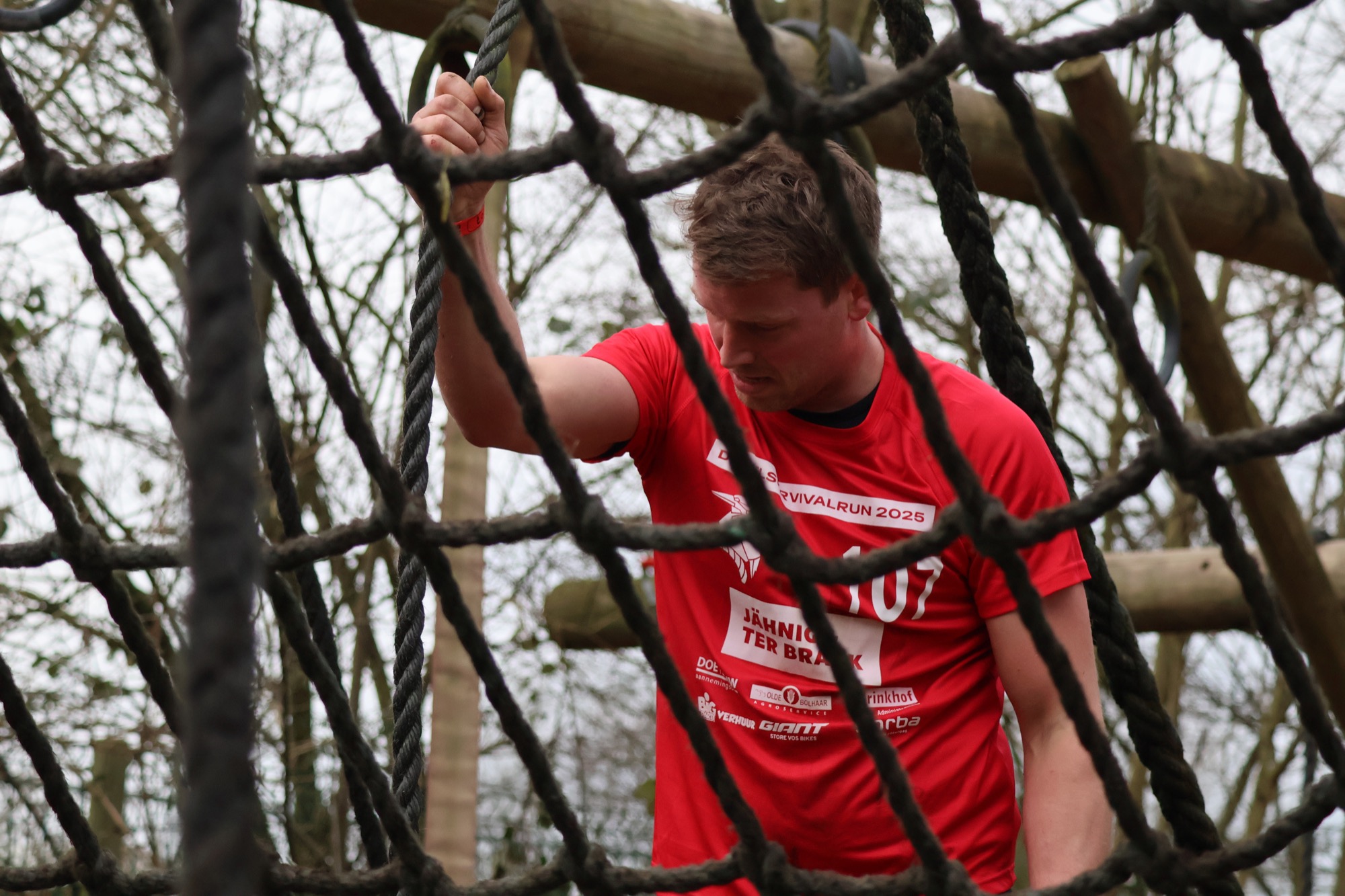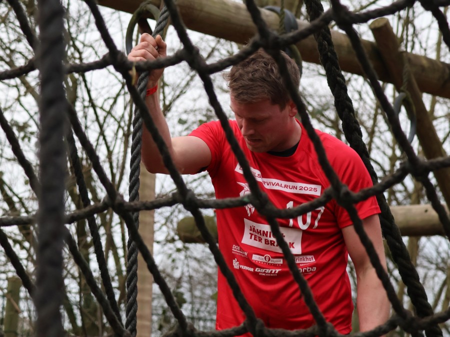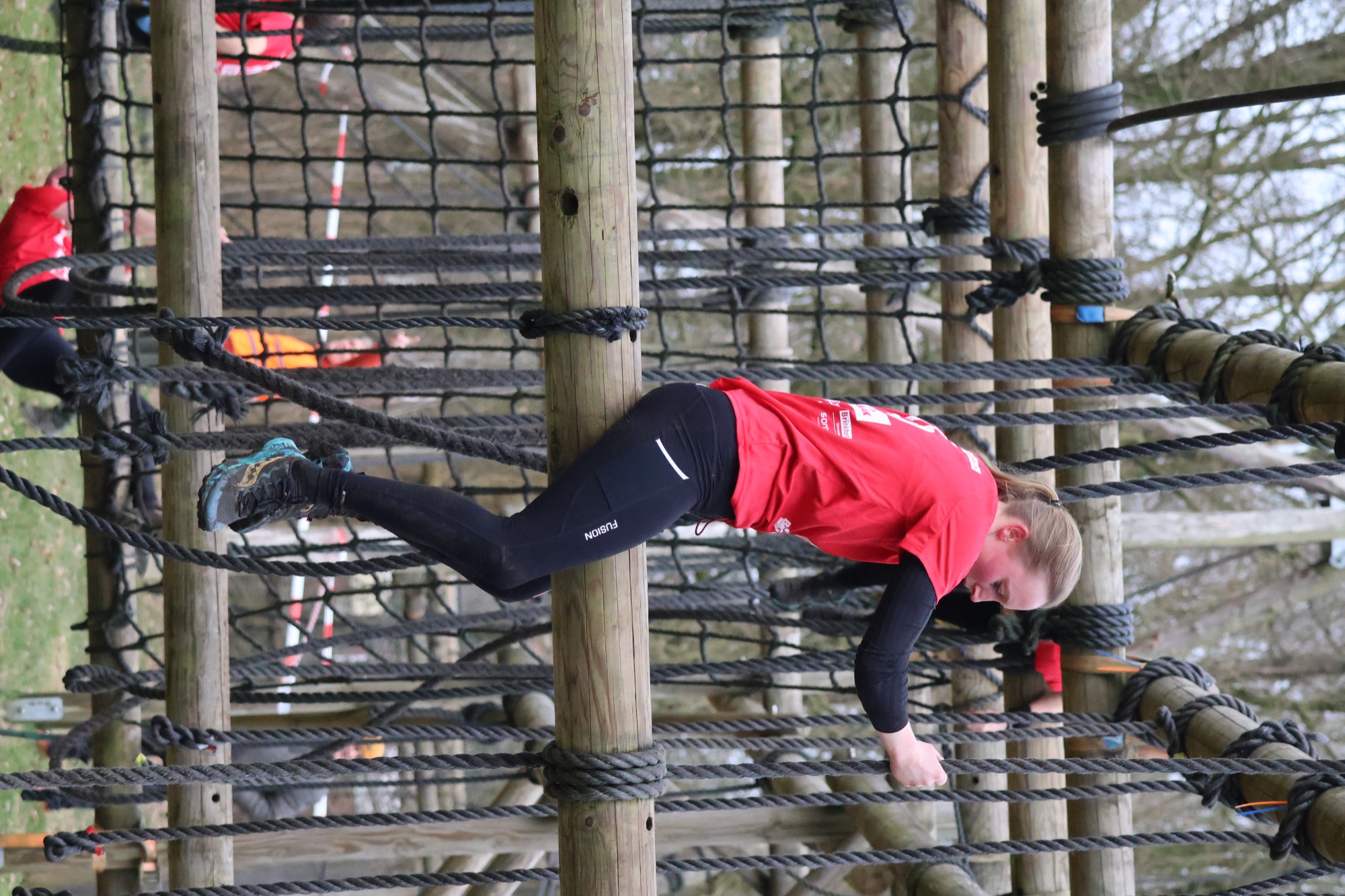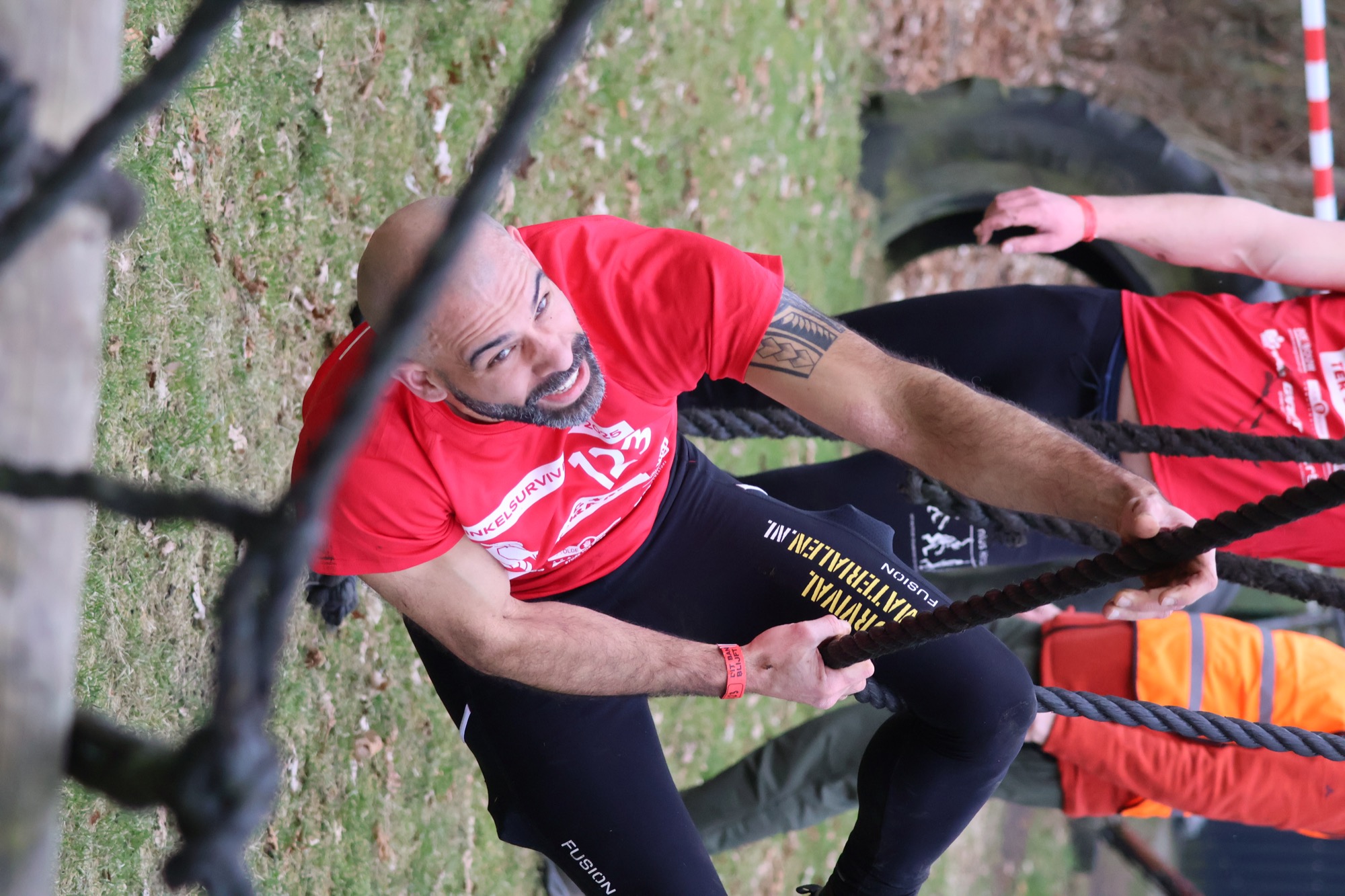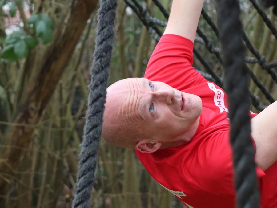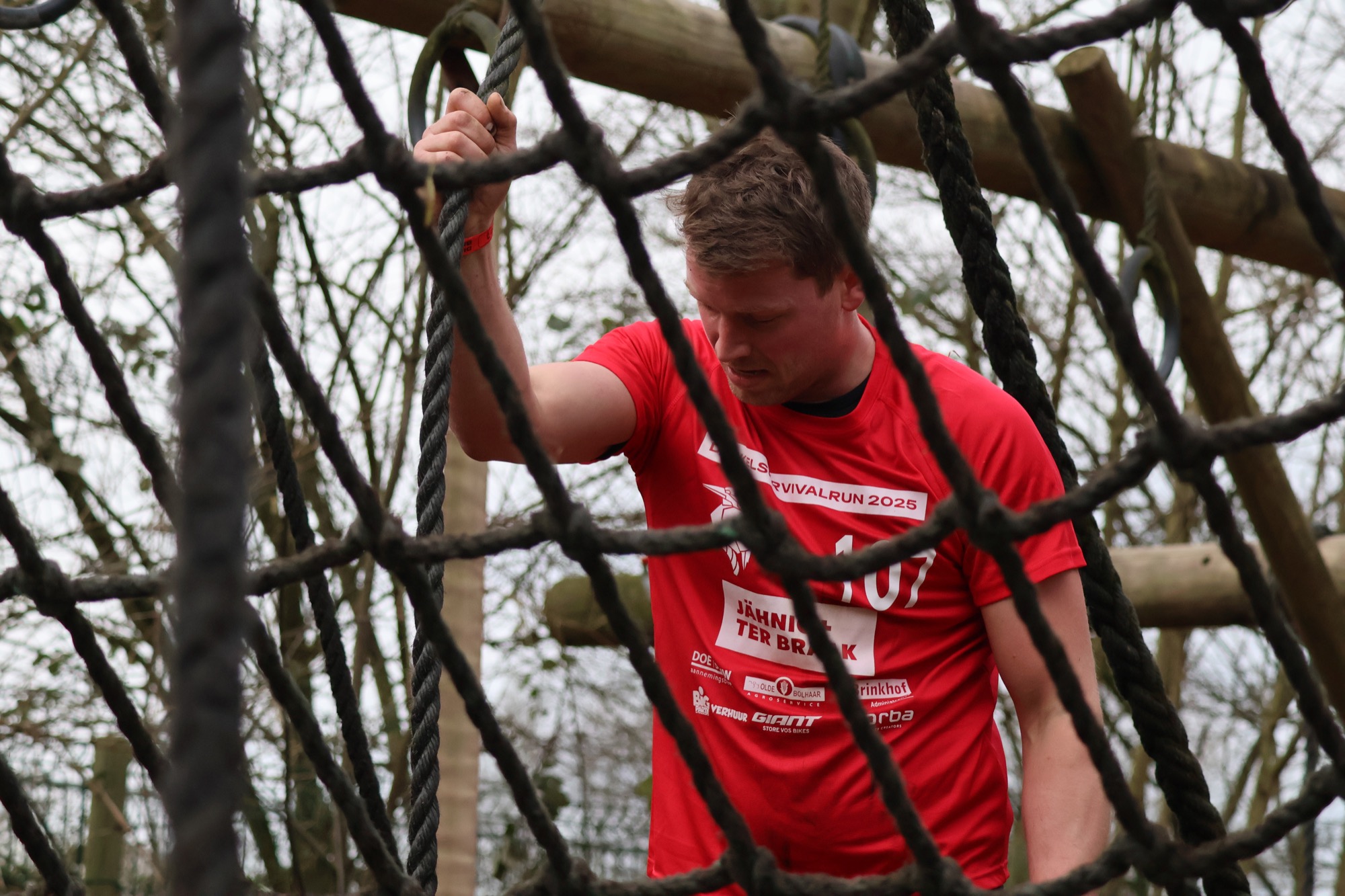 Deelnemers klimmen via het inklimtouw over de balk. Via het slappe touw klimmen ze naar het schuine net. Vervolgens klimmen ze over het schuine net door.