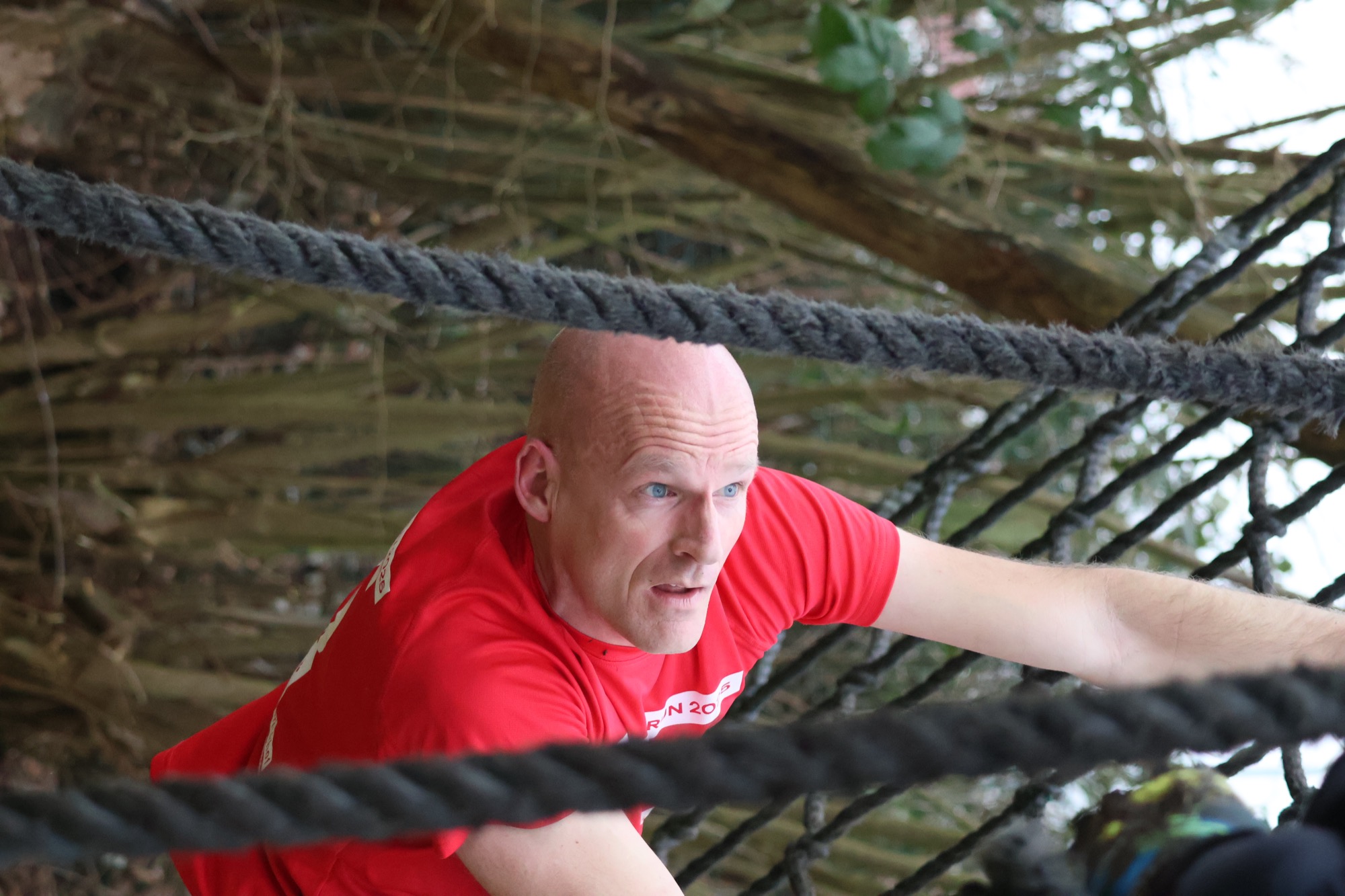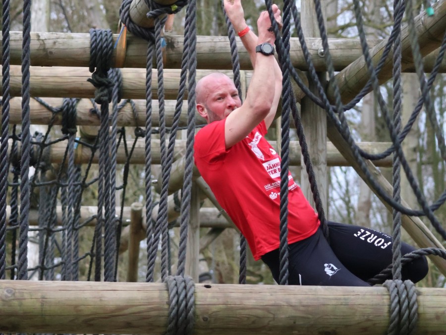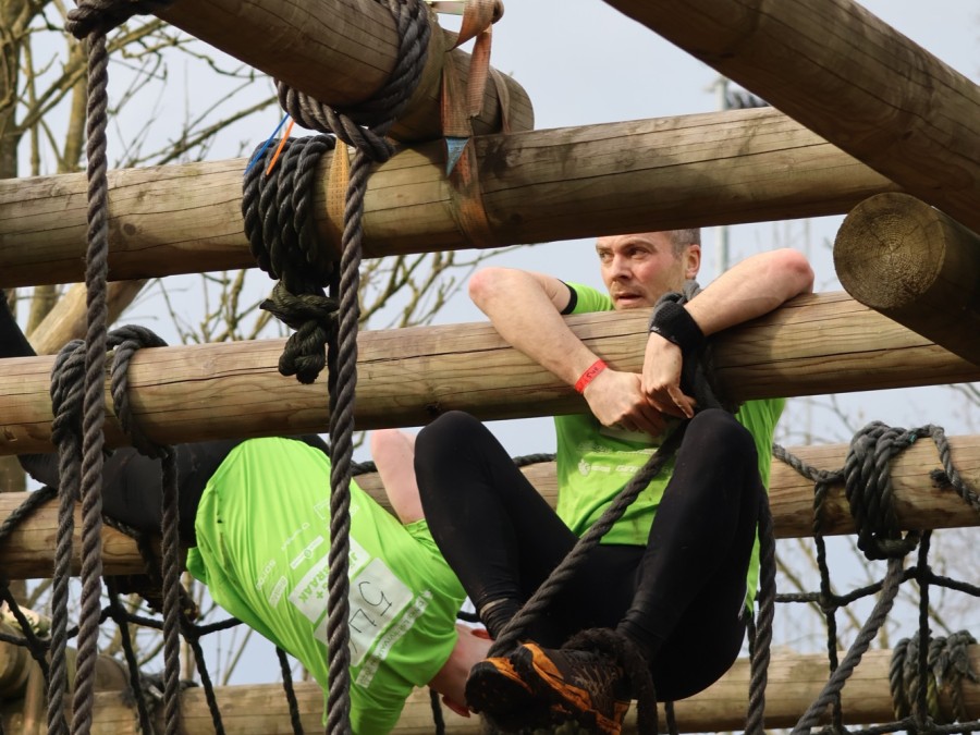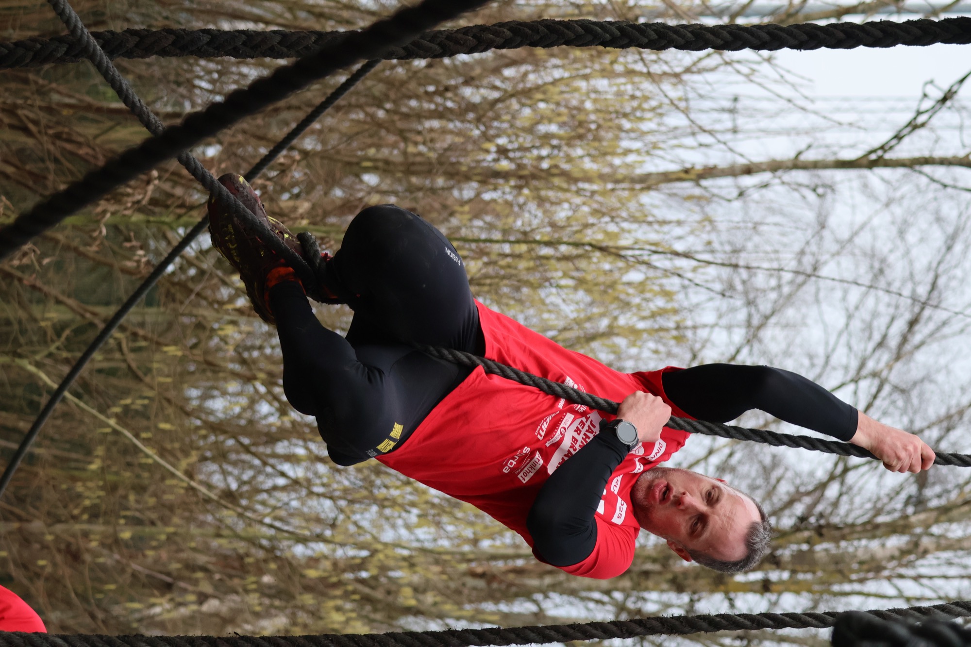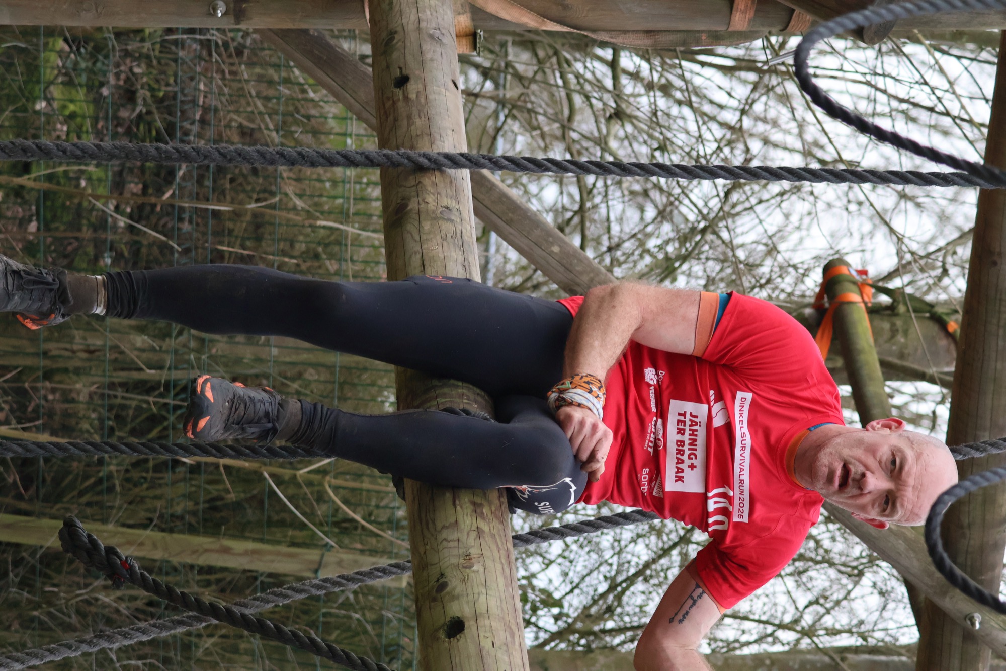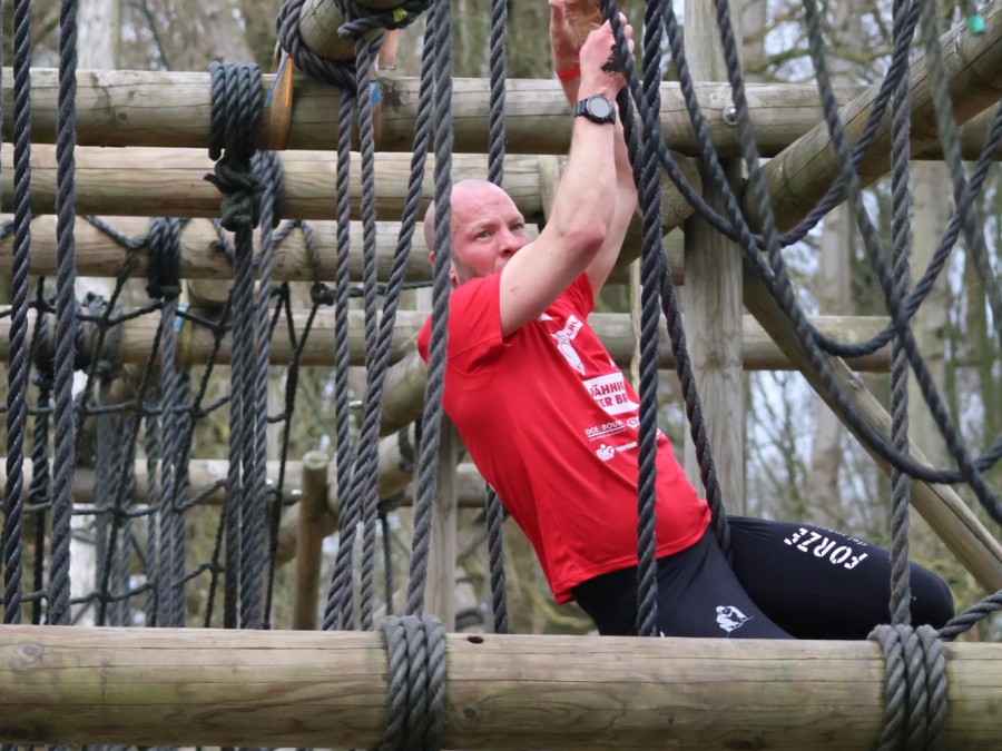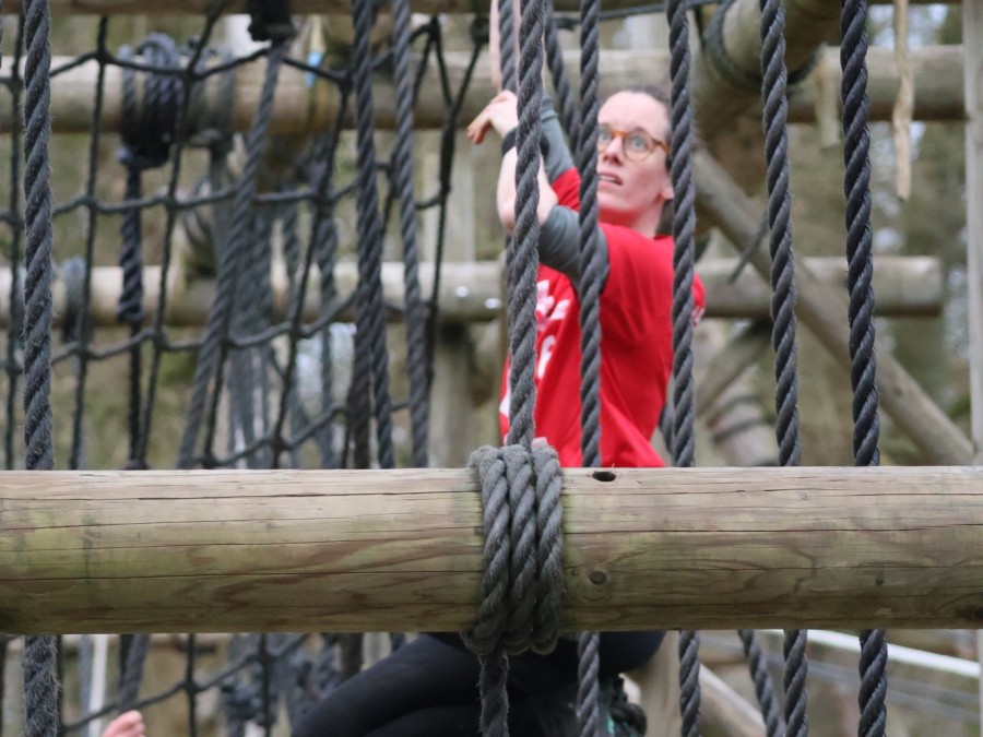 Deelnemers klimmen via het inklimtouw over de balk. Via het slappe touw klimmen ze naar het schuine net. Vervolgens klimmen ze over het schuine net door.