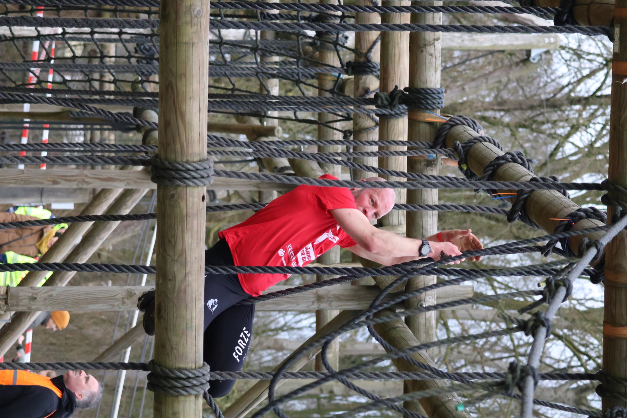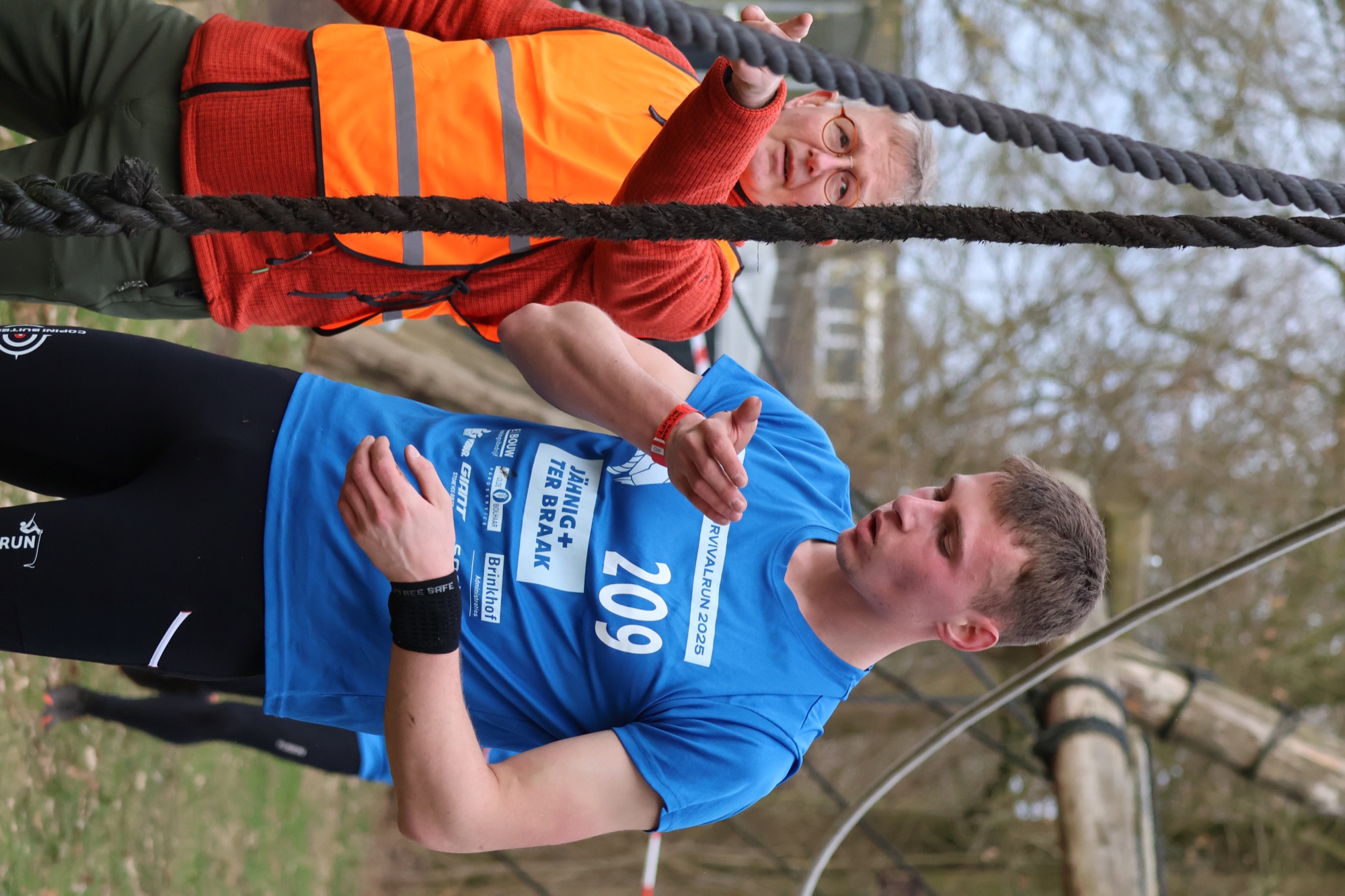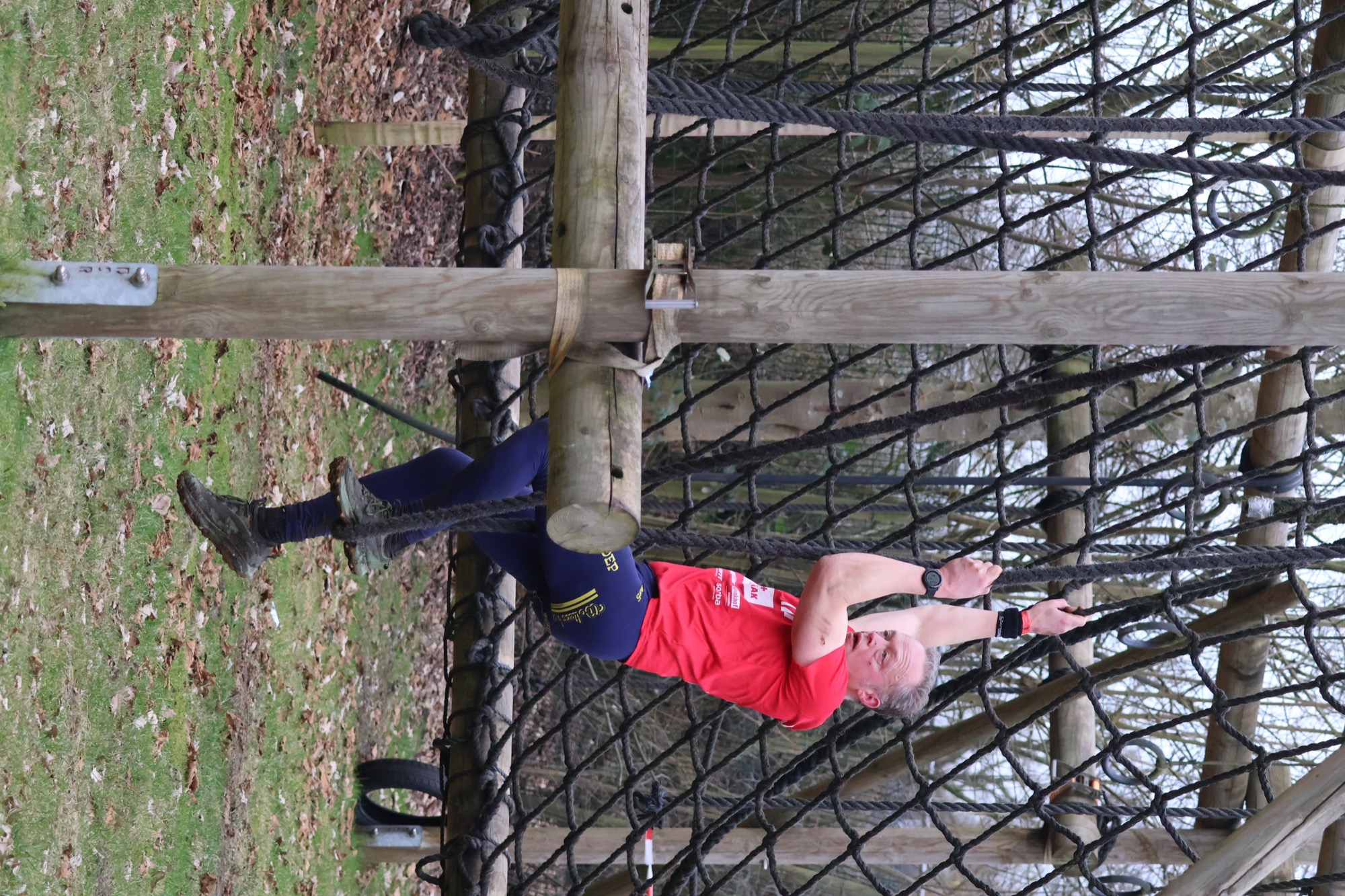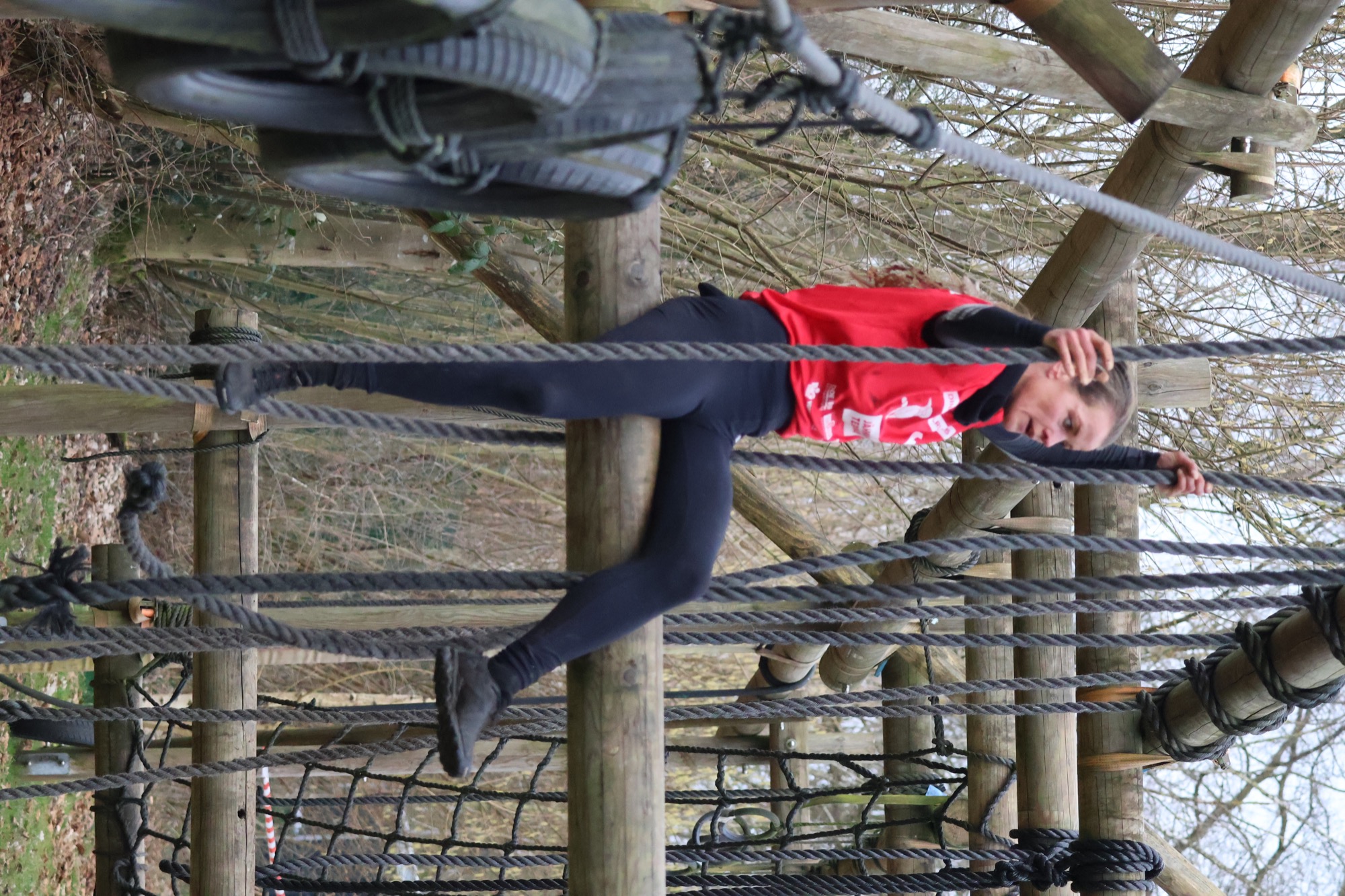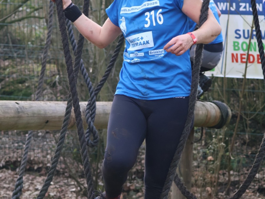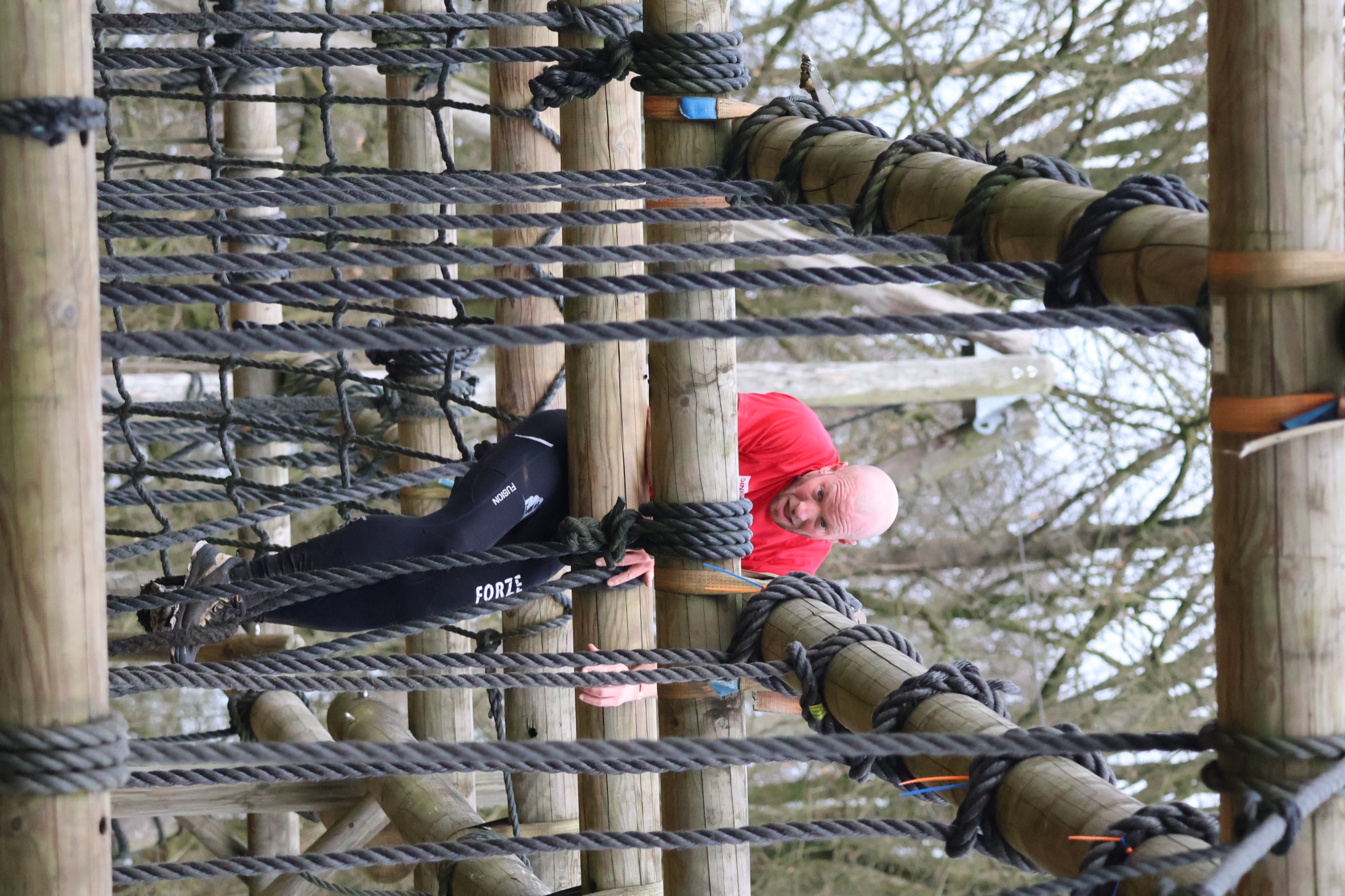 Deelnemers klimmen via het inklimtouw over de balk. Via het slappe touw klimmen ze naar het schuine net. Vervolgens klimmen ze over het schuine net door.