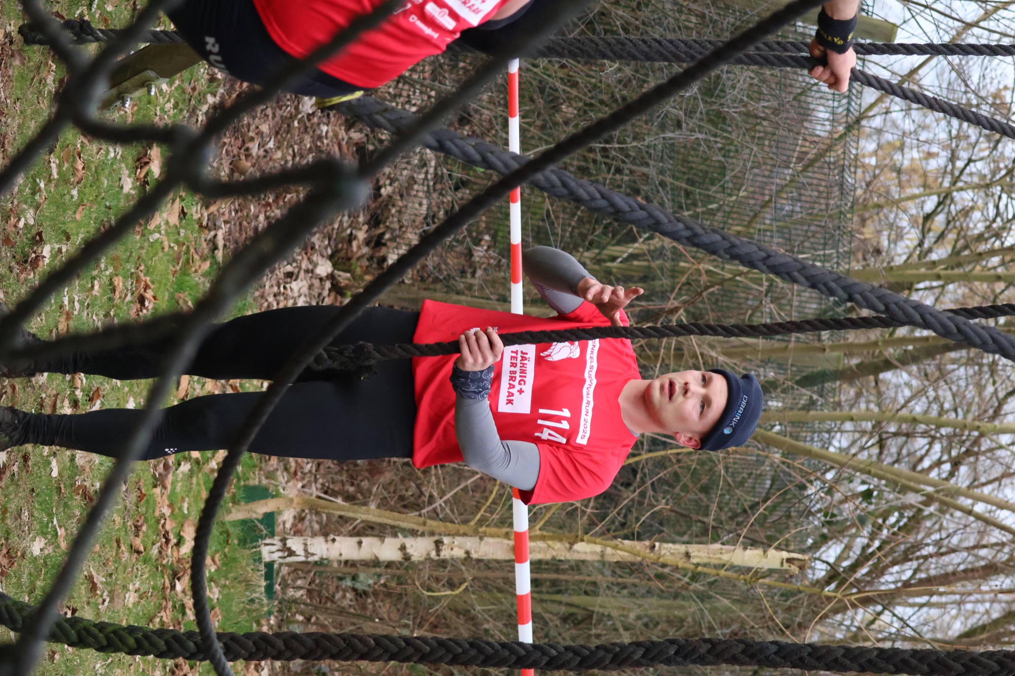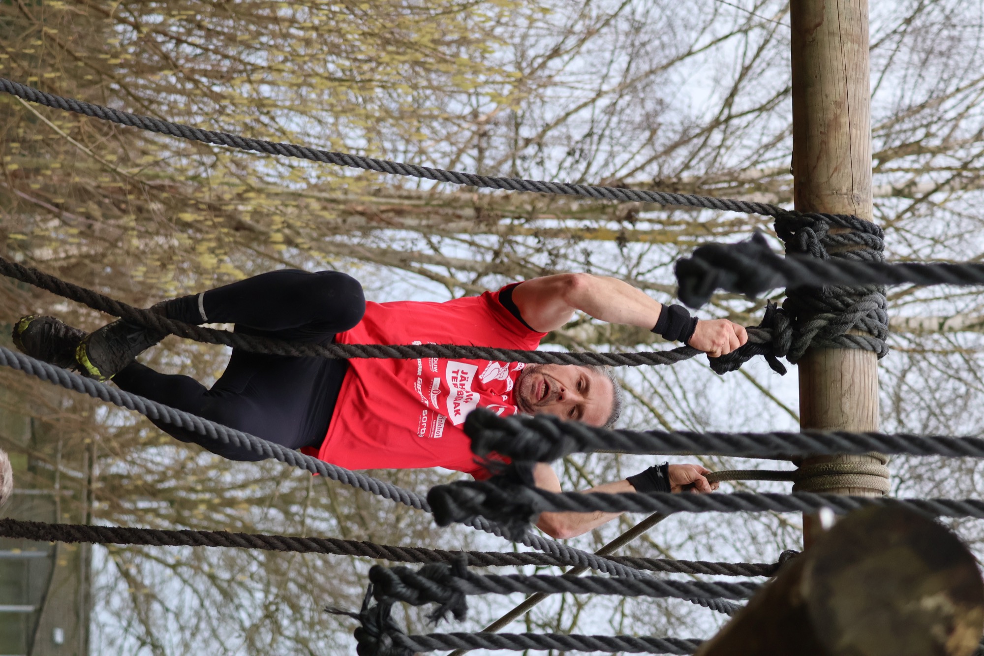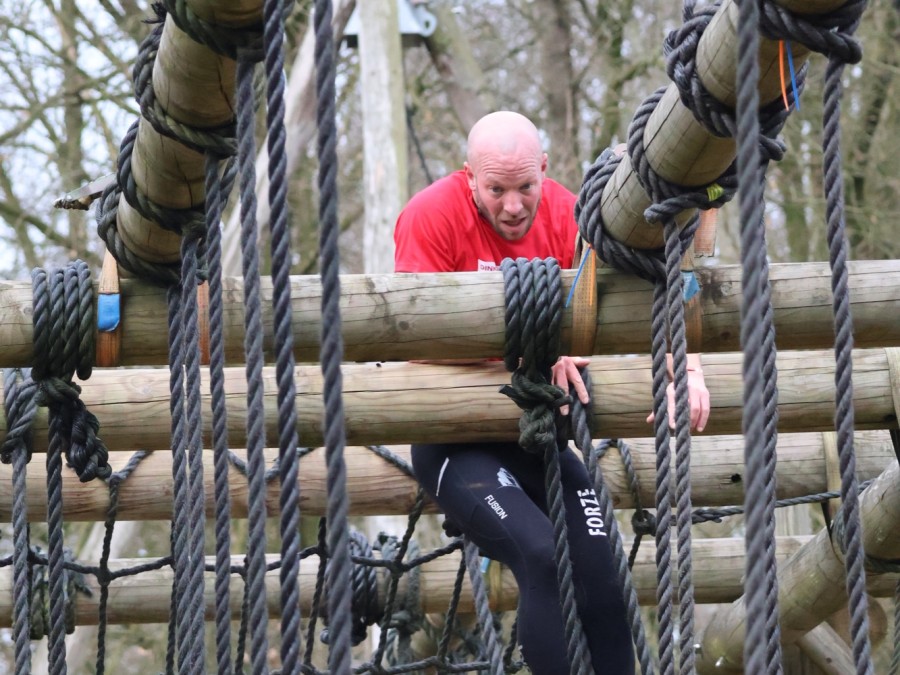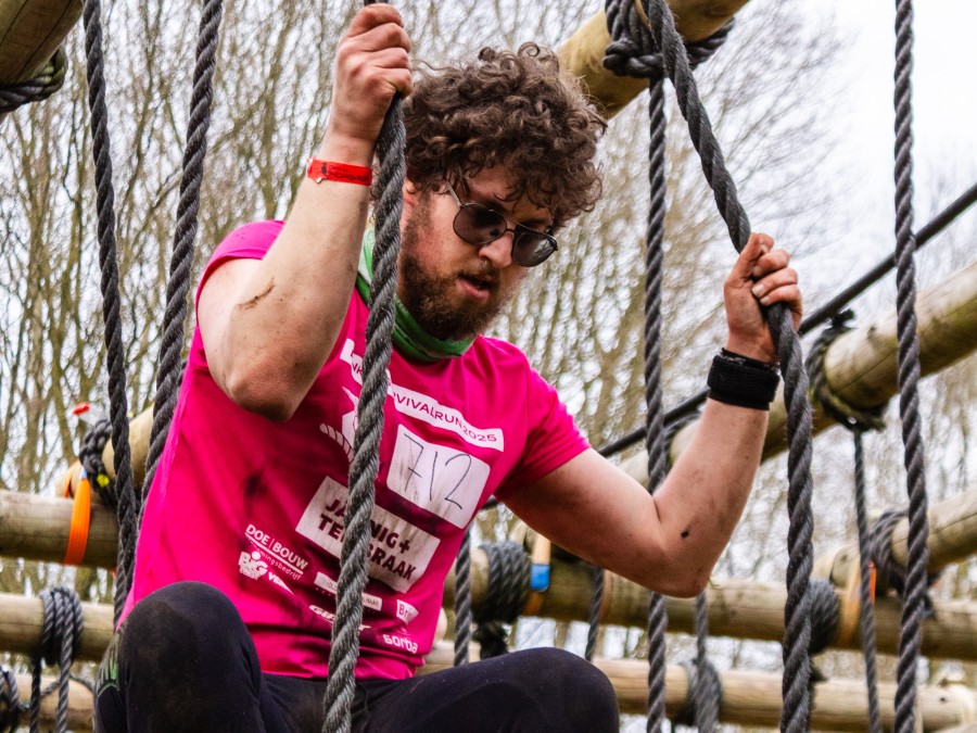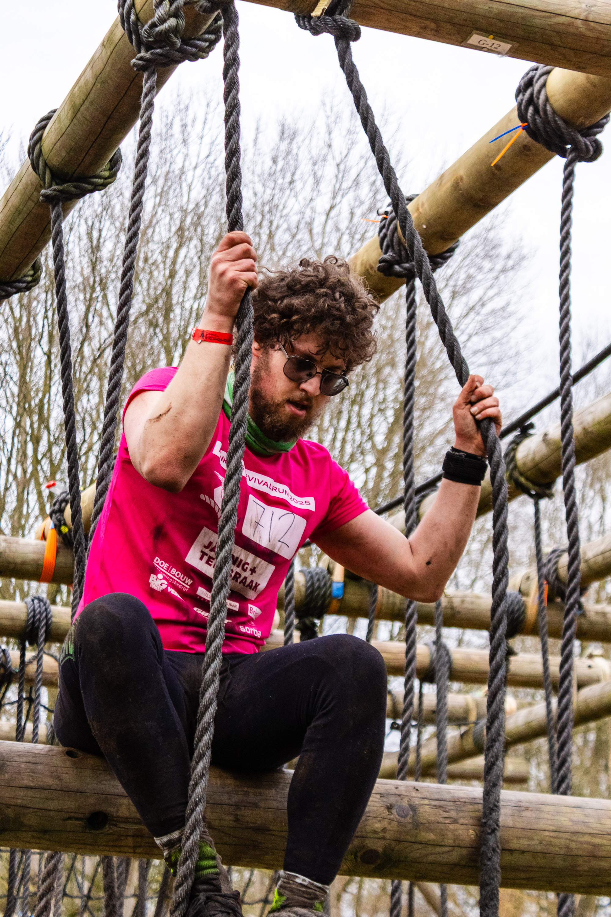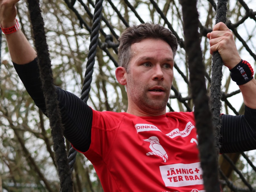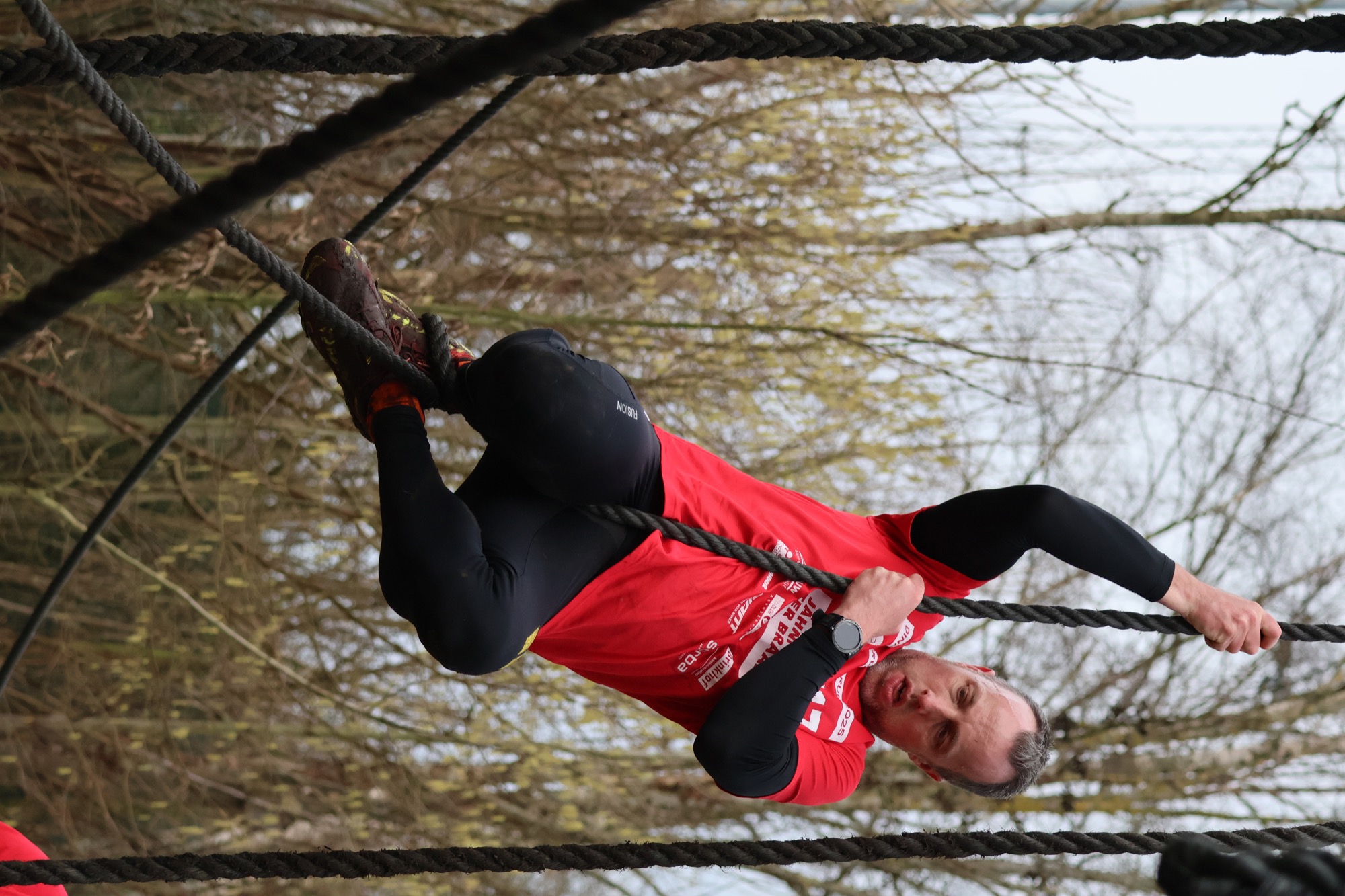 Deelnemers klimmen via het inklimtouw over de balk. Via het slappe touw klimmen ze naar het schuine net. Vervolgens klimmen ze over het schuine net door.