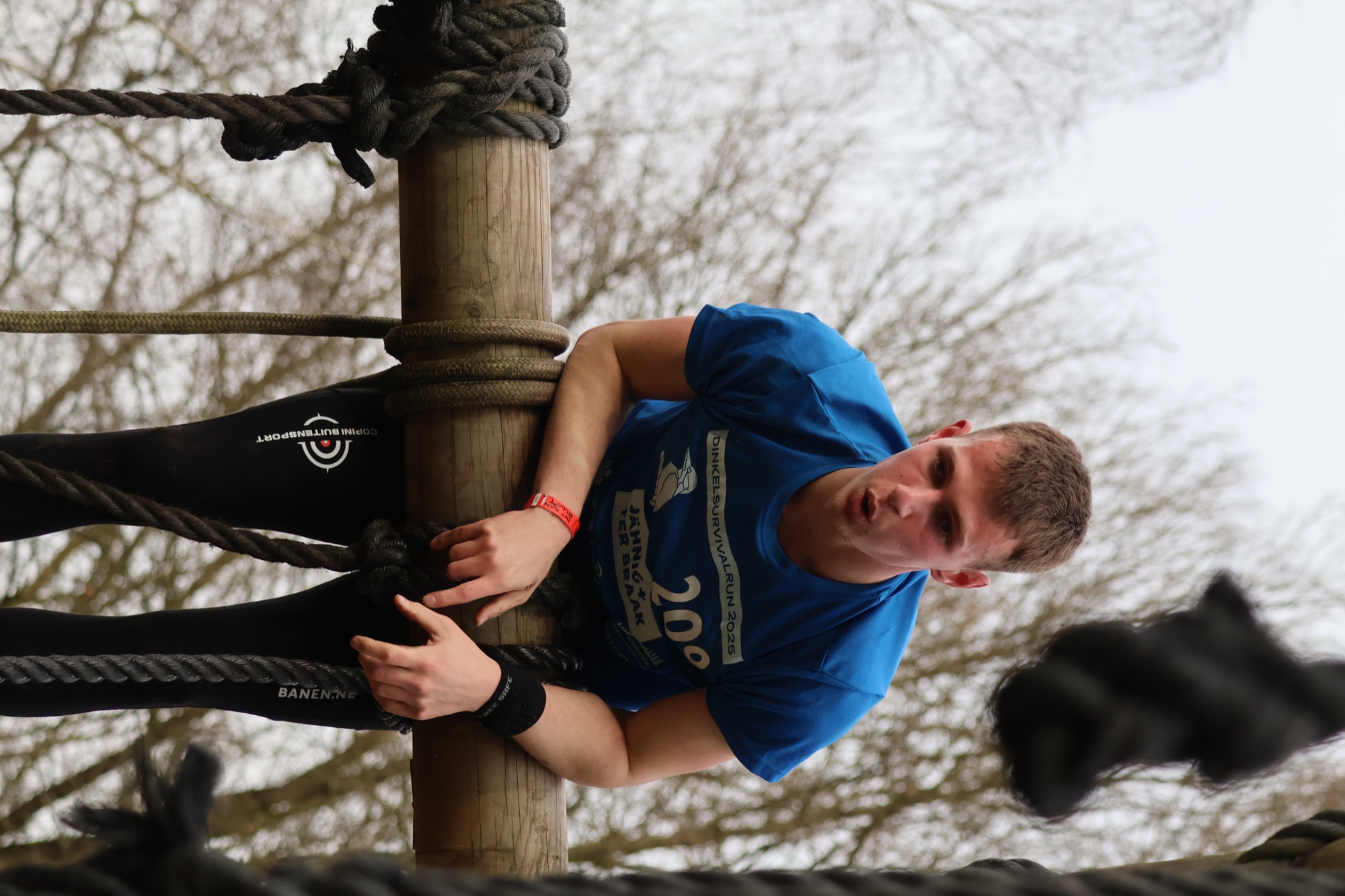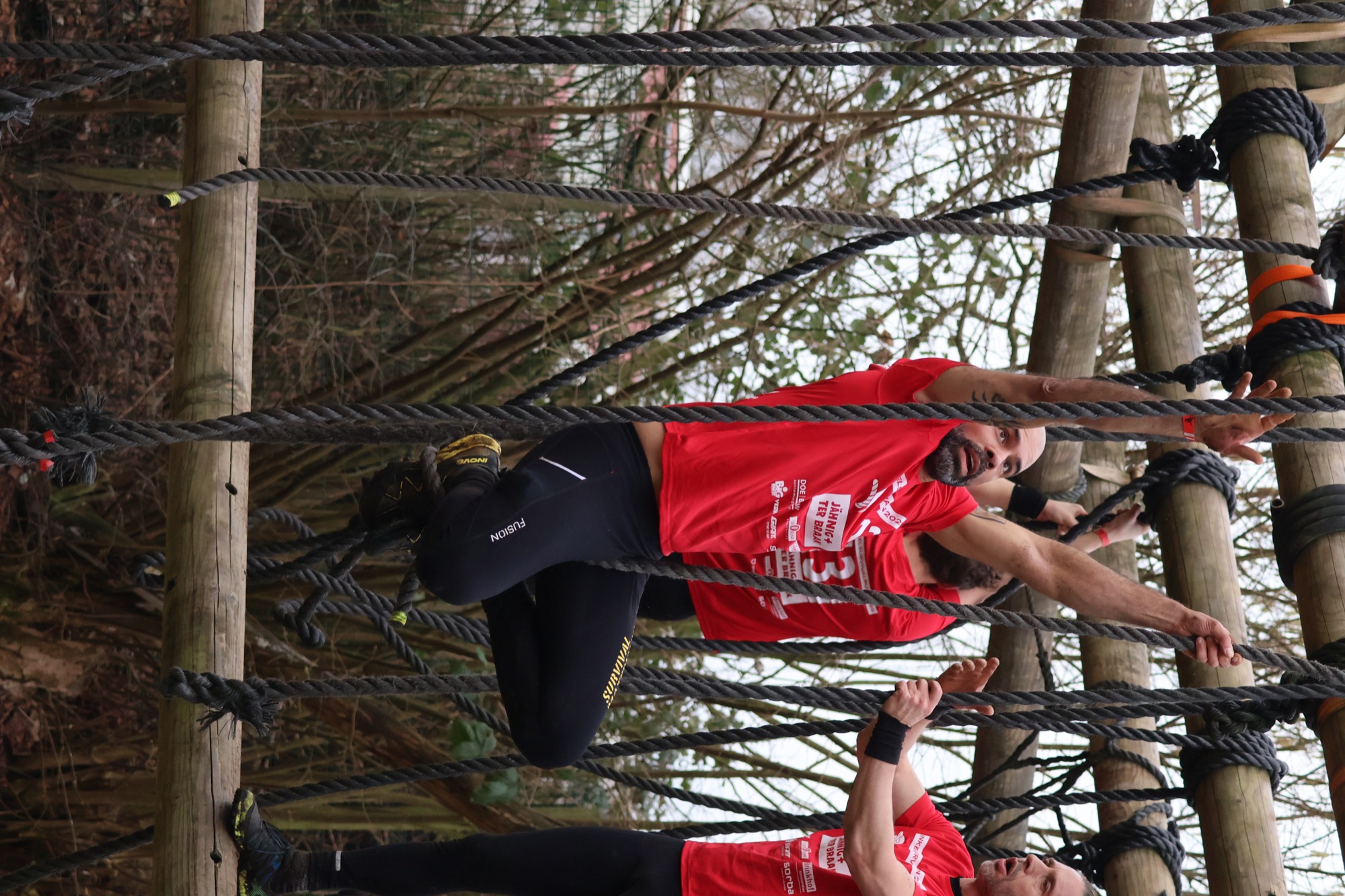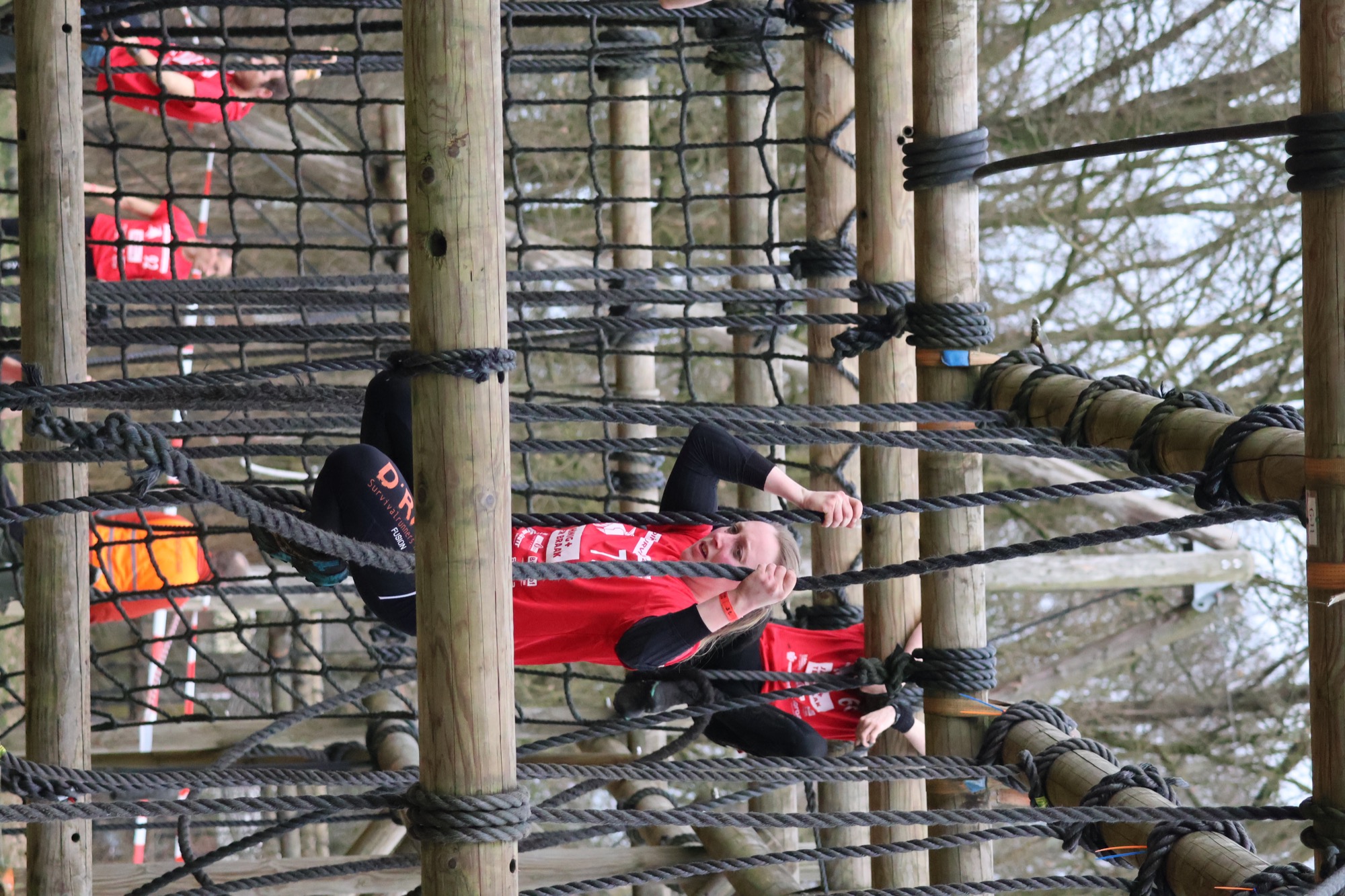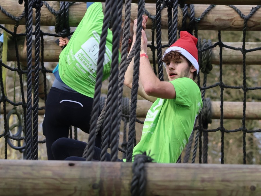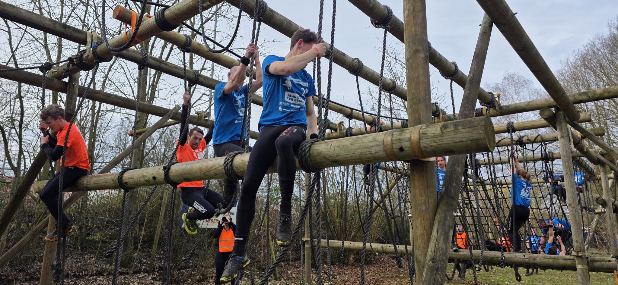 Deelnemers klimmen via het inklimtouw over de balk. Via het slappe touw klimmen ze naar het schuine net. Vervolgens klimmen ze over het schuine net door.