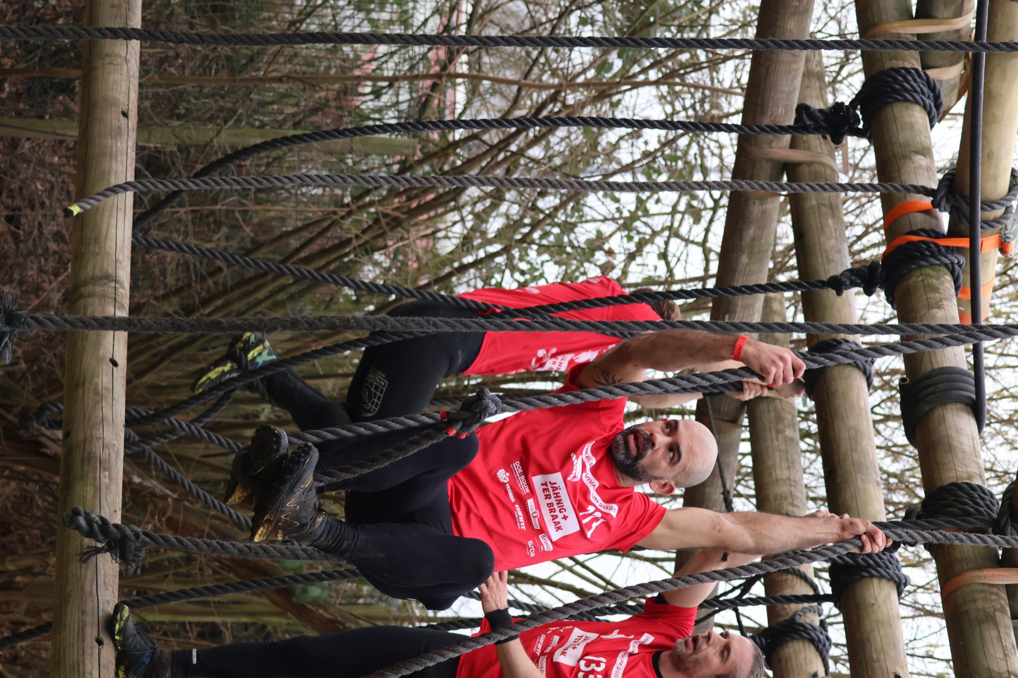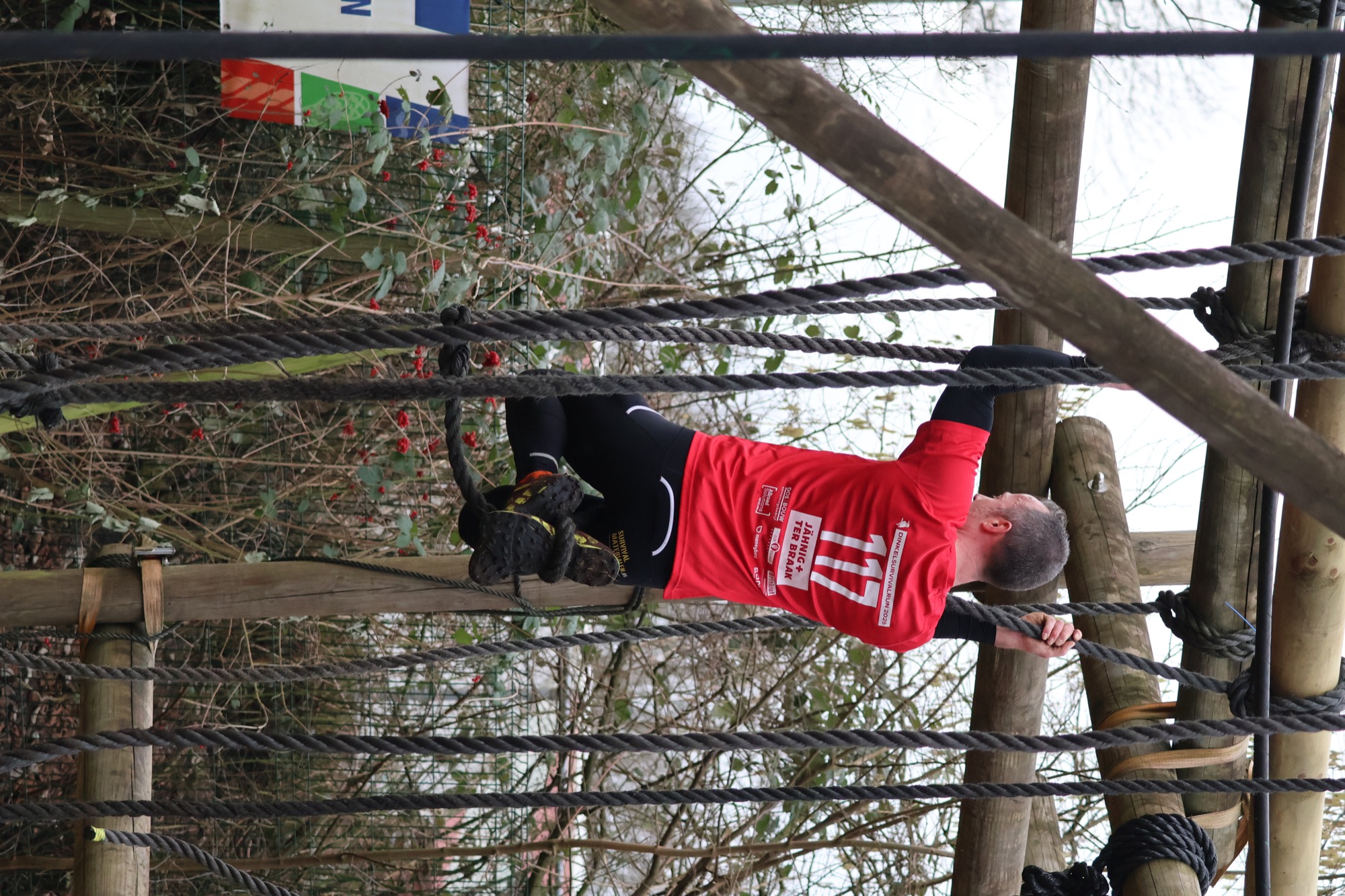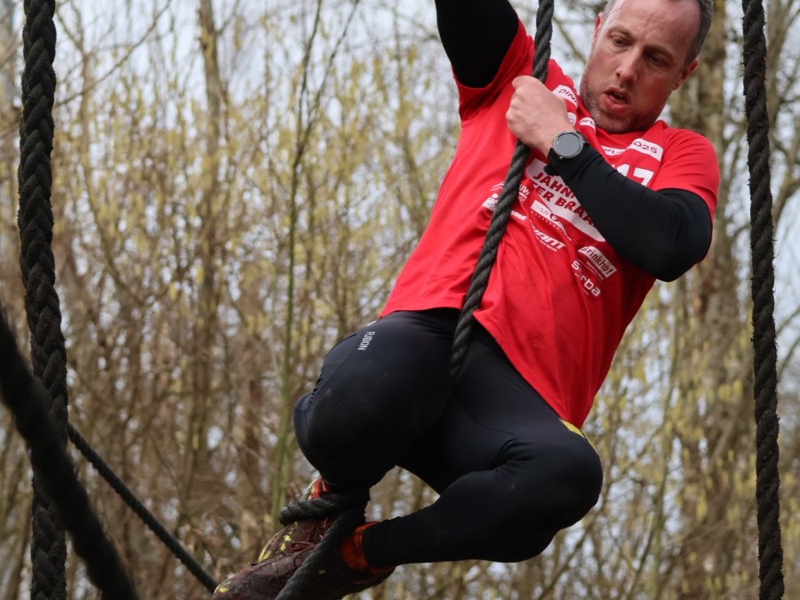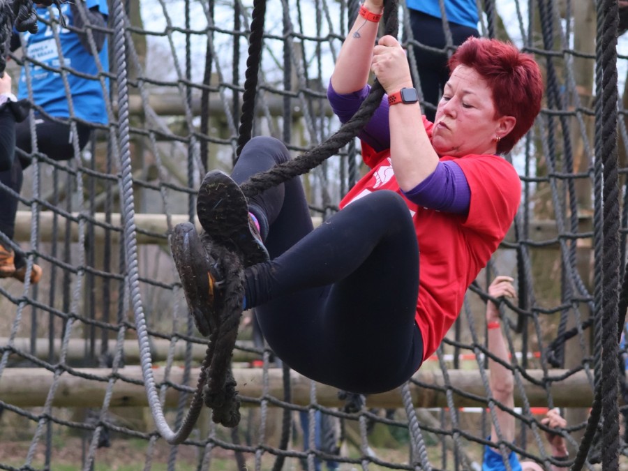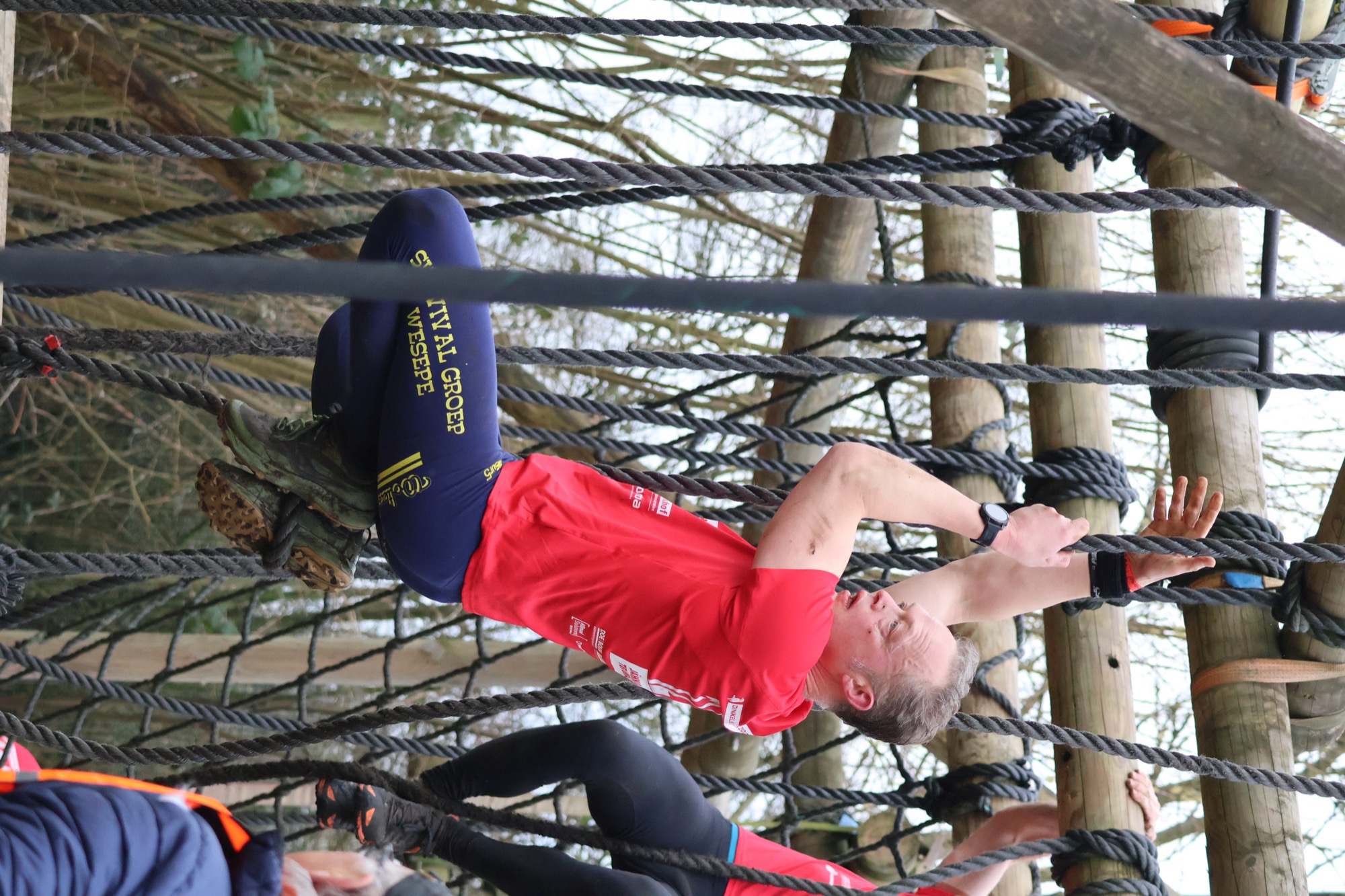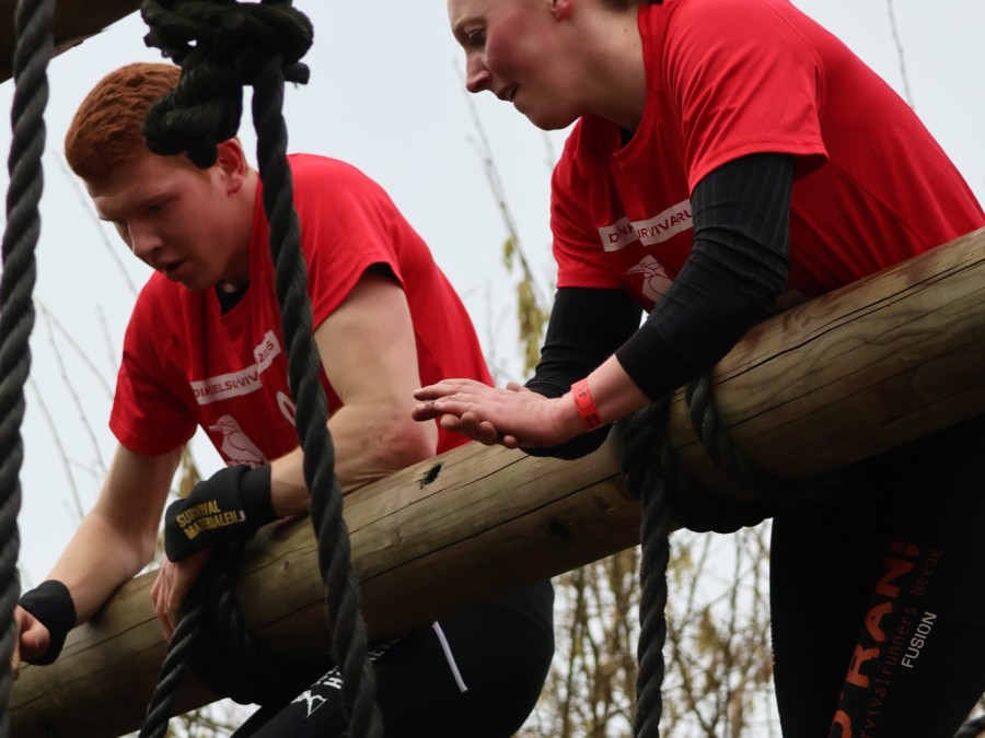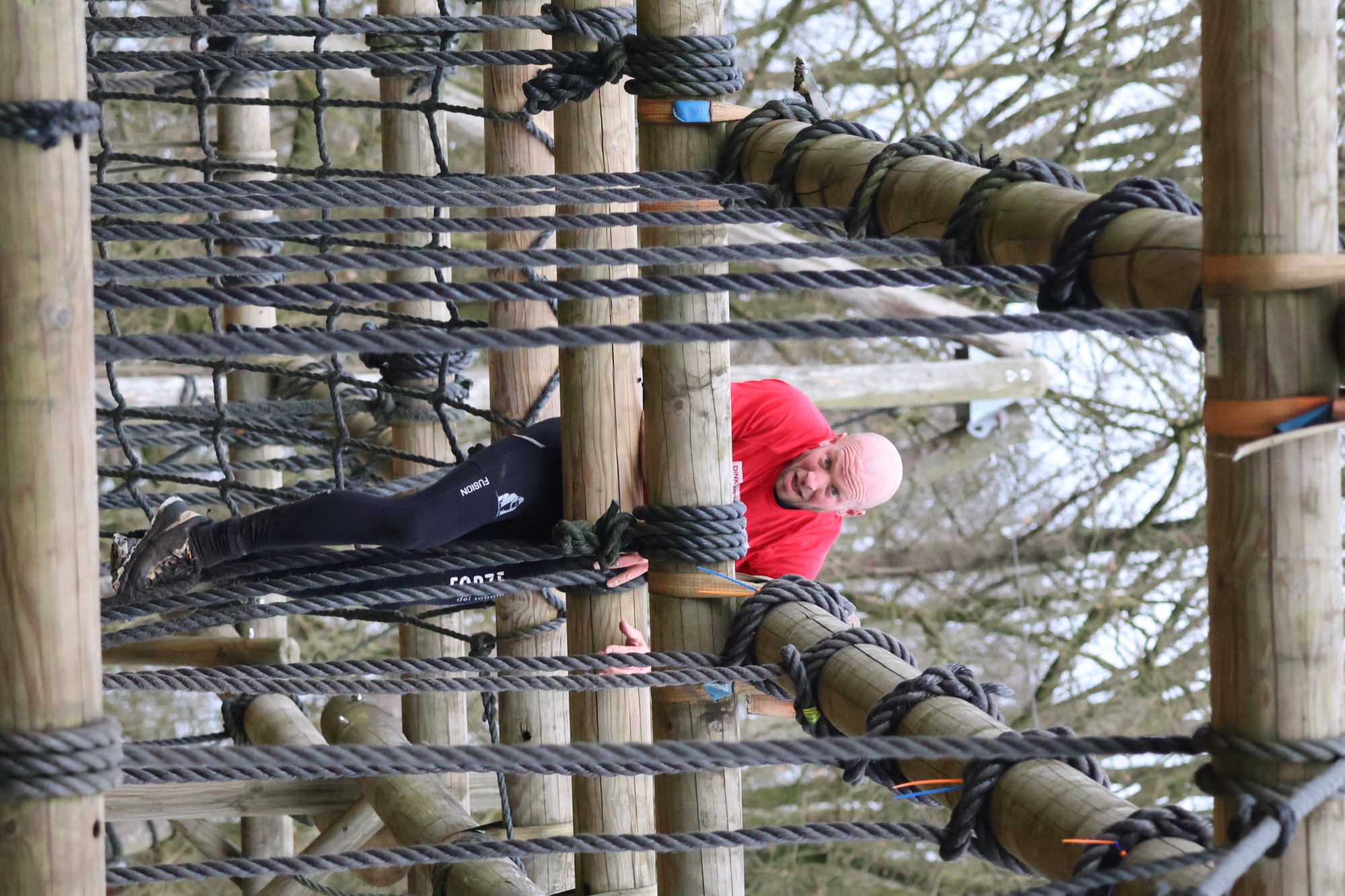 Deelnemers klimmen via het inklimtouw over de balk. Via het slappe touw klimmen ze naar het schuine net. Vervolgens klimmen ze over het schuine net door.