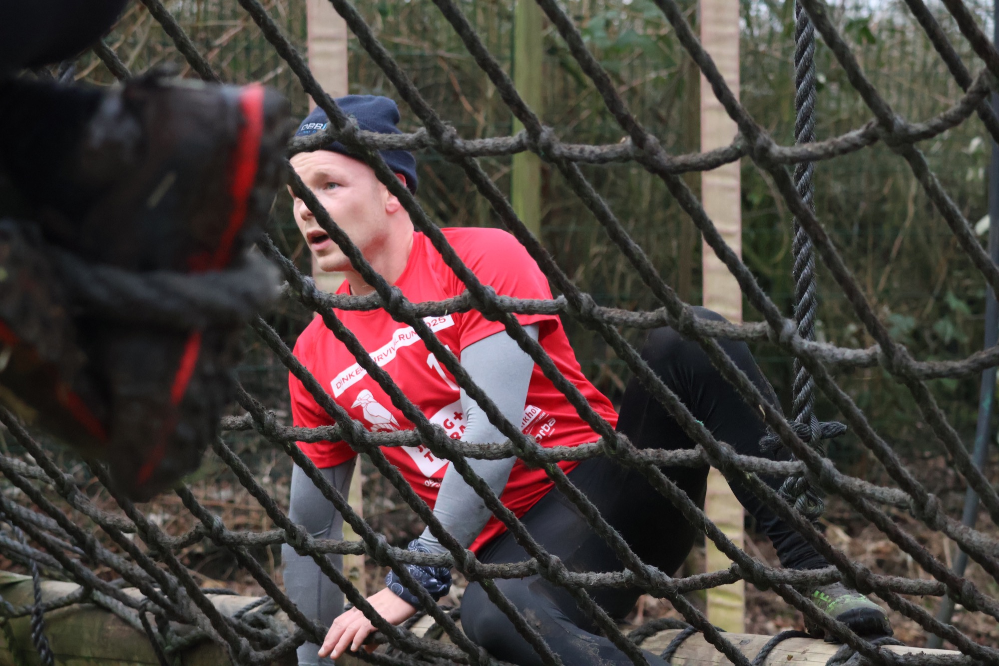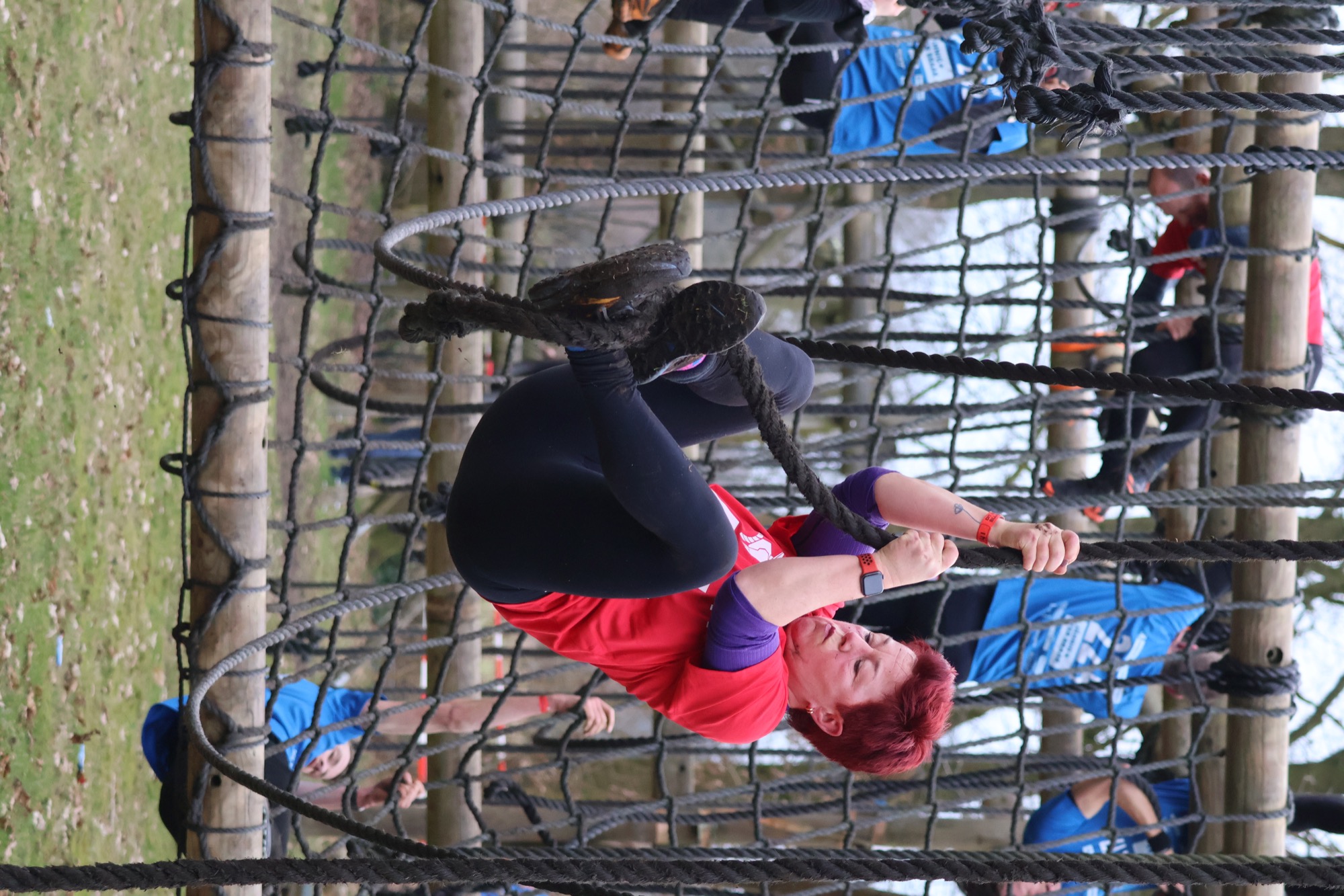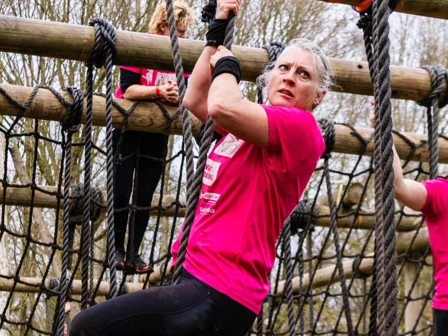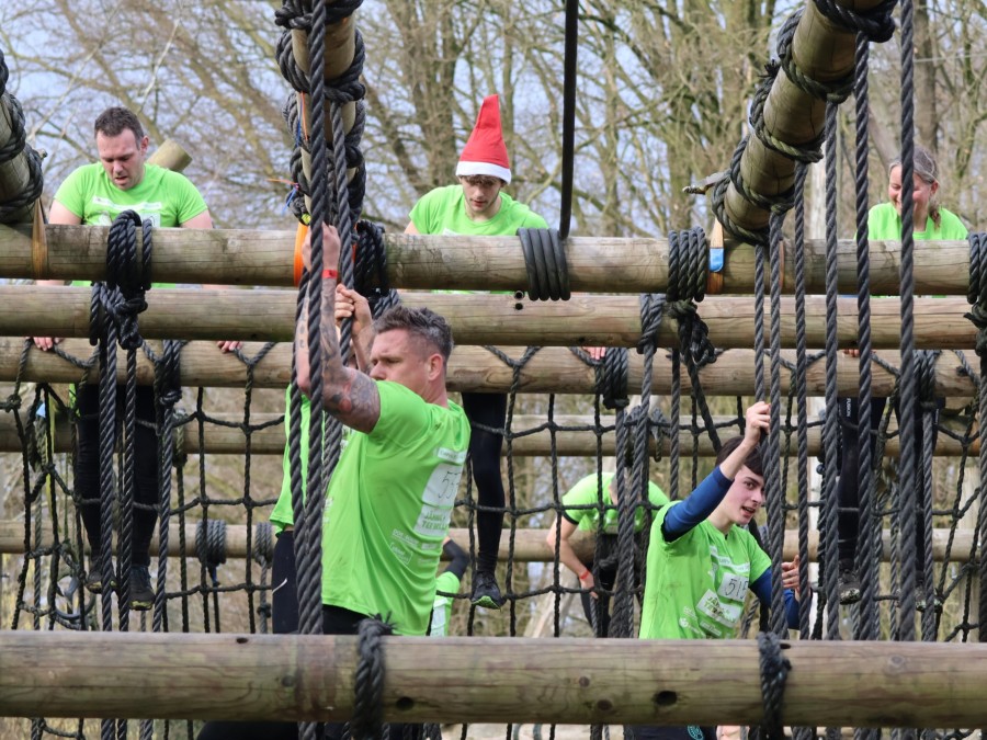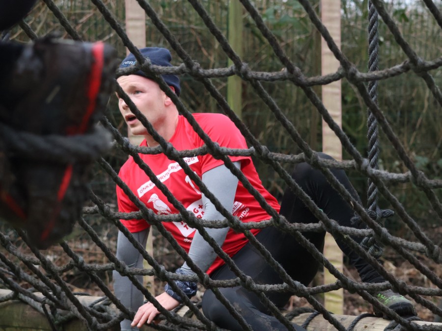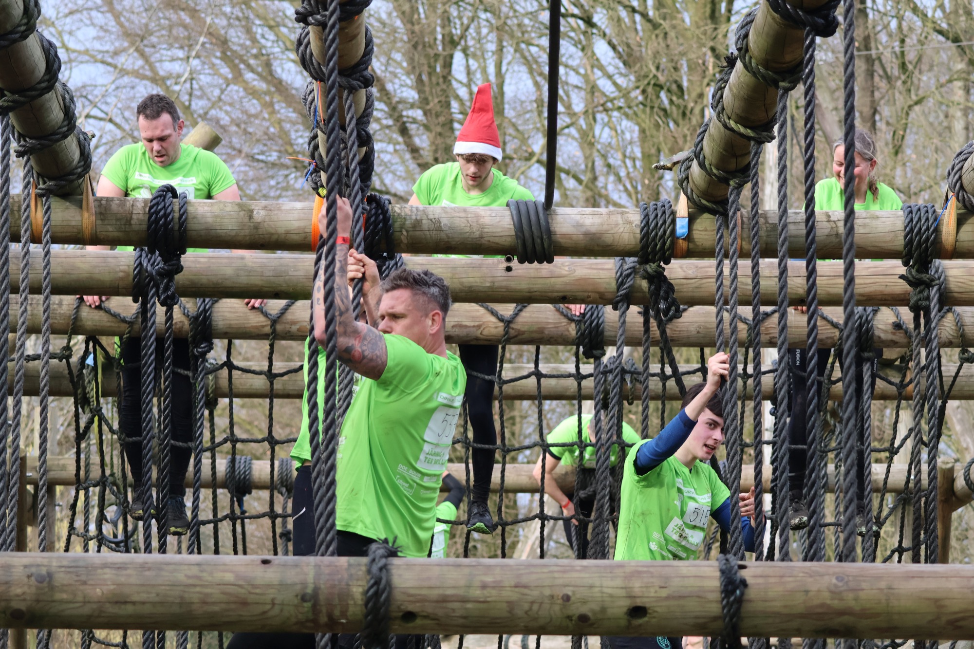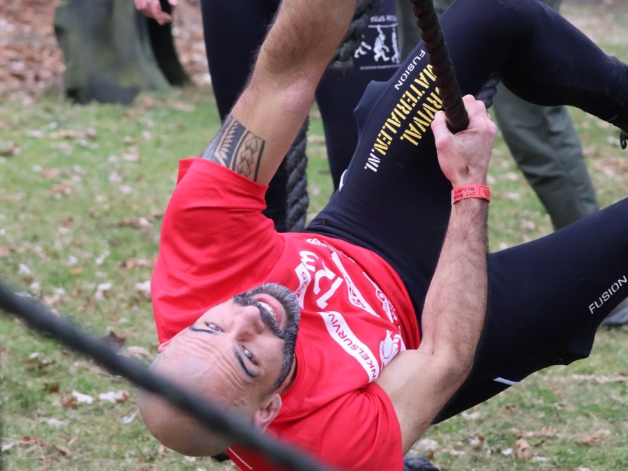 Deelnemers klimmen via het inklimtouw over de balk. Via het slappe touw klimmen ze naar het schuine net. Vervolgens klimmen ze over het schuine net door.