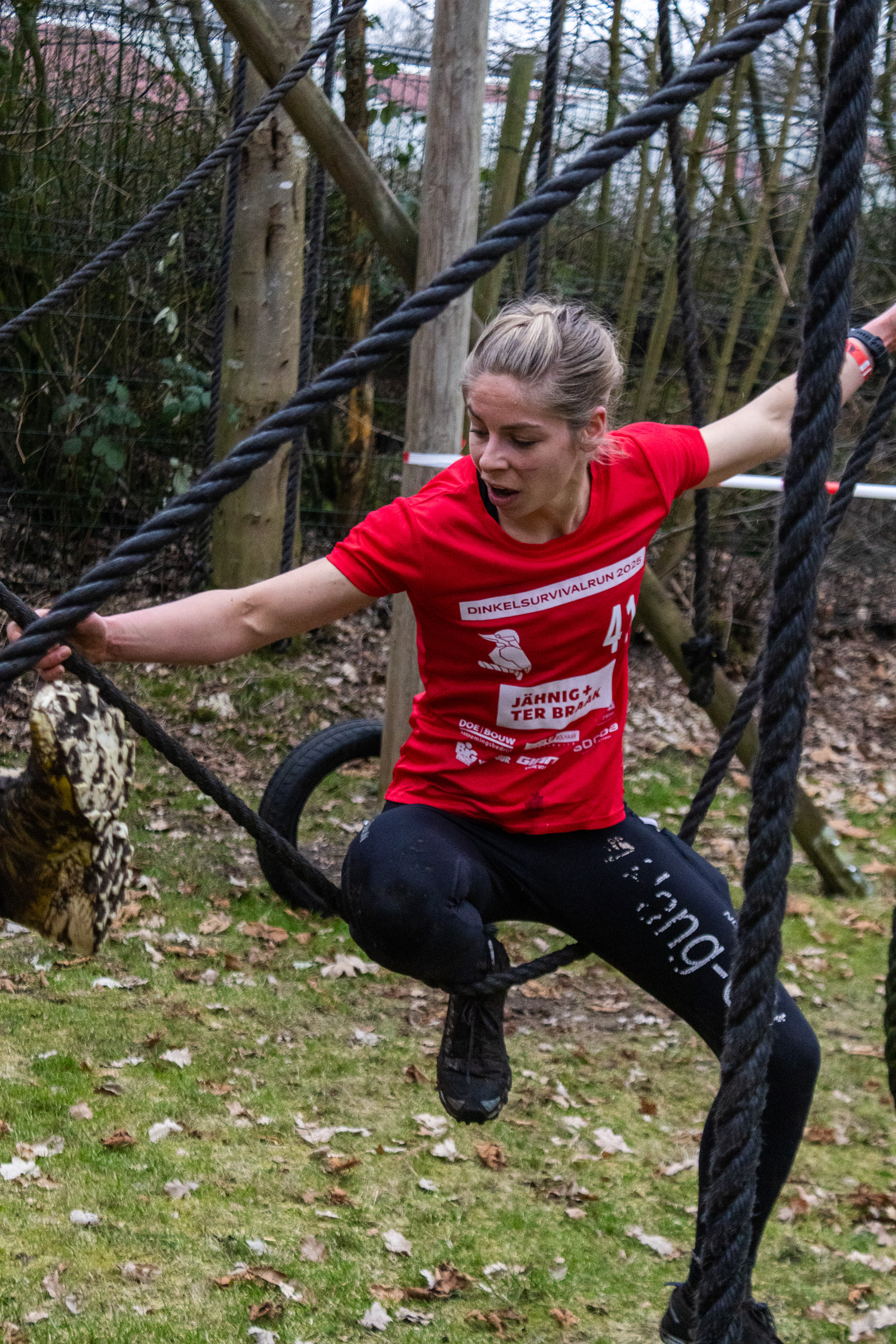 Vervolgens gaan ze met behulp van de staplussen zonder over de balk heen te gaan via de lianen naar het eind van de hindernis. Deelnemers moeten aan het eind niet over de horizontale balk heen klimmen.