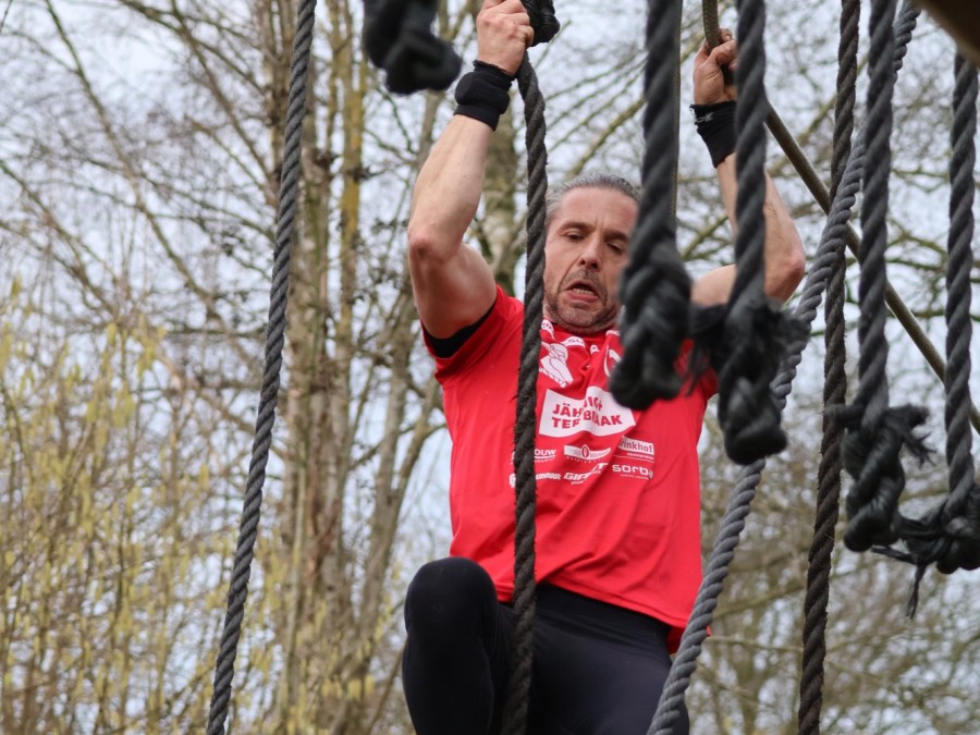 Deelnemers klimmen via het inklimtouw over de balk. Via het slappe touw klimmen ze naar het schuine net. Vervolgens klimmen ze onder het schuine net door.