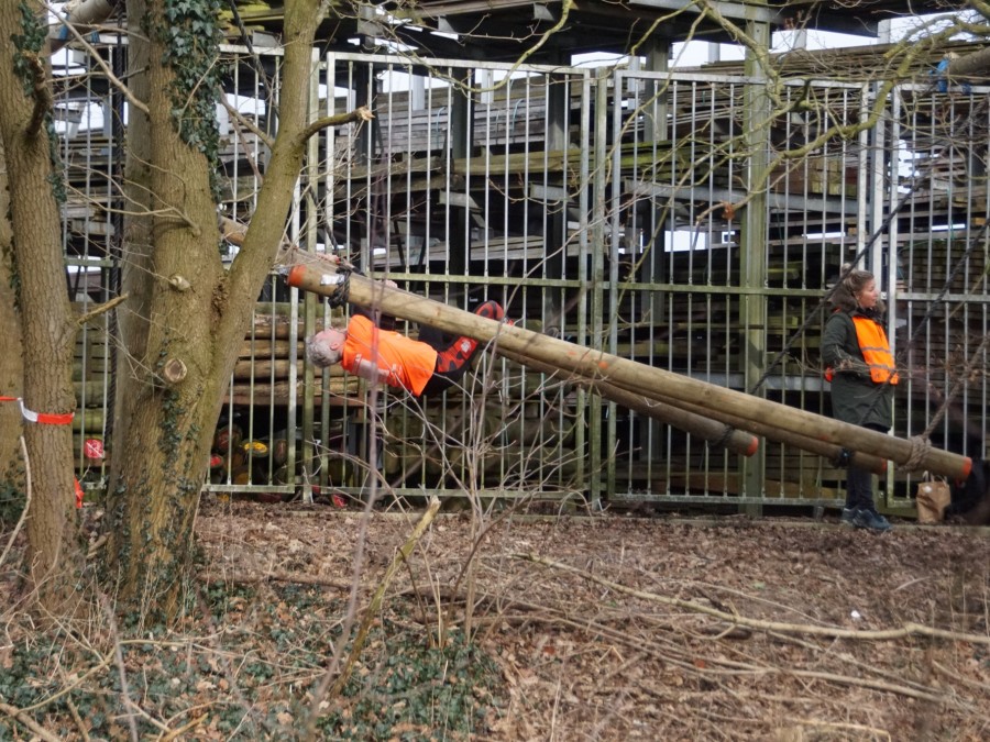 Touwen/balken losknopen en naast het fietspad leggen zodat het met de auto opgehaald kan worden.