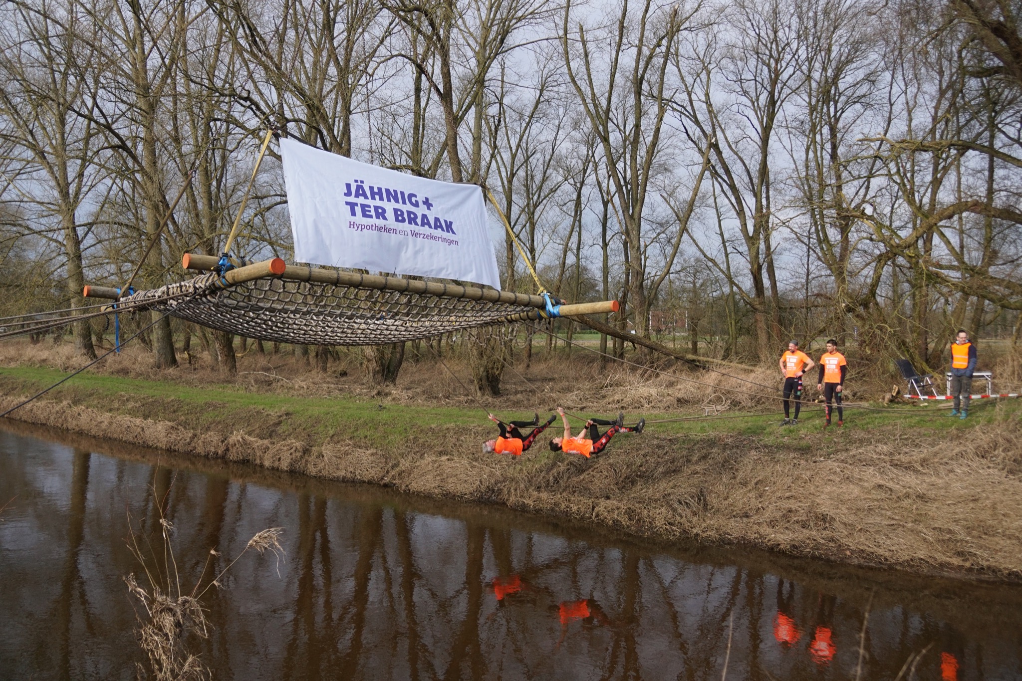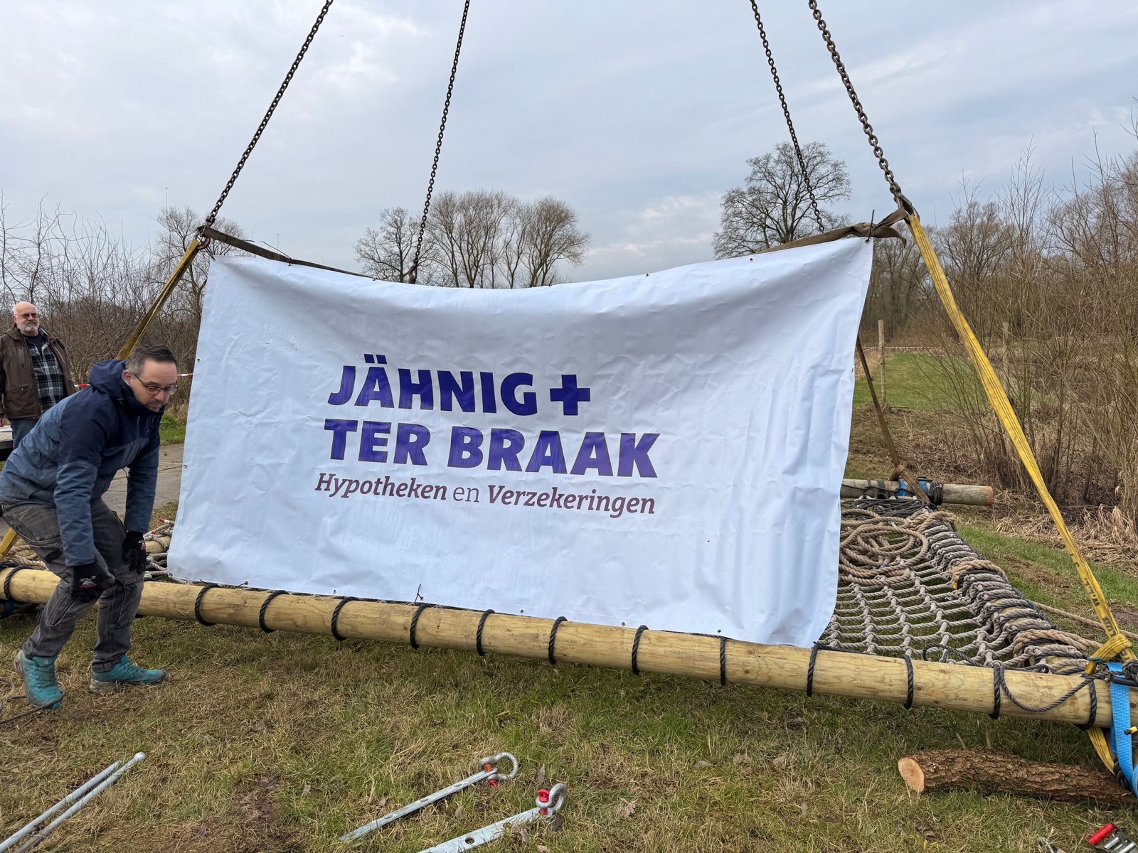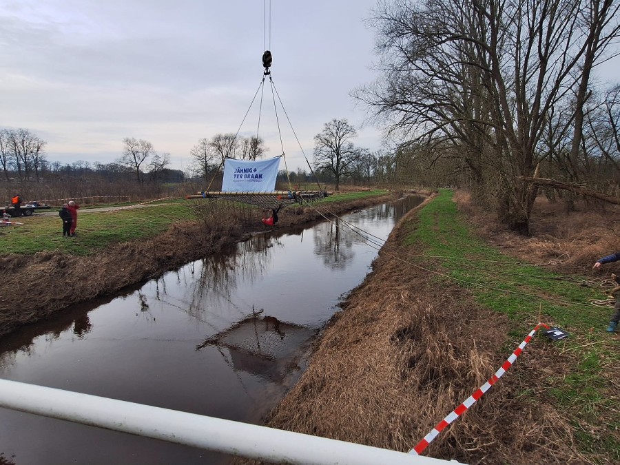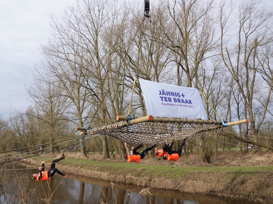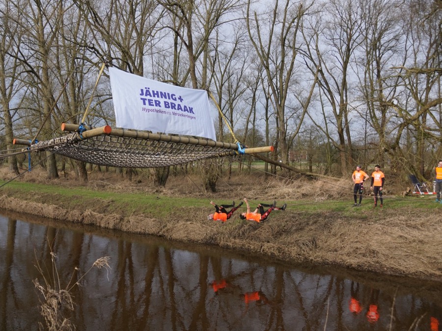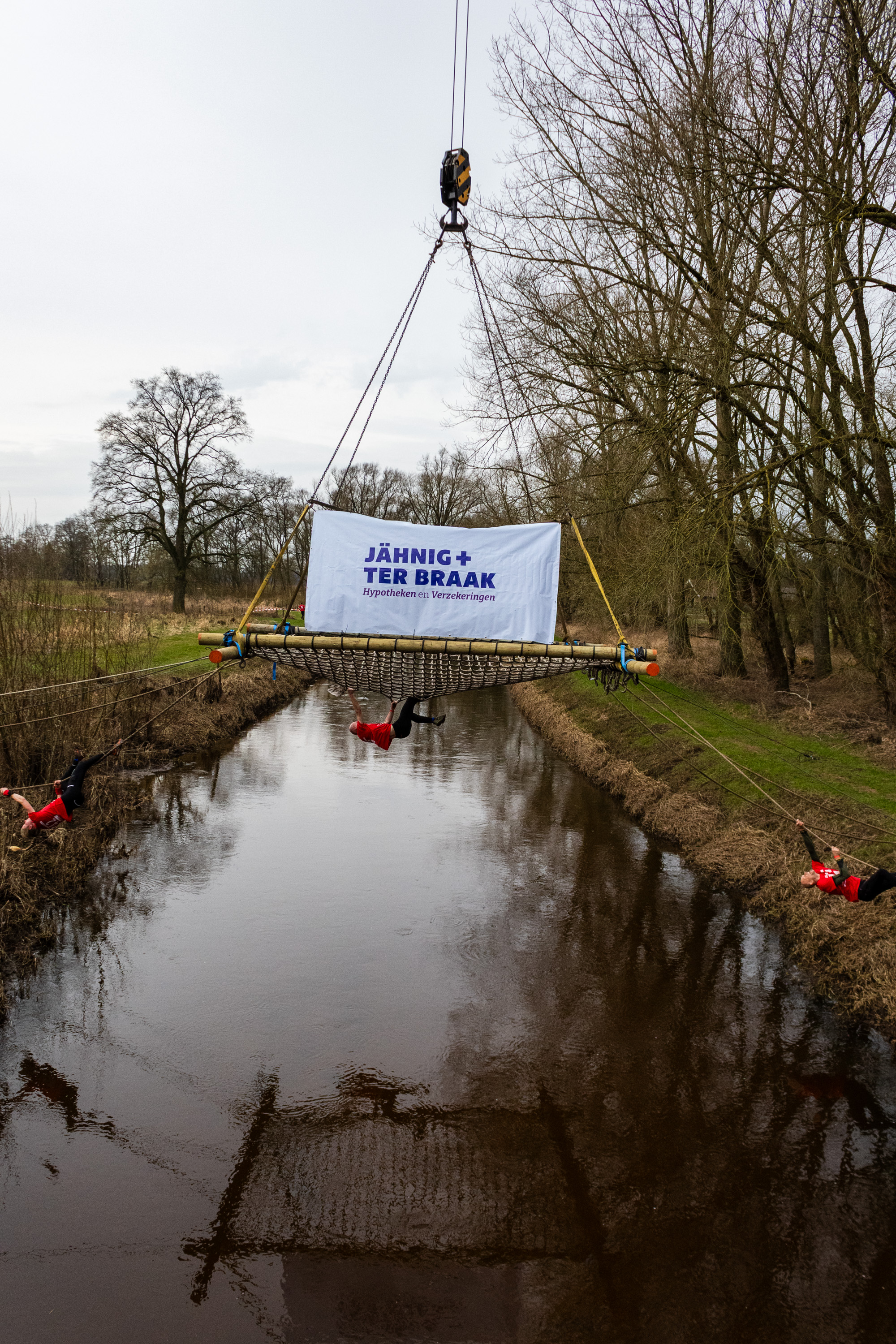 Frame van 5 x 5 mtr, waarin een net gespannen zit, dit frame hangt in de kraan en is te bereiken via 3 x keer apenhang vanaf de oever