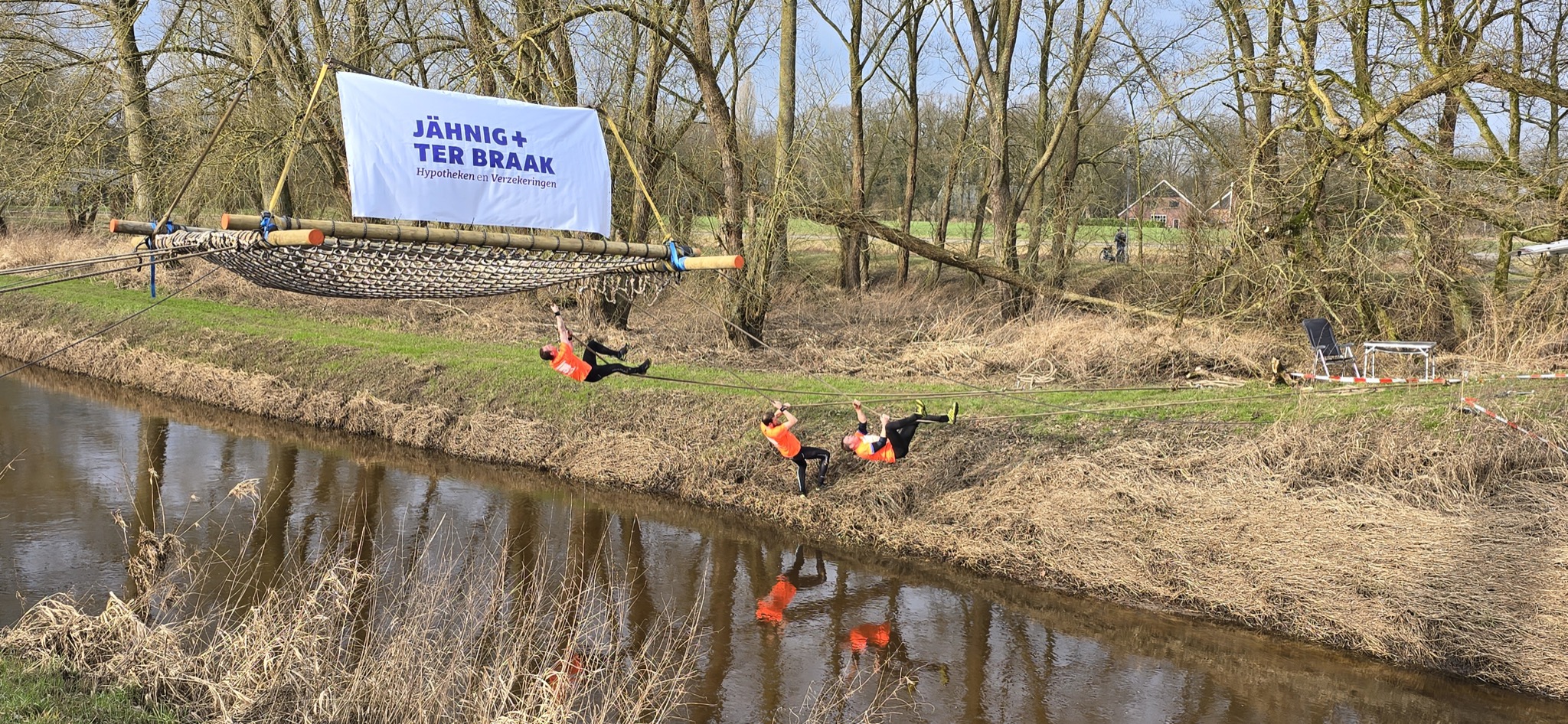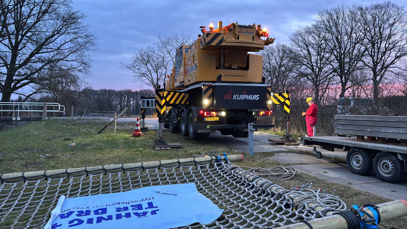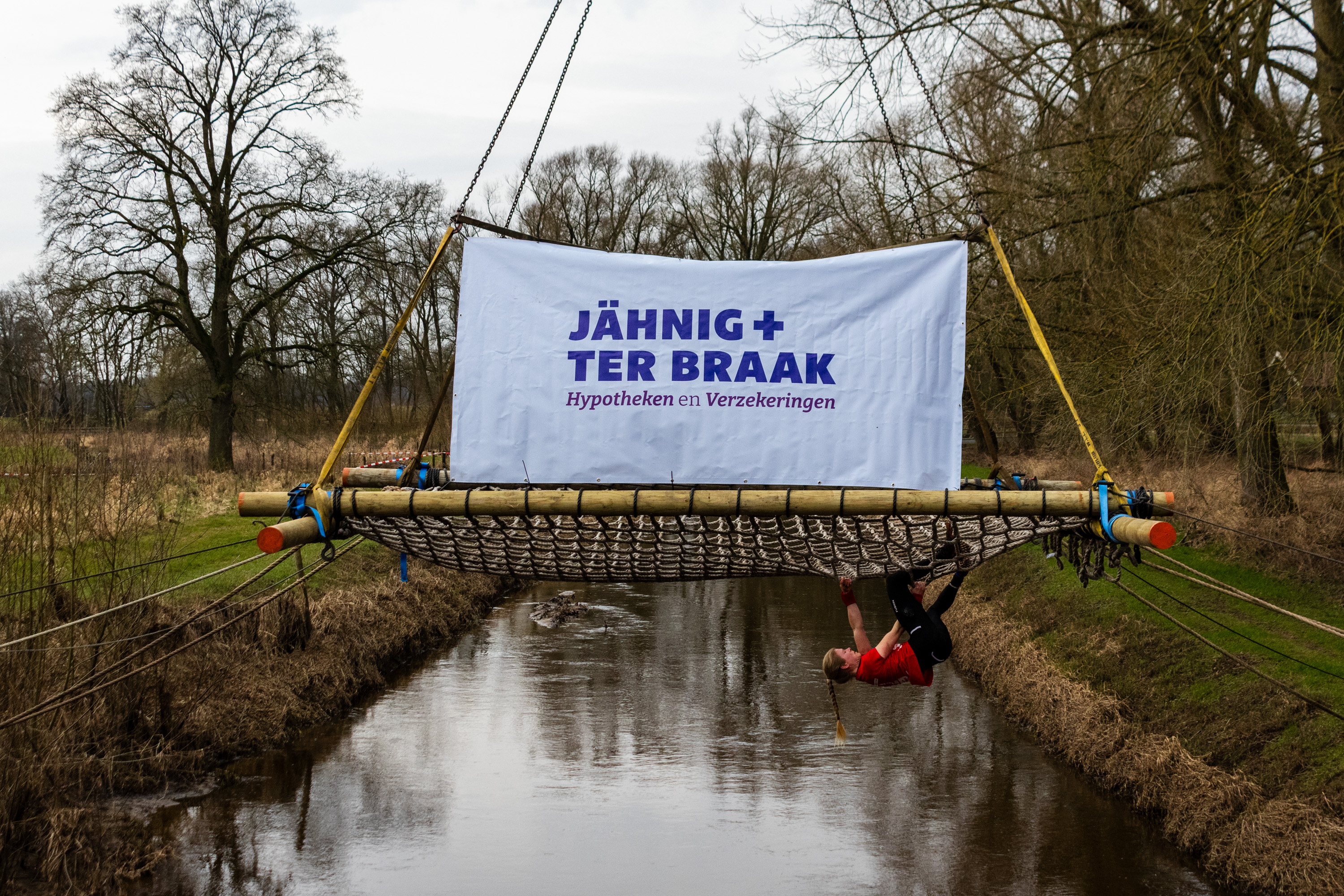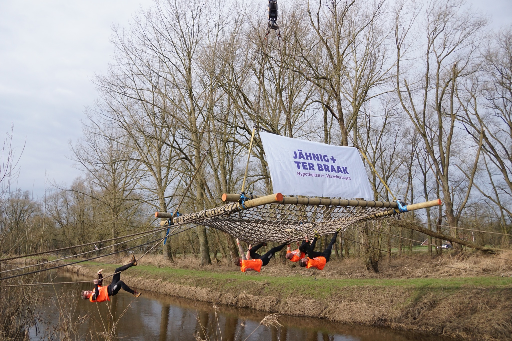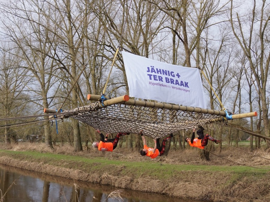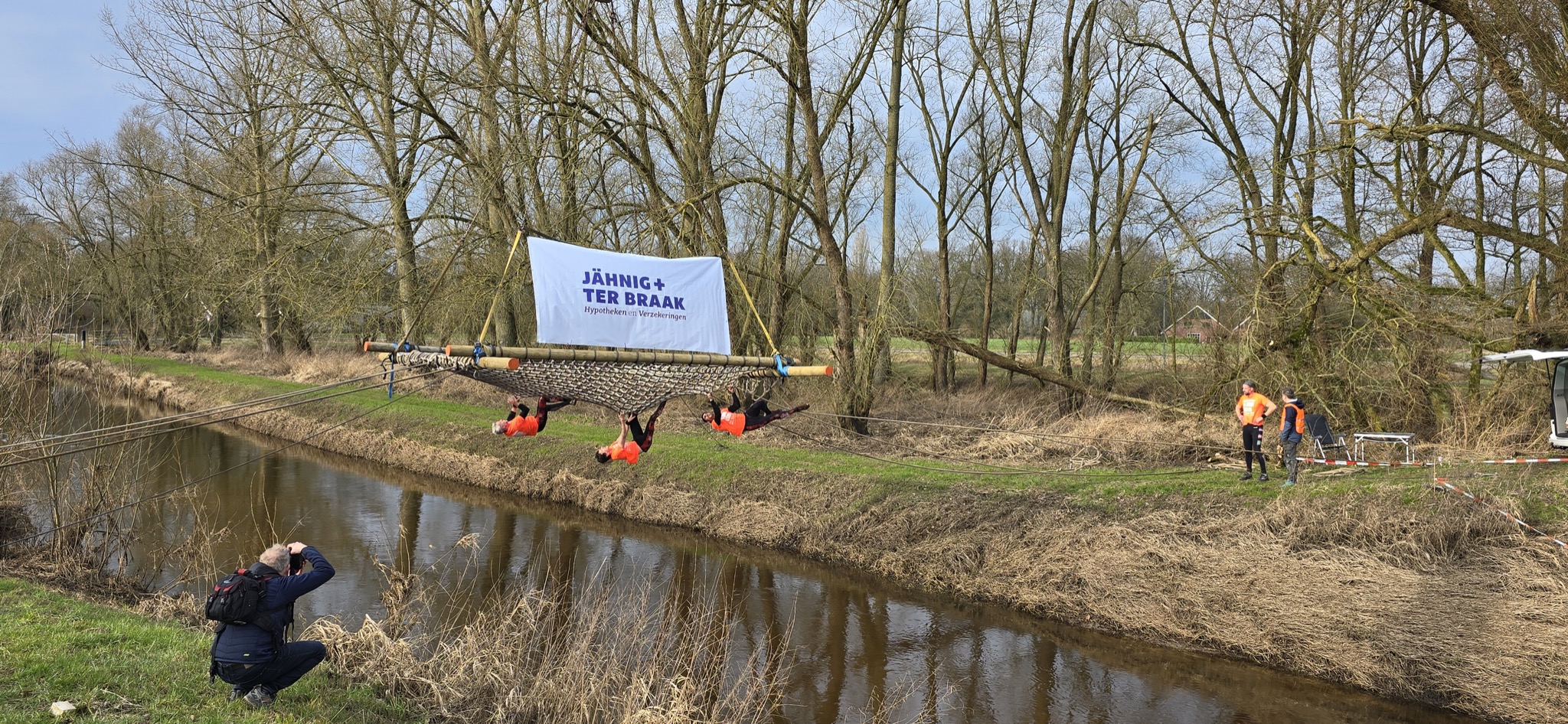 Frame van 5 x 5 mtr, waarin een net gespannen zit, dit frame hangt in de kraan en is te bereiken via 3 x keer apenhang vanaf de oever