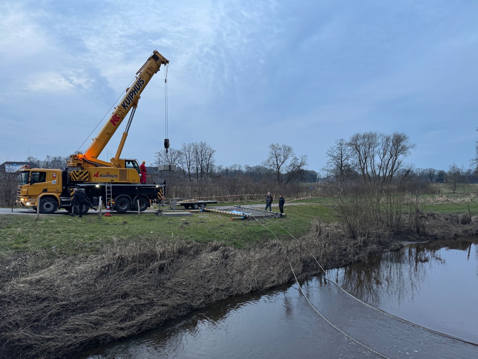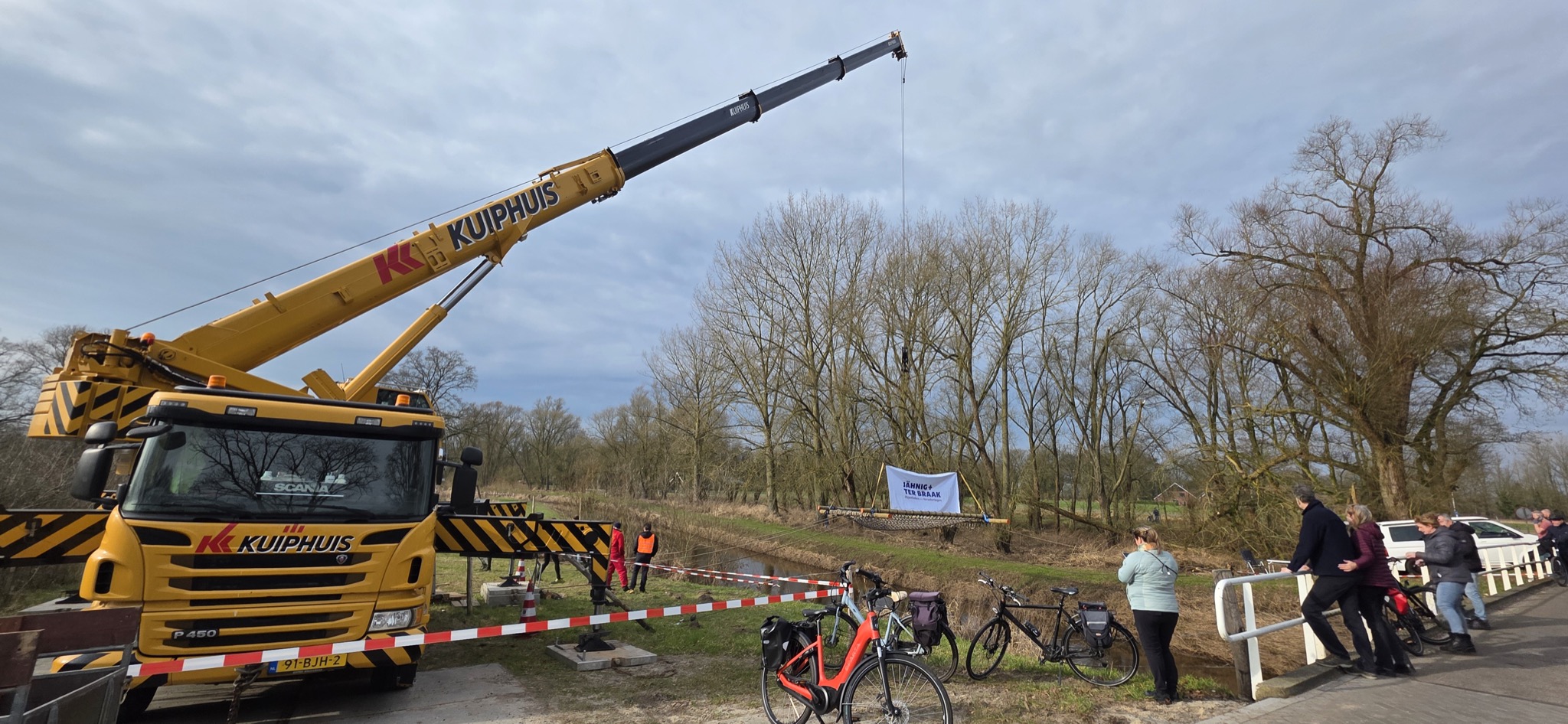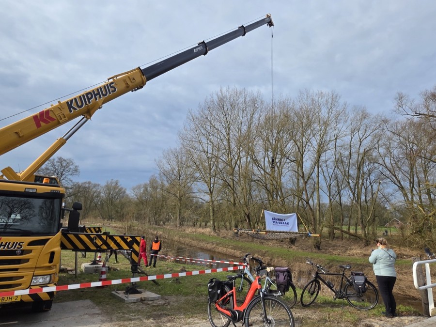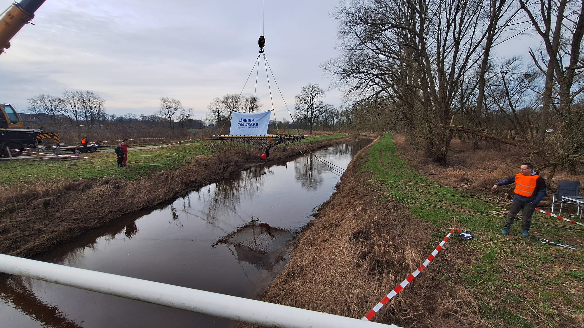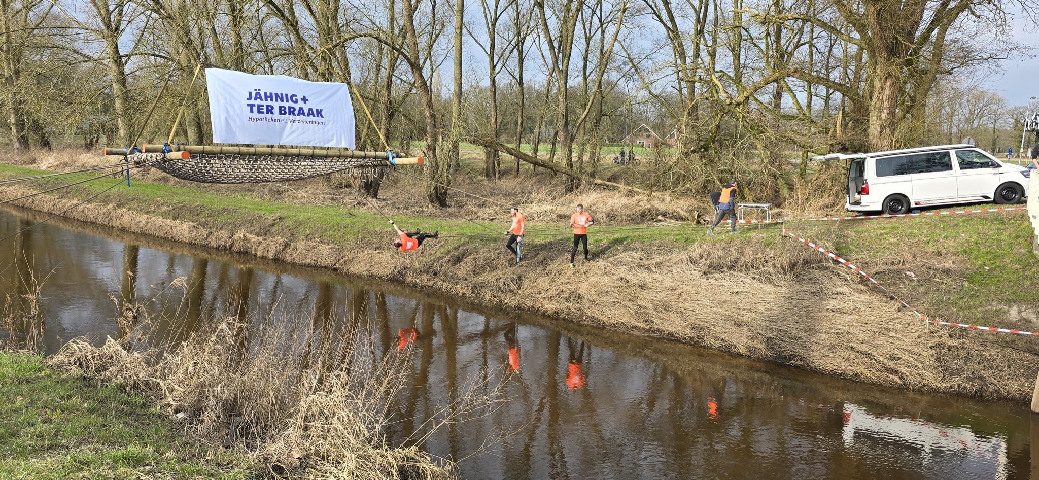 Frame van 5 x 5 mtr, waarin een net gespannen zit, dit frame hangt in de kraan en is te bereiken via 3 x keer apenhang vanaf de oever