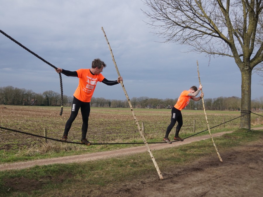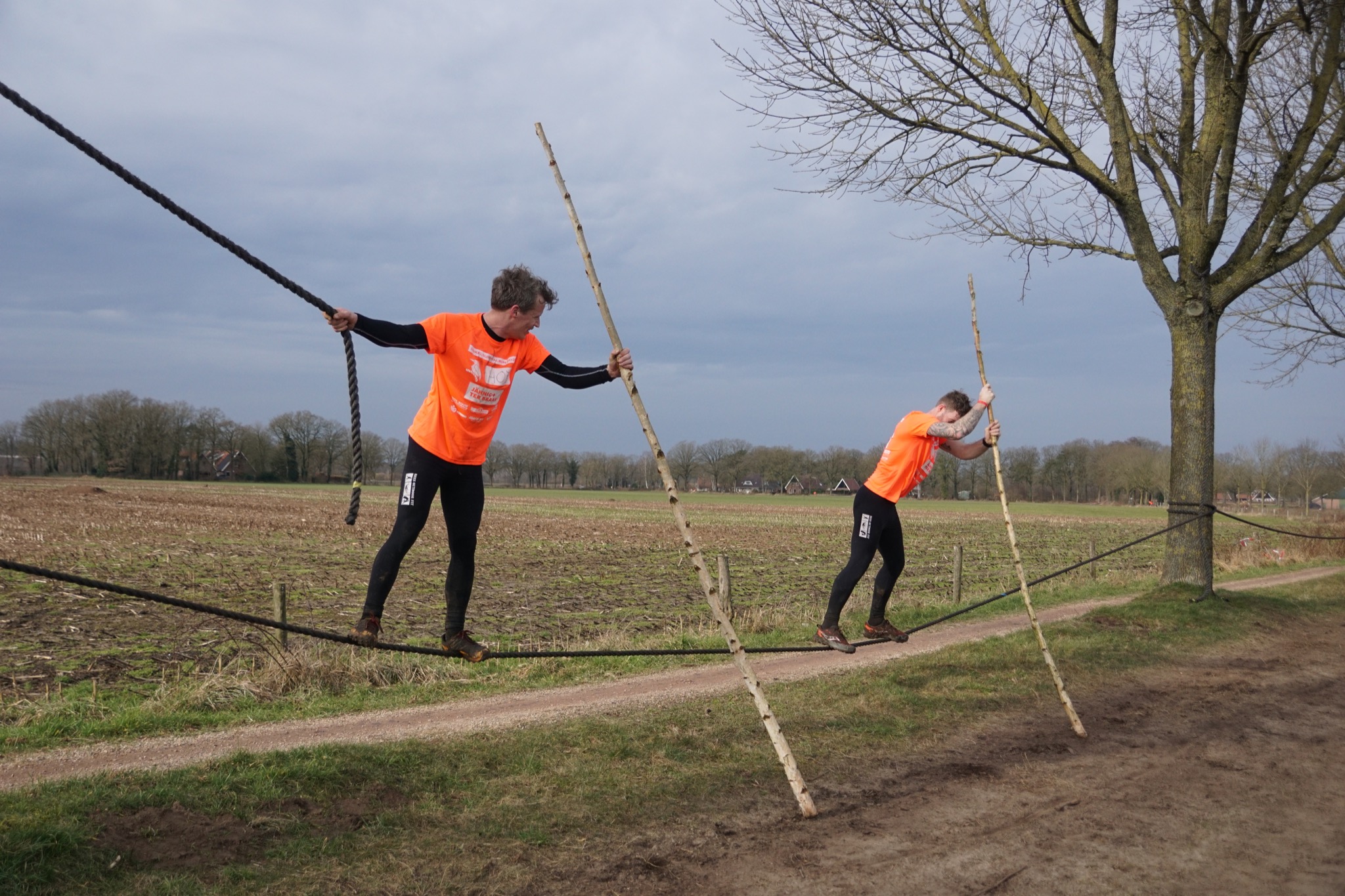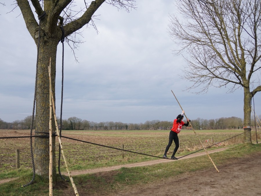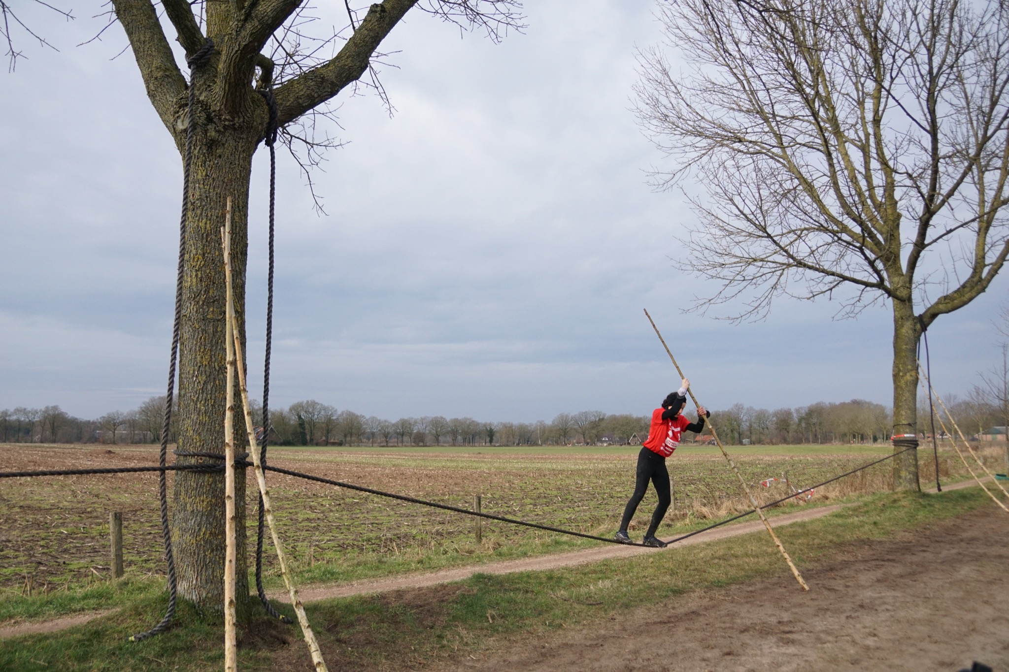Tussen 3 bomen een horizontaal touw, balans door lange stok mee te nemen