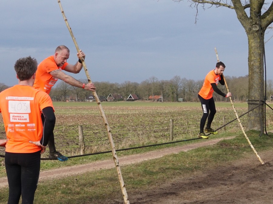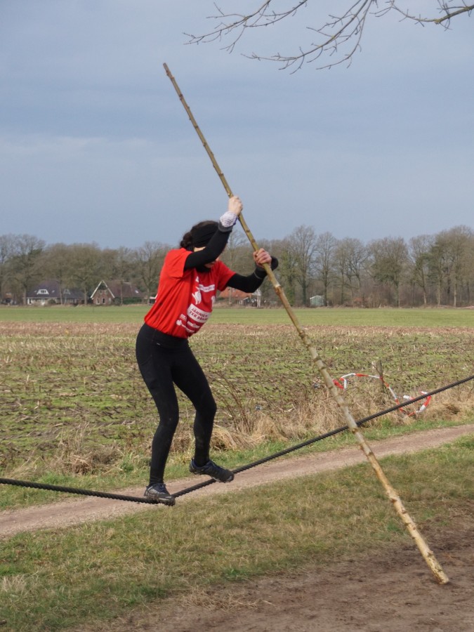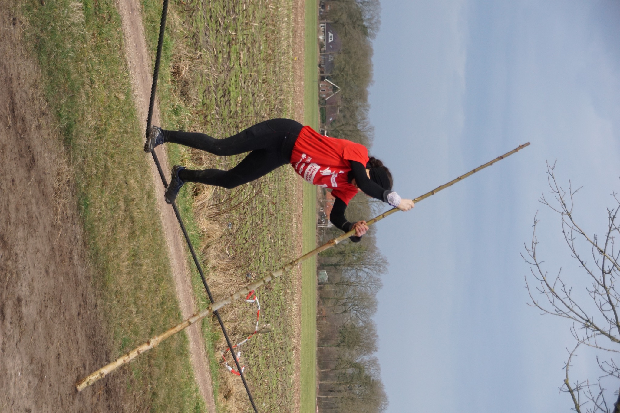 Deelnemers moeten via het strak gespannen horizontale touw van rechts naar links lopen. Hierbij mogen ze gebruikmaken van een stok om evenwicht te houden.