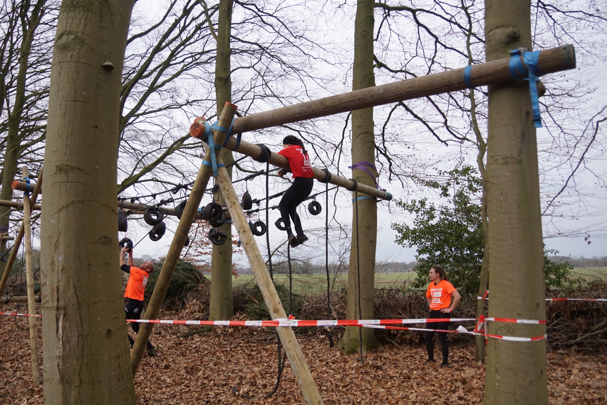 Deelnemers klimmen via het inklimtouw over de balk. Via het strak getrokken touw klimmen ze door tot het verticale touw en klimmen vervolgens onder balk door weer naar boven in het strakke touw. Vervolgens moeten ze de door de lianen klimmen zonder het boventouw te gebruiken.
