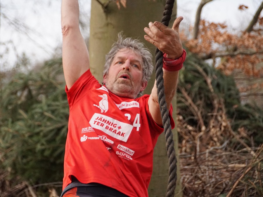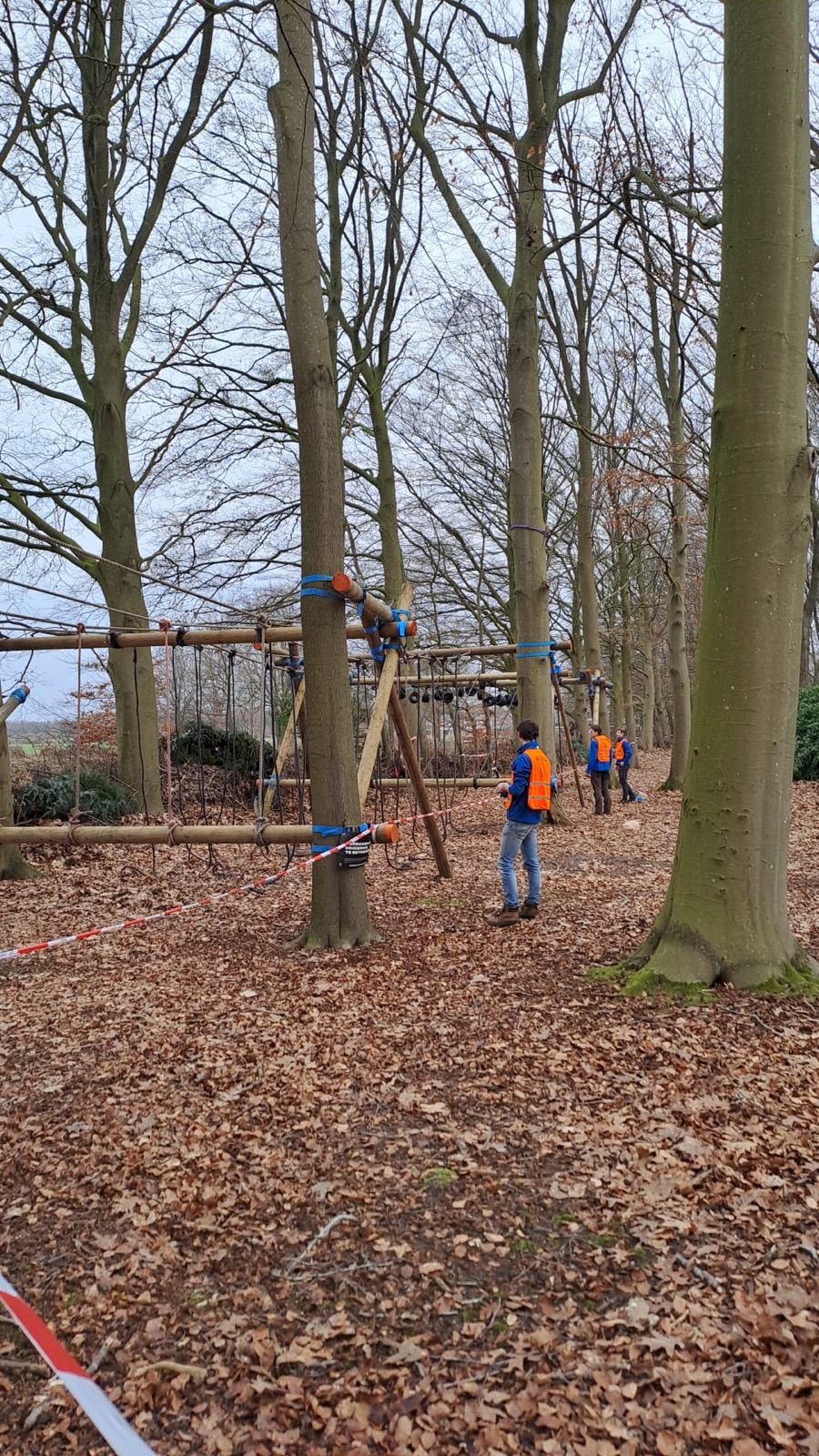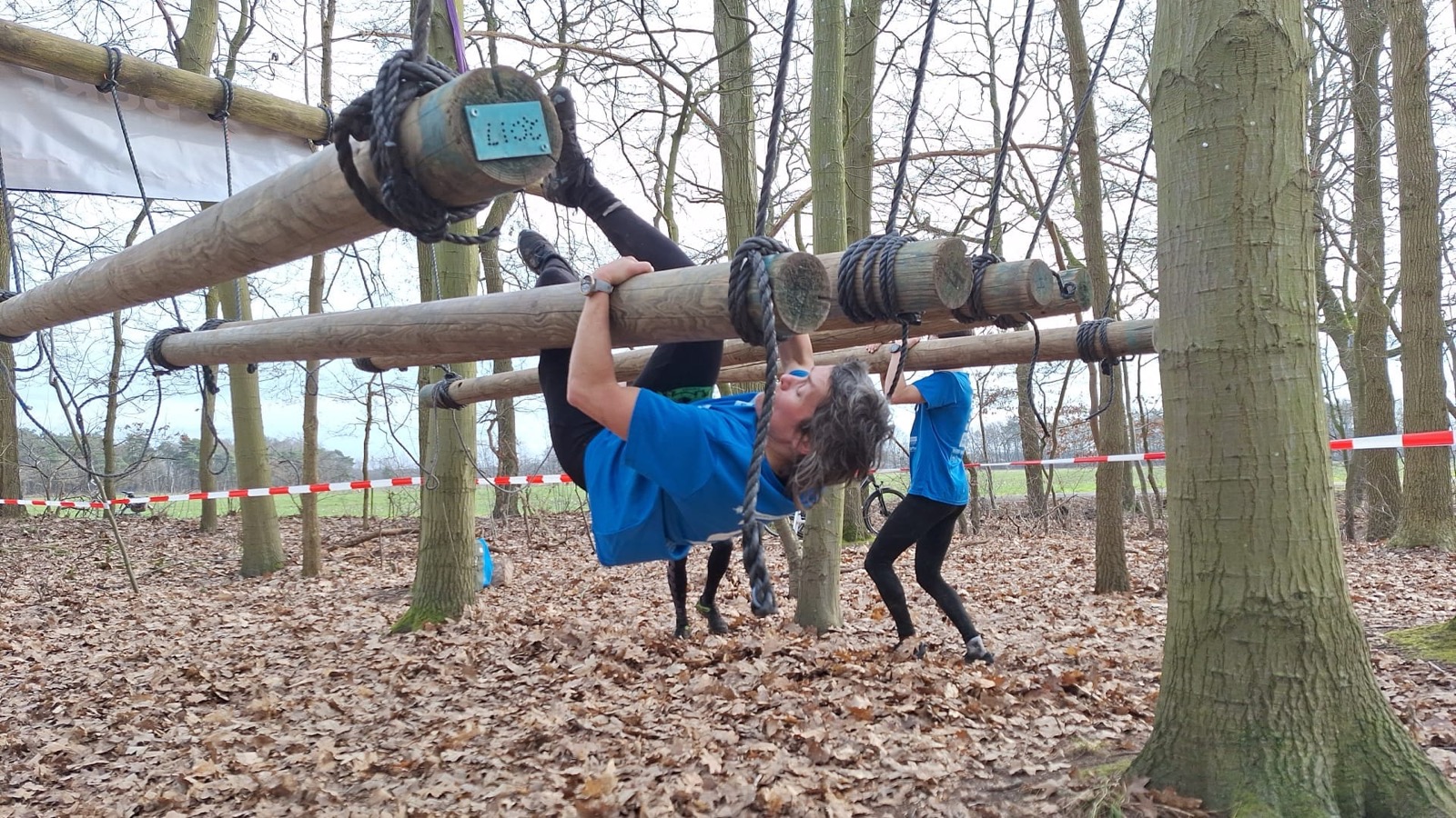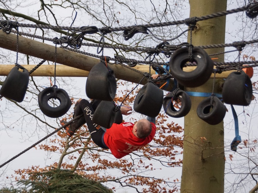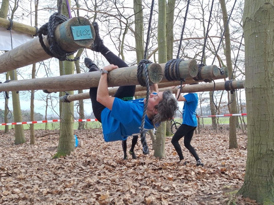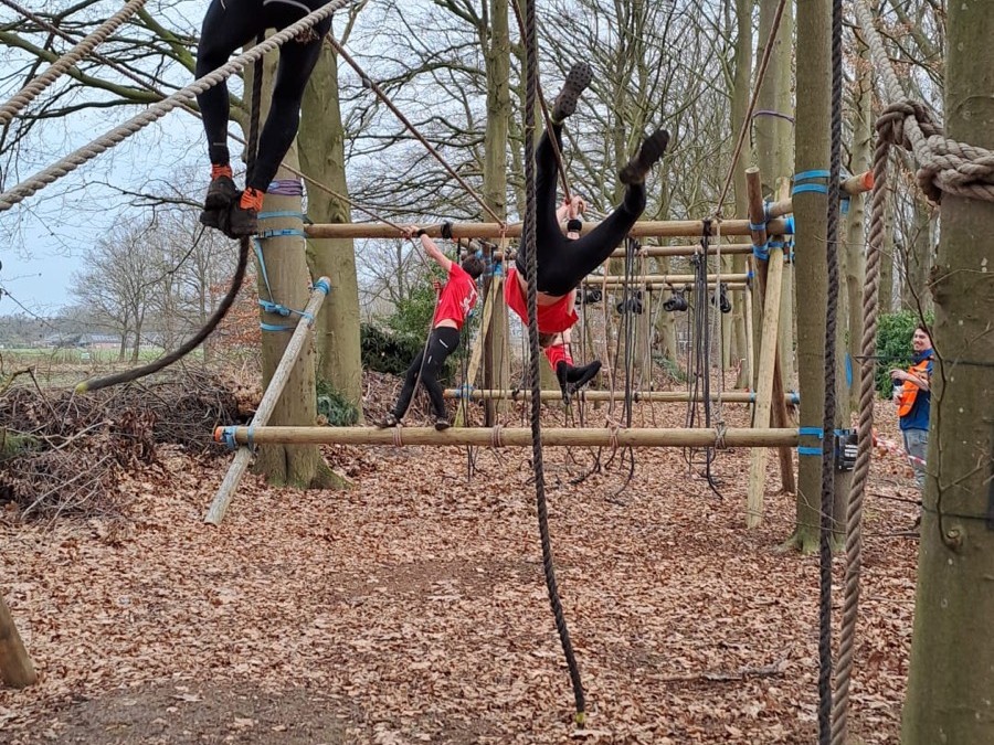 Vervolgens klimmen ze onder de balk door en klimmen ze via het schuine touw omhoog. Zonder over de balk te gaan moeten ze via de kartbandjes naar het uitklimtouw. Deze moeten ze met een hand aanraken.