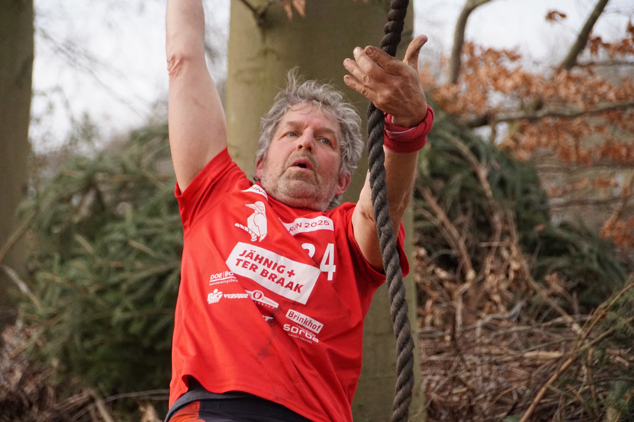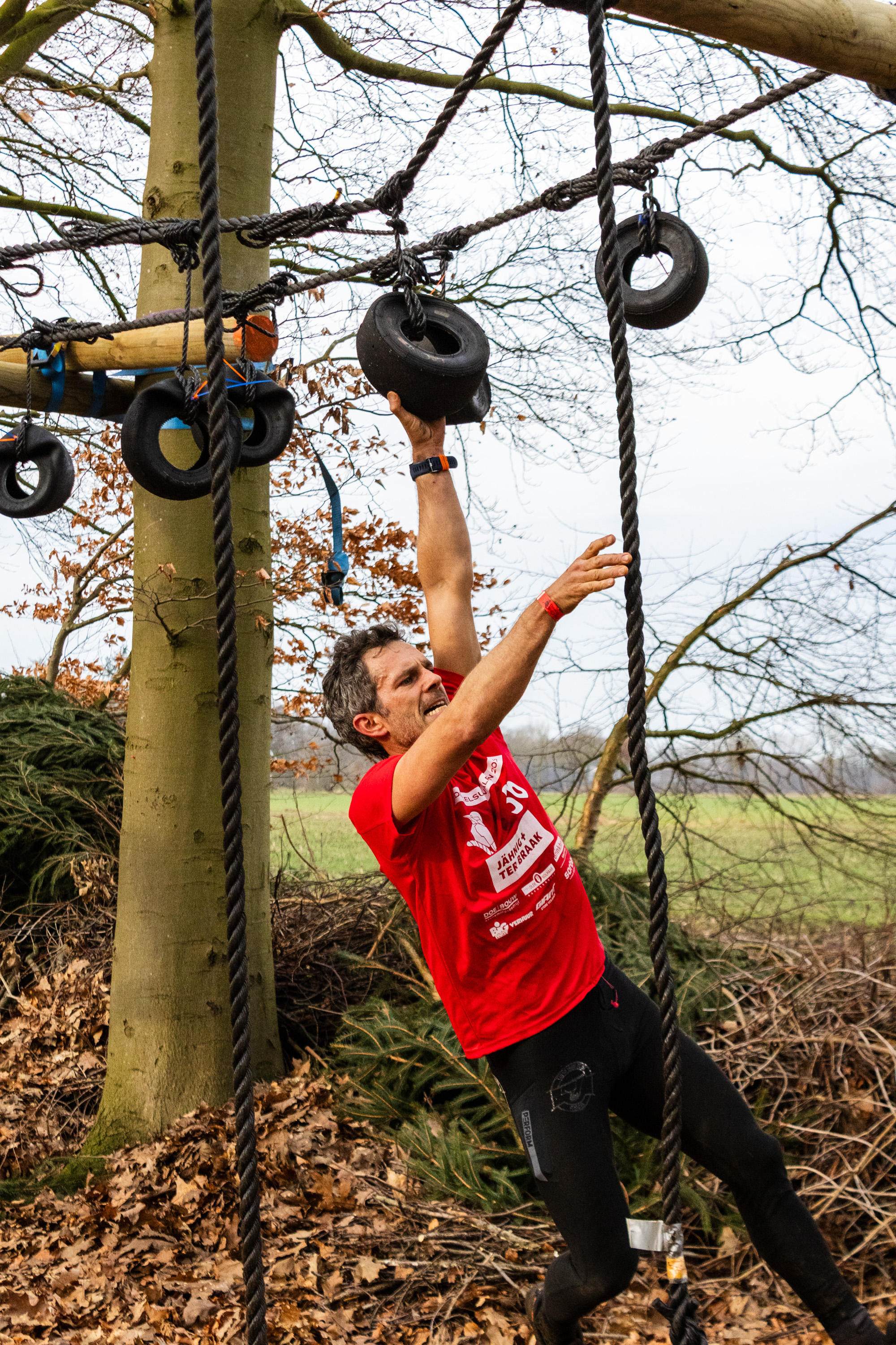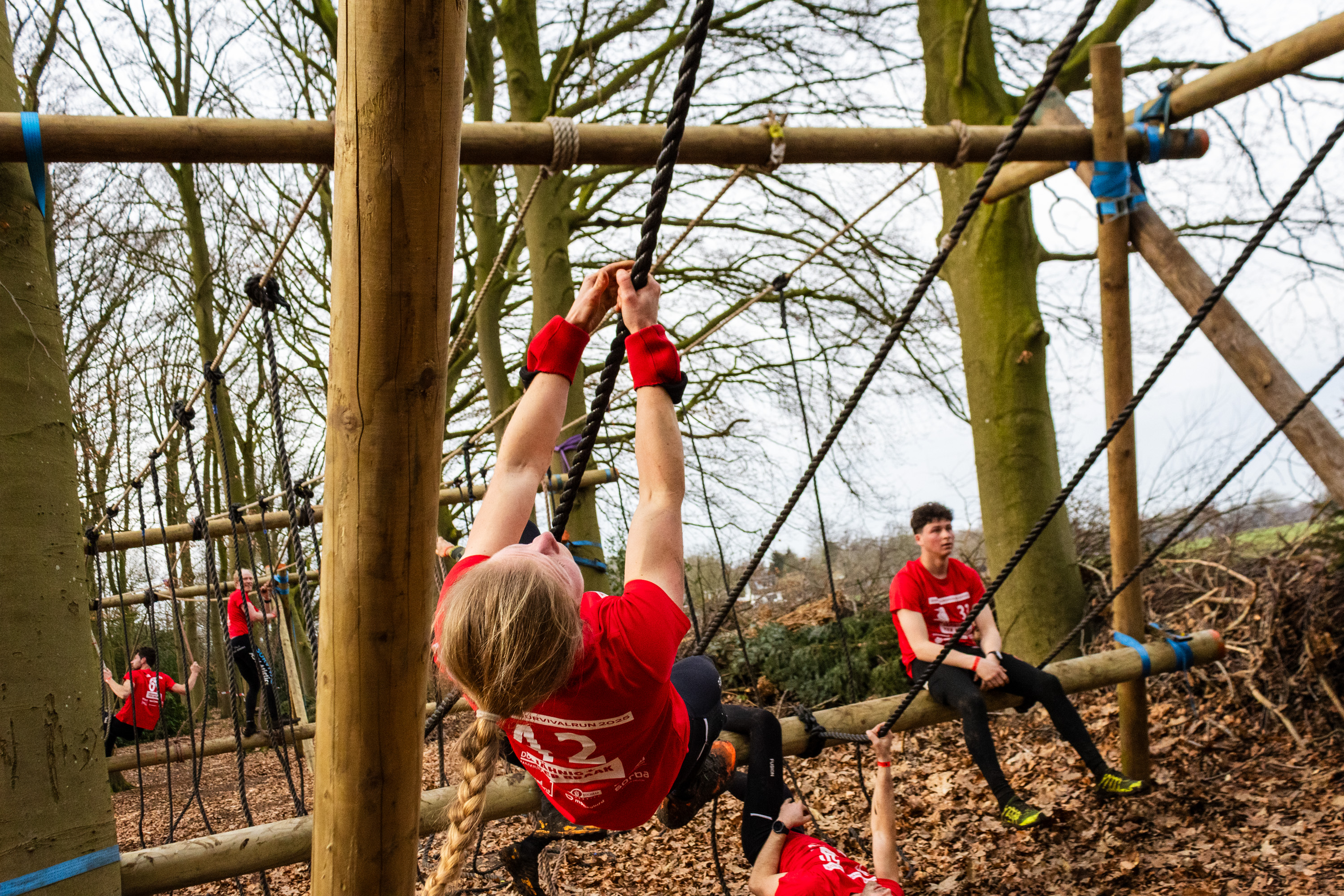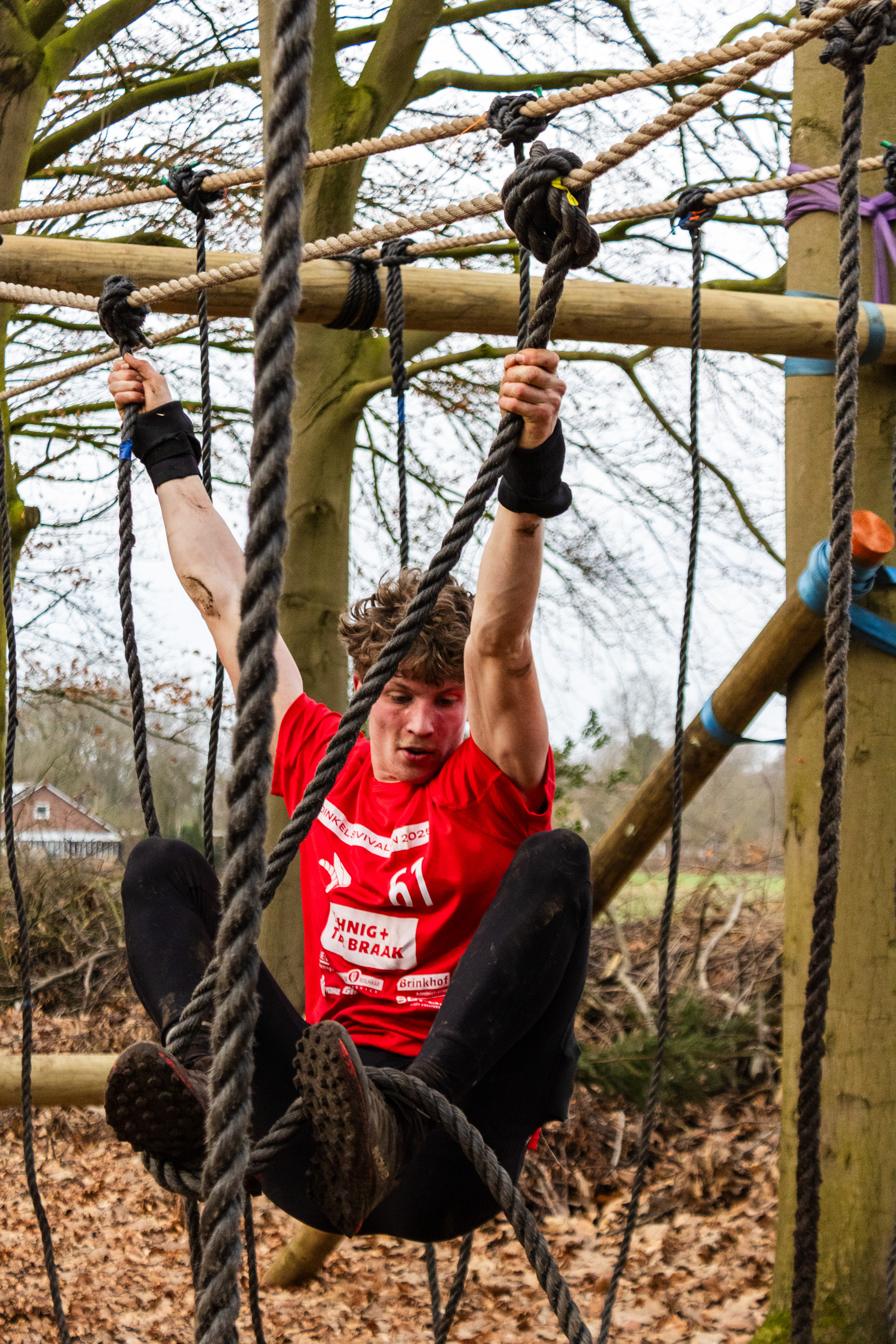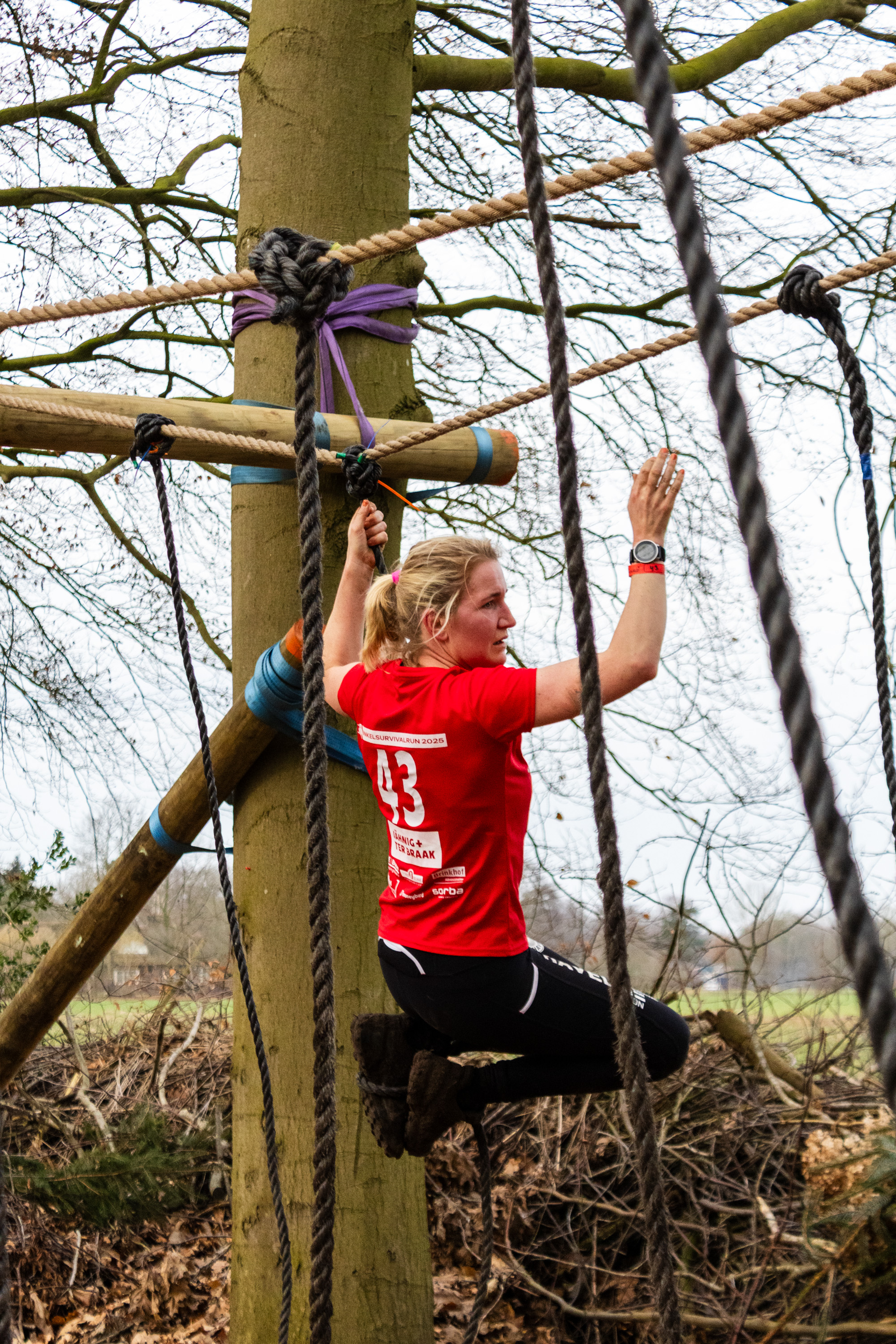 Vervolgens klimmen ze onder de balk door en klimmen ze via het schuine touw omhoog. Zonder over de balk te gaan moeten ze via de kartbandjes naar het uitklimtouw. Deze moeten ze met een hand aanraken.