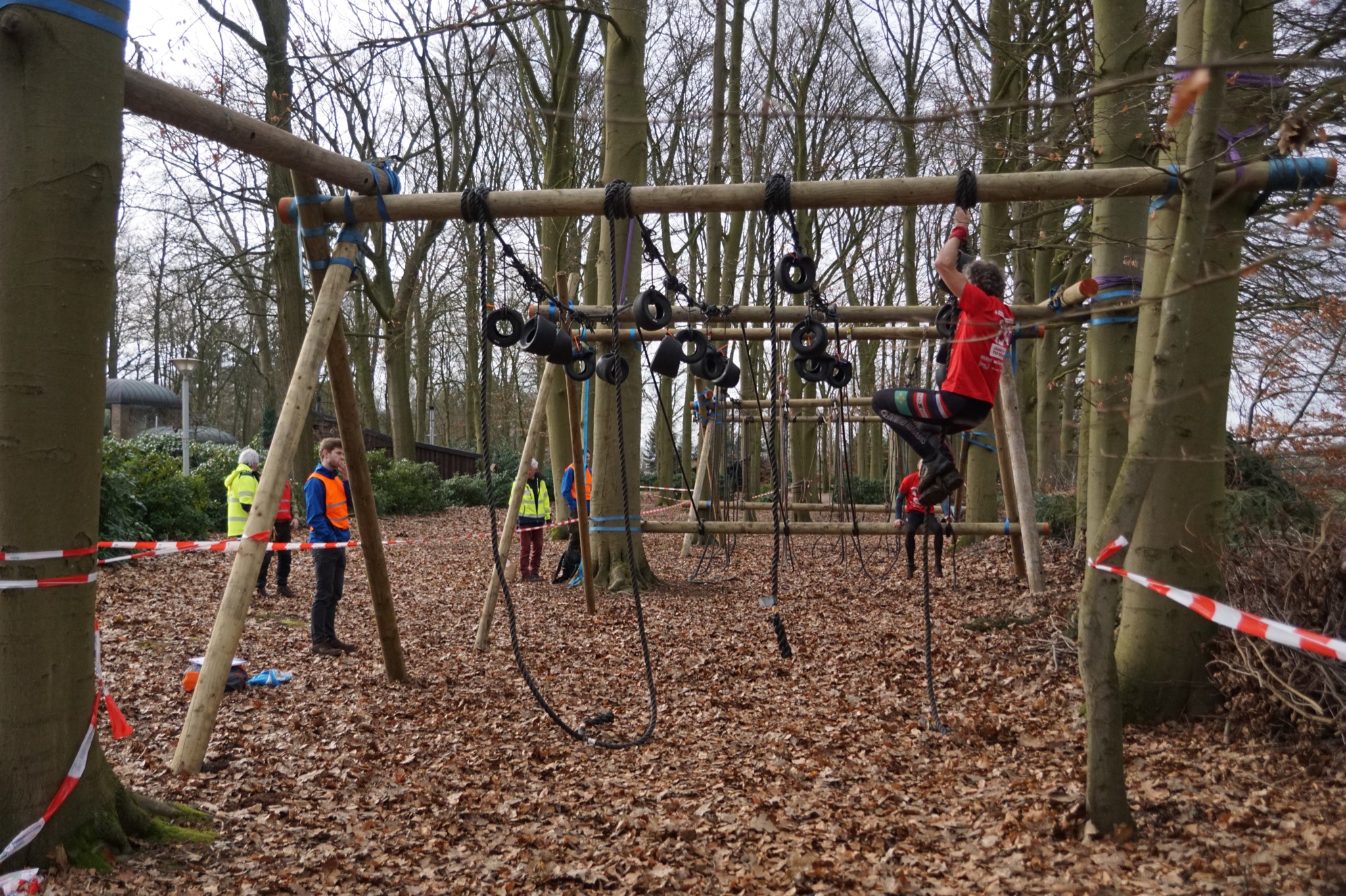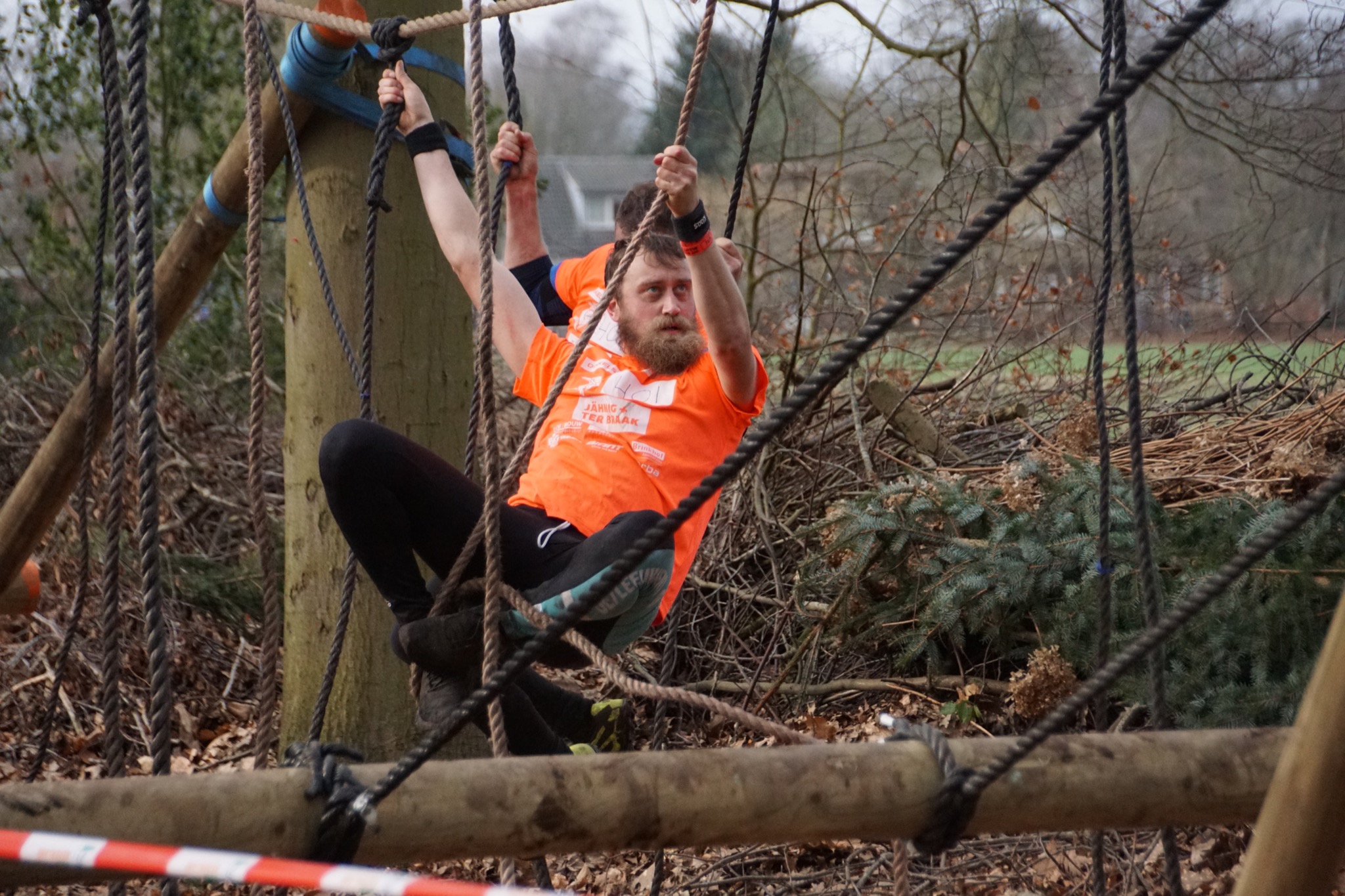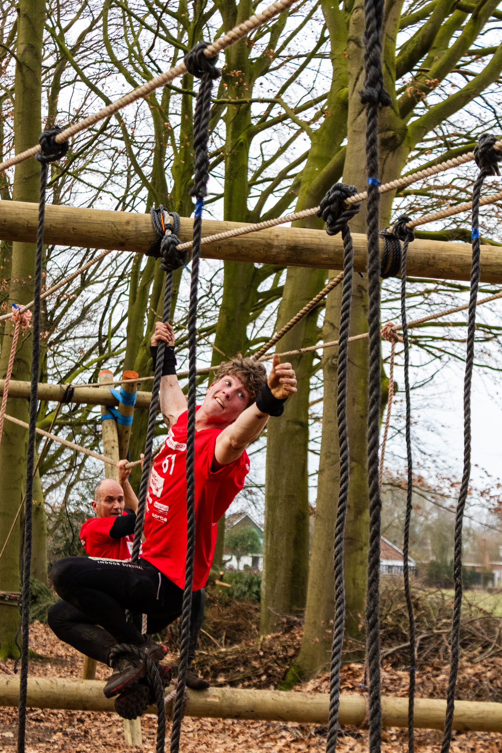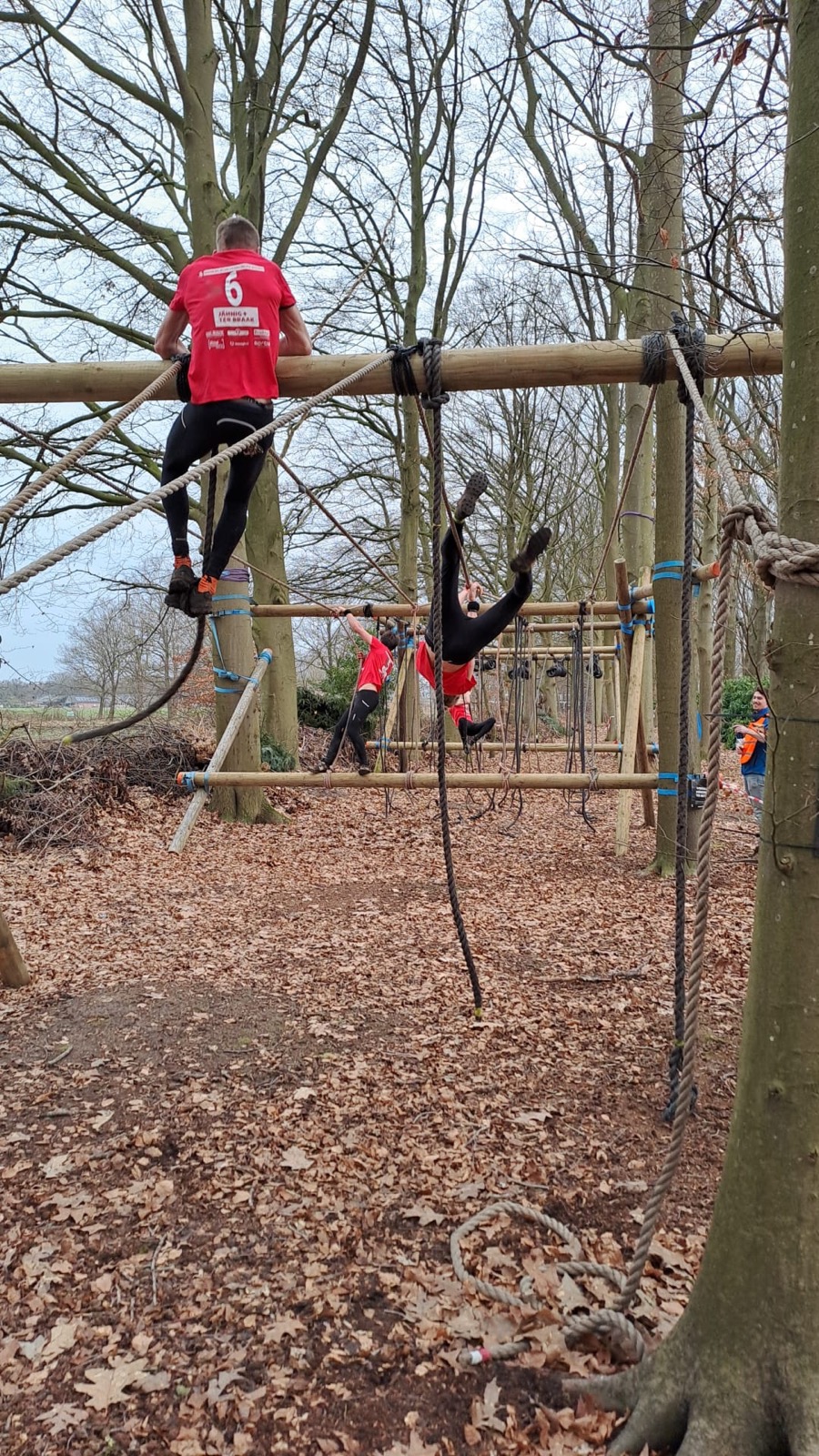 Deelnemers klimmen via het inklimtouw in het strak getrokken touw en klimmen ze door tot het verticale touw en klimmen vervolgens onder balk door weer naar boven in het strakke touw. Vervolgens moeten ze door de lianen klimmen zonder het boventouw te gebruiken.