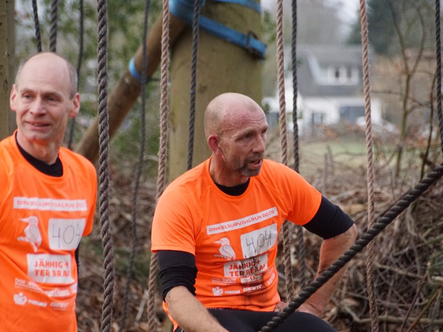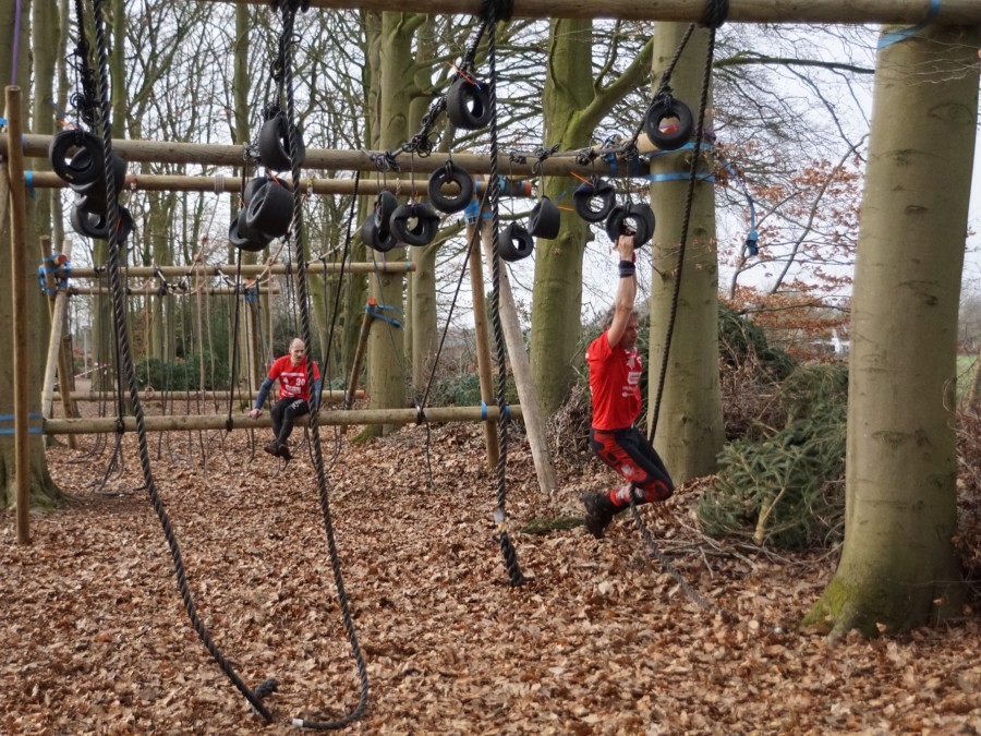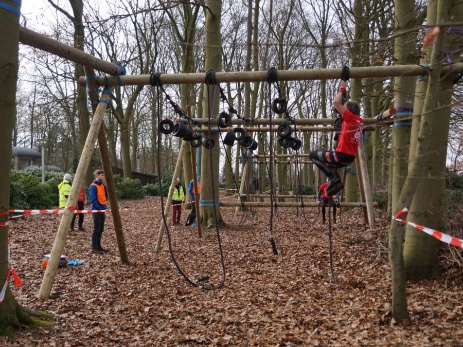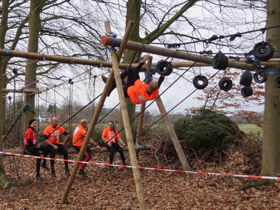 Vervolgens klimmen ze onder de balk door en klimmen ze via het schuine touw omhoog. Zonder over de balk te gaan moeten ze via de kartbandjes naar het uitklimtouw. Hierbij mogen ze het horizontale touw niet gebruiken. Met het uitklimtouw moeten ze over de laatste balk.