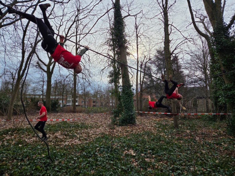Deelnemers moeten via het strak gespannen horizontale touw van voor naar achter klimmen. Hierbij passeren ze het kruis.