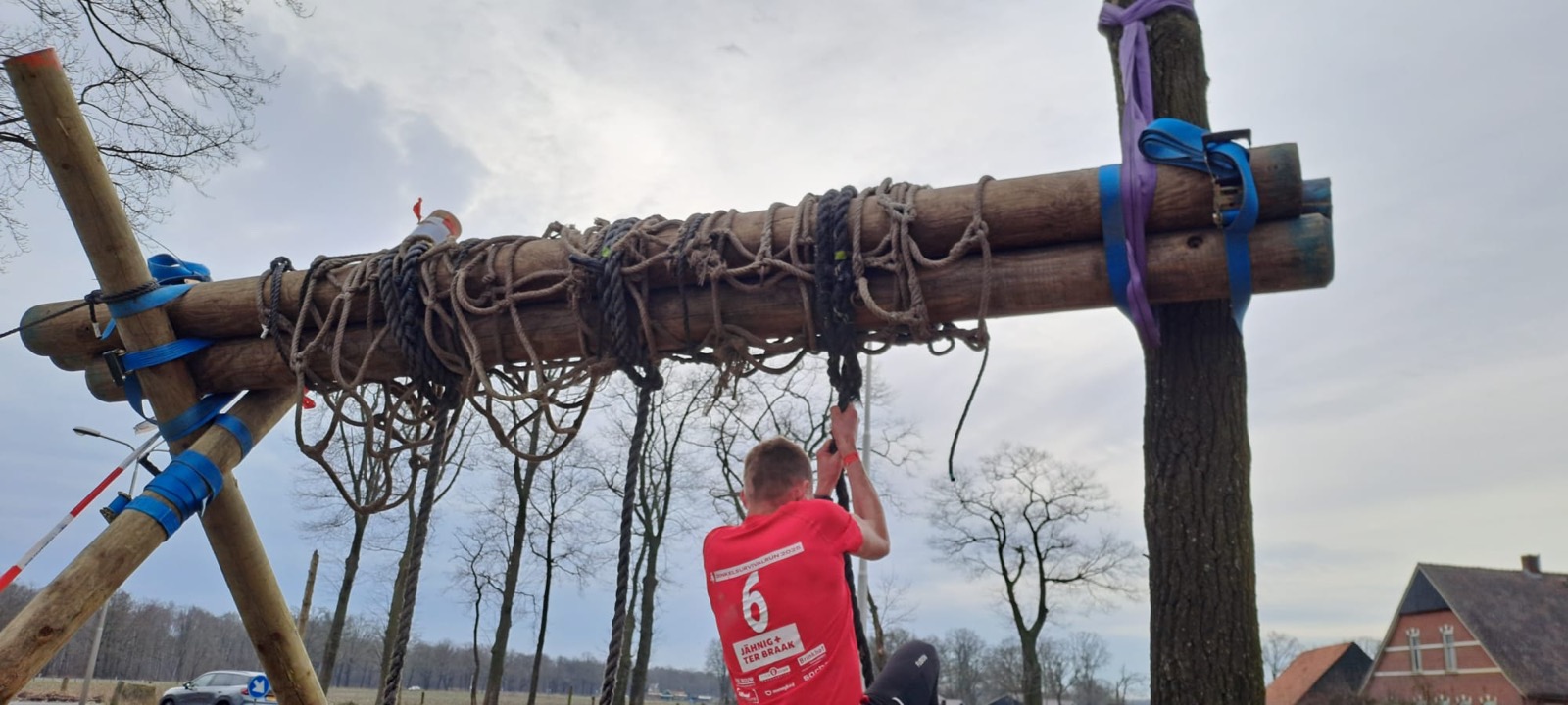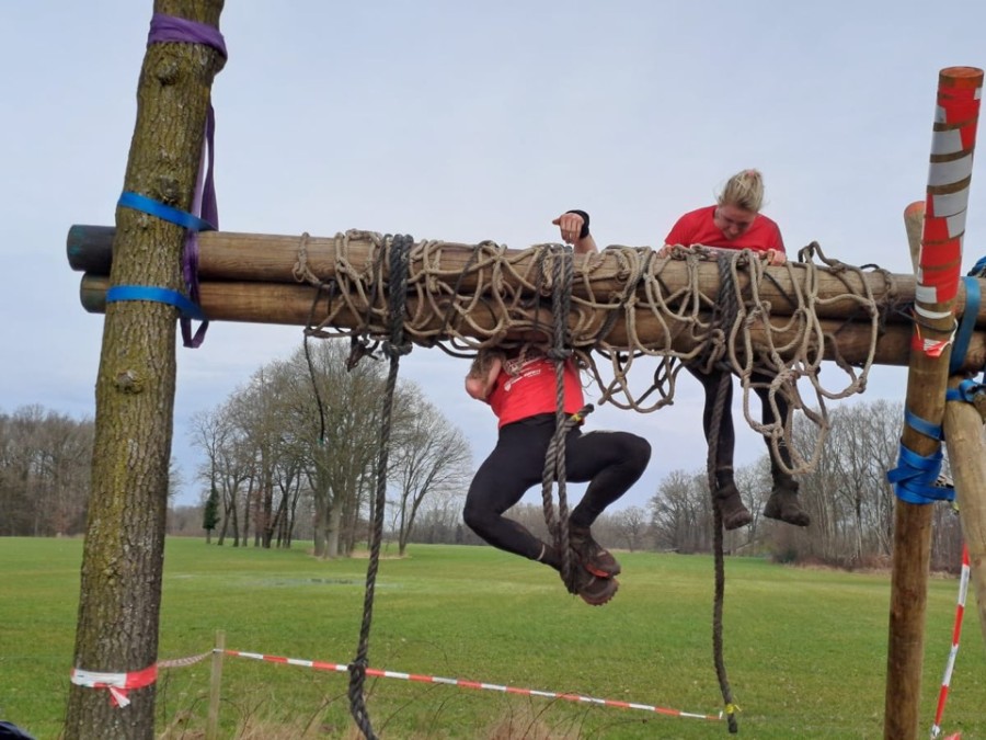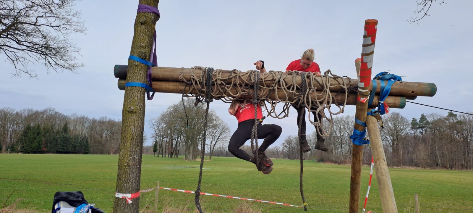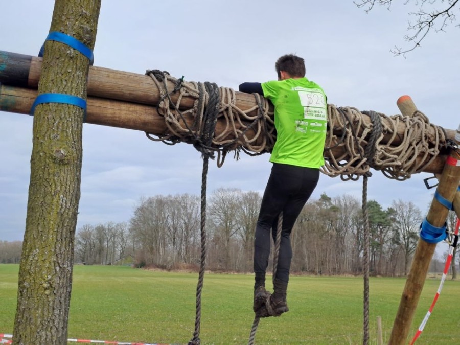 Deelnemers moeten over de balken met net klimmen. Hierbij mogen ze geen gebruik maken van de bomen. Een borstwaartsom is niet toegestaan.