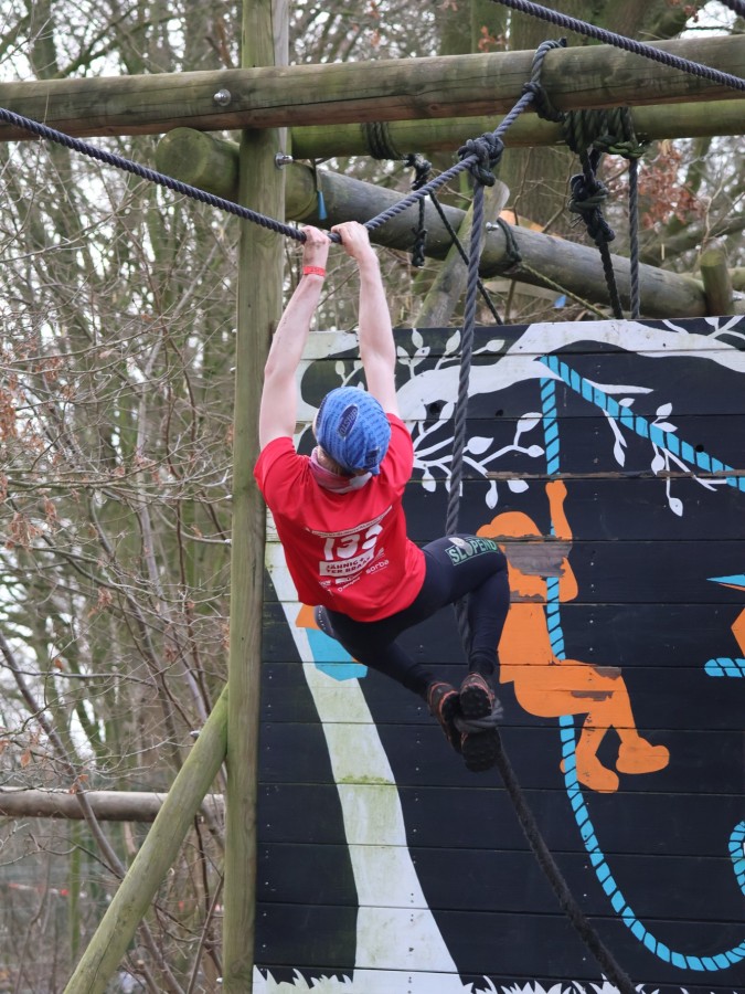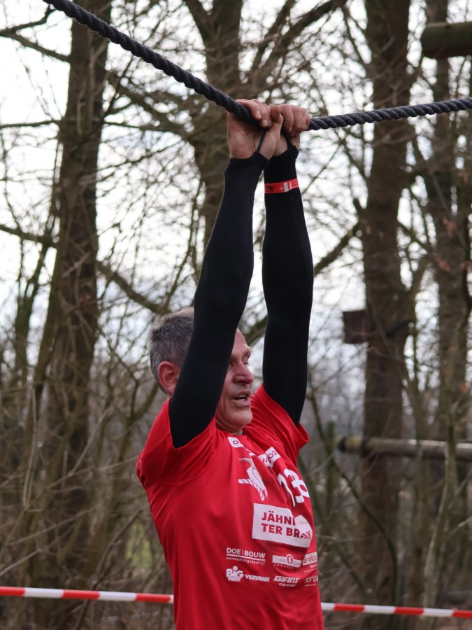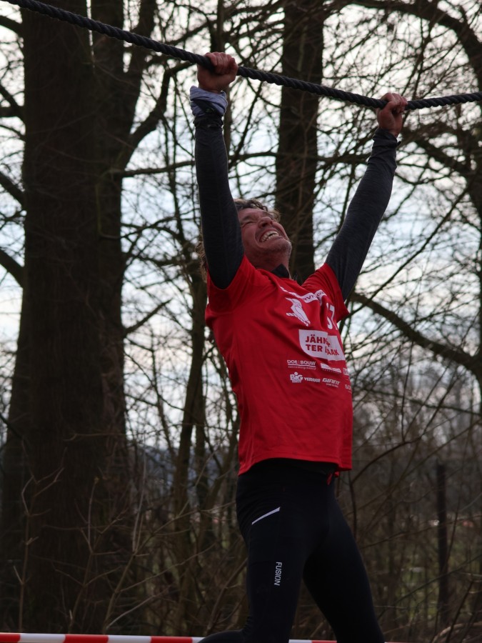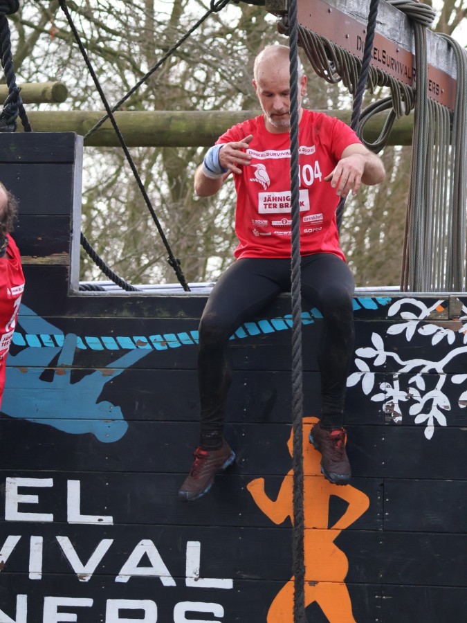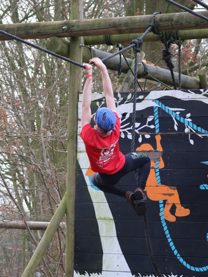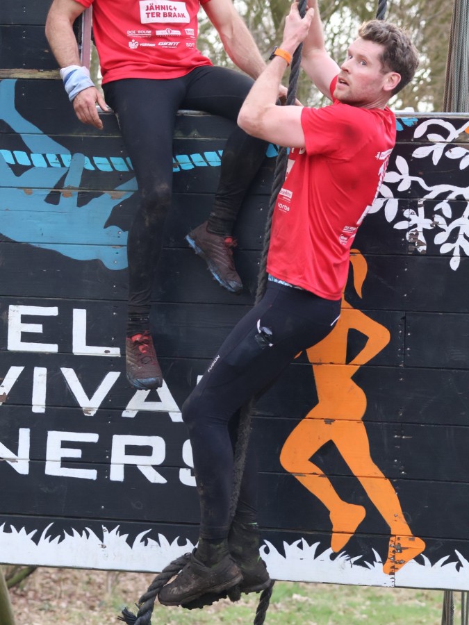 Via het inklimtouw moeten deelnemers de bovenste balk aantikken. Vervolgens moeten ze over the wall door klimmen. Daarna klimmen ze middels de apenhang over het horizontale touw naar het net waar ze vervolgens onderdoor moeten.
