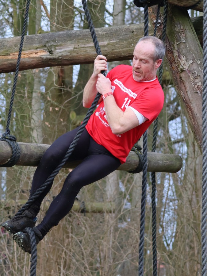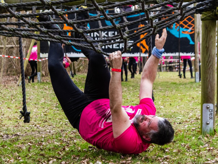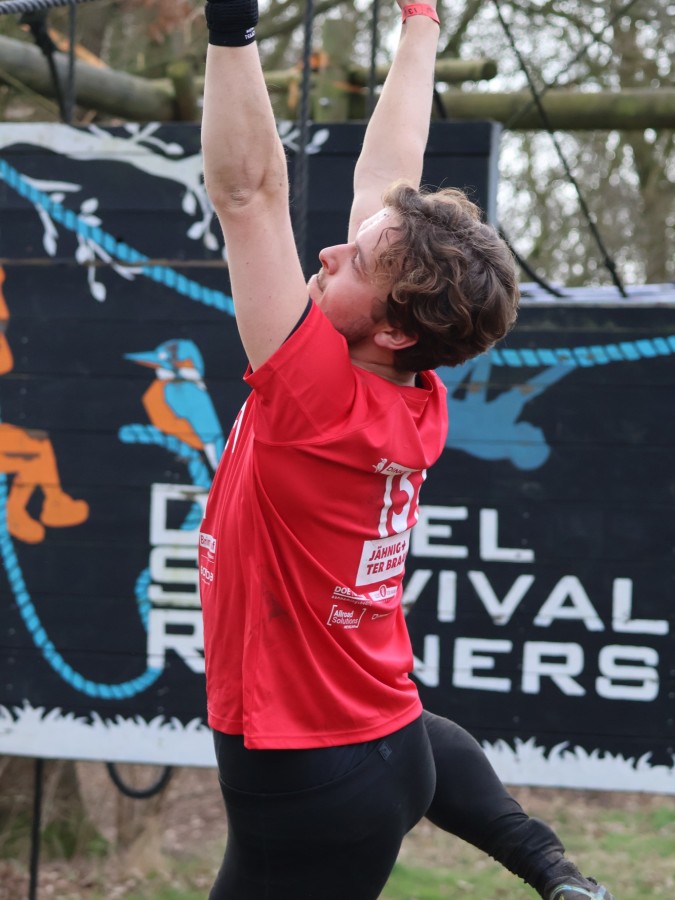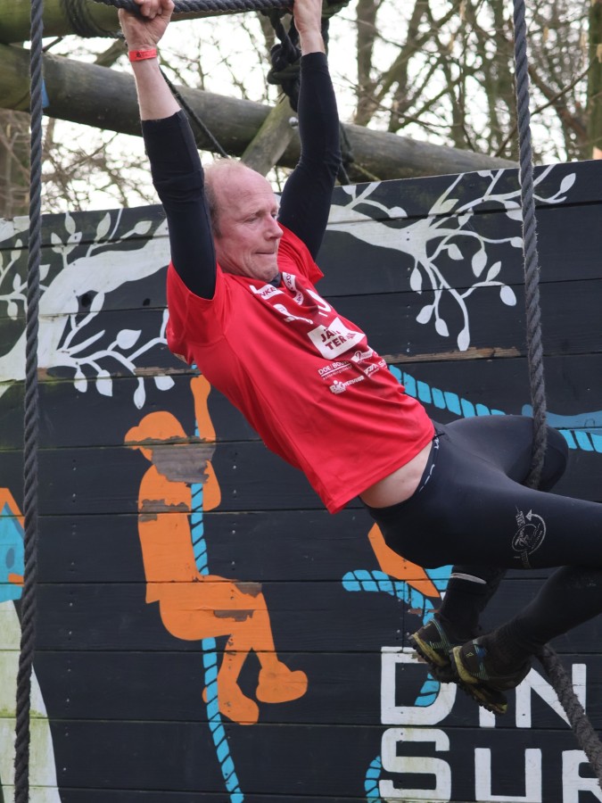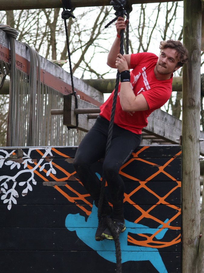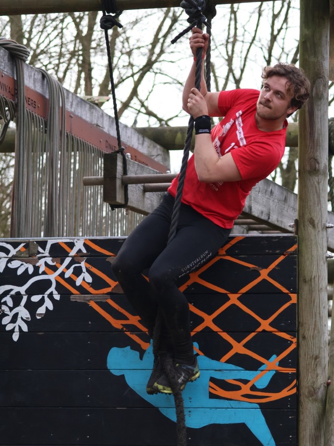 Via het inklimtouw moeten deelnemers de bovenste balk aantikken. Vervolgens moeten ze over the wall door klimmen. Daarna klimmen ze middels de apenhang over het horizontale touw naar het net waar ze vervolgens onderdoor moeten.