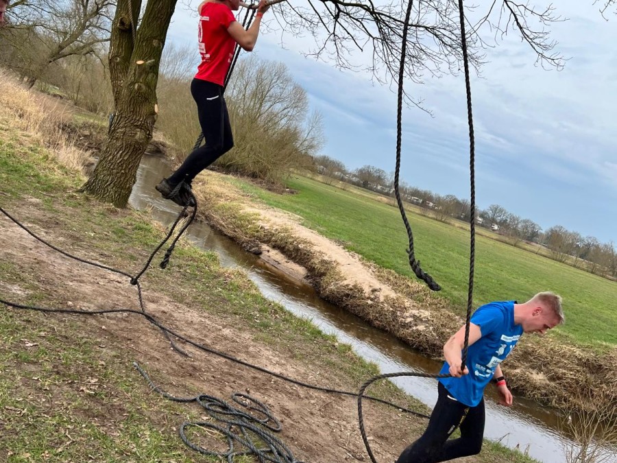 Tussen twee bomen een horizontaal touw, waar men zelf een swingover moet maken