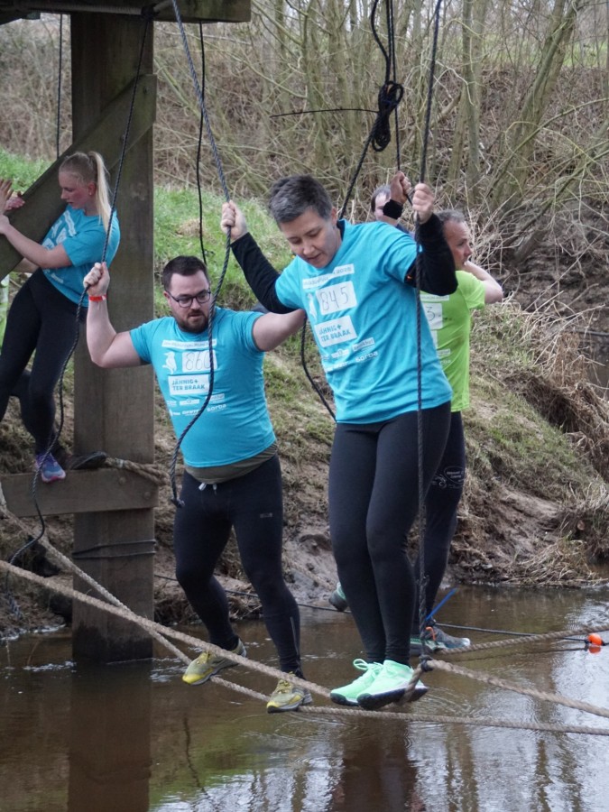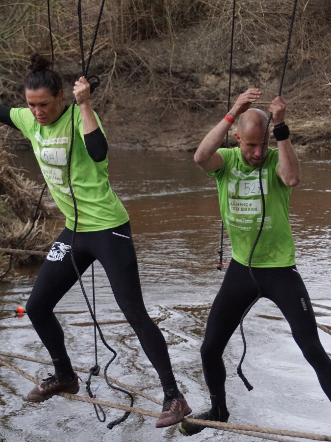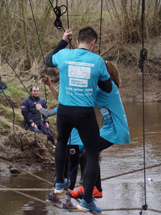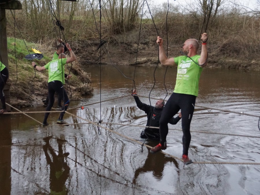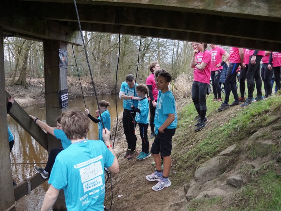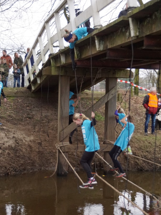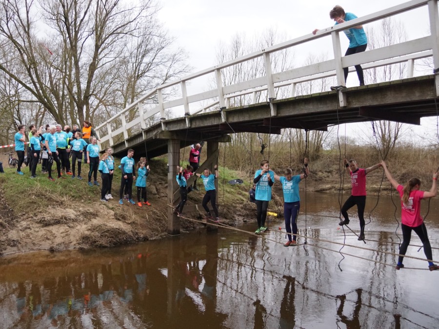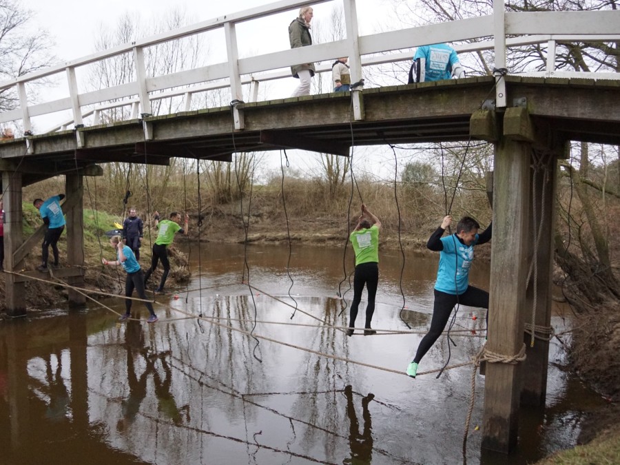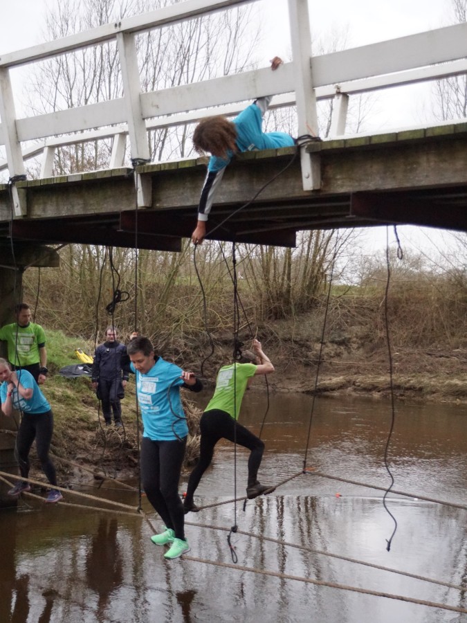 Deelnemers moeten naar de overkant, mogen gebruik maken van de hangende touwtjes, maar niet van de brug.