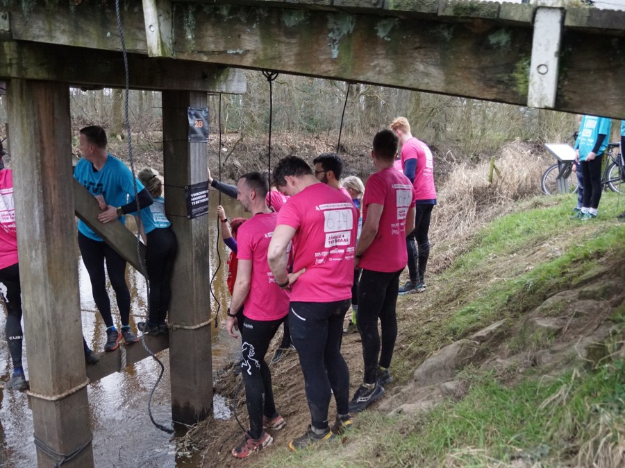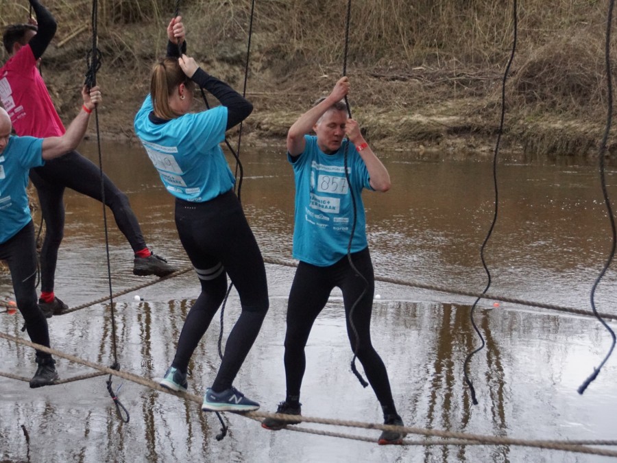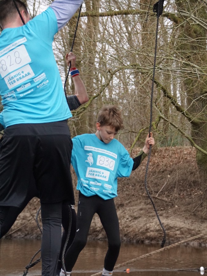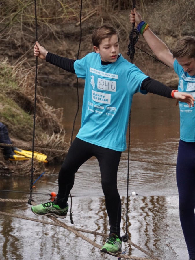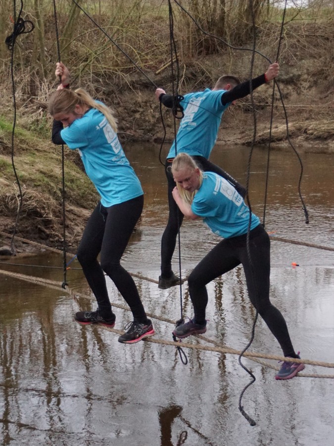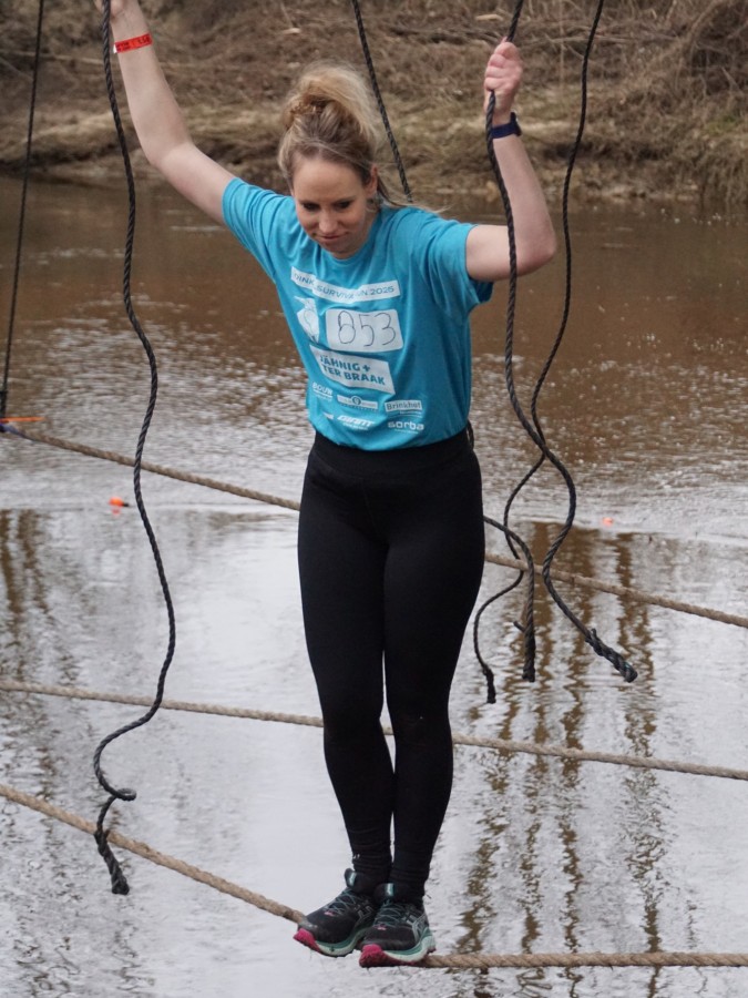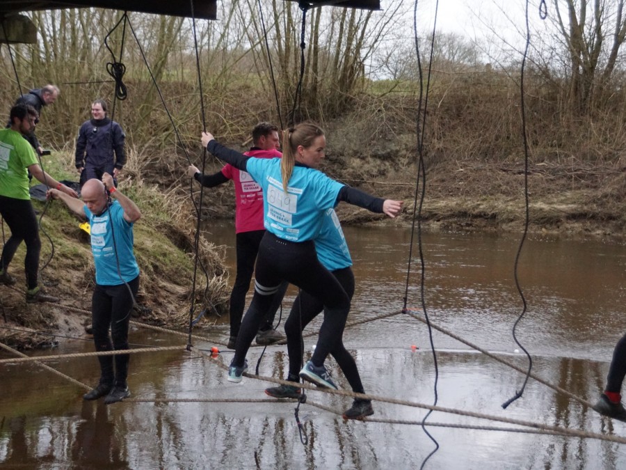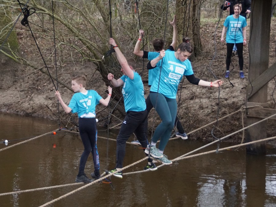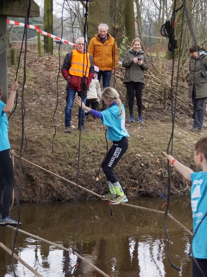 Deelnemers moeten naar de overkant, mogen gebruik maken van de hangende touwtjes, maar niet van de brug.