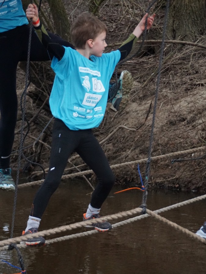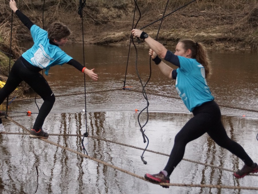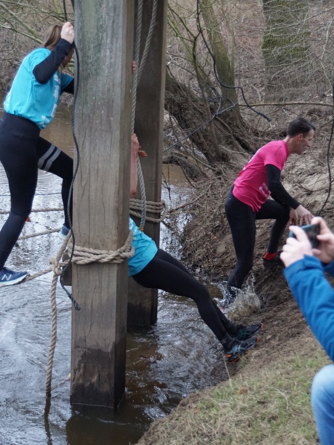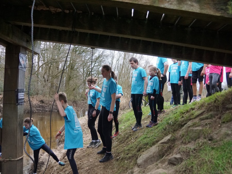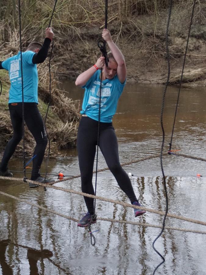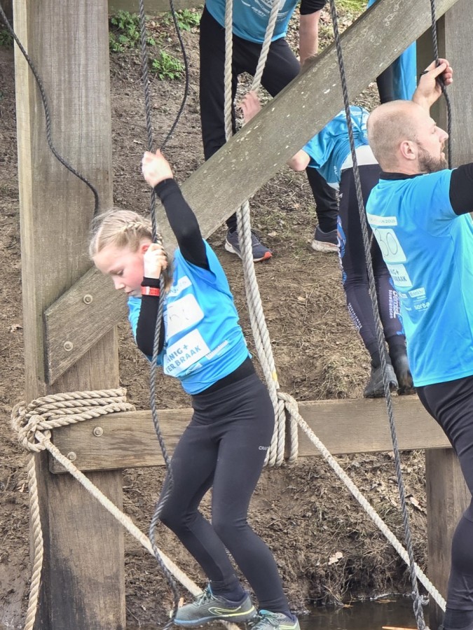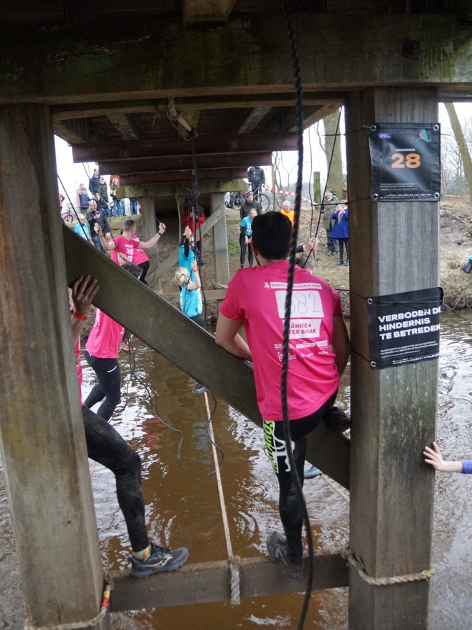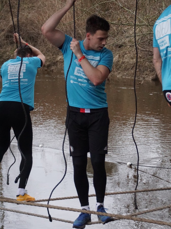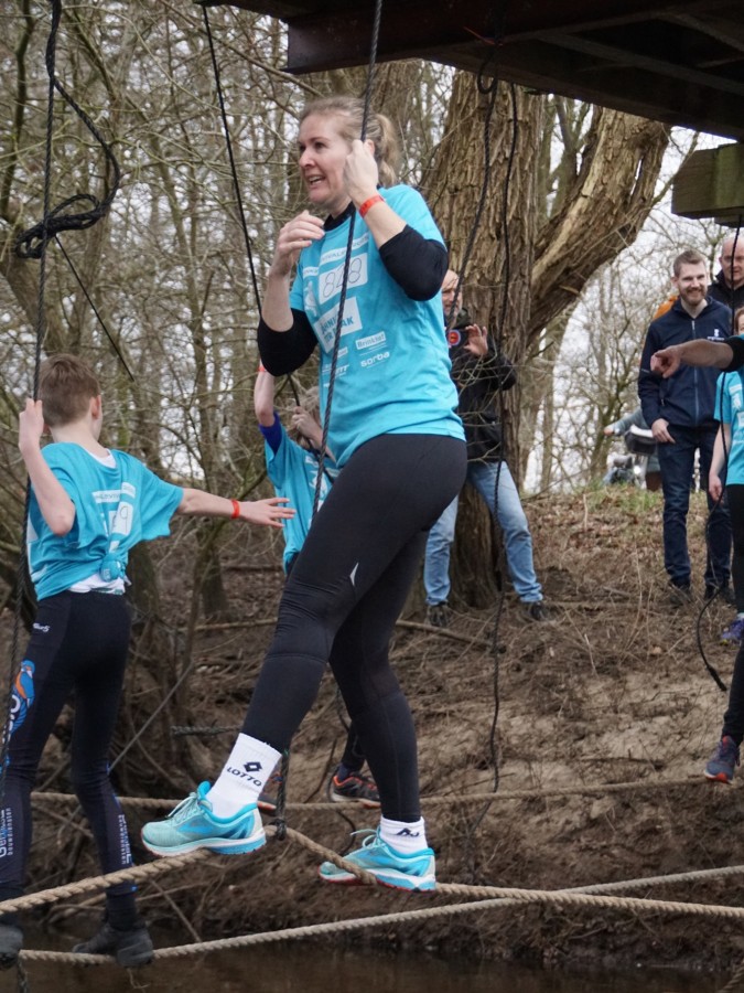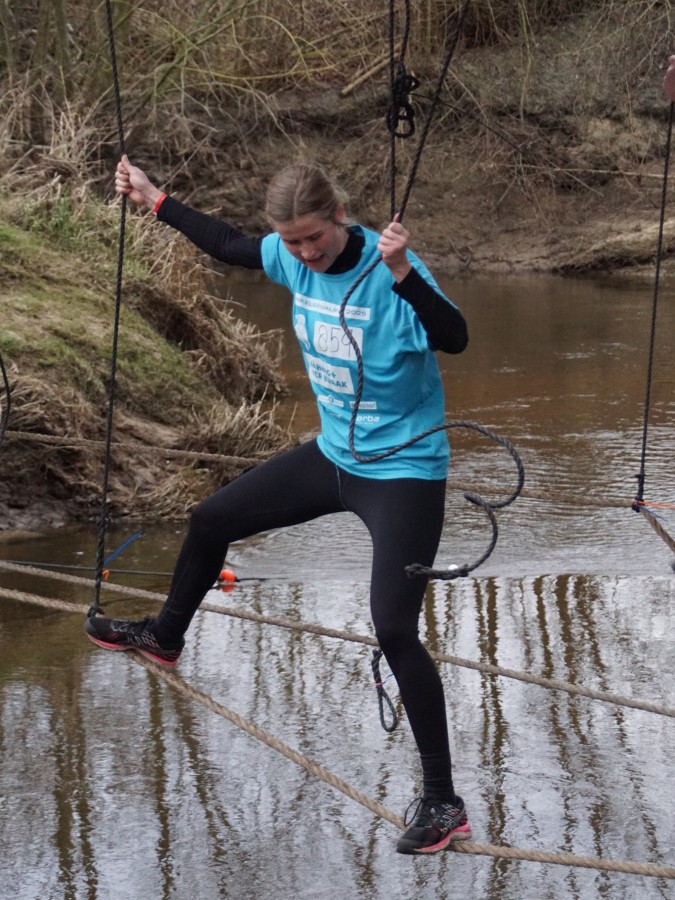 Deelnemers moeten naar de overkant, mogen gebruik maken van de hangende touwtjes, maar niet van de brug.