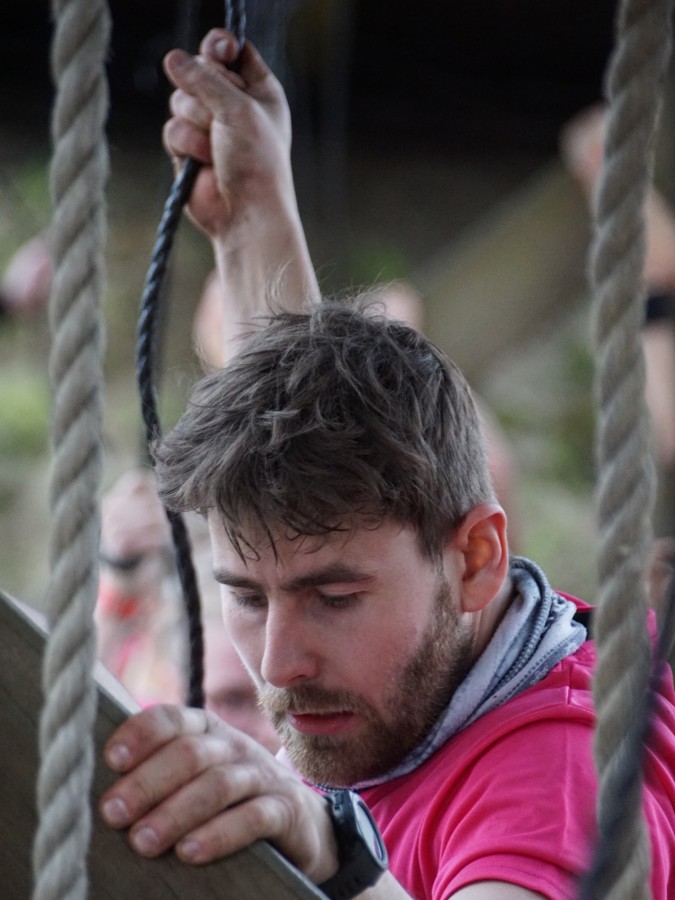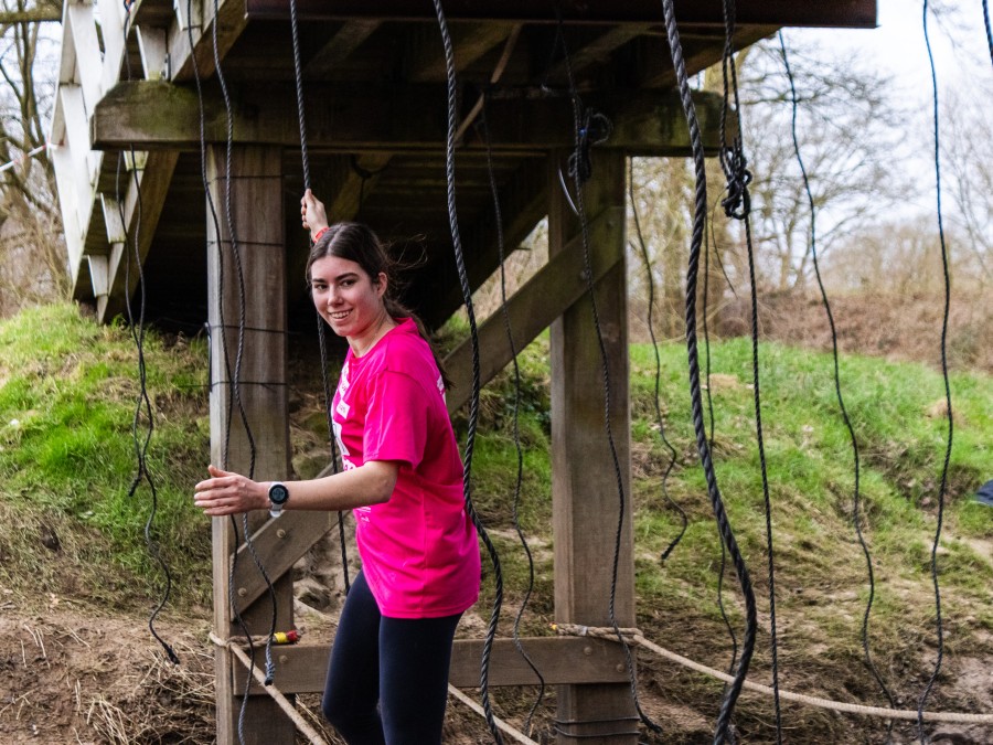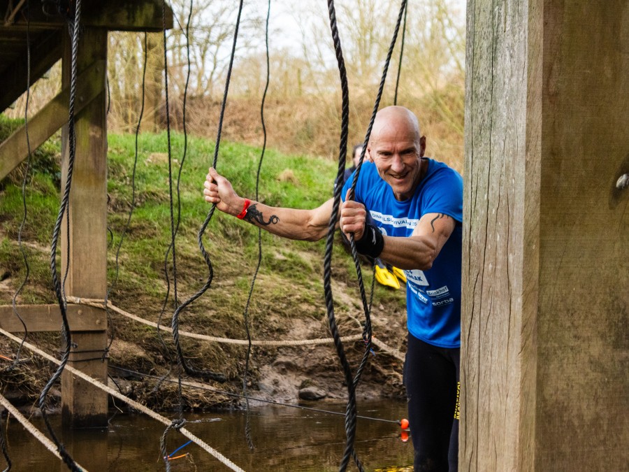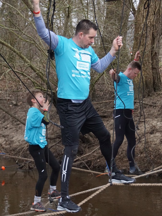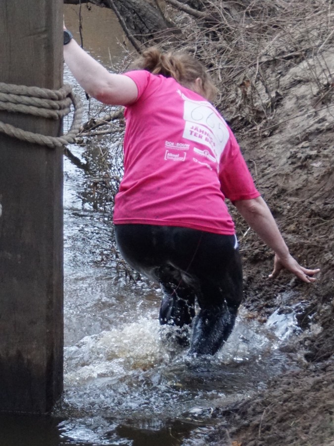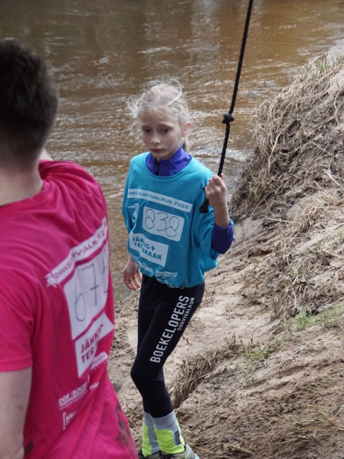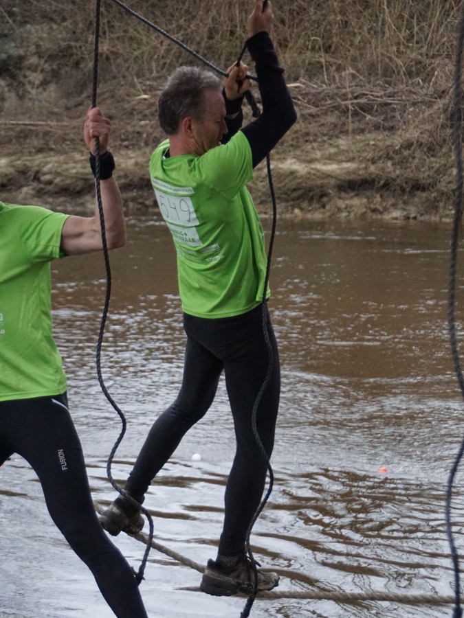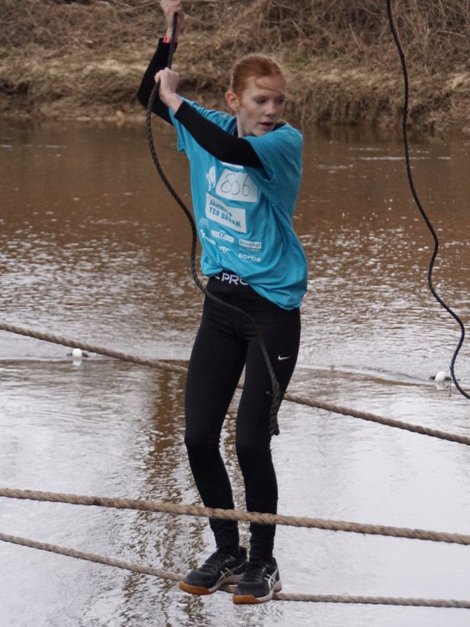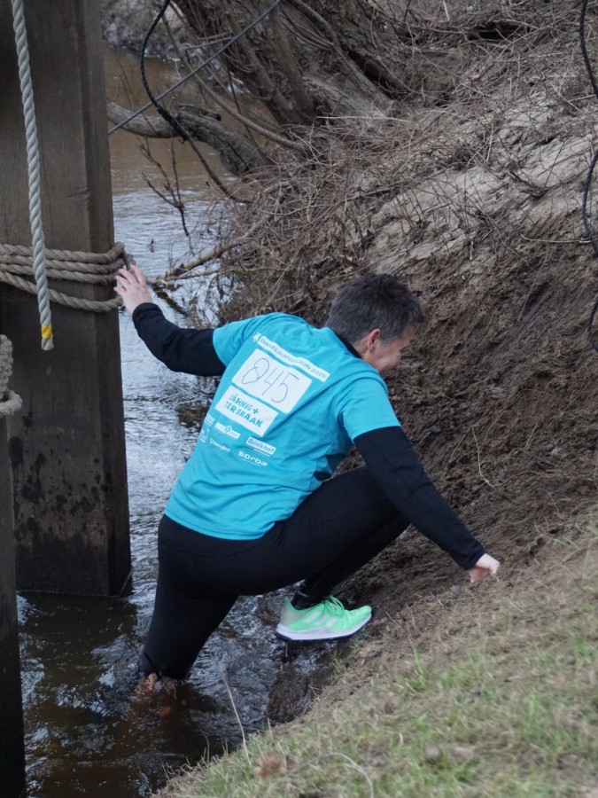 Deelnemers moeten naar de overkant, mogen gebruik maken van de hangende touwtjes, maar niet van de brug.