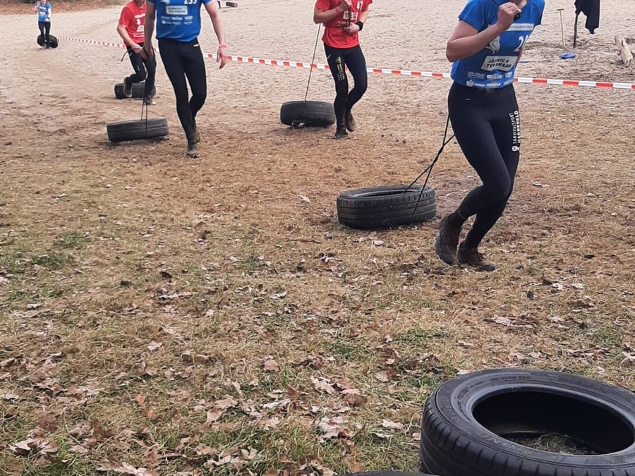 Alle vier de leden van het team moeten een autoband met touw voorttrekken.