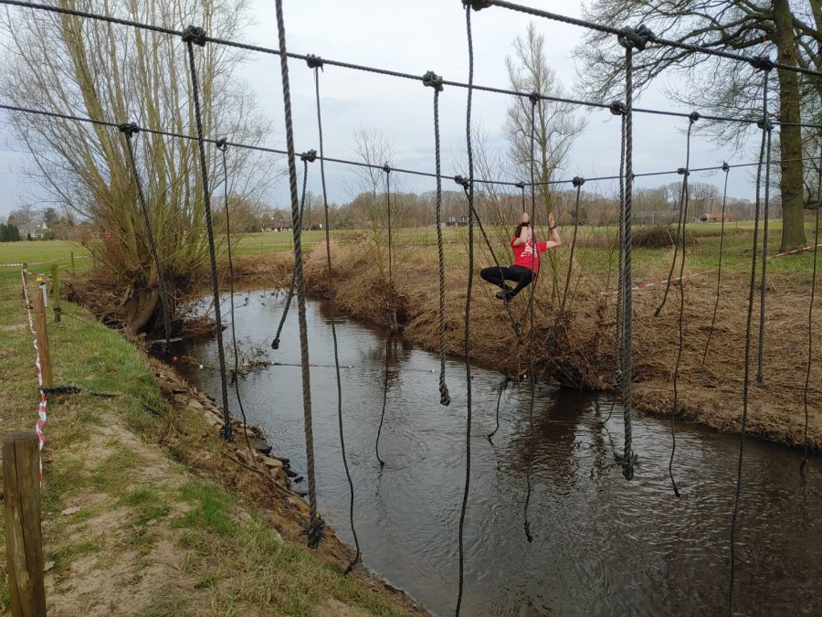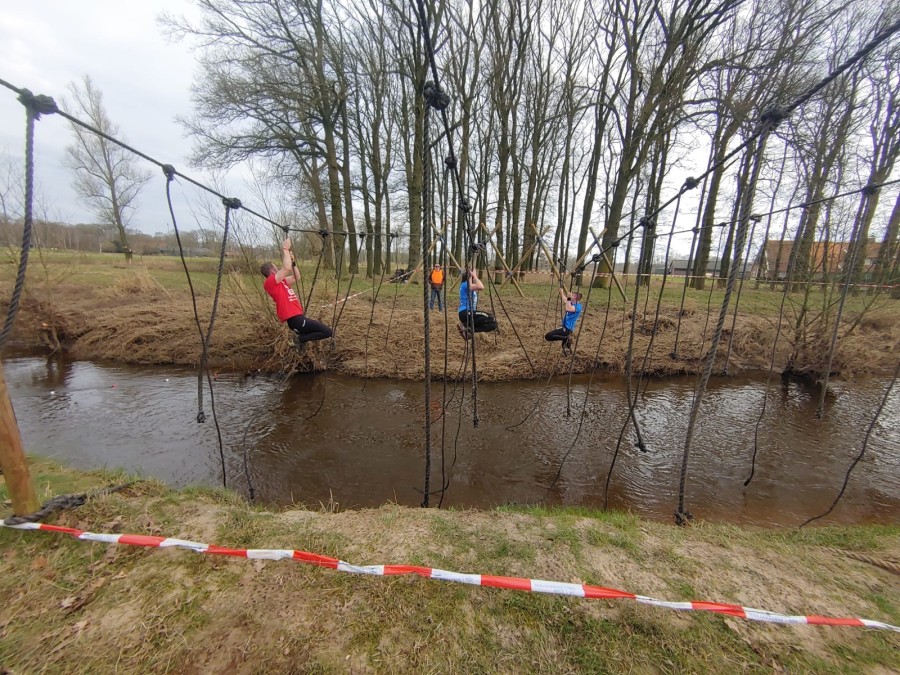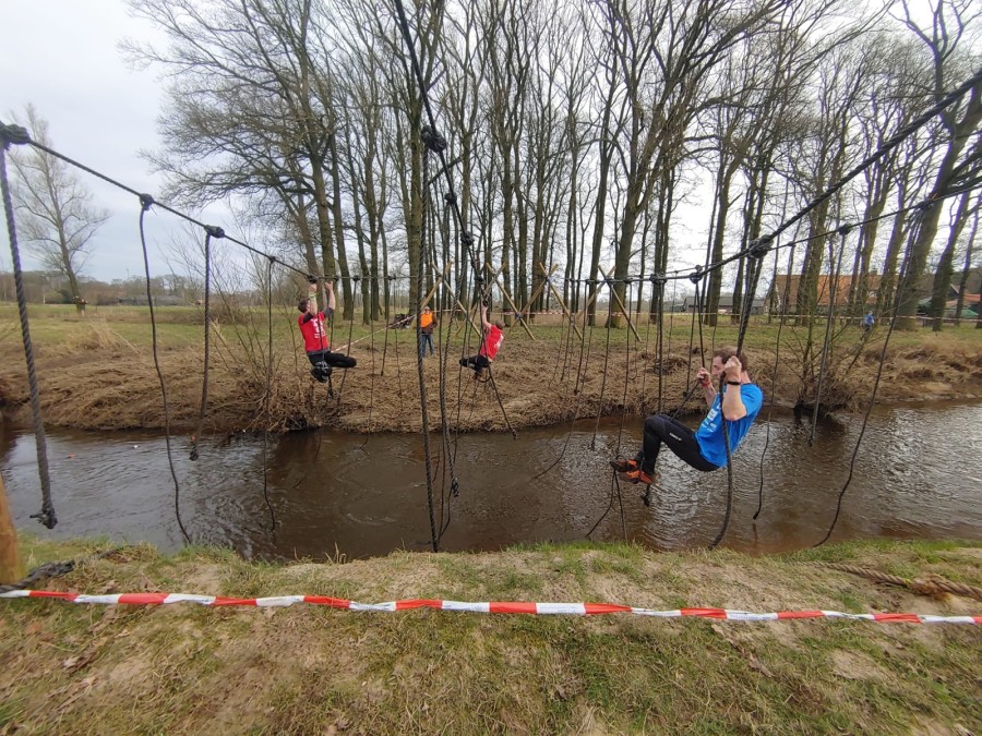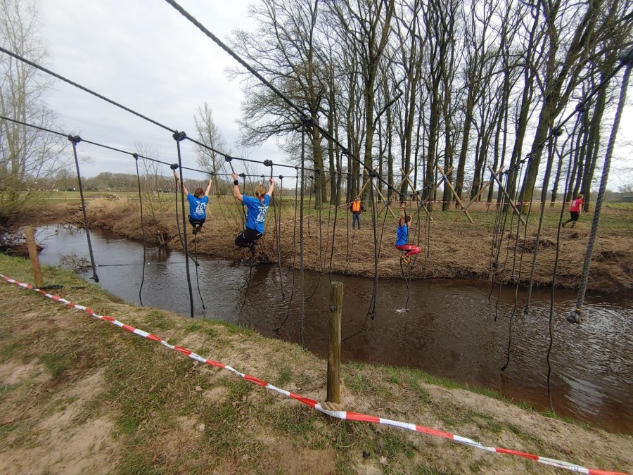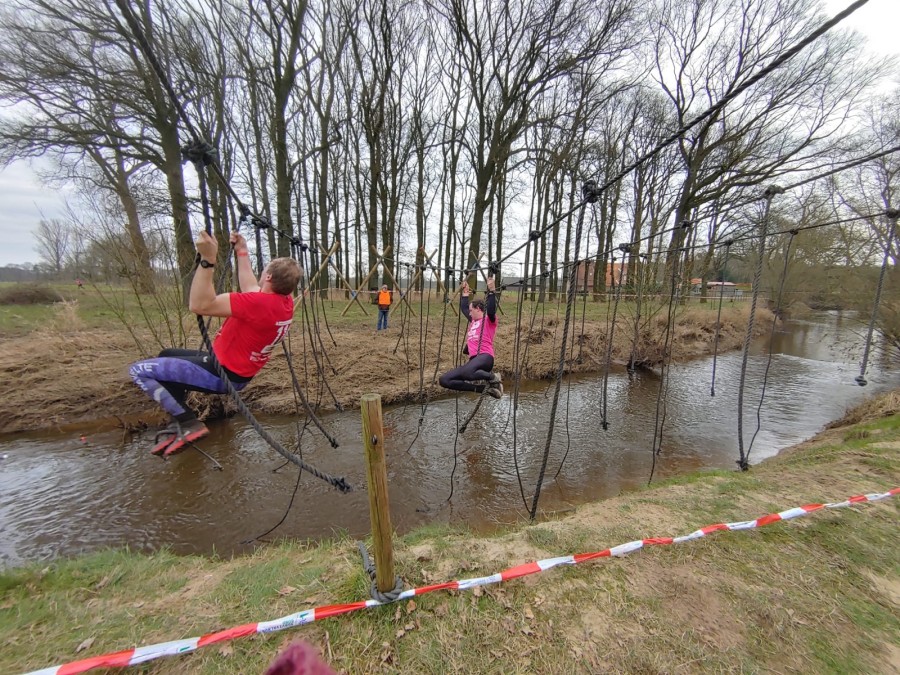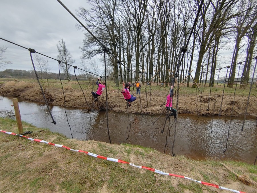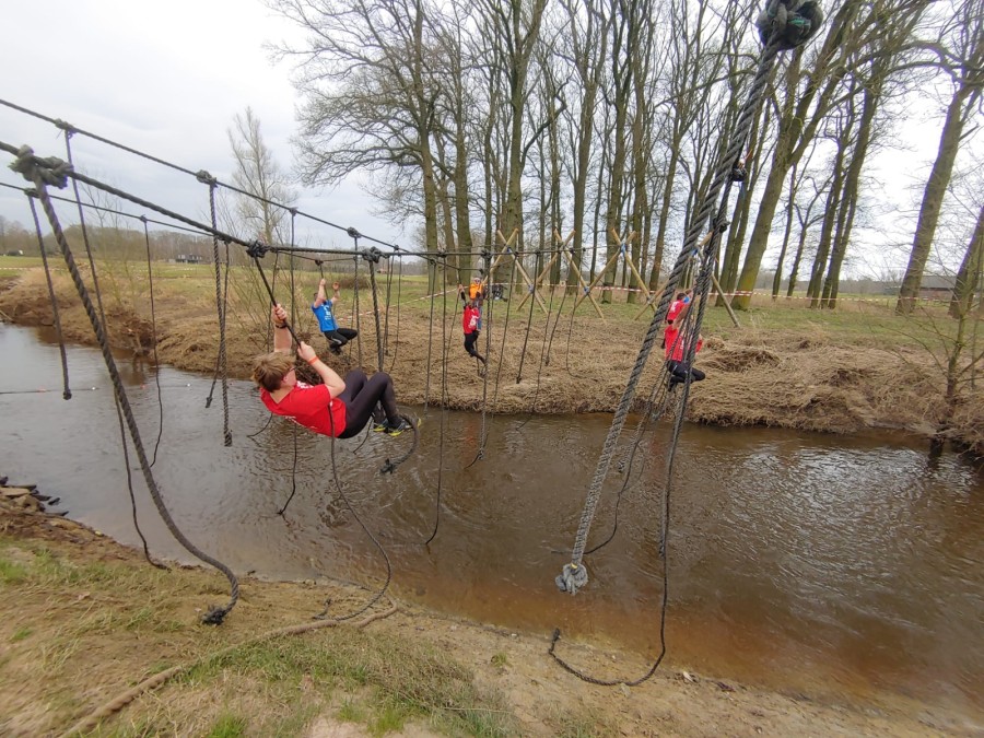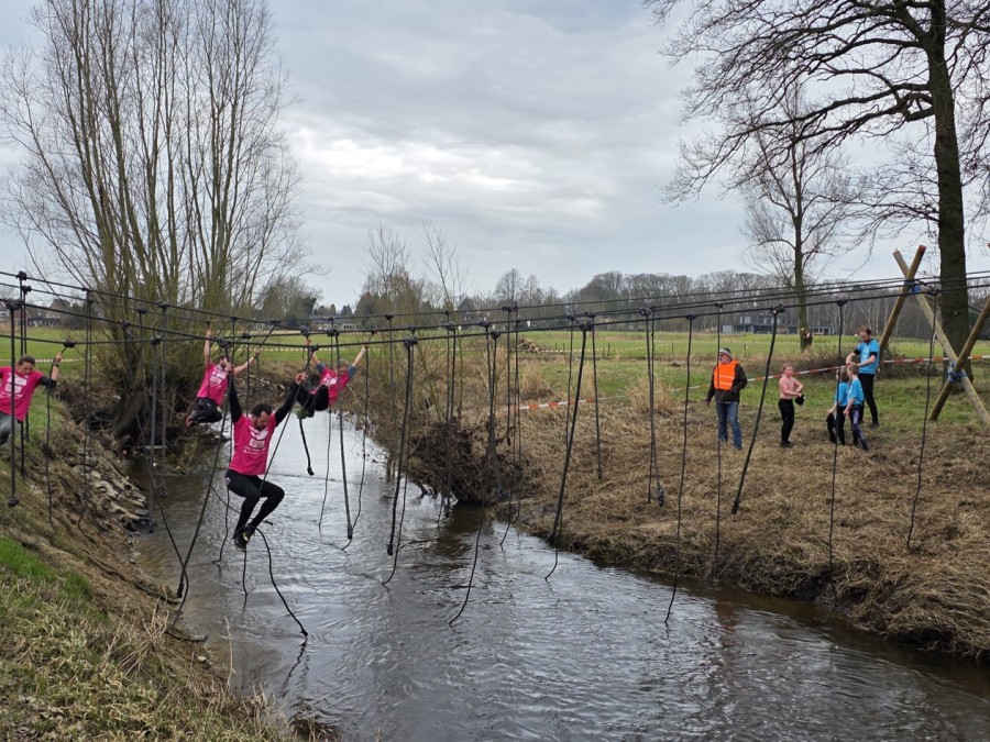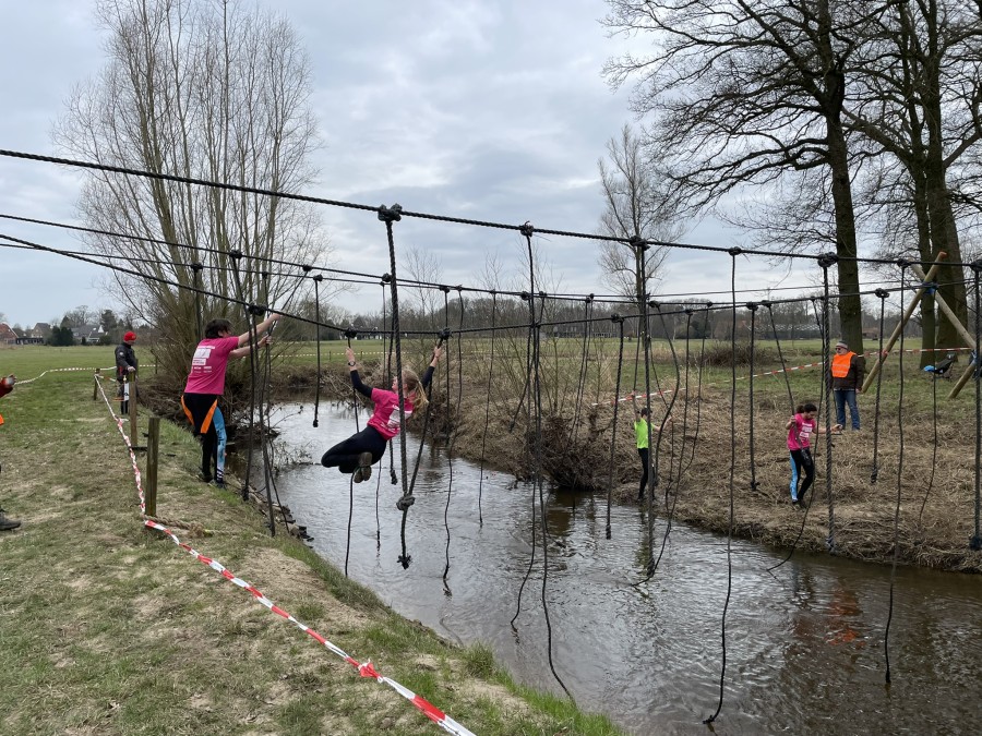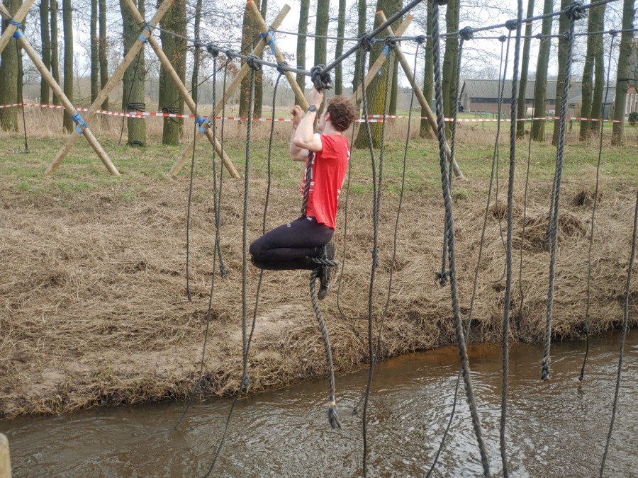 Deelnemers moeten via de lianen naar de overkant van de Dinkel klimmen. Hierbij mogen ze geen gebruik maken van het boventouw.