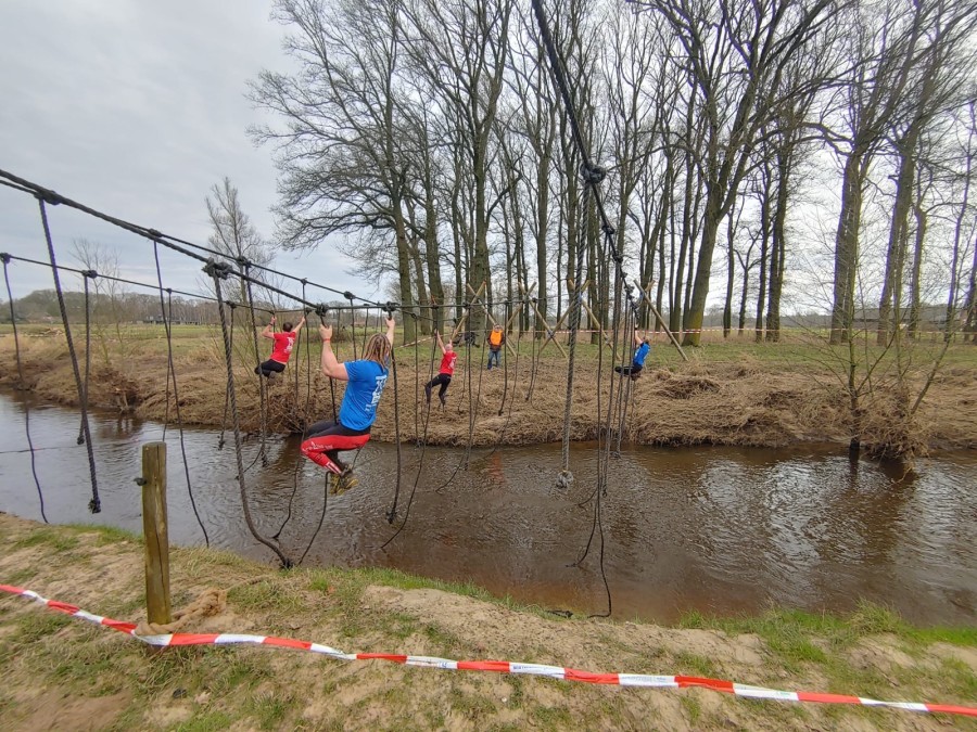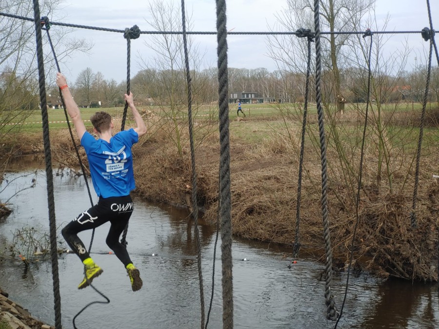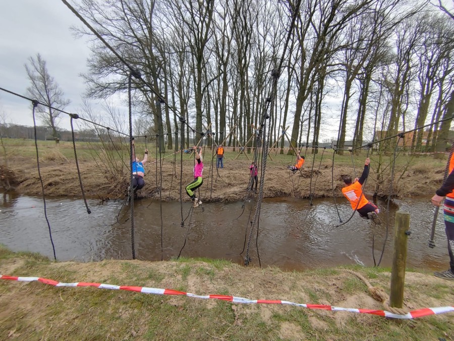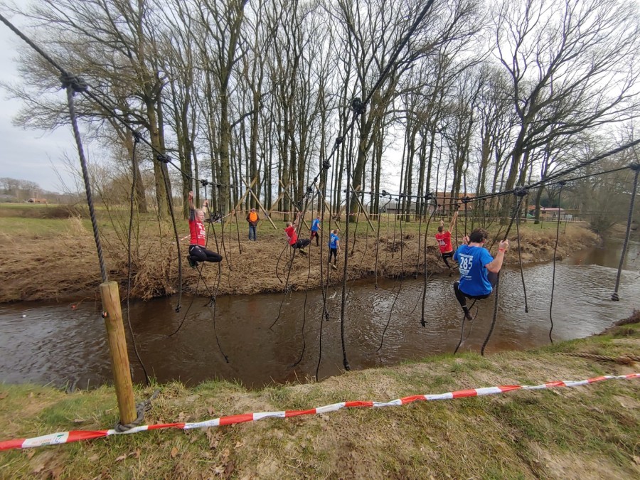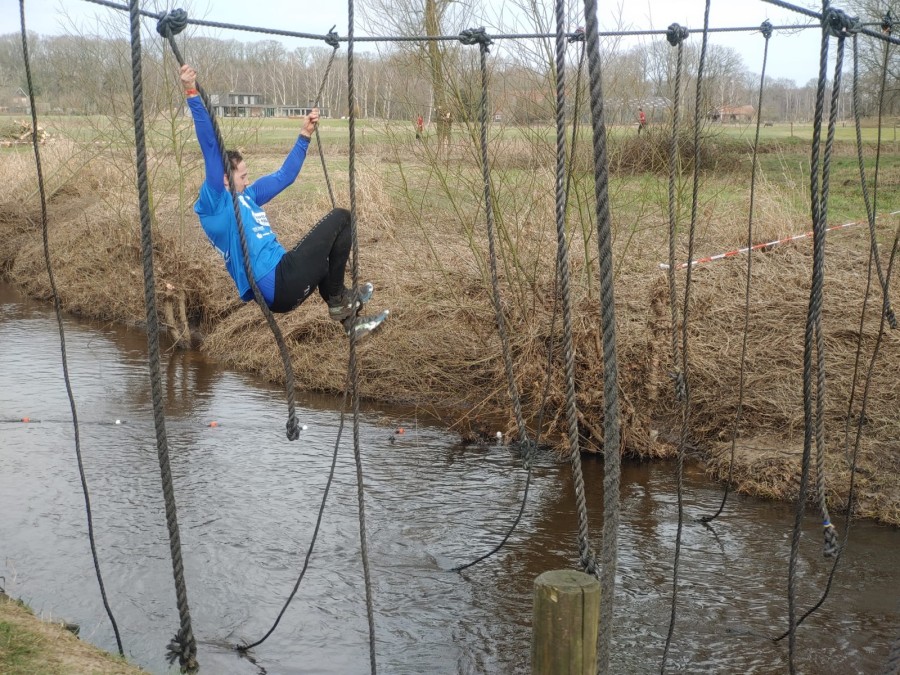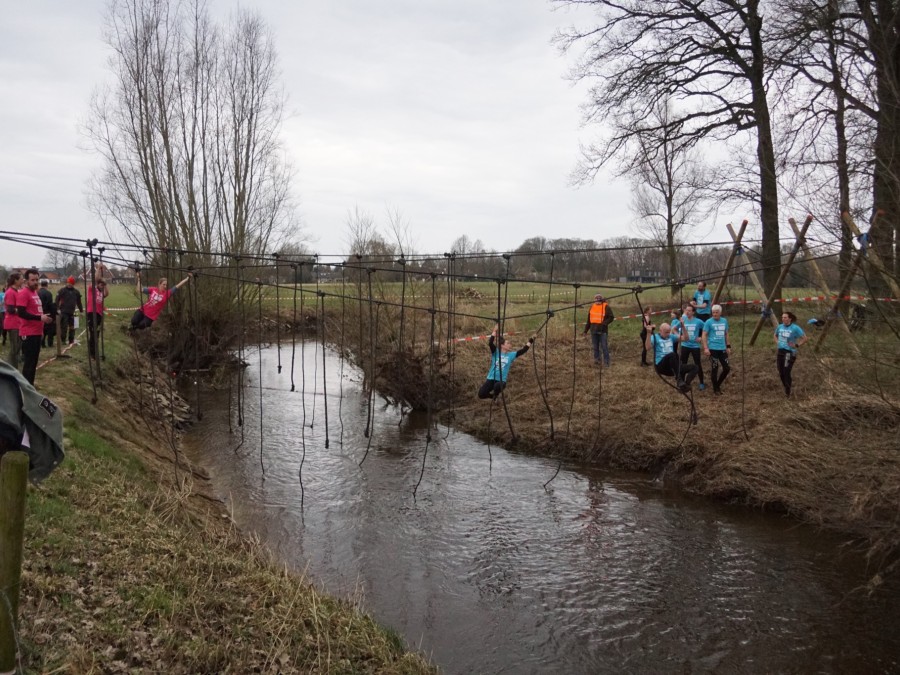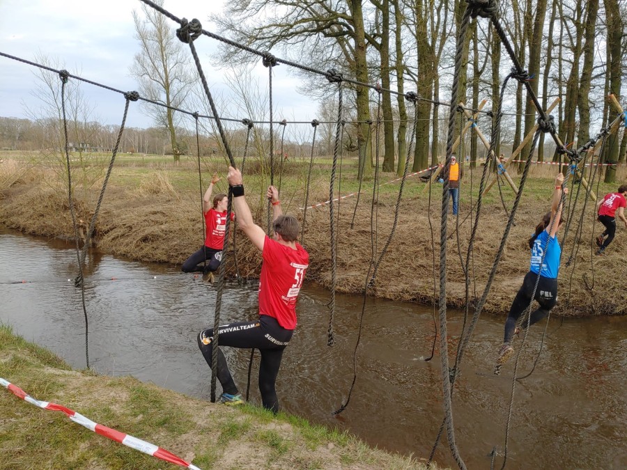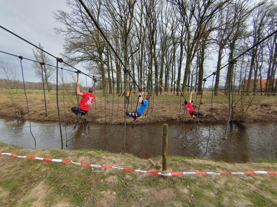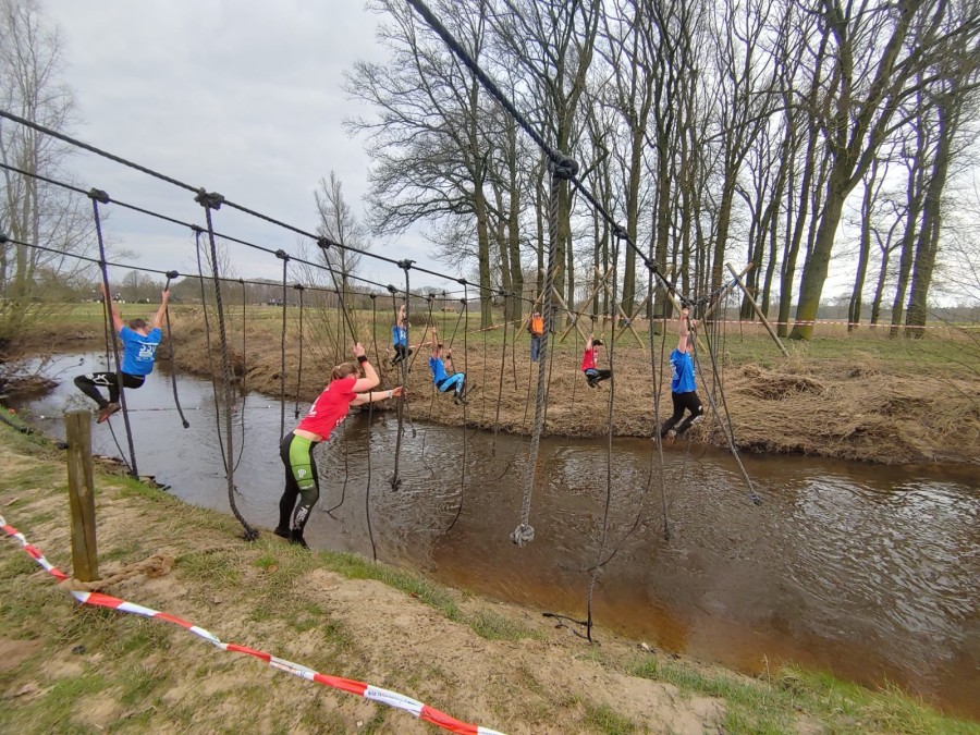 Deelnemers moeten via de lianen naar de overkant van de Dinkel klimmen. Hierbij mogen ze geen gebruik maken van het boventouw.