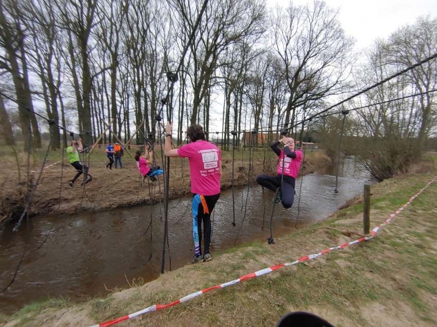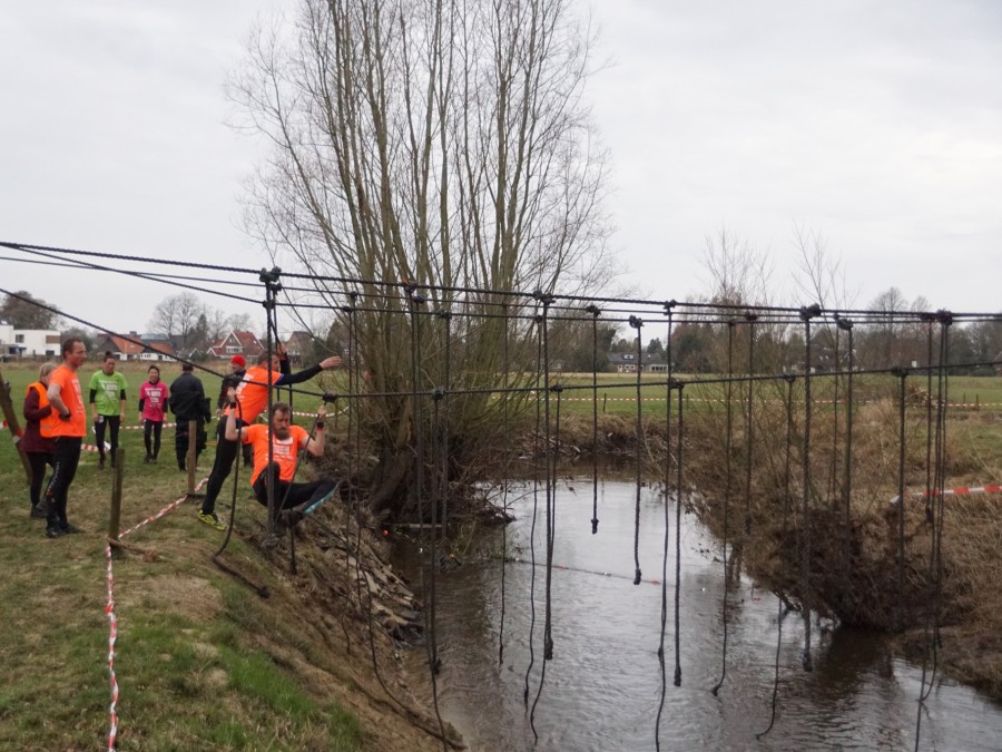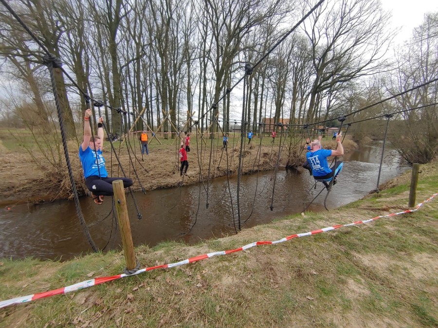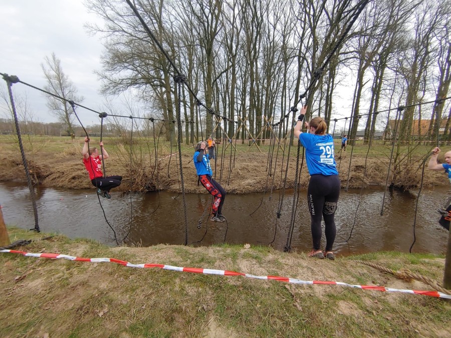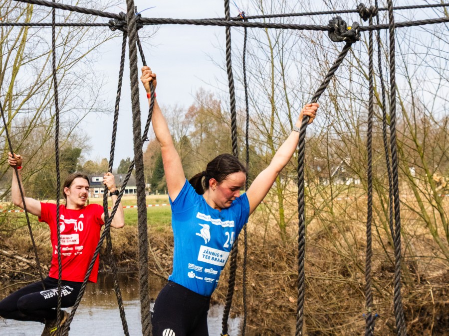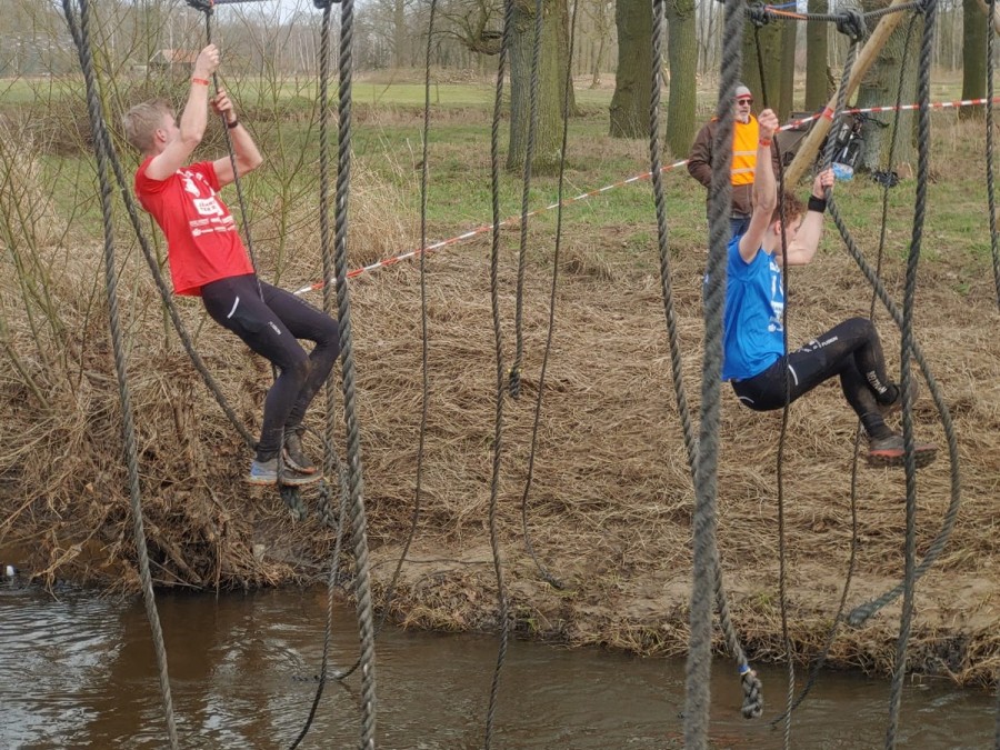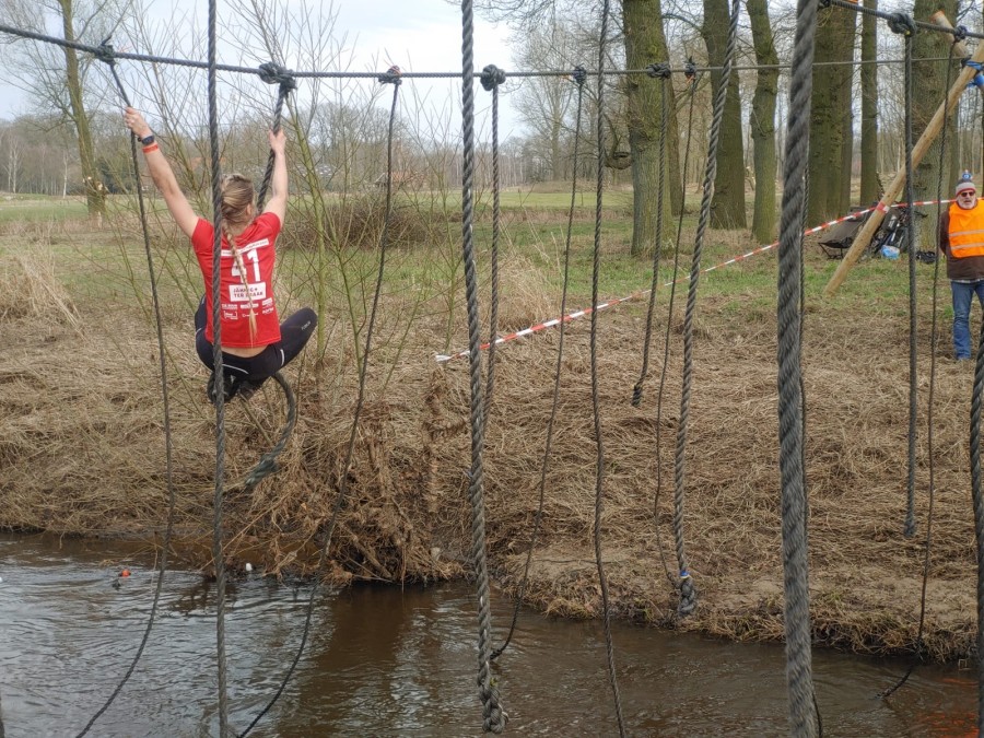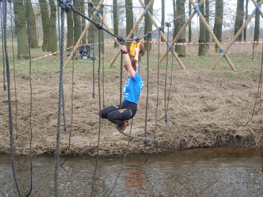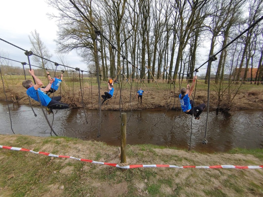 Deelnemers moeten via de lianen naar de overkant van de Dinkel klimmen. Hierbij mogen ze geen gebruik maken van het boventouw.