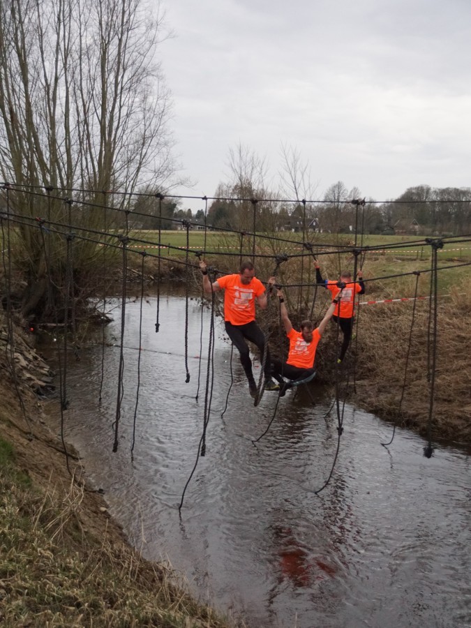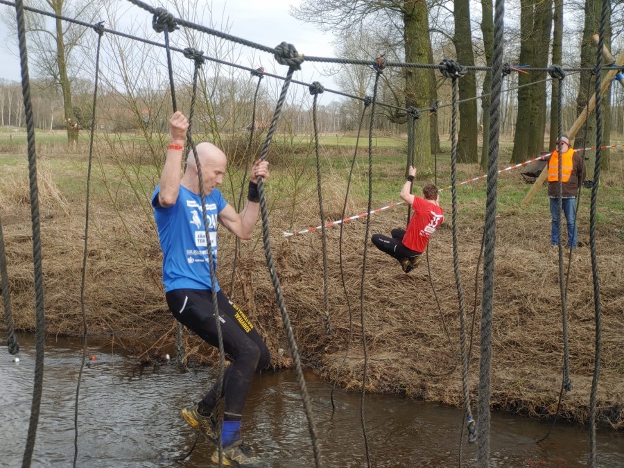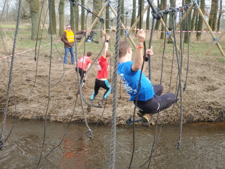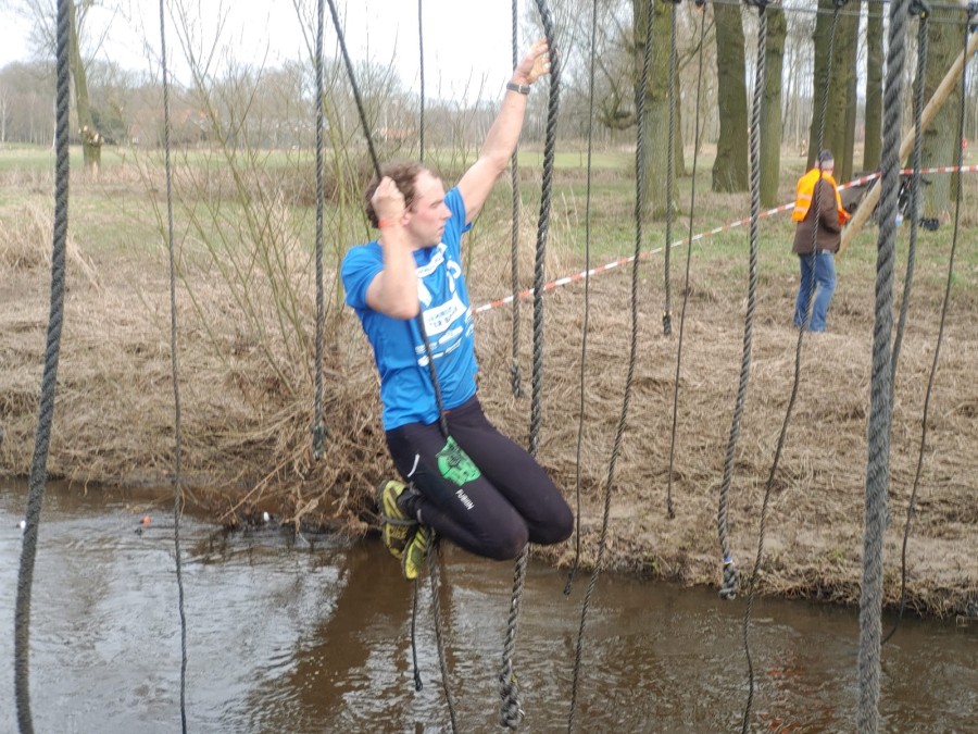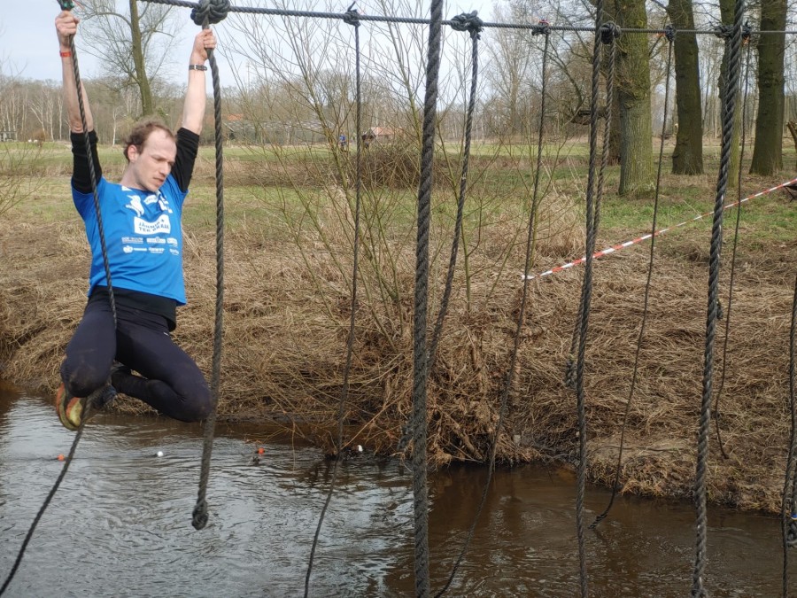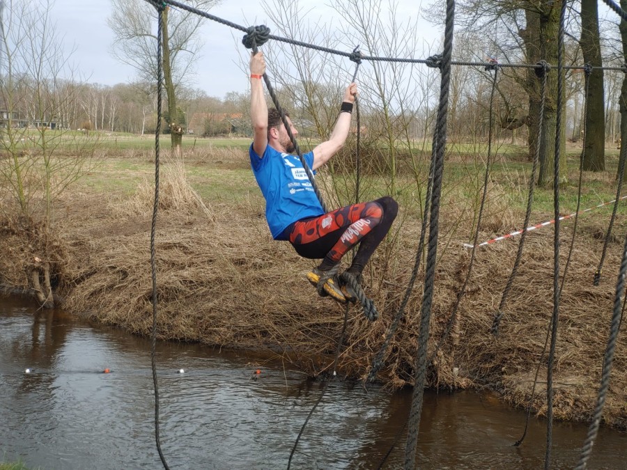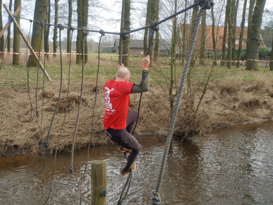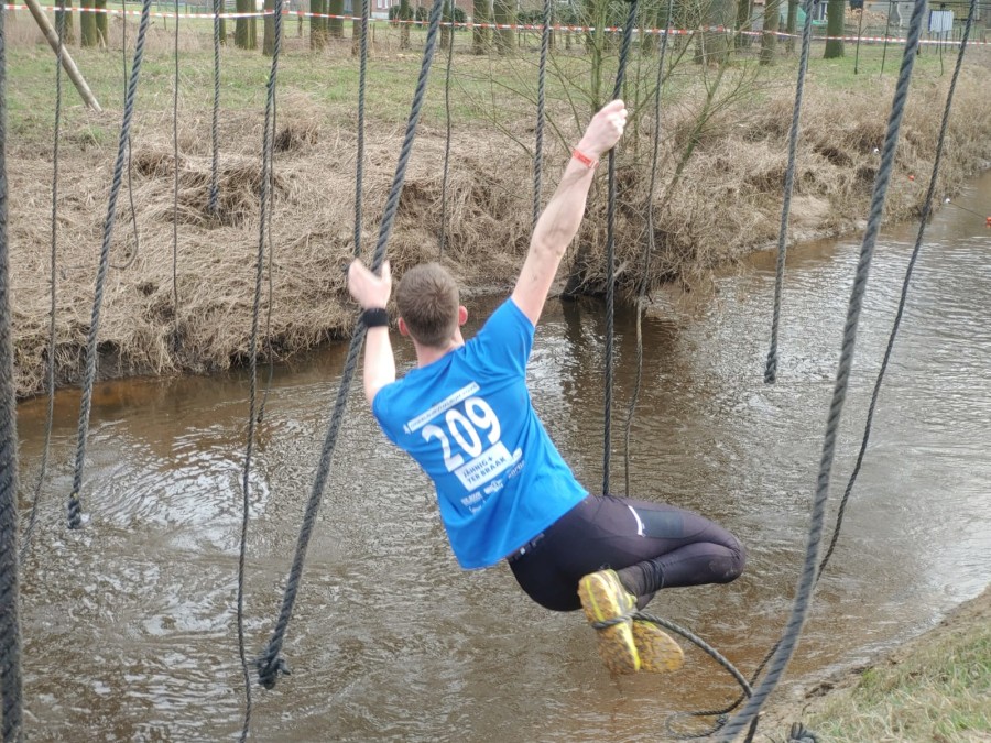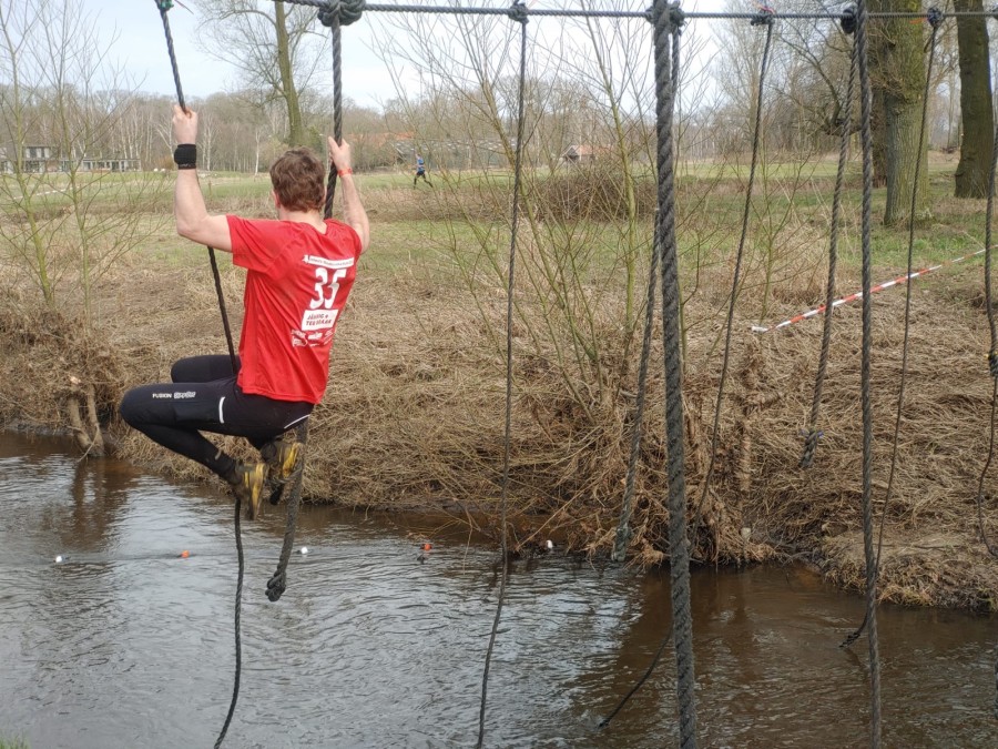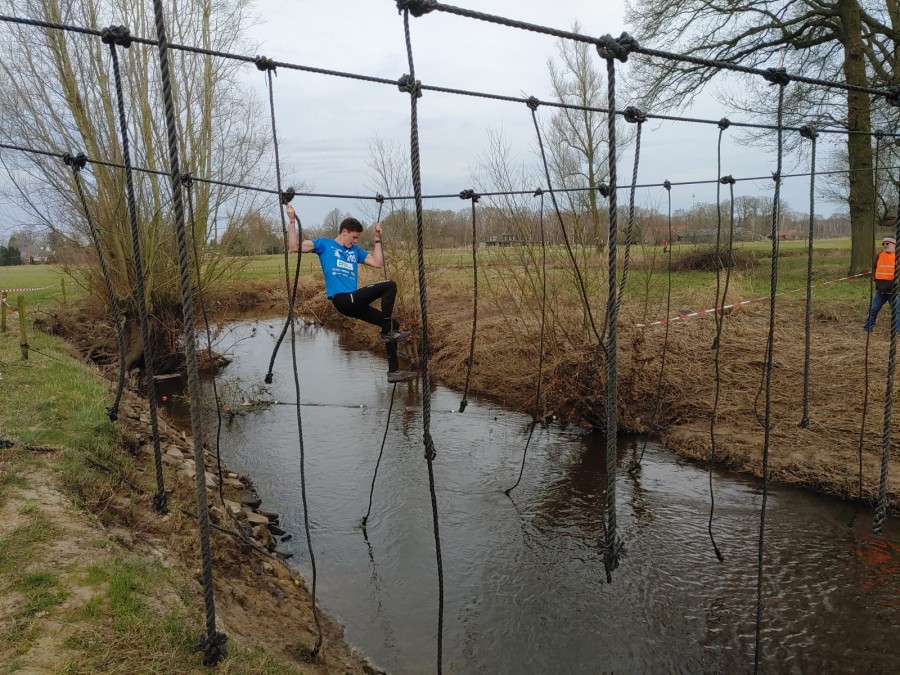 Deelnemers moeten via de lianen naar de overkant van de Dinkel klimmen. Hierbij mogen ze geen gebruik maken van het boventouw.