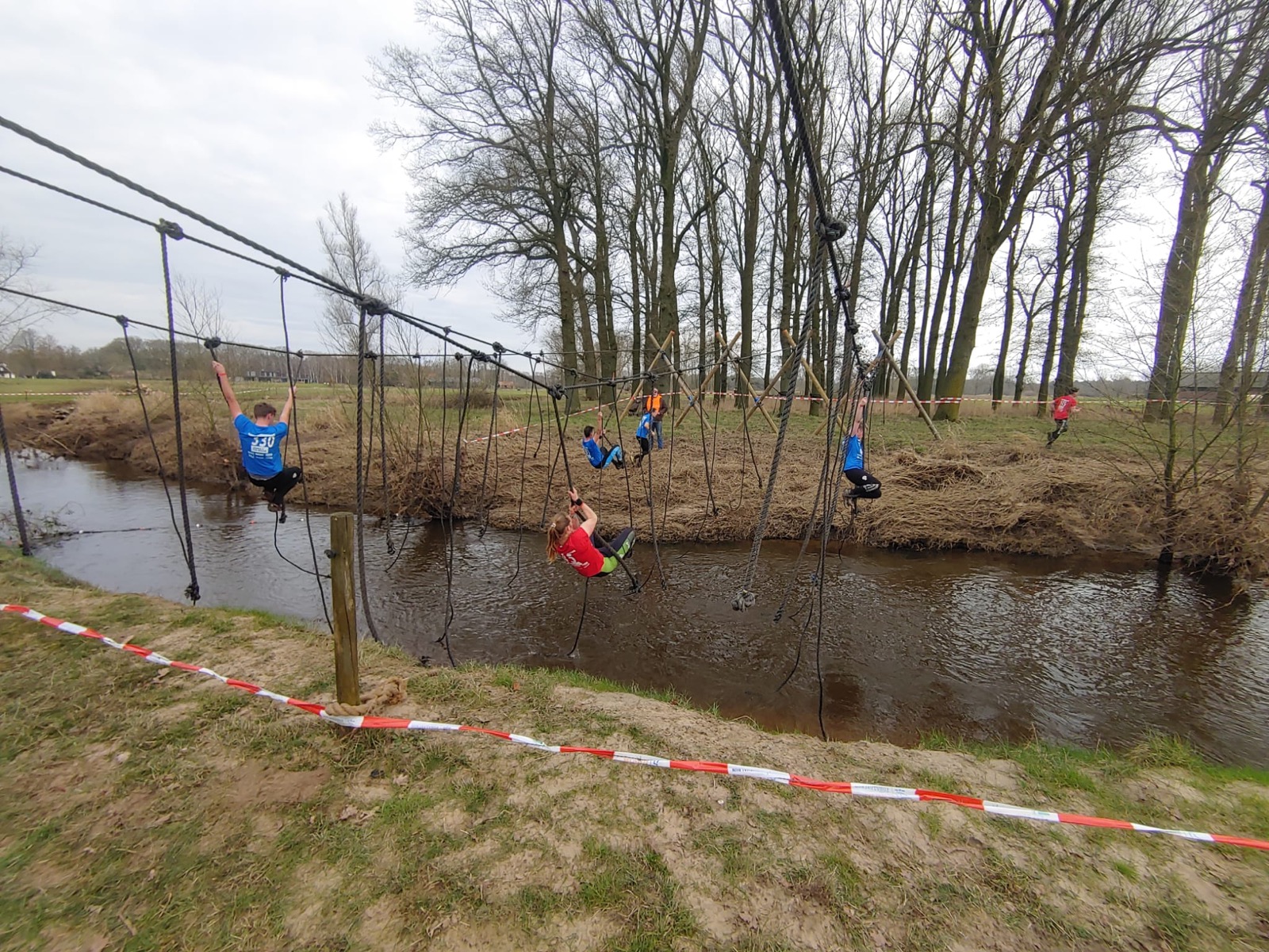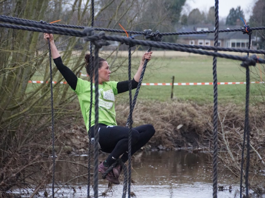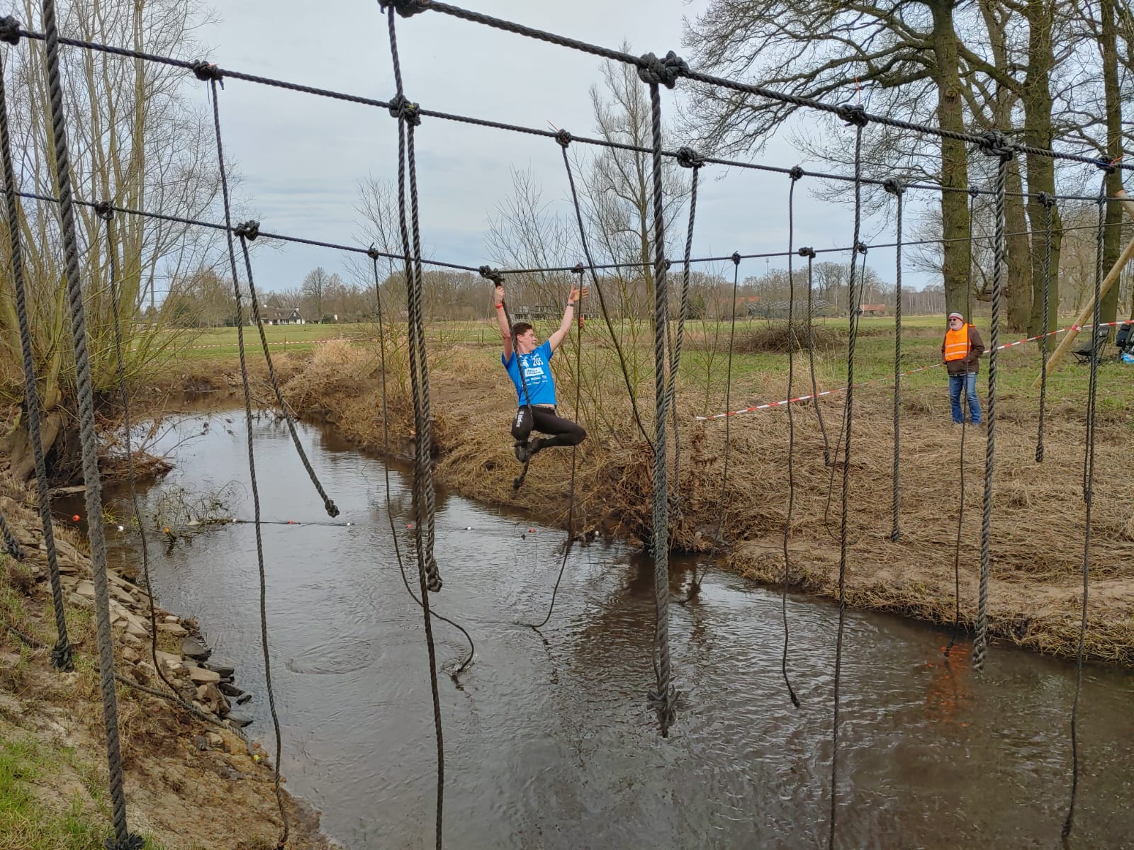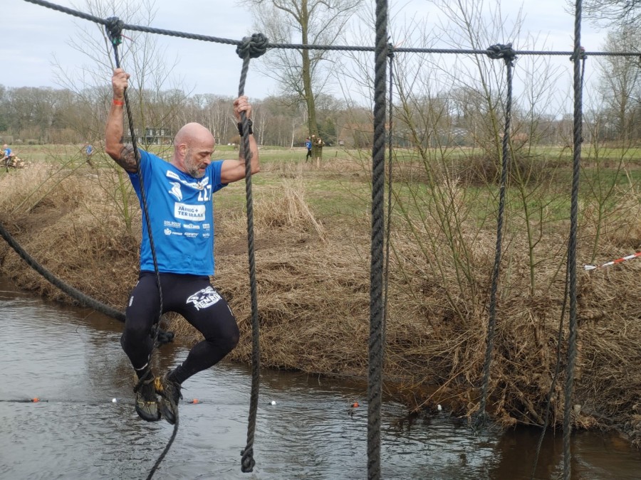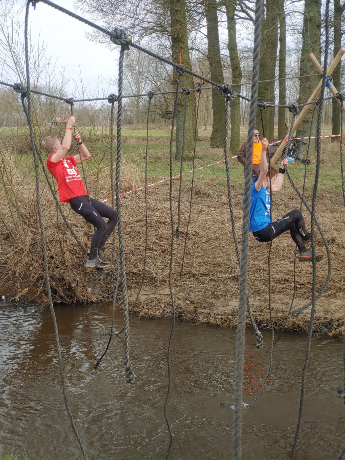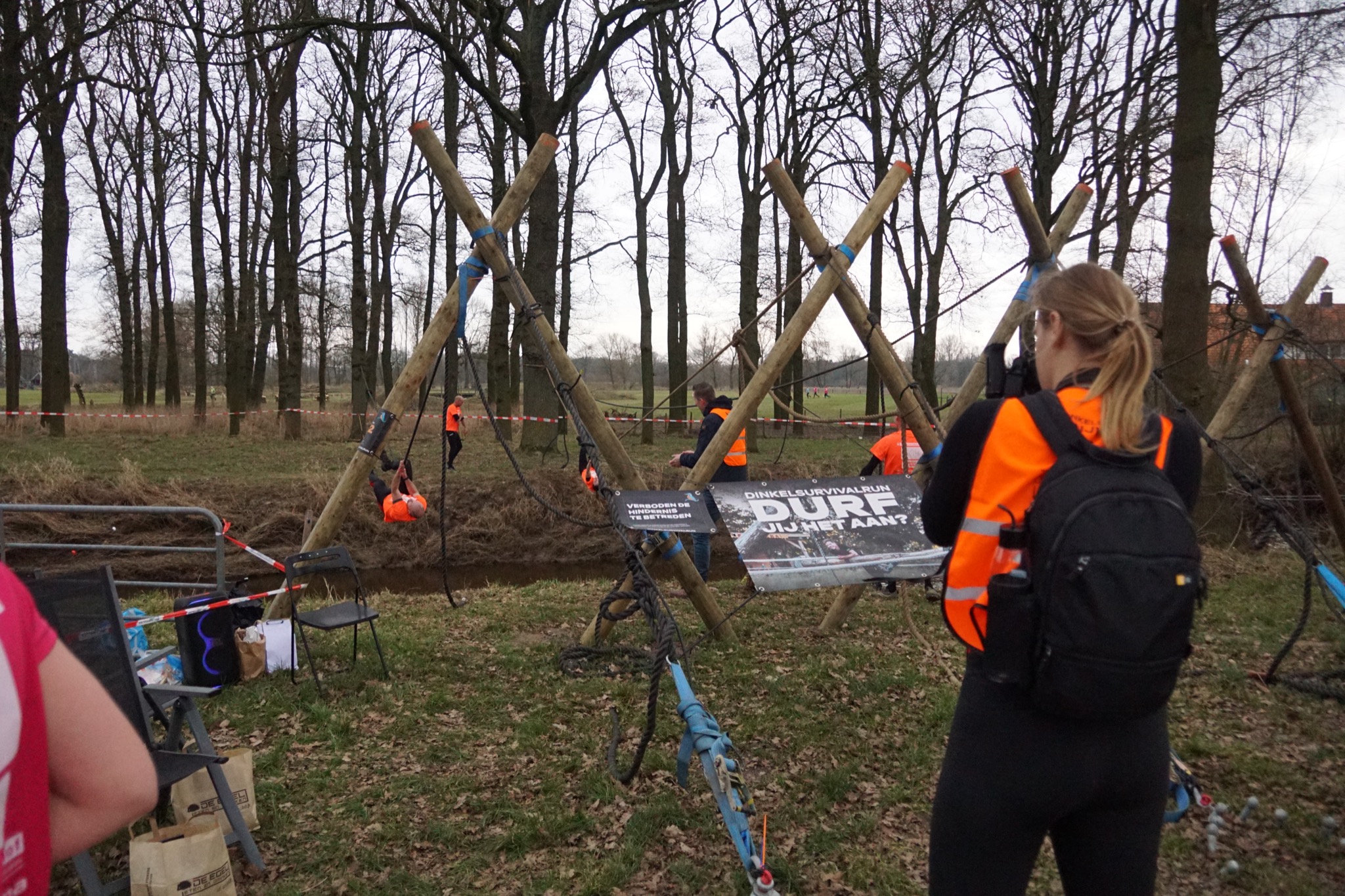 Deelnemers moeten via de lianen naar de overkant van de Dinkel klimmen. Hierbij mogen ze geen gebruik maken van het boventouw.