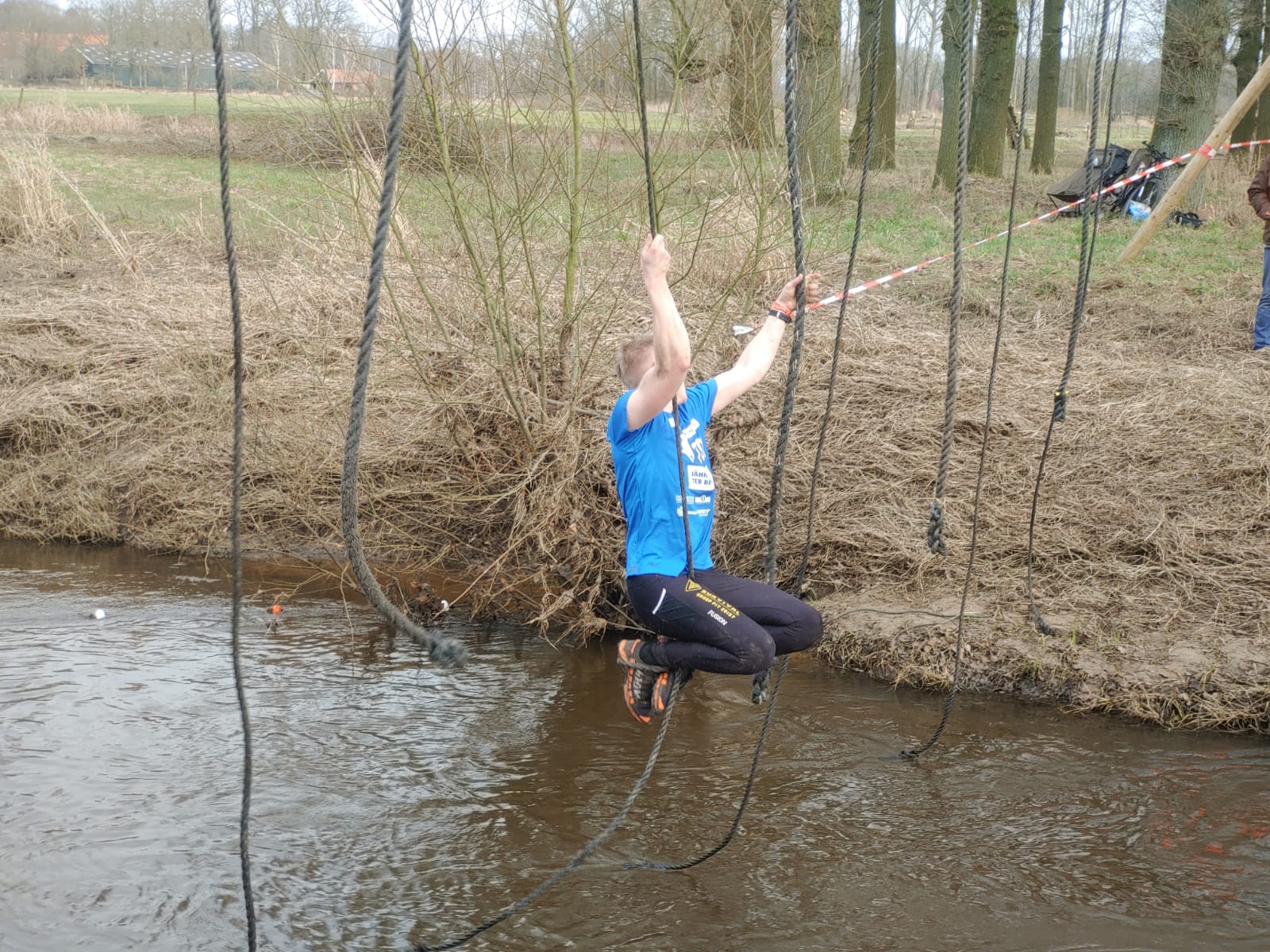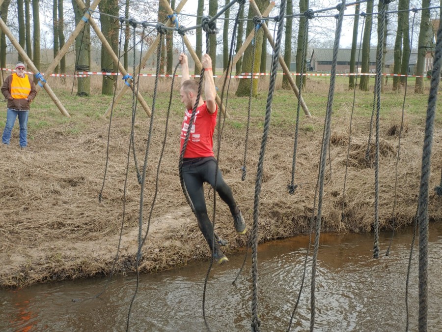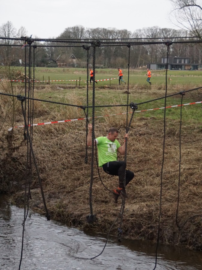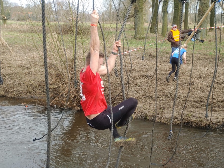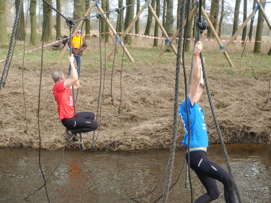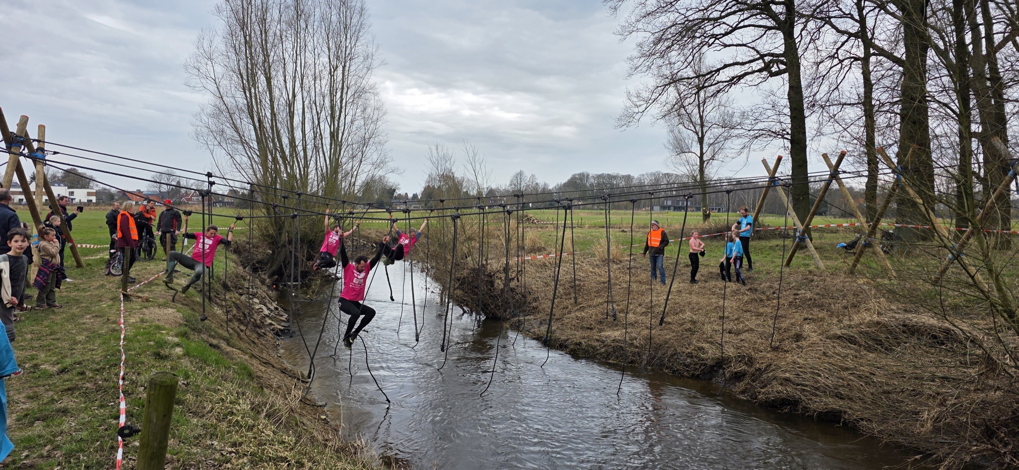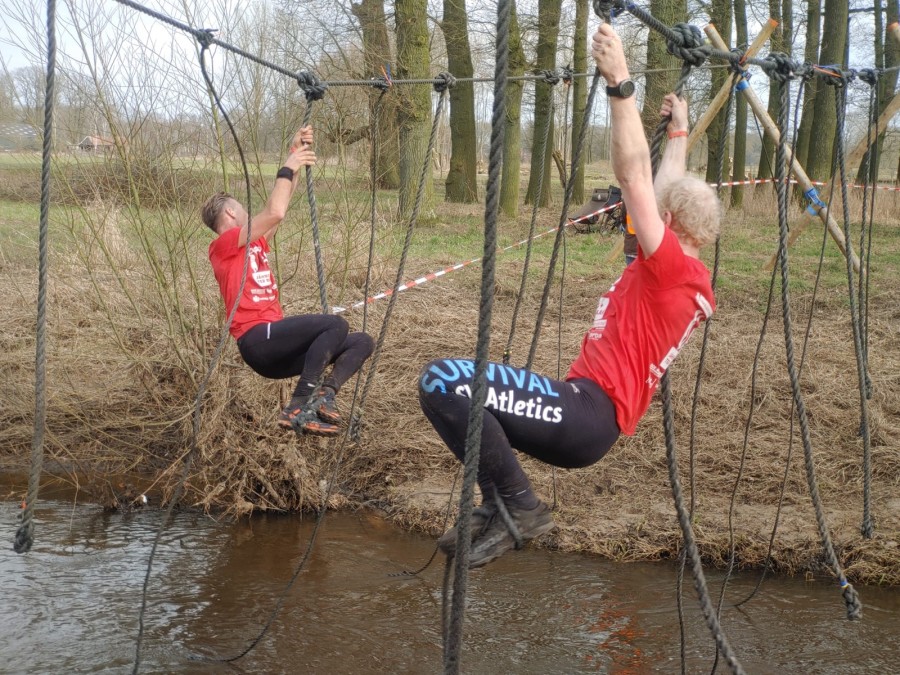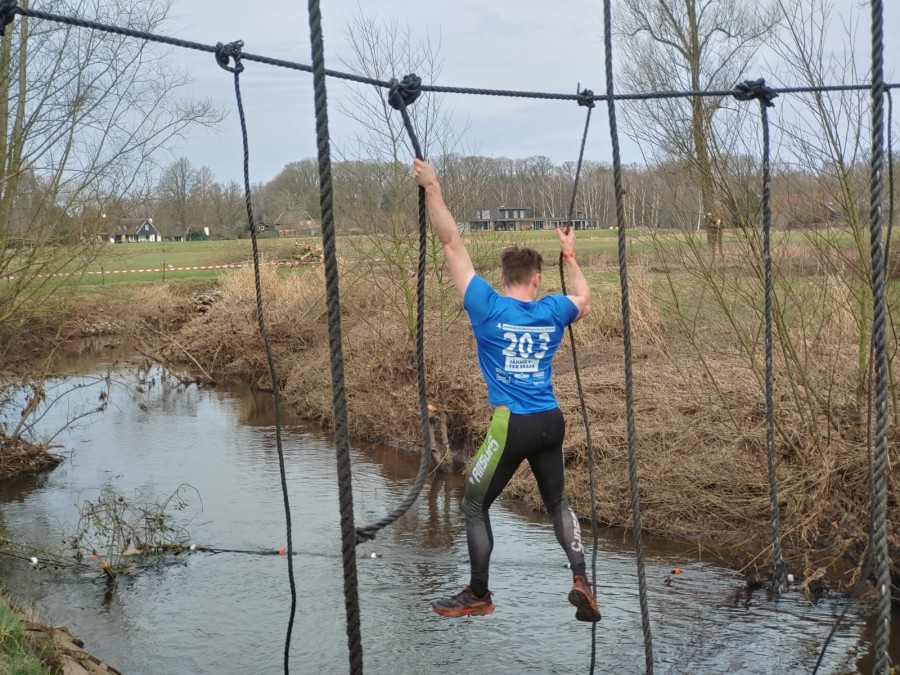 Deelnemers moeten via de lianen naar de overkant van de Dinkel klimmen. Hierbij mogen ze geen gebruik maken van het boventouw.
