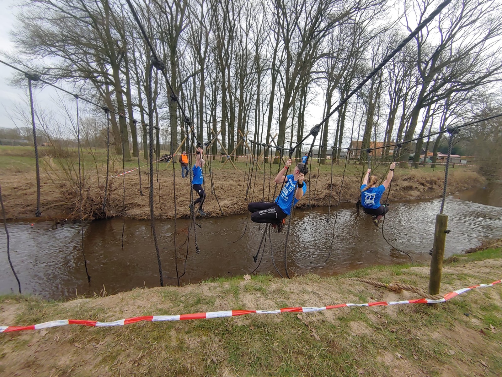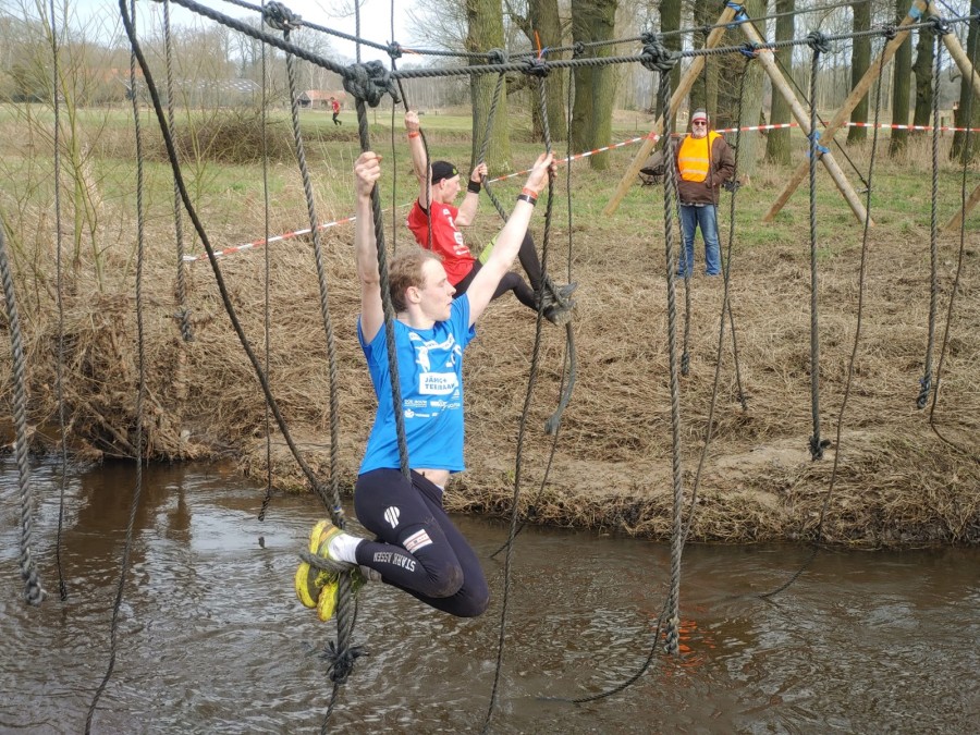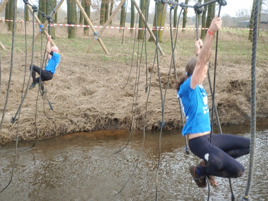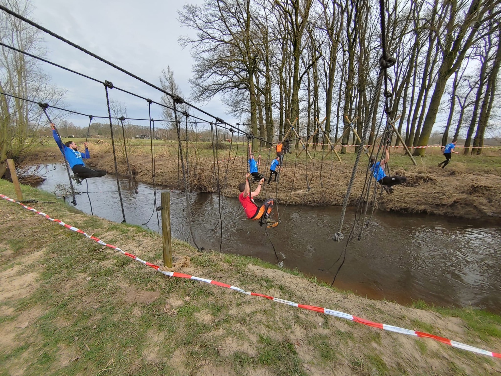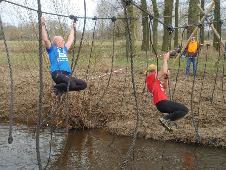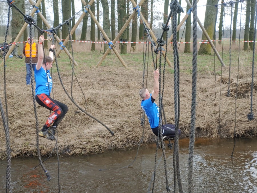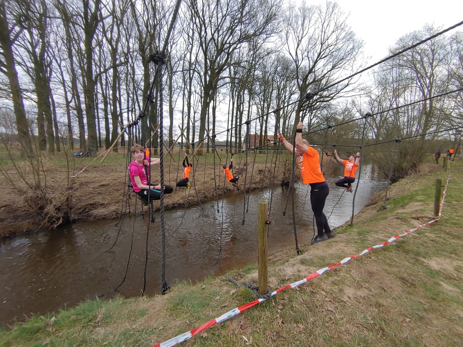 Deelnemers moeten via de lianen naar de overkant van de Dinkel klimmen. Hierbij mogen ze geen gebruik maken van het boventouw.