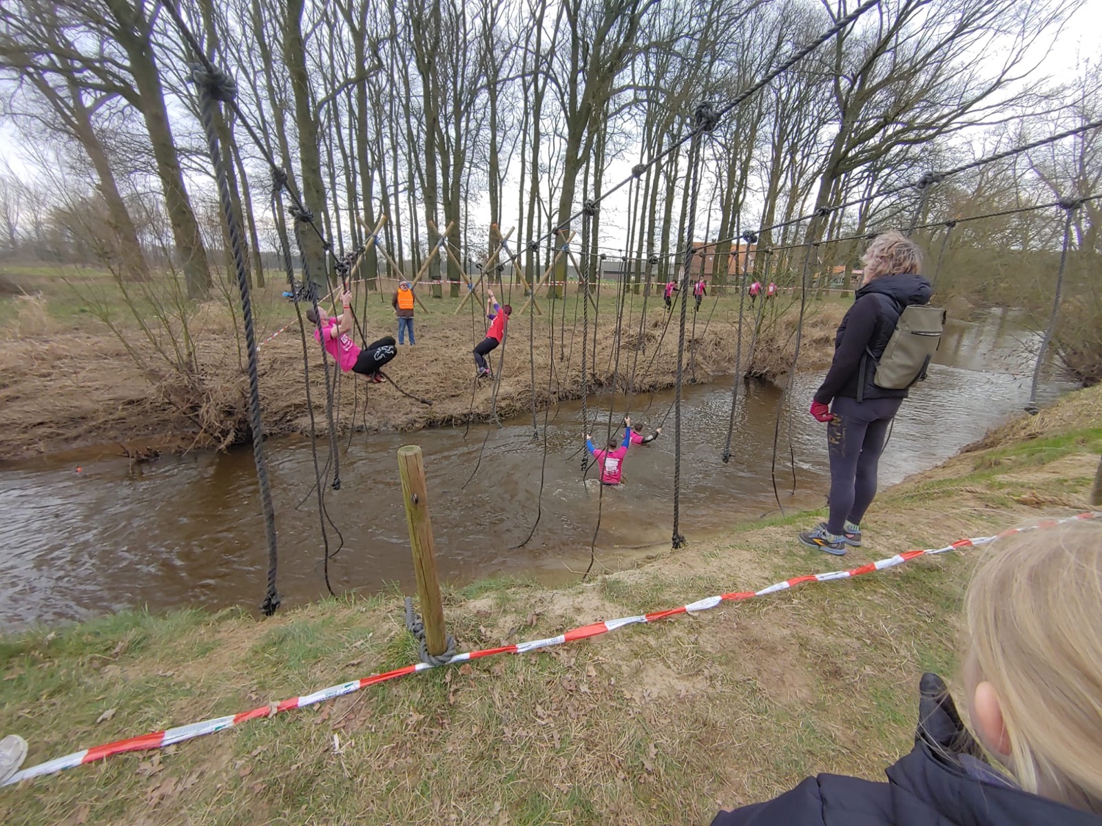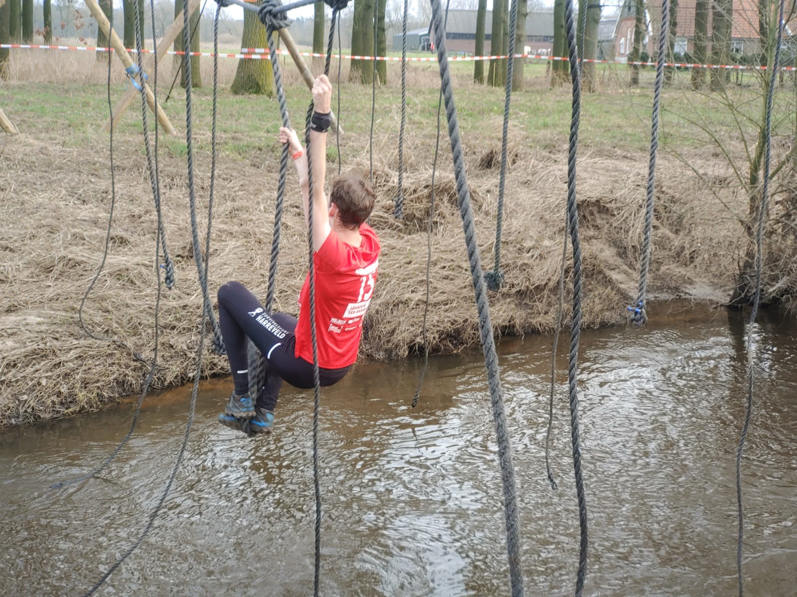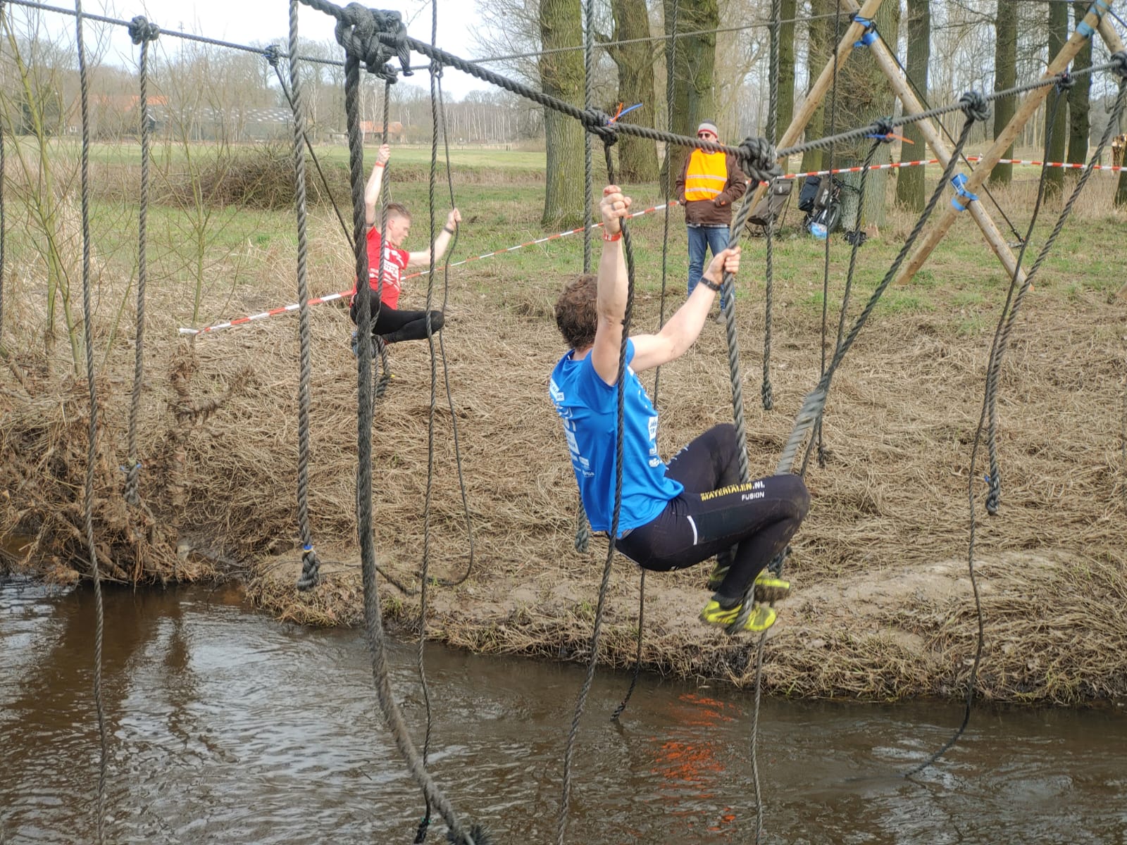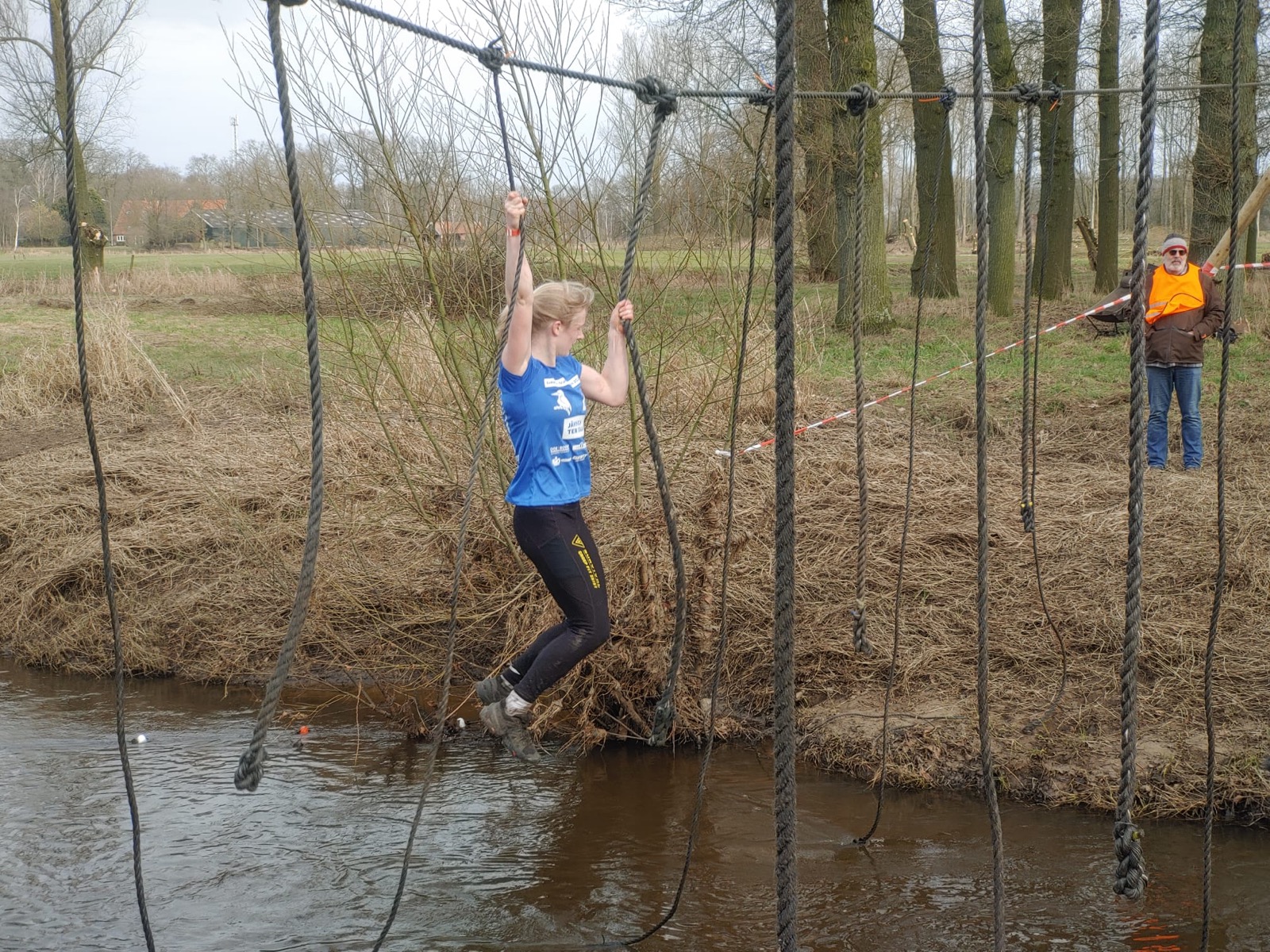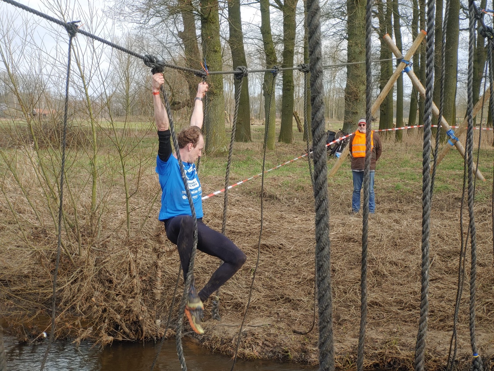 Deelnemers moeten via de lianen naar de overkant van de Dinkel klimmen. Hierbij mogen ze geen gebruik maken van het boventouw.