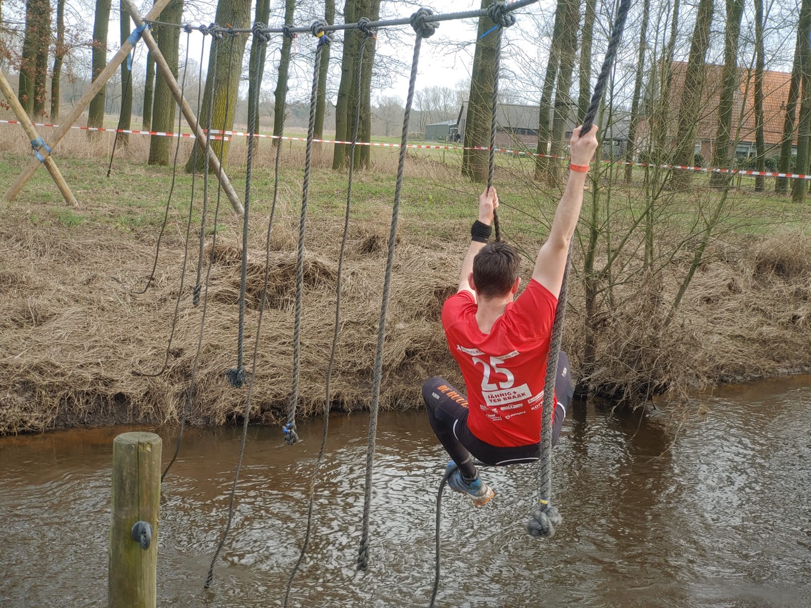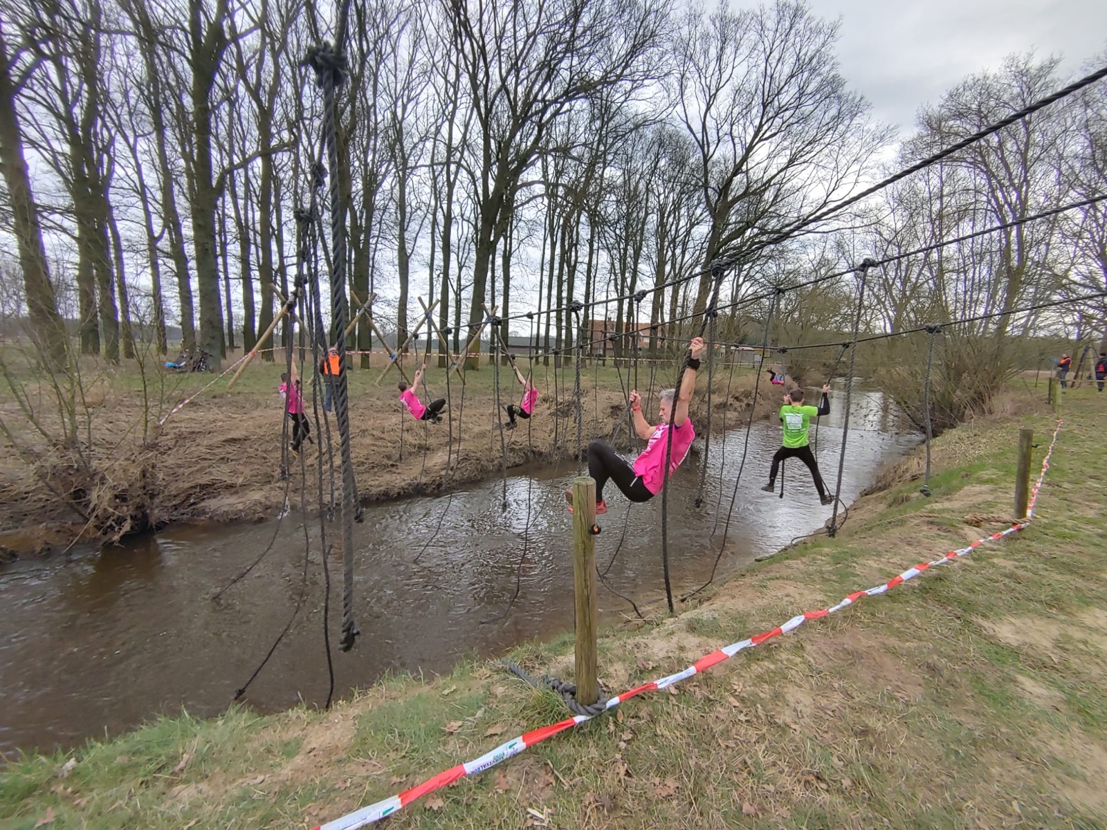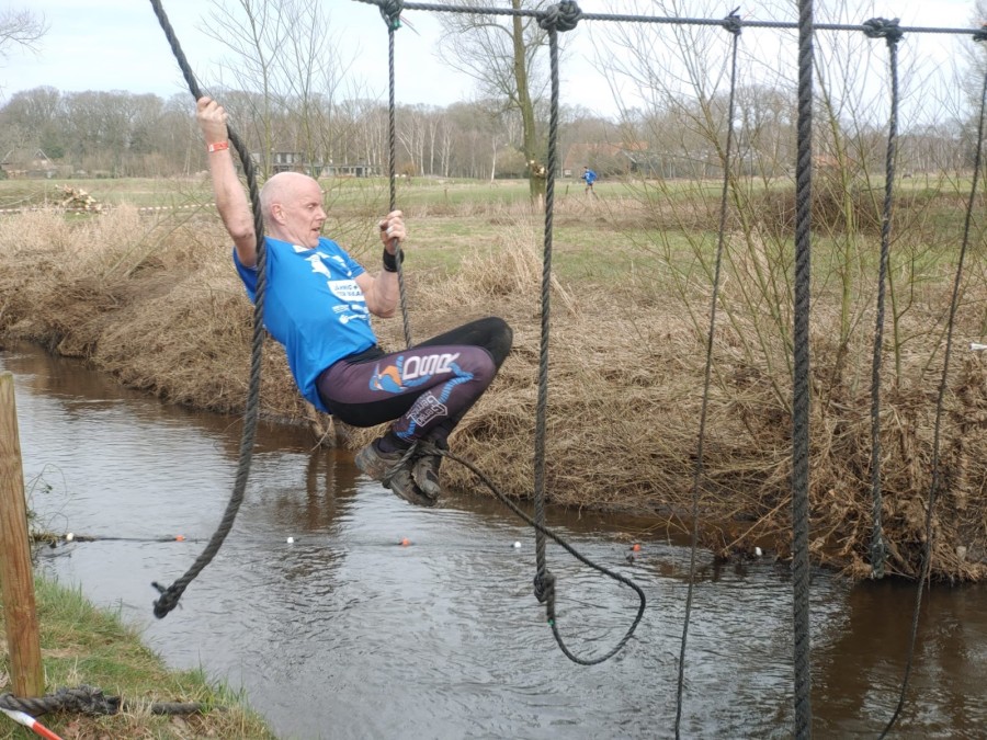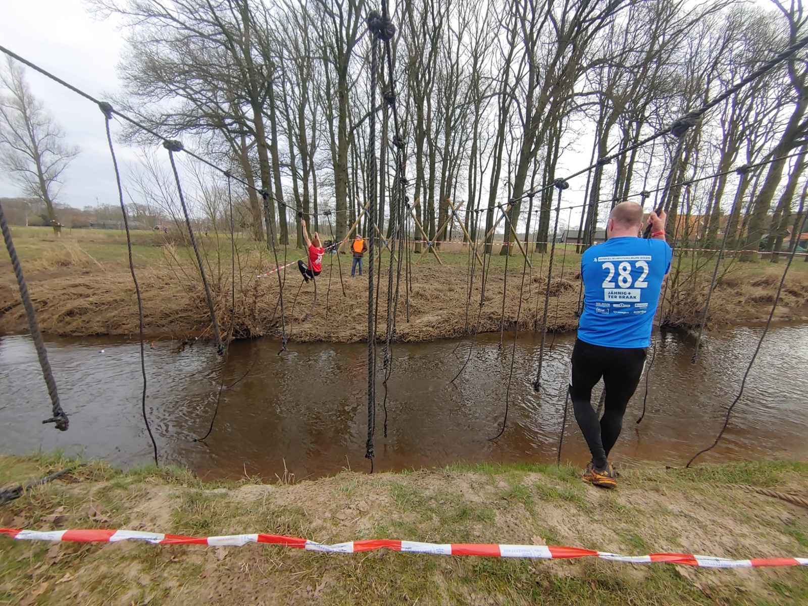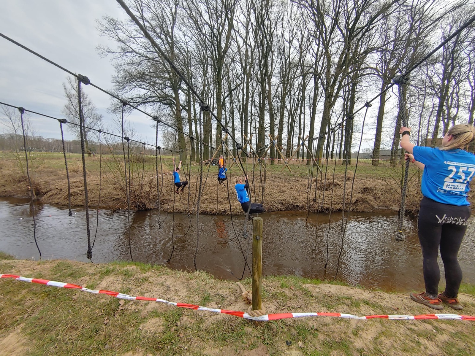 Deelnemers moeten via de lianen naar de overkant van de Dinkel klimmen. Hierbij mogen ze geen gebruik maken van het boventouw.
