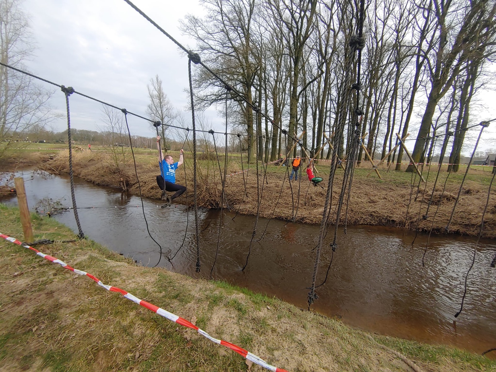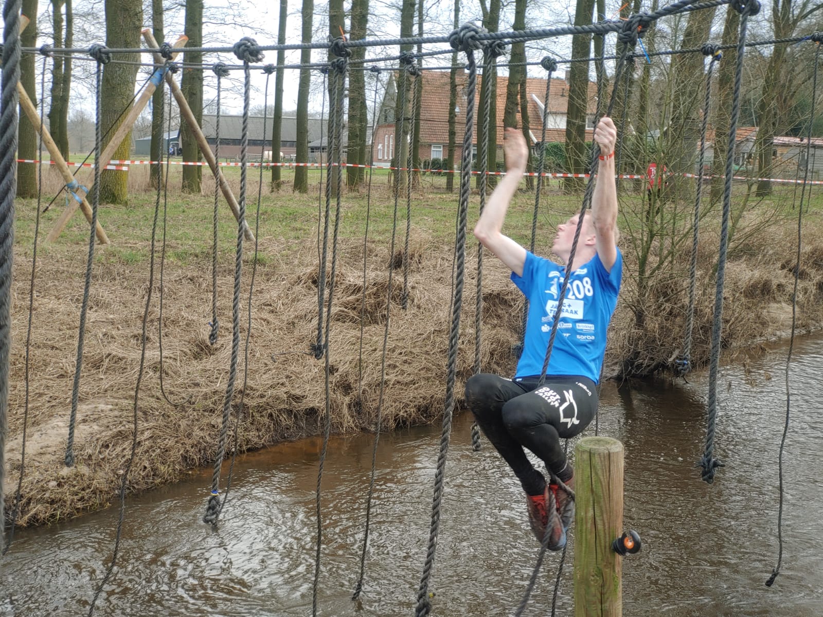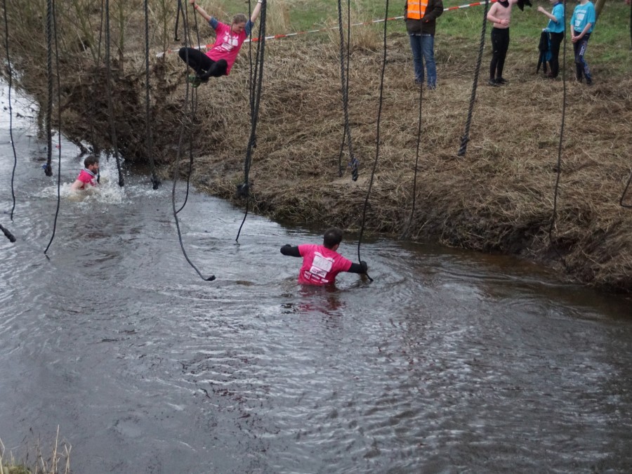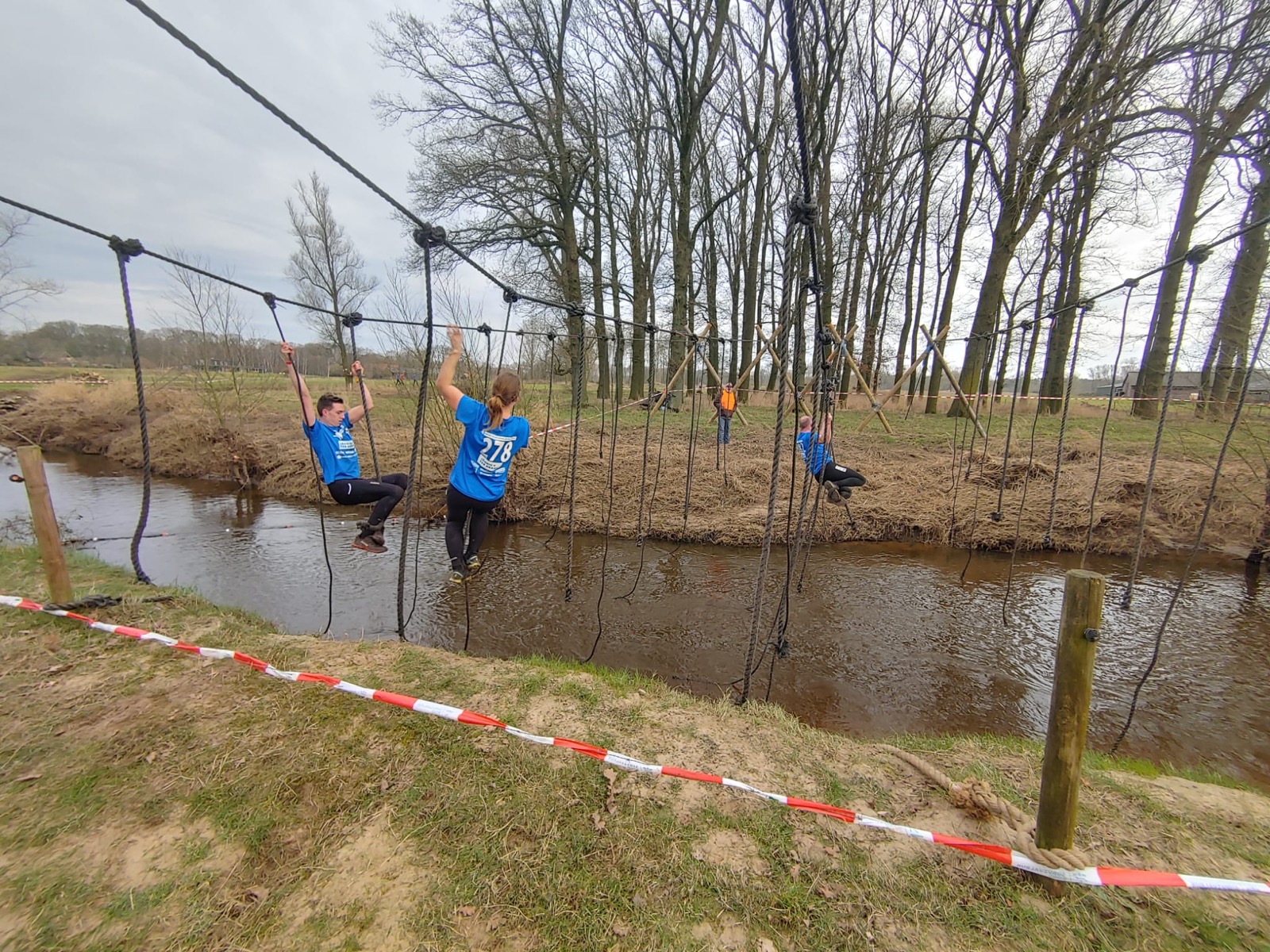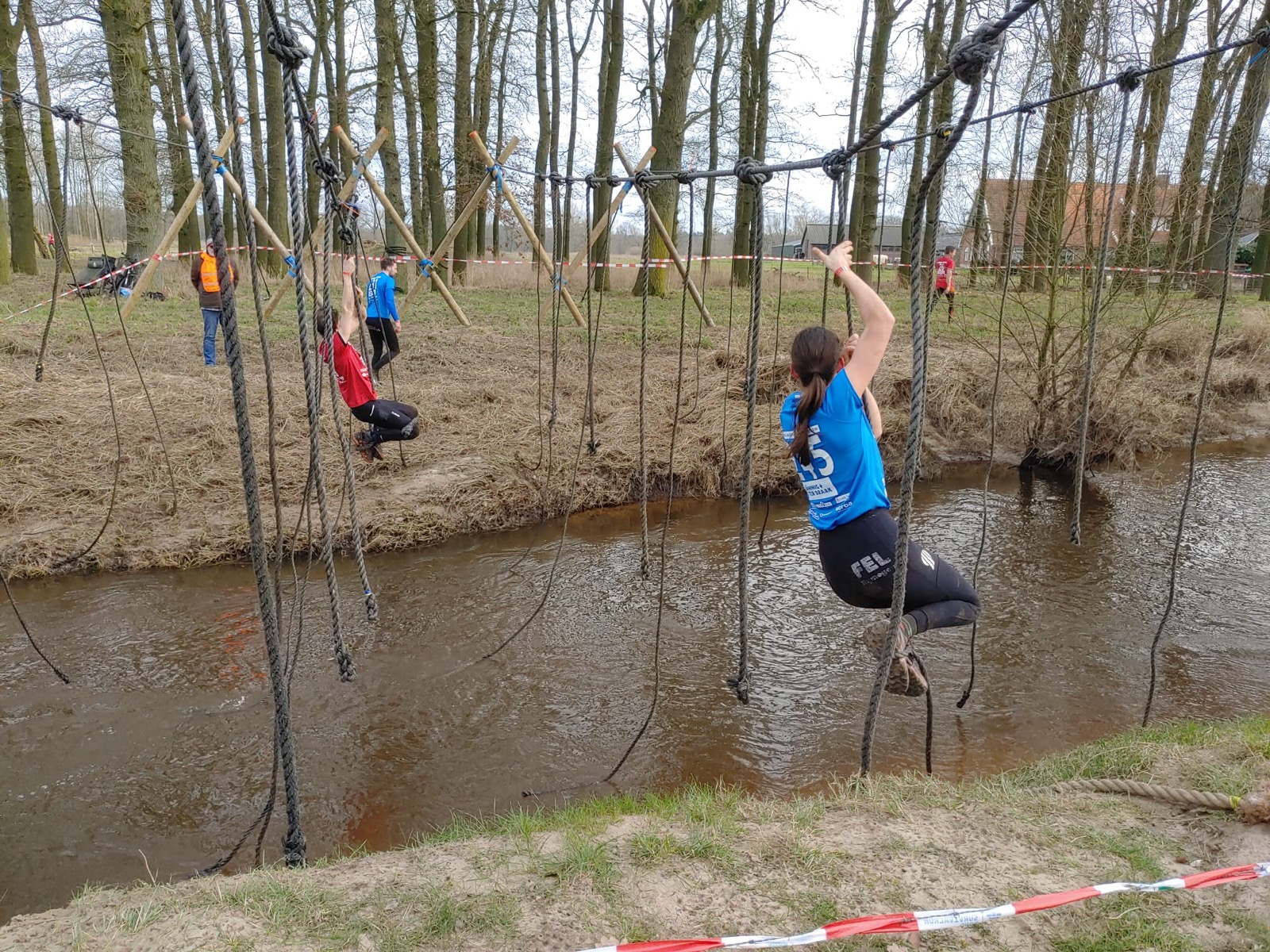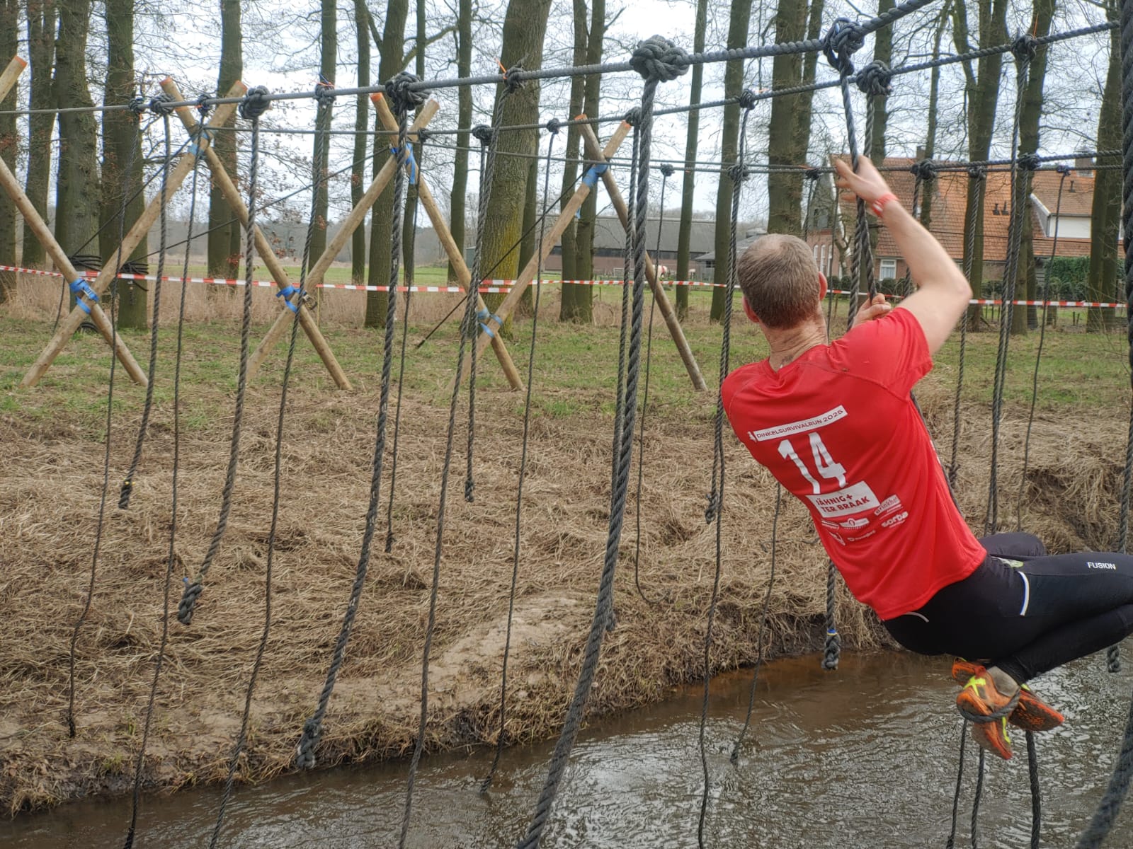 Deelnemers moeten via de lianen naar de overkant van de Dinkel klimmen. Hierbij mogen ze geen gebruik maken van het boventouw.