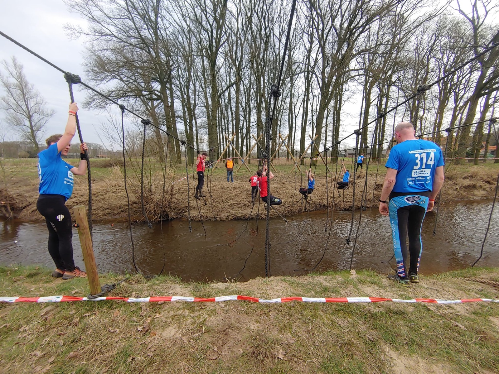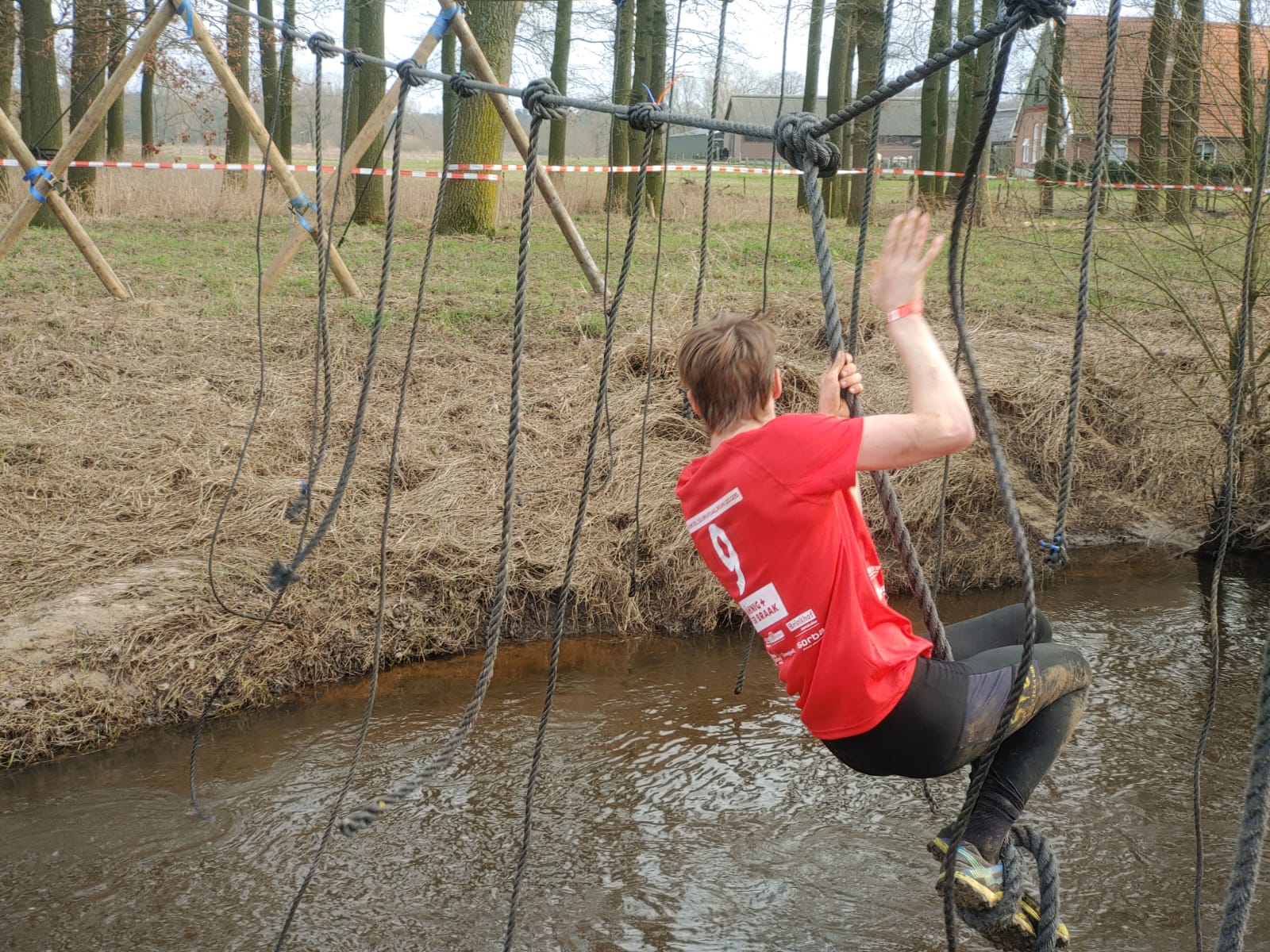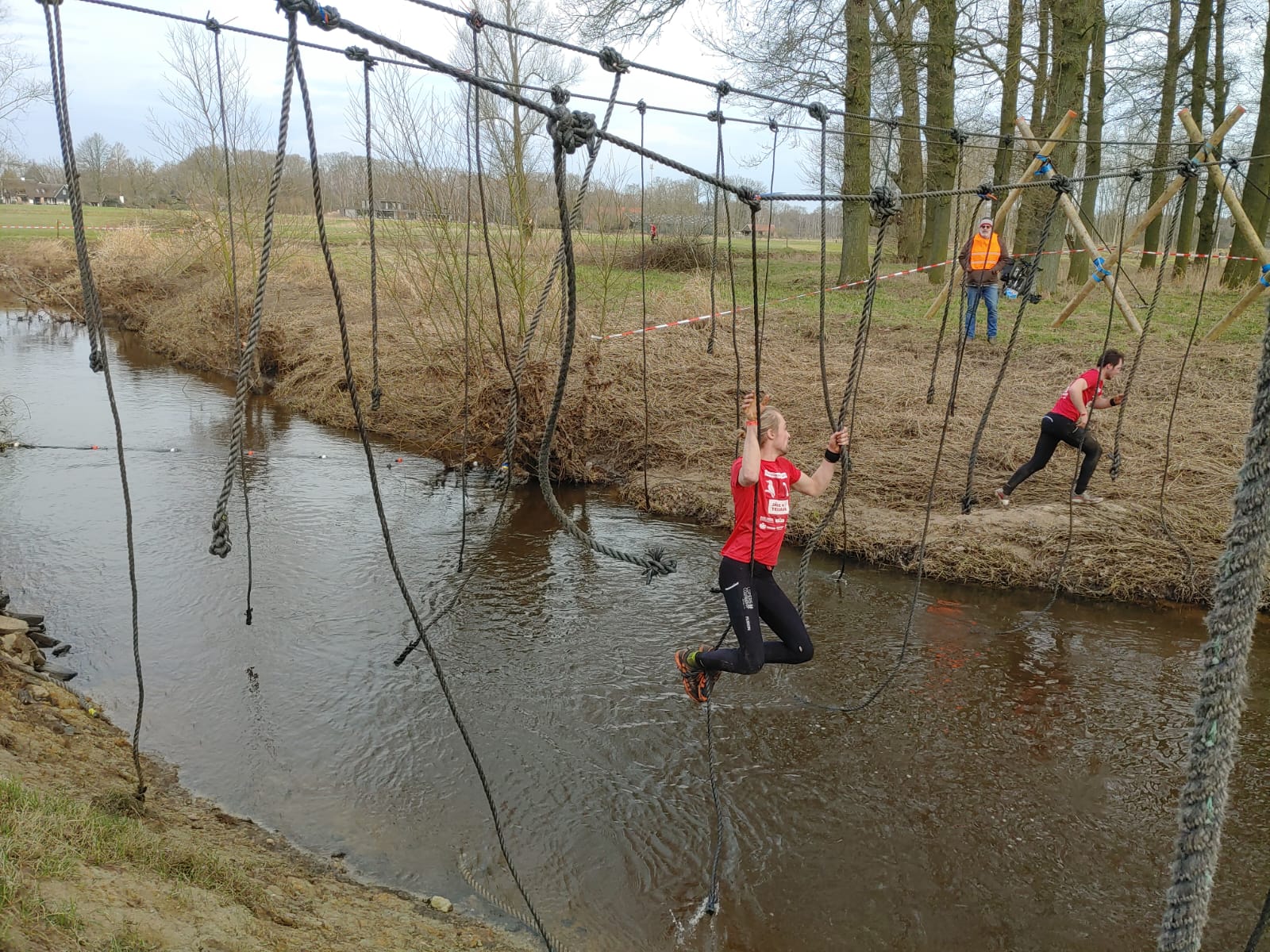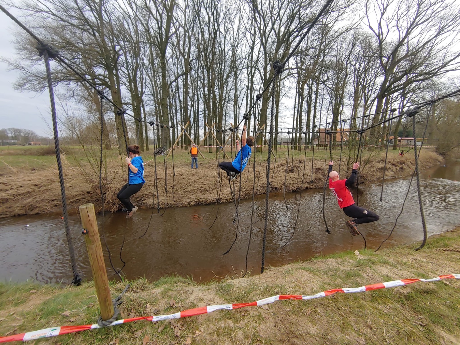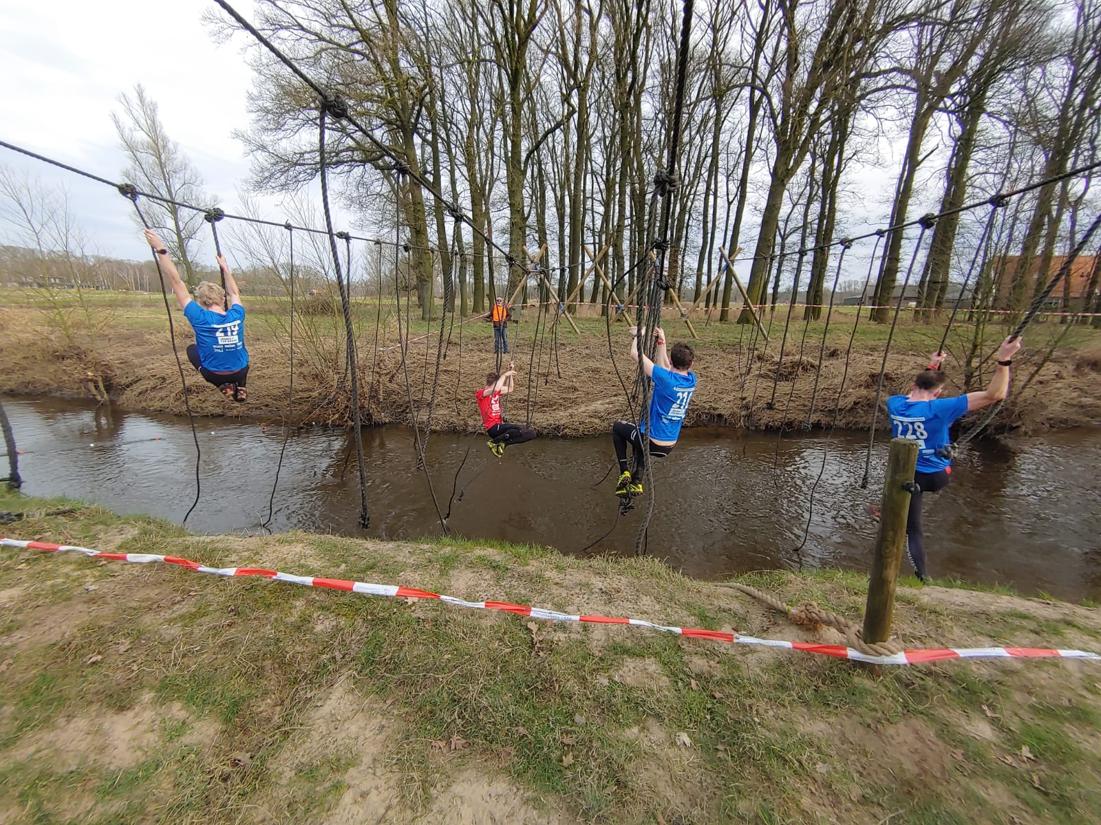 Deelnemers moeten via de lianen naar de overkant van de Dinkel klimmen. Hierbij mogen ze geen gebruik maken van het boventouw.
