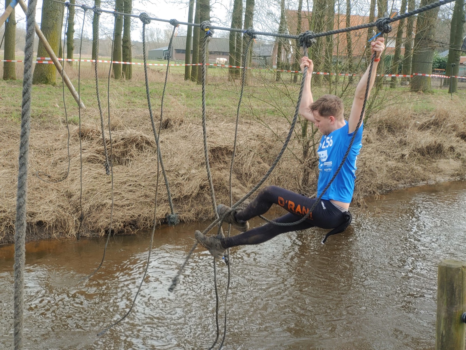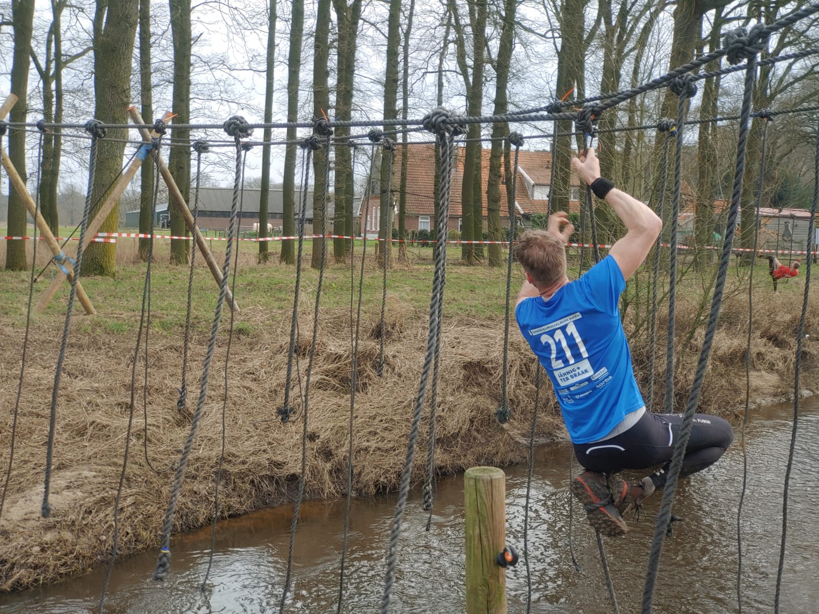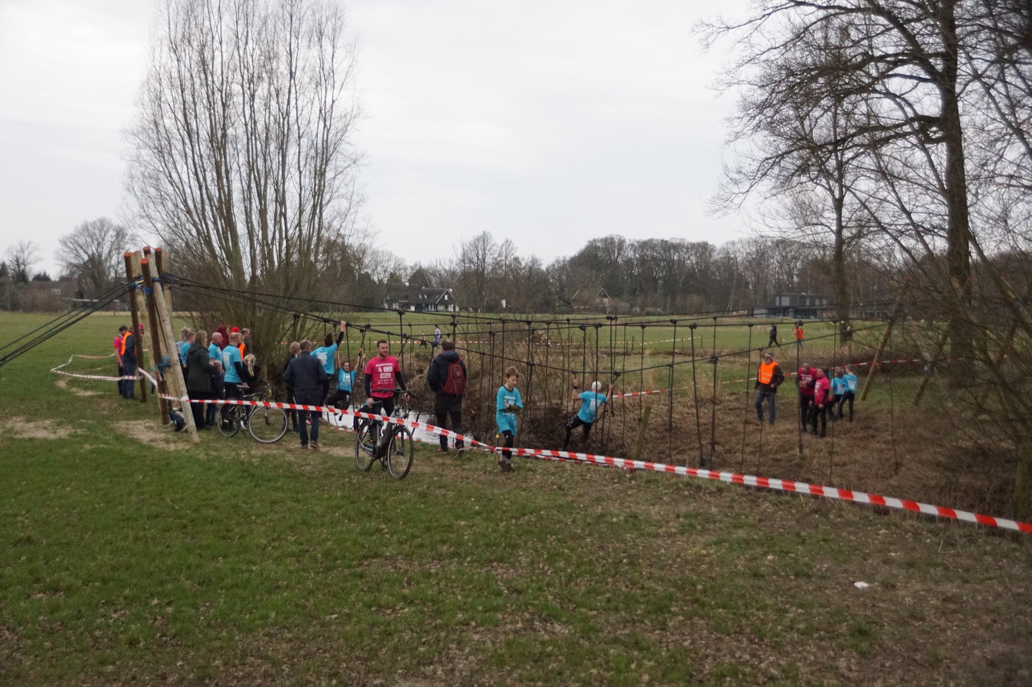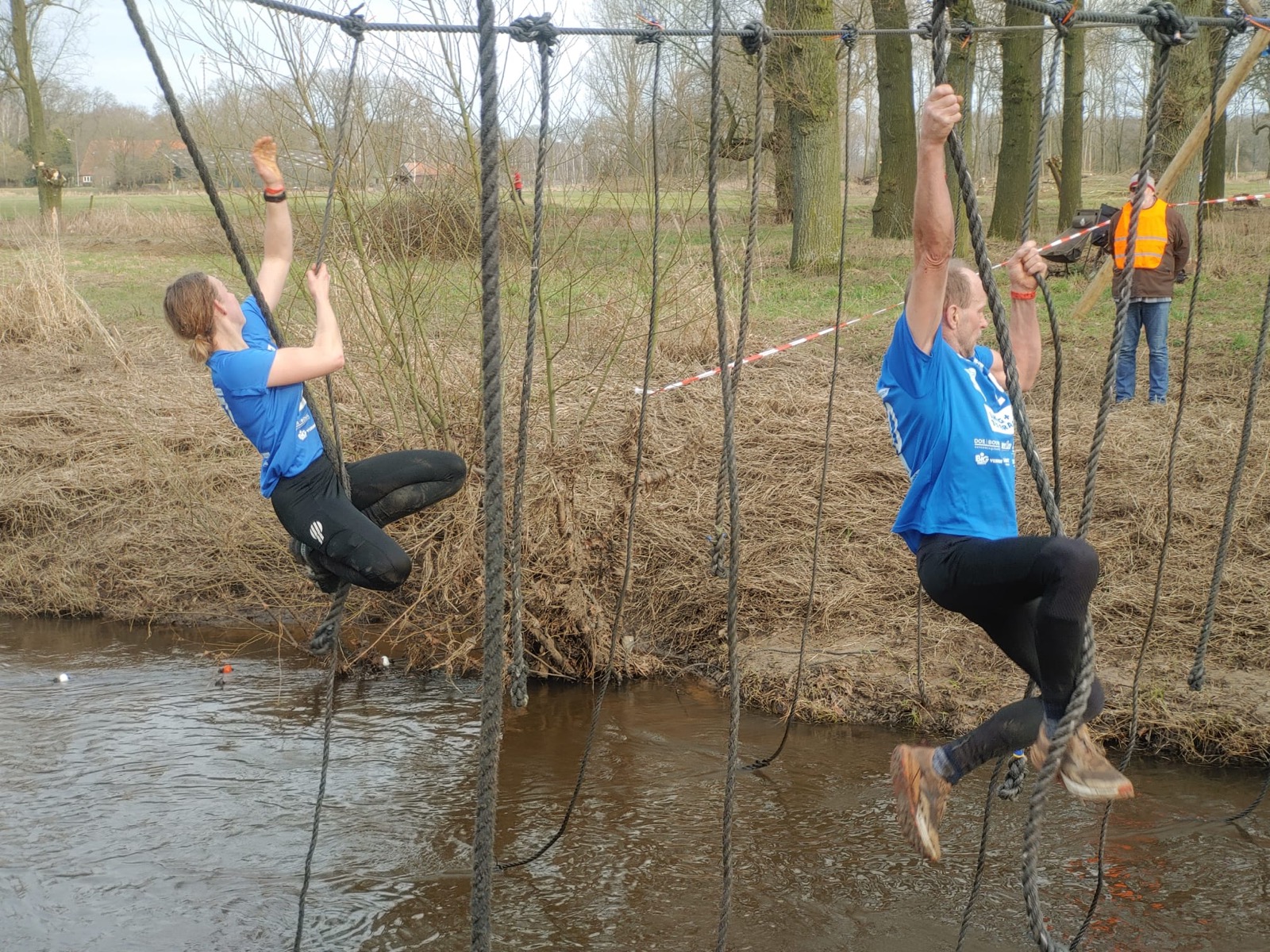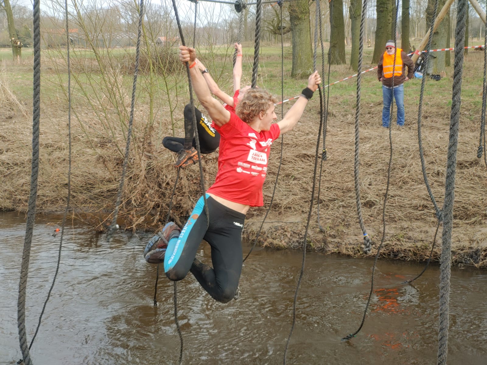 Deelnemers moeten via de lianen naar de overkant van de Dinkel klimmen. Hierbij mogen ze geen gebruik maken van het boventouw.
