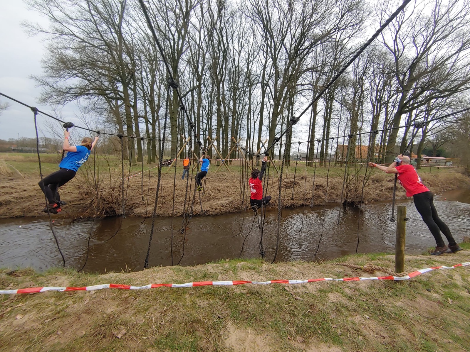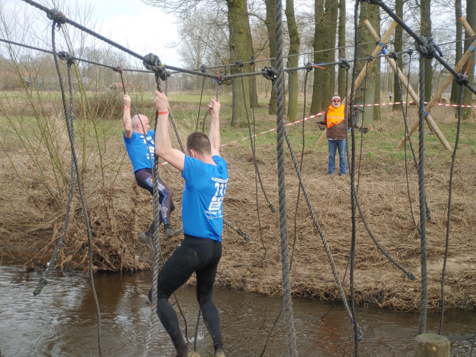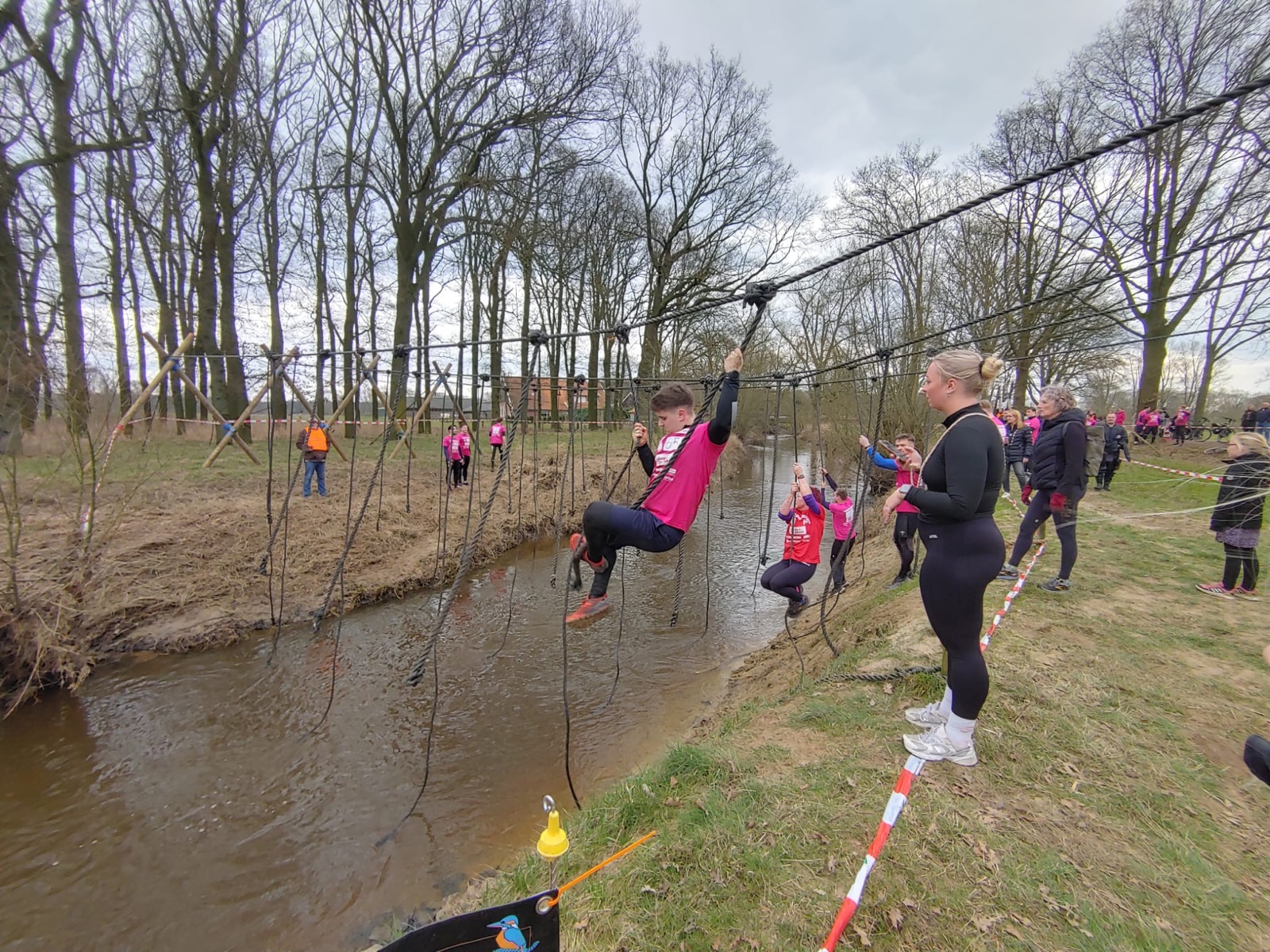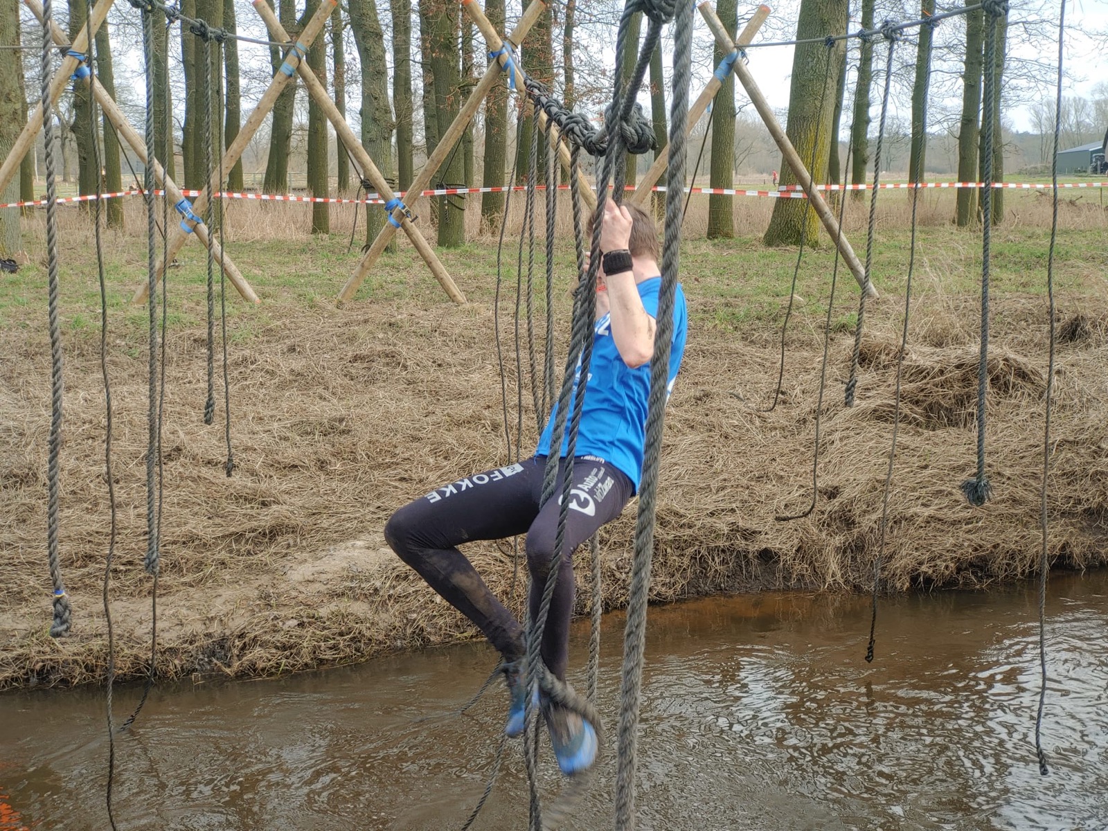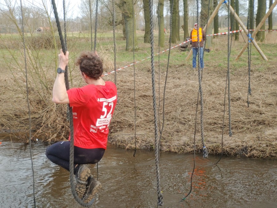 Deelnemers moeten via de lianen naar de overkant van de Dinkel klimmen. Hierbij mogen ze geen gebruik maken van het boventouw.