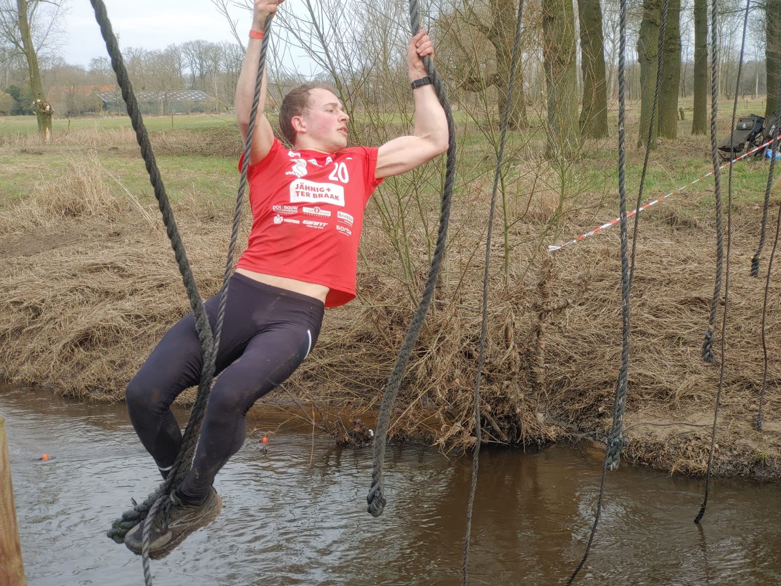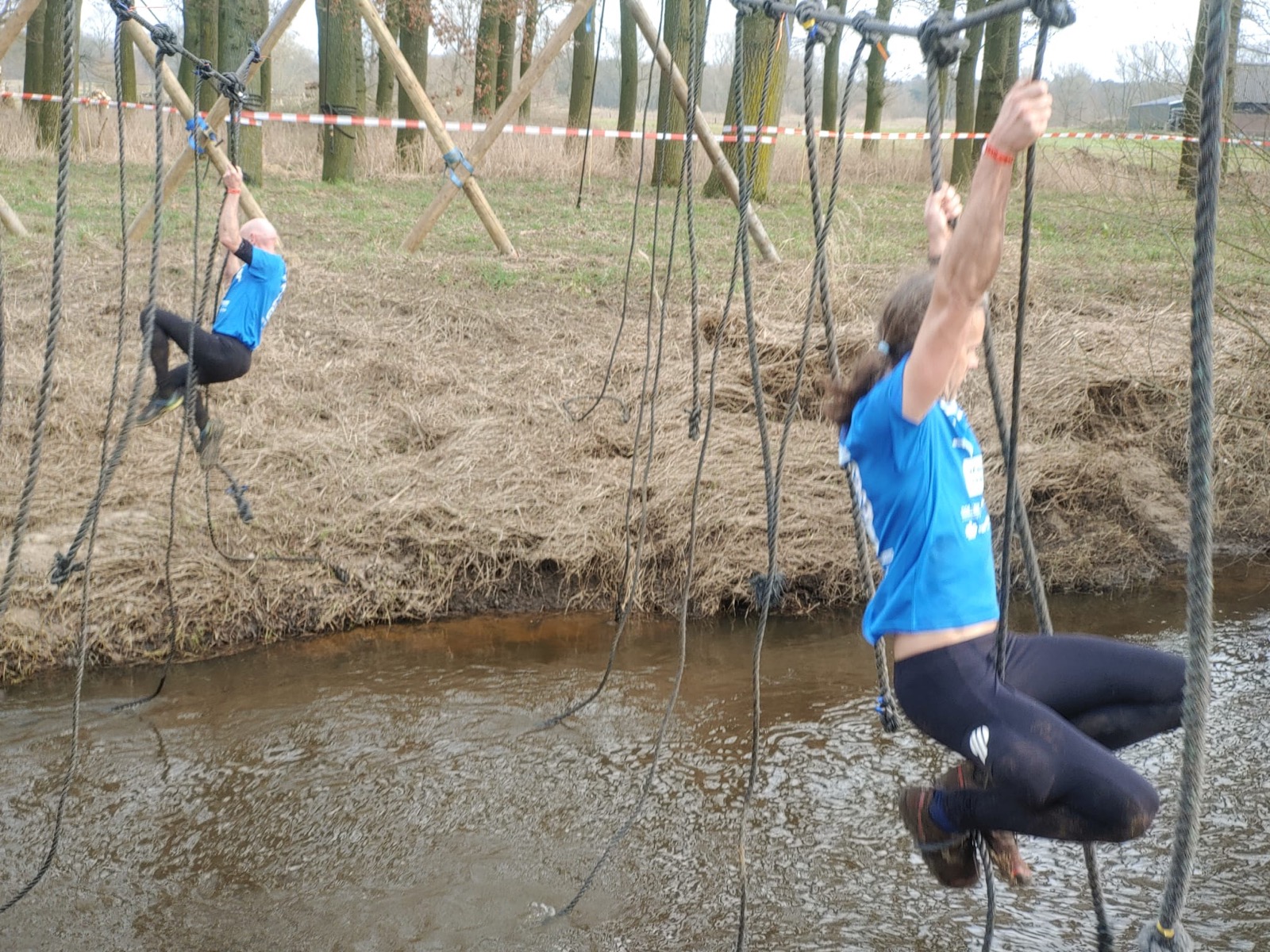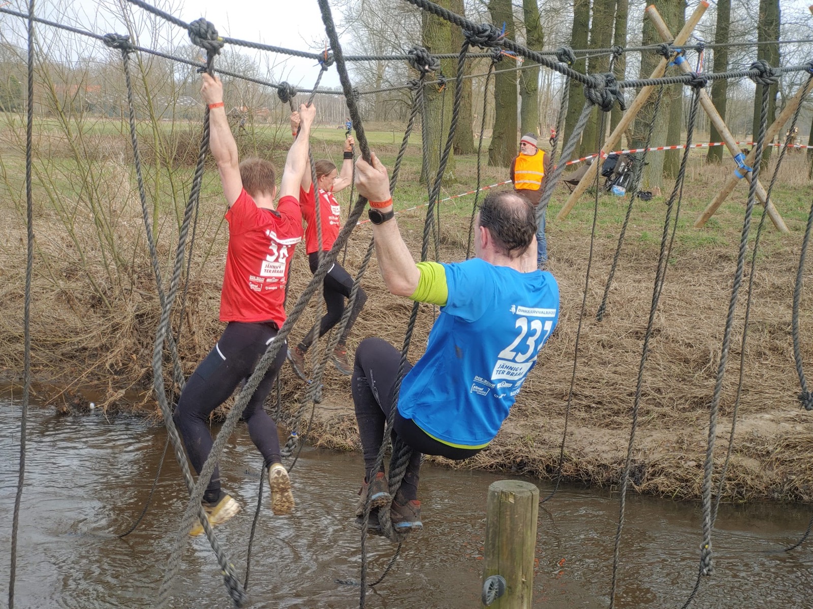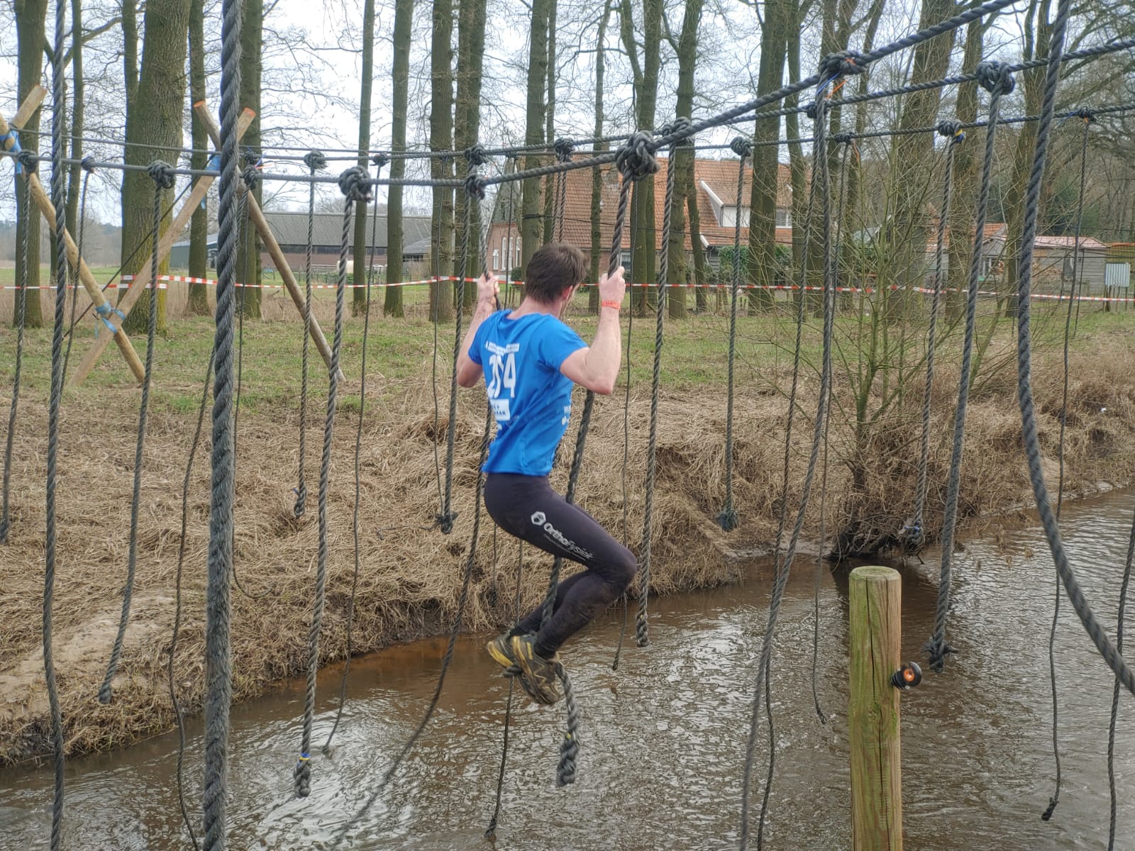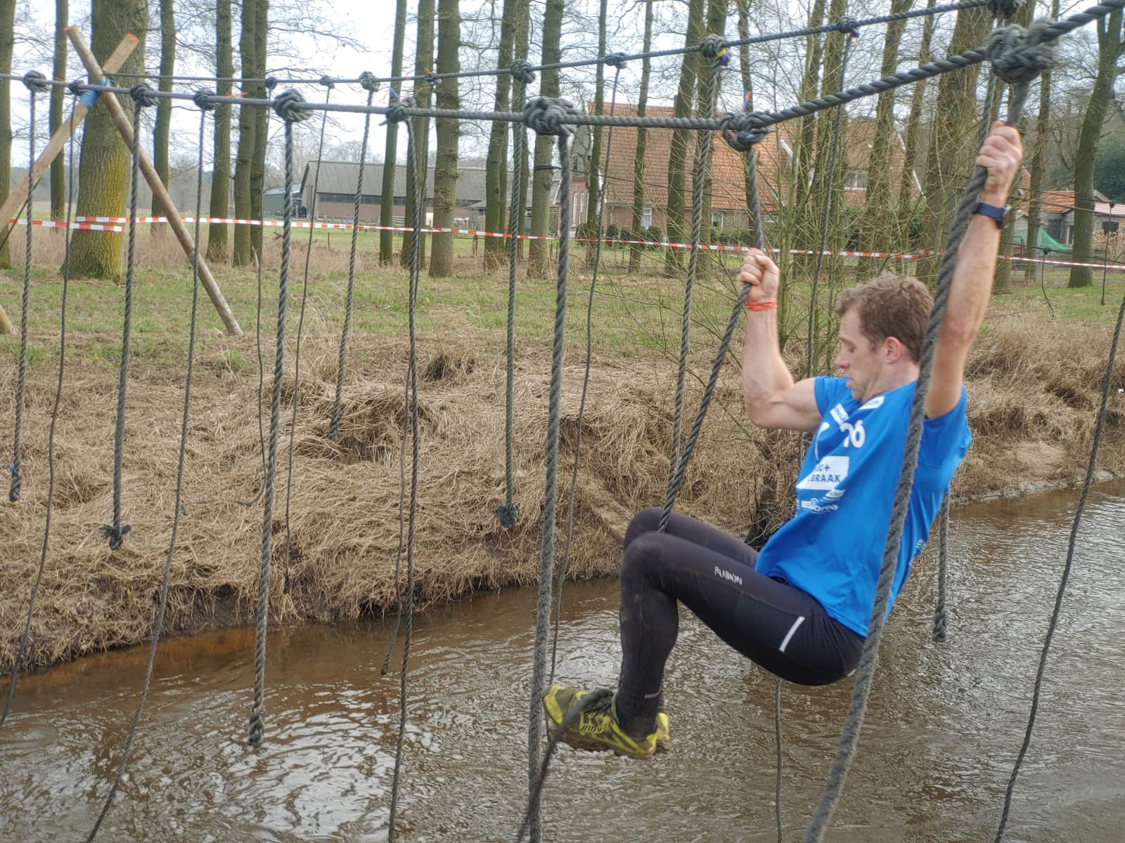 Deelnemers moeten via de lianen naar de overkant van de Dinkel klimmen. Hierbij mogen ze geen gebruik maken van het boventouw.