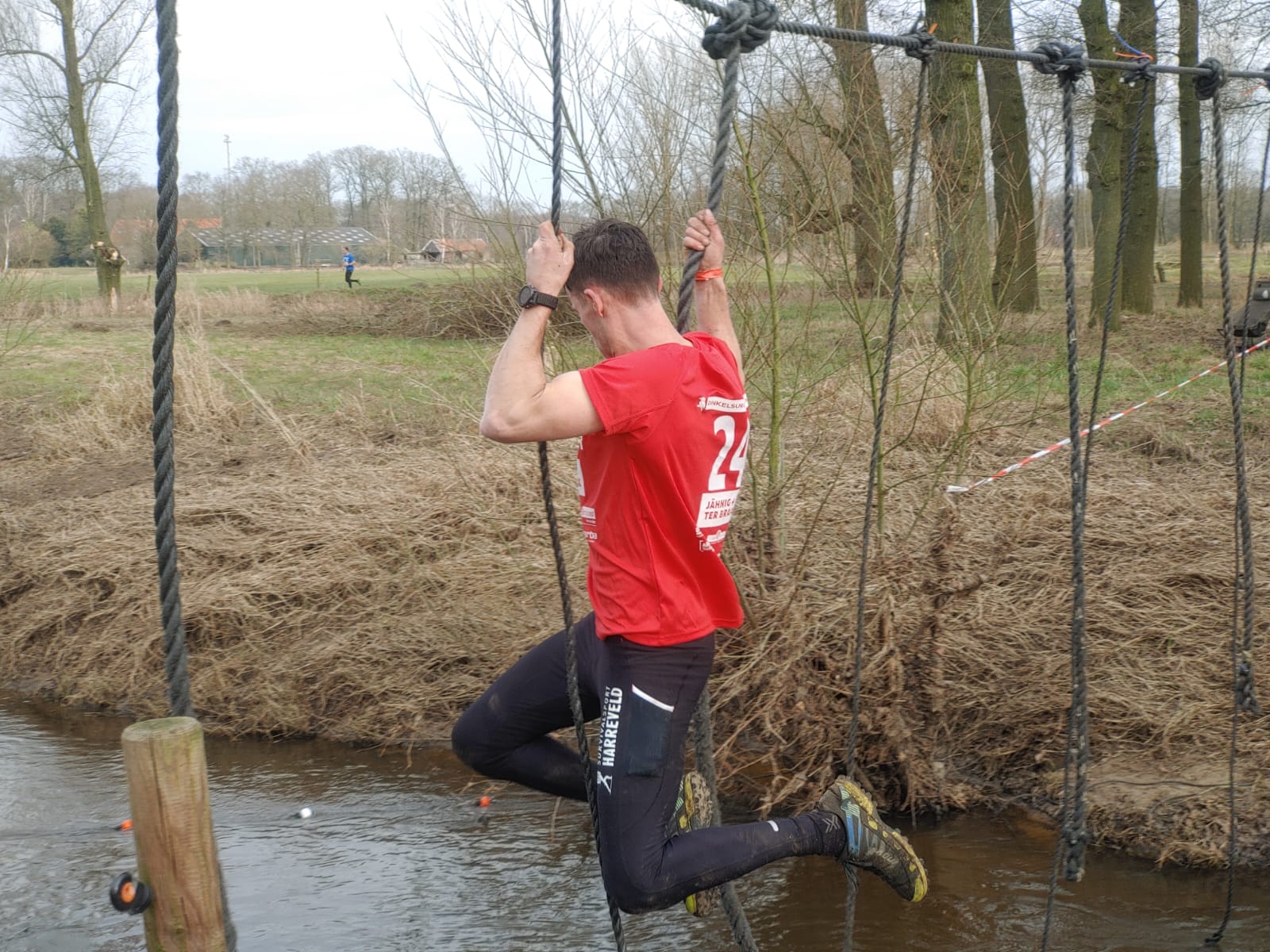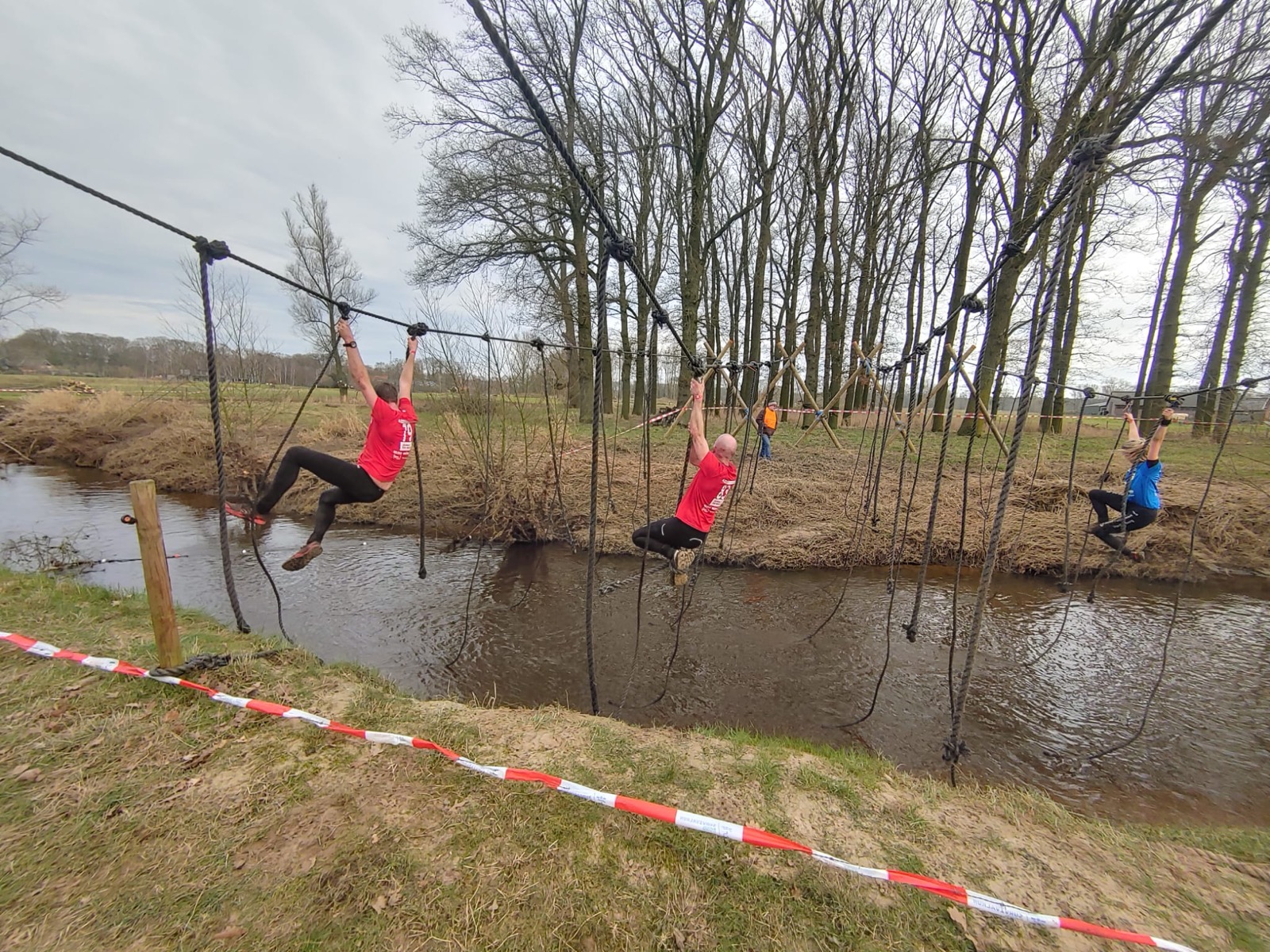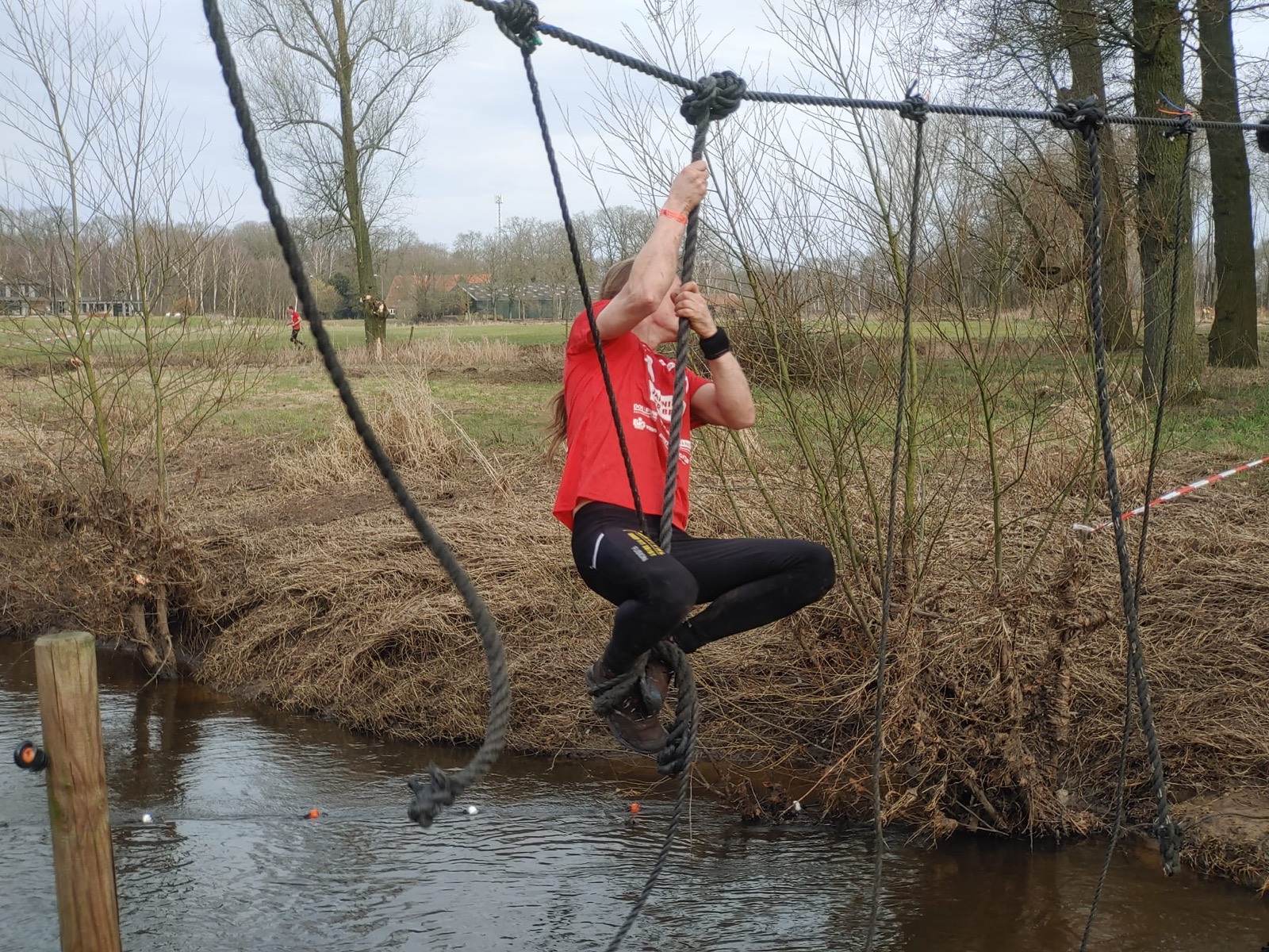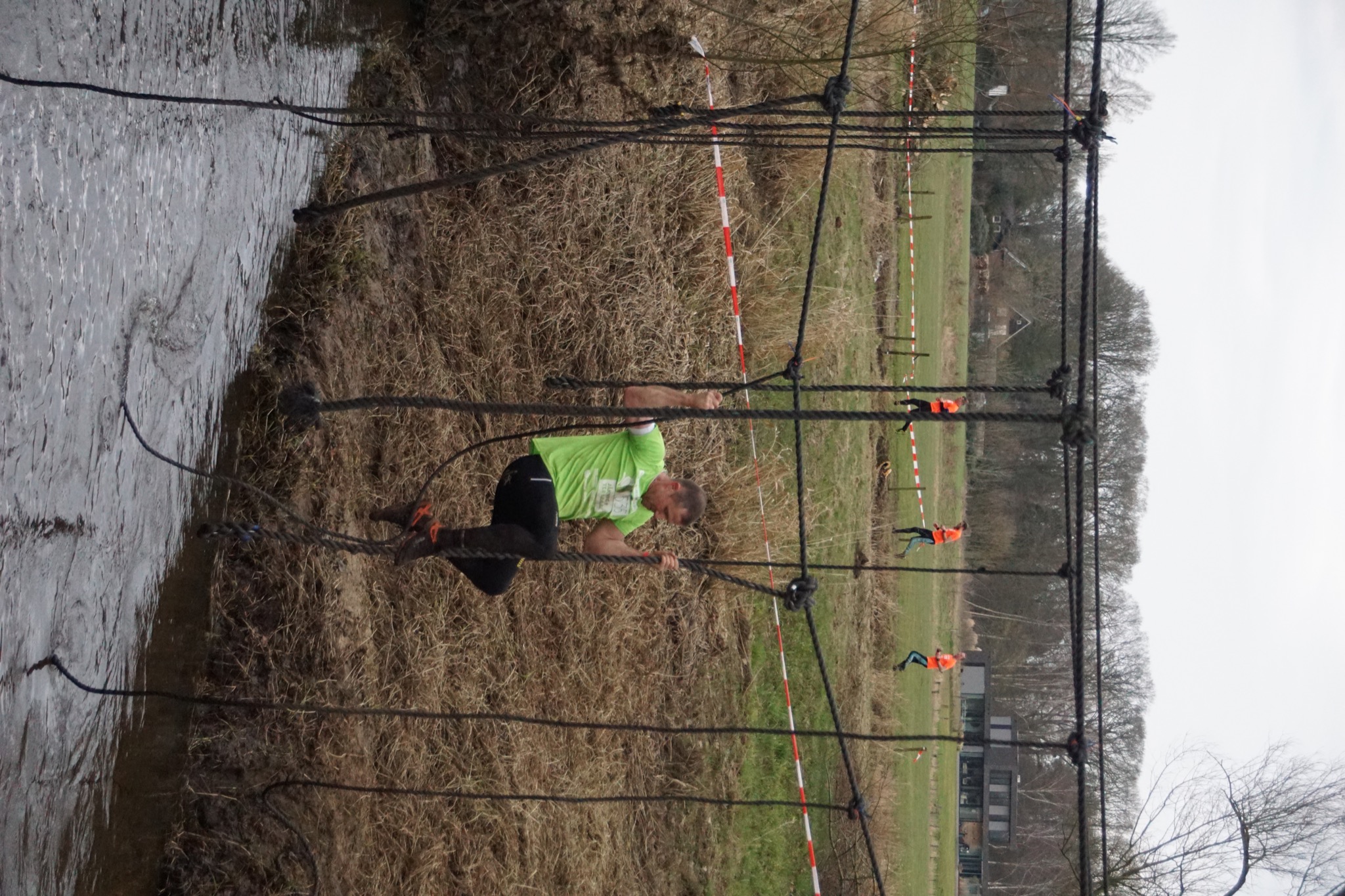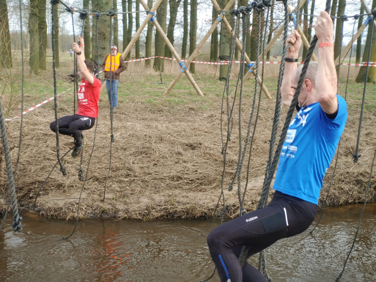 Deelnemers moeten via de lianen naar de overkant van de Dinkel klimmen. Hierbij mogen ze geen gebruik maken van het boventouw.