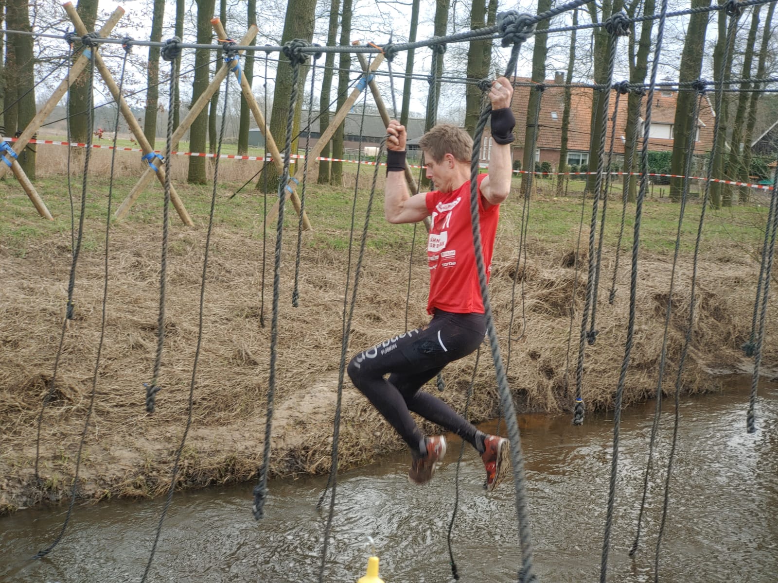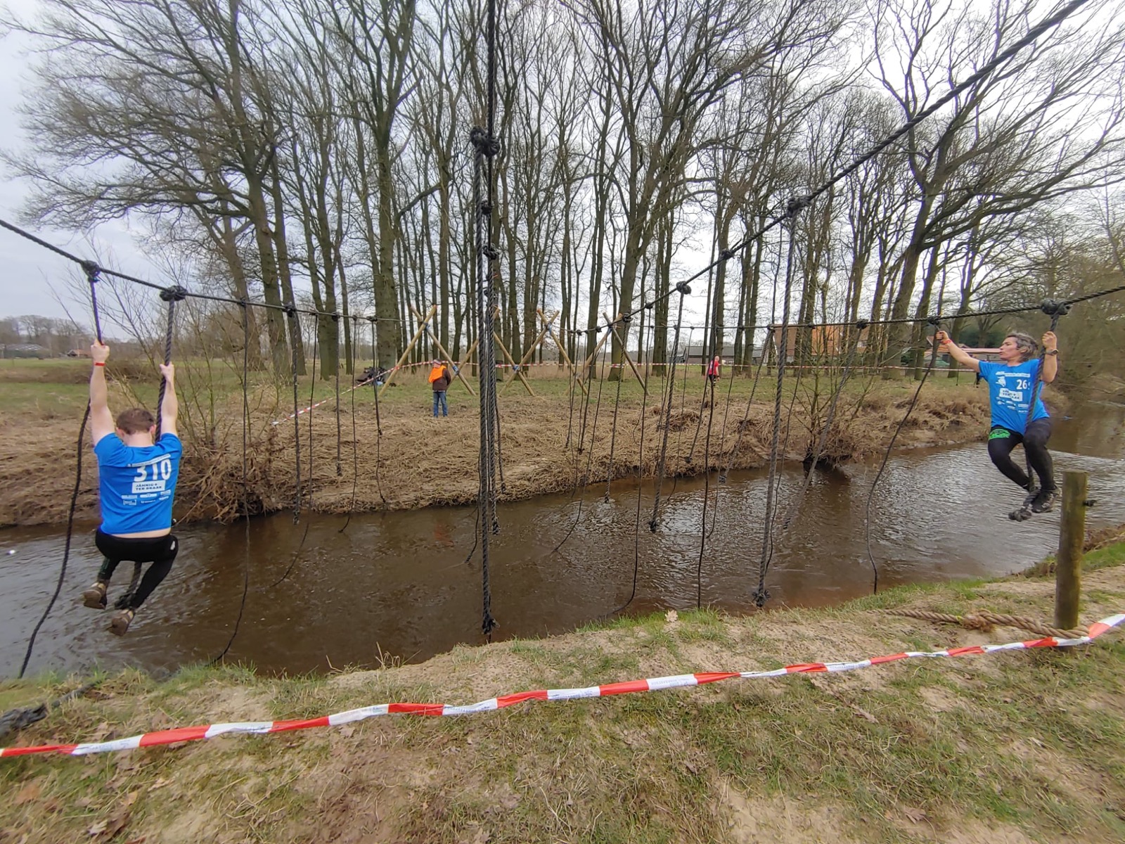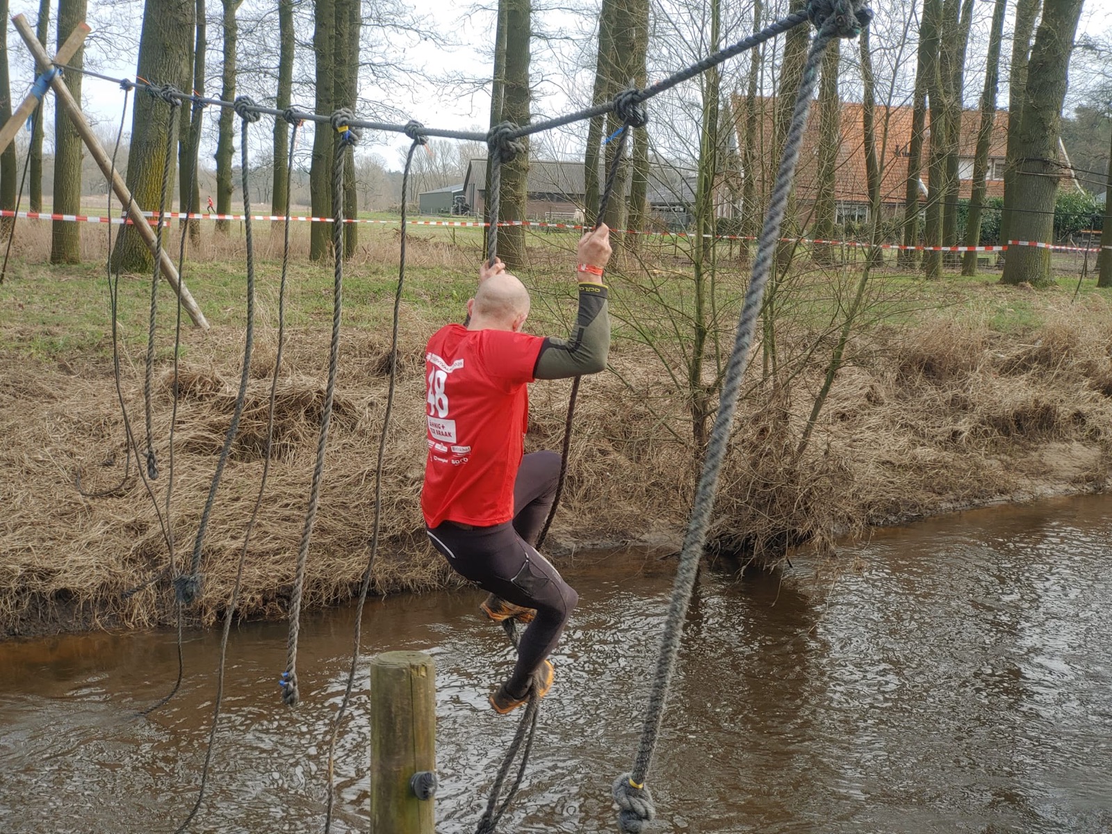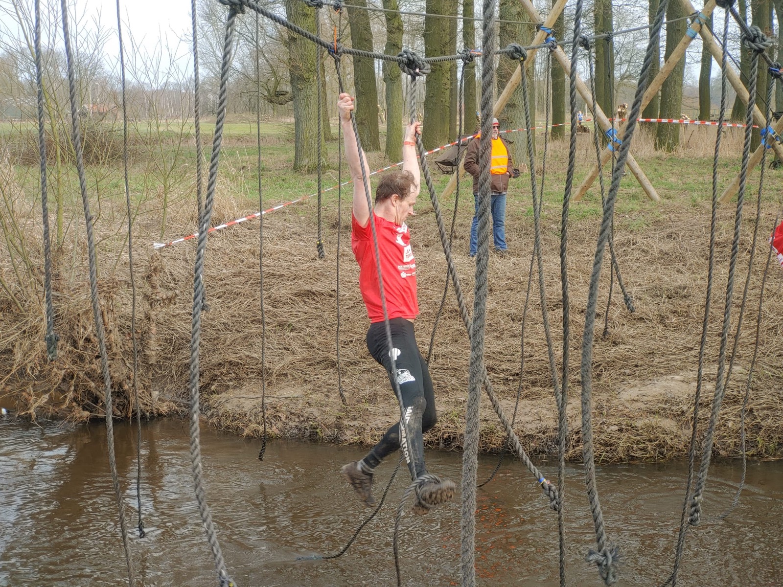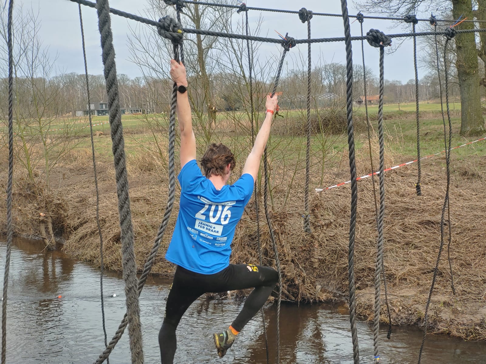 Deelnemers moeten via de lianen naar de overkant van de Dinkel klimmen. Hierbij mogen ze geen gebruik maken van het boventouw.