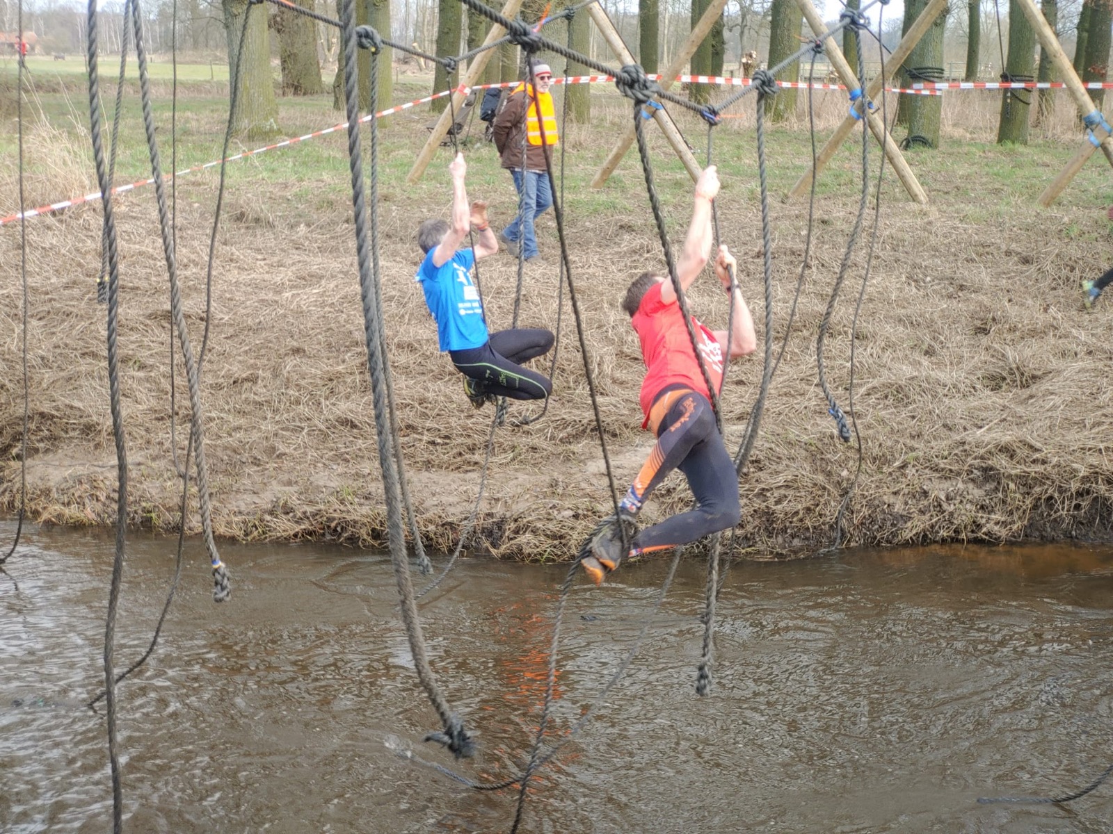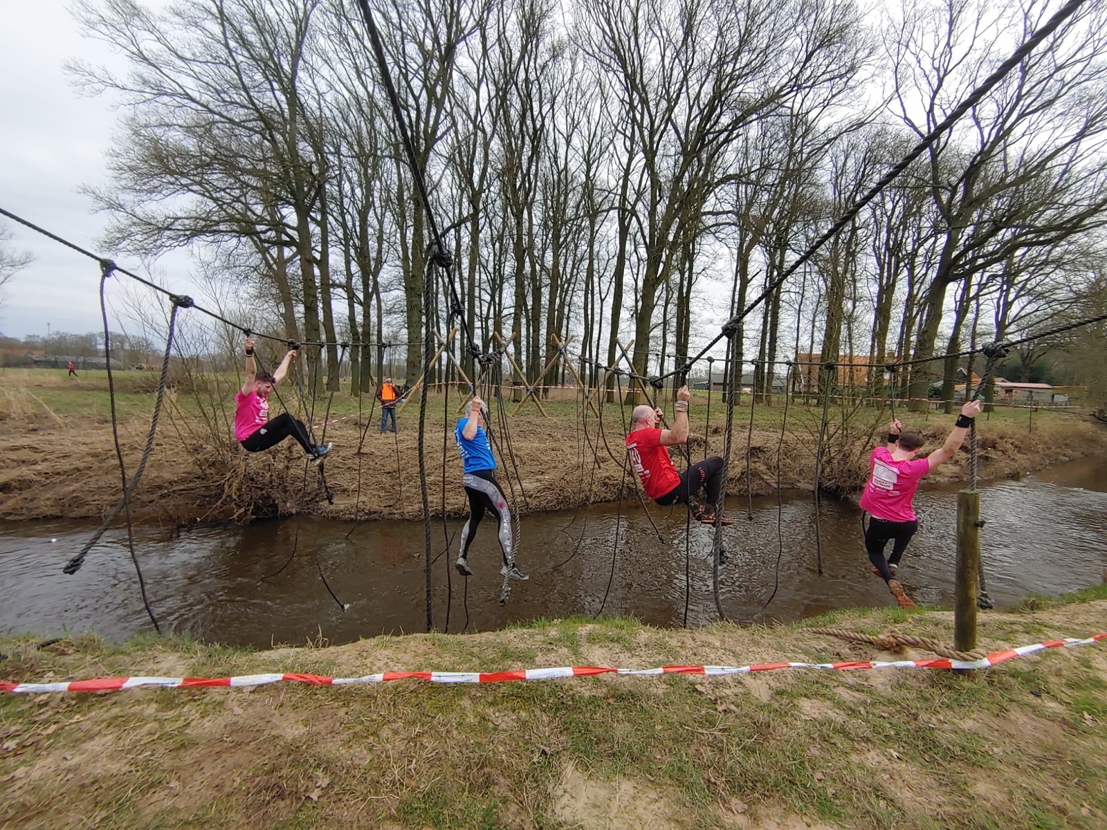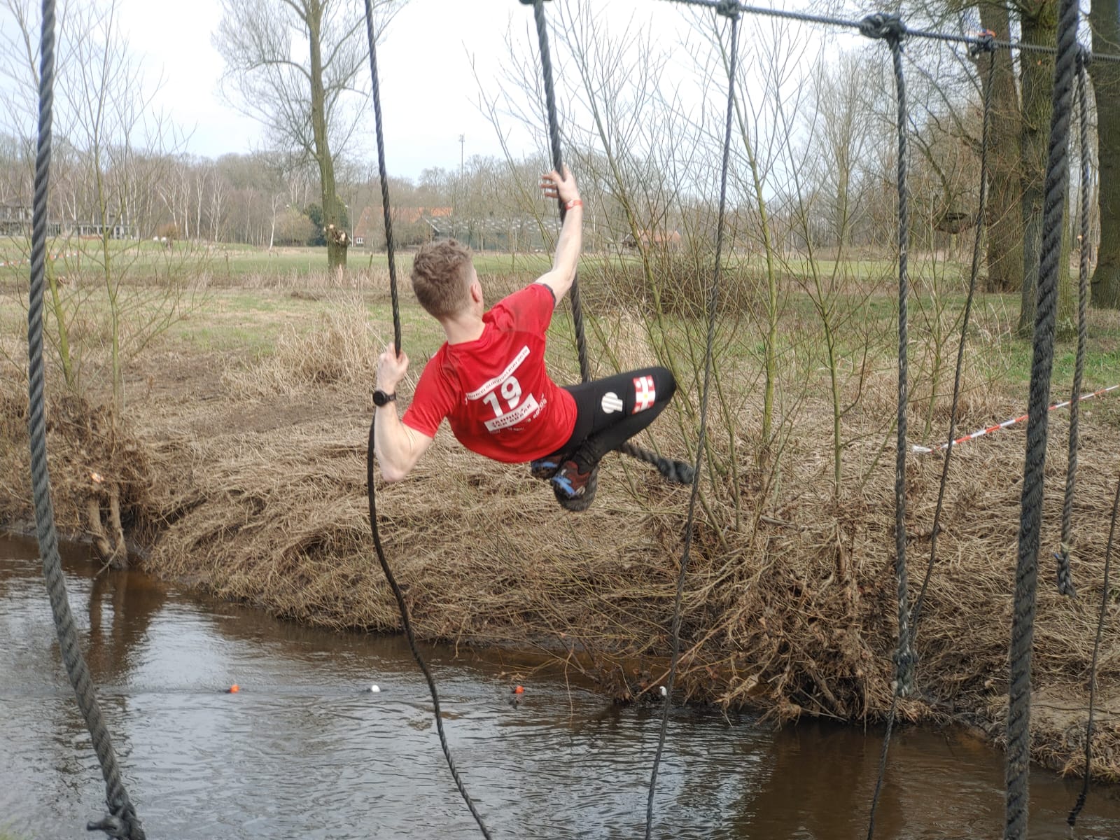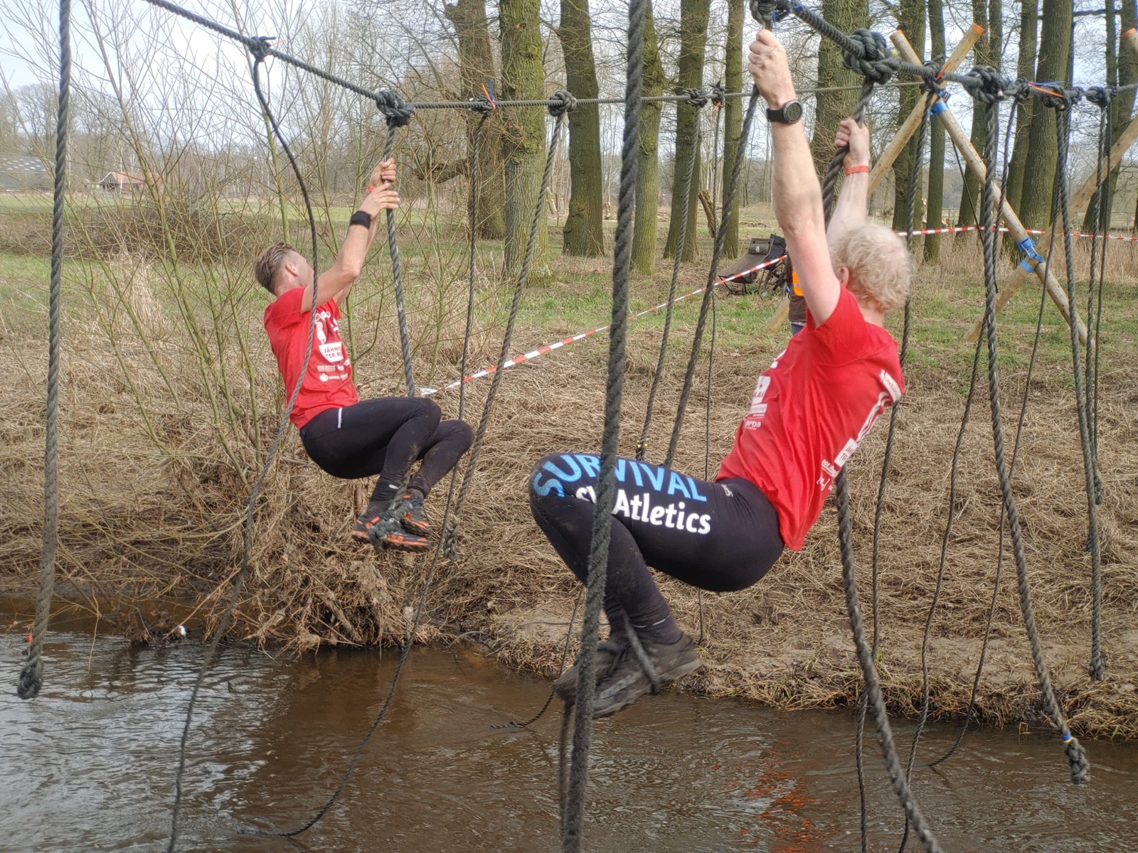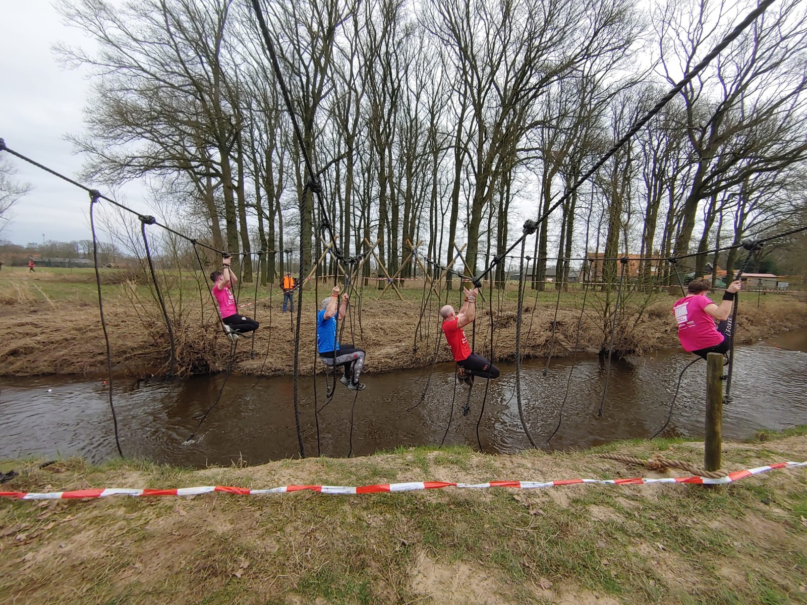 Deelnemers moeten via de lianen naar de overkant van de Dinkel klimmen. Hierbij mogen ze geen gebruik maken van het boventouw.